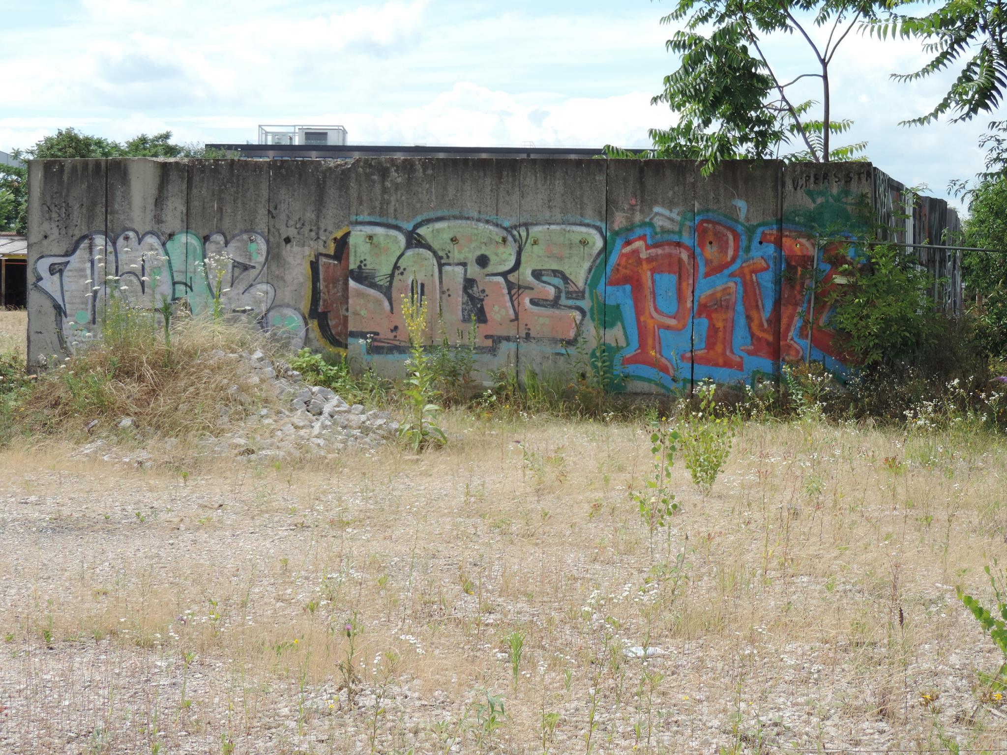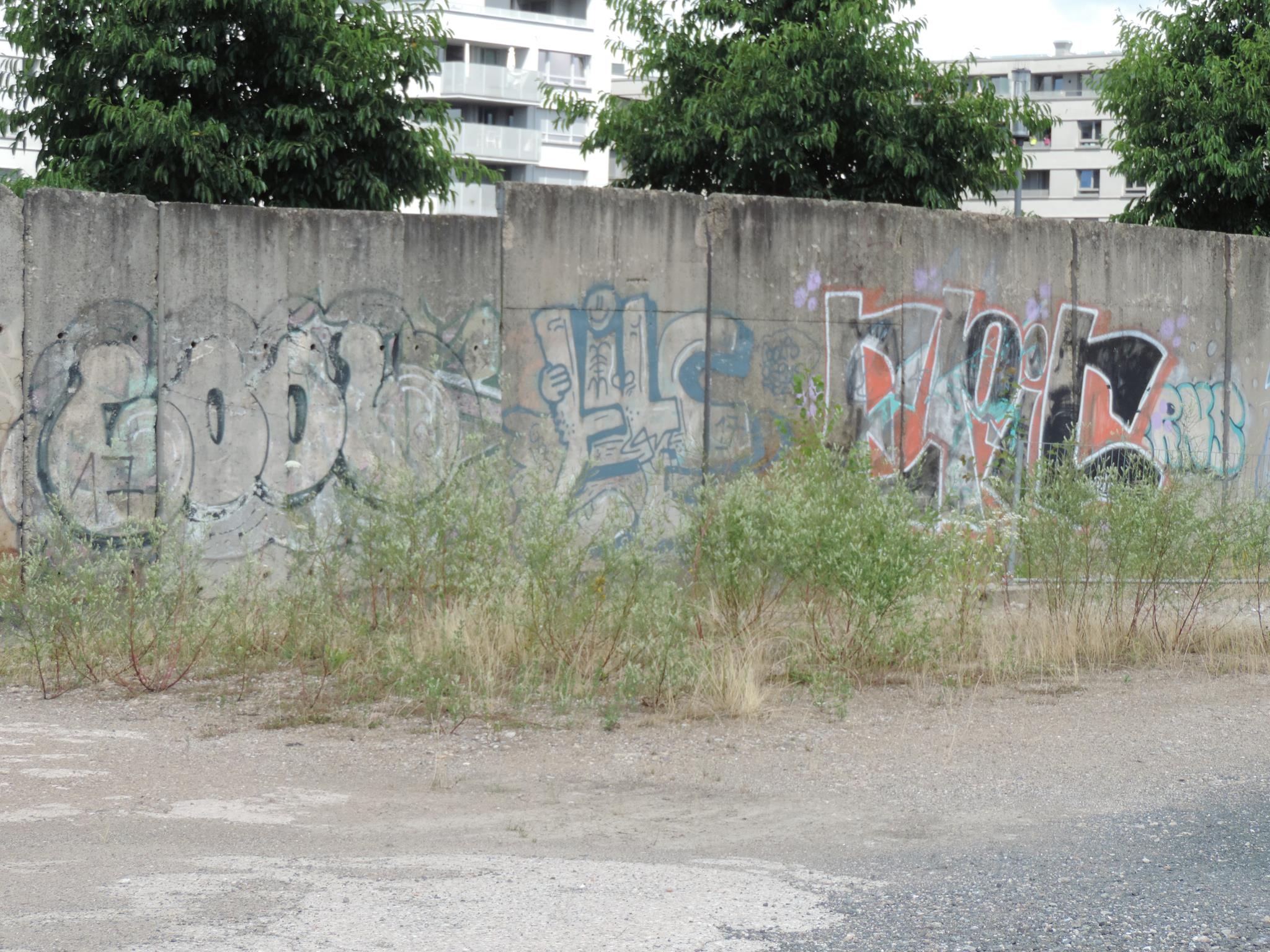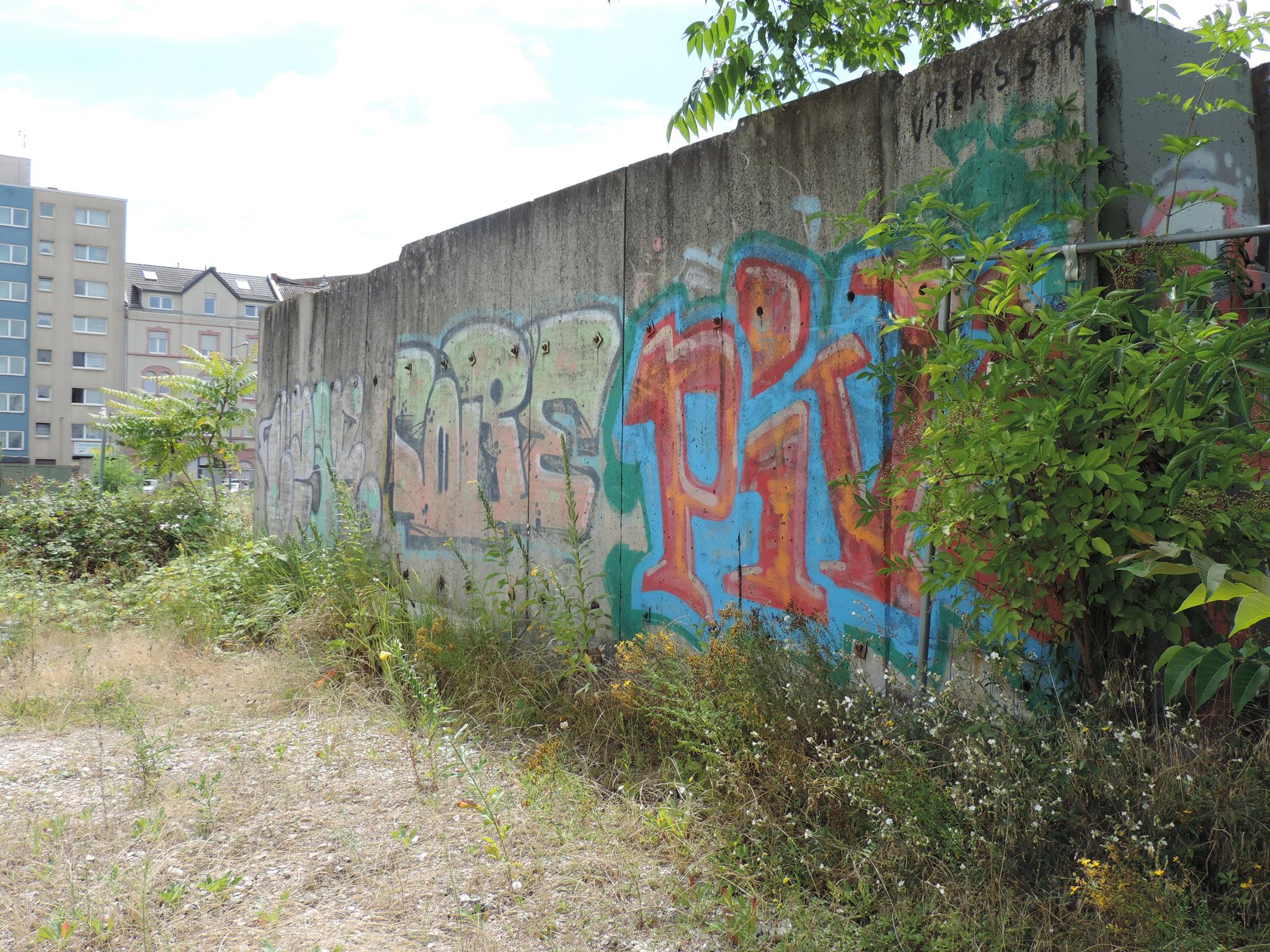On the cycle path on the Mainkai in Offenbach there is a half-ruined wall, in some places more complete, in other places partially crumbled. The jagged, ruinous surfaces offer an interesting underground for graffiti and urban art, with an industrial, crumbling charm. The wall begins at the level of the Hafengarten in the east and runs along to the street Am Hafen in the west at the Walter Spiller Bridge. We have divided the area into two sides: the East Wall, which is more frequently used and offers higher qulity pieces, and the West Wall, which is a little more dilapidated and less used. The border of the two parts is the small alley An der Hafenmeisterei, which divides the wall in the middle. Also take a look at the works directly on the Hafengarten. Here are the graffiti around the area behind the Mainkai Gallery, which despite extensive planning has been lying fallow and under construction for ages.