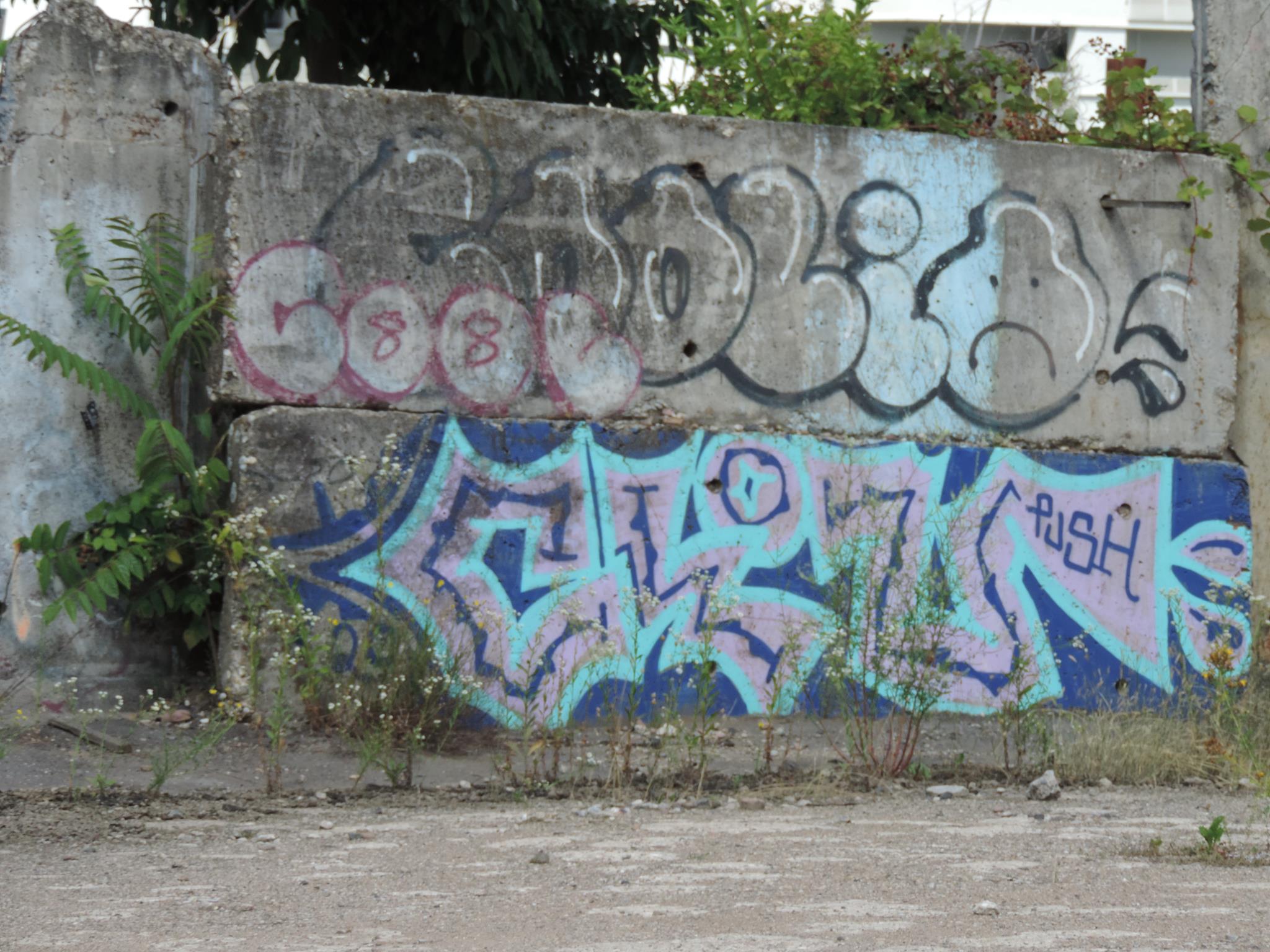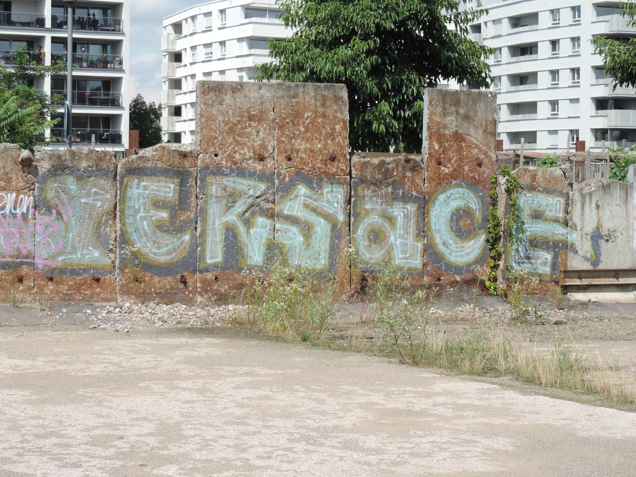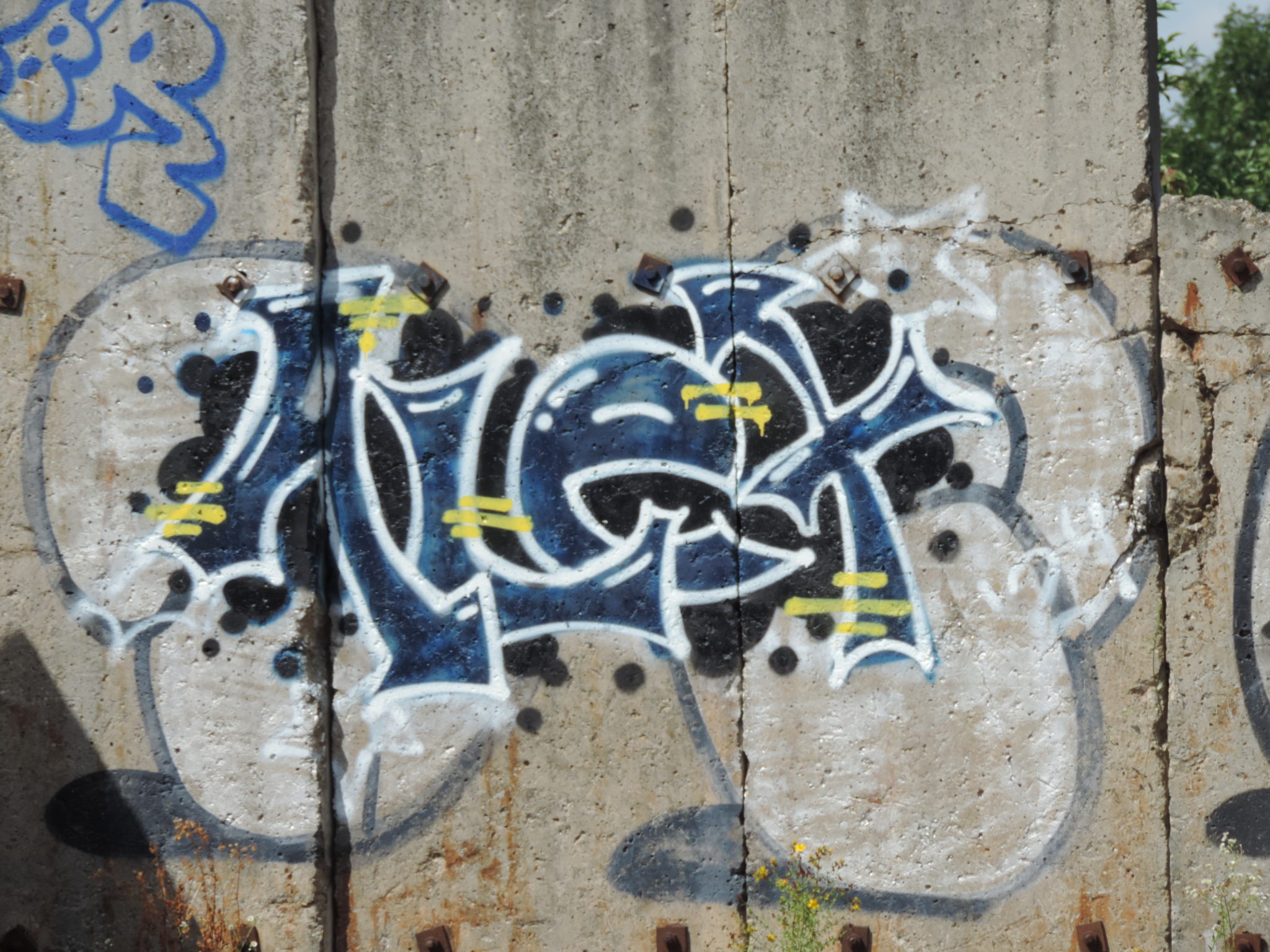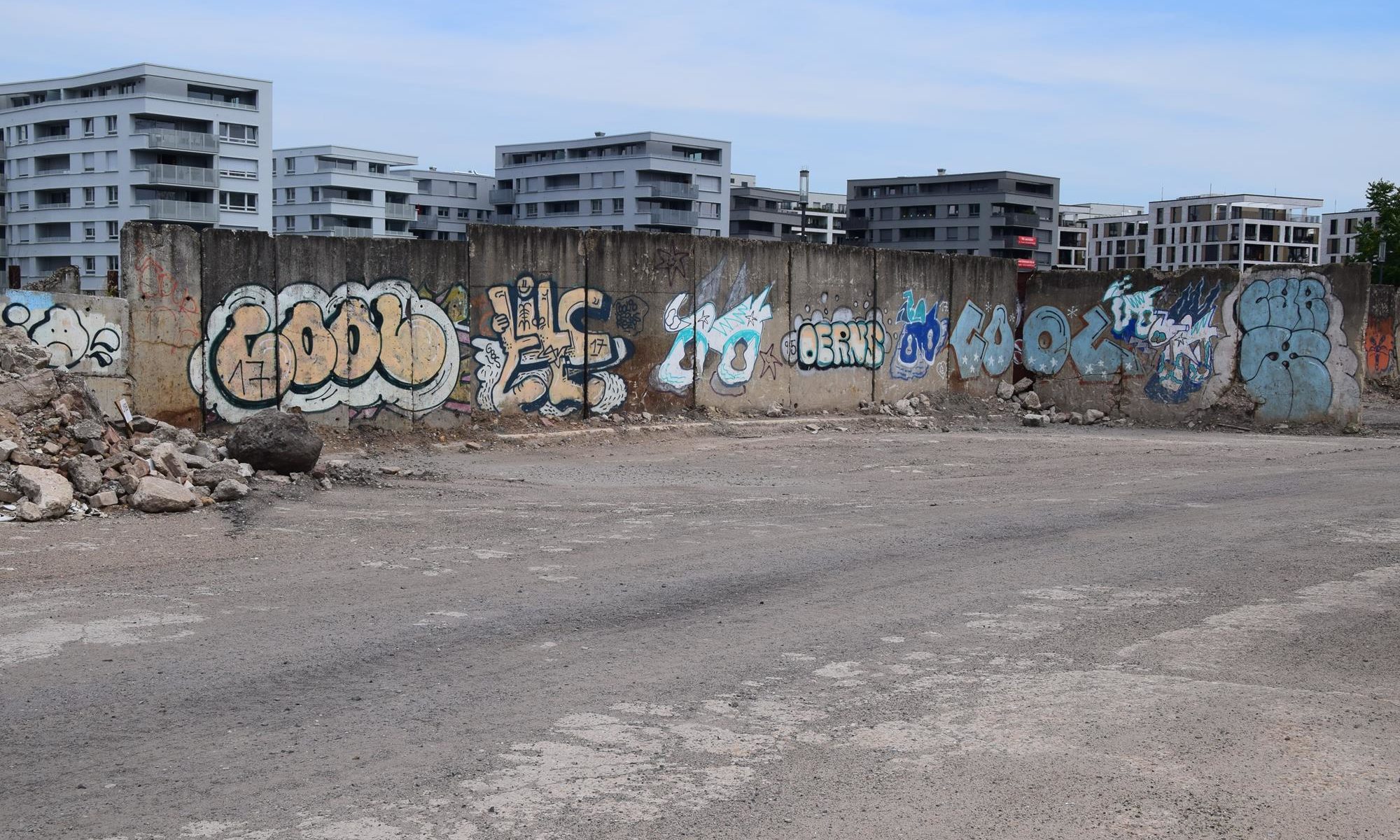 On the cycle path on the Mainkai in Offenbach there is a half-ruined wall, in some places more complete, in other places partially crumbled. The jagged, ruinous surfaces offer an interesting underground for graffiti and urban art, with an industrial, crumbling charm. The wall begins at the level of the Hafengarten in the east and runs along to the street Am Hafen in the west at the Walter Spiller Bridge. We have divided the area into two sides: the East Wall, which is more frequently used and offers higher qulity pieces, and the West Wall, which is a little more dilapidated and less used. The border of the two parts is the small alley An der Hafenmeisterei, which divides the wall in the middle. Also take a look at the works directly on the Hafengarten. Here are the graffiti around the area behind the Mainkai Gallery, which despite extensive planning has been lying fallow and under construction for ages.