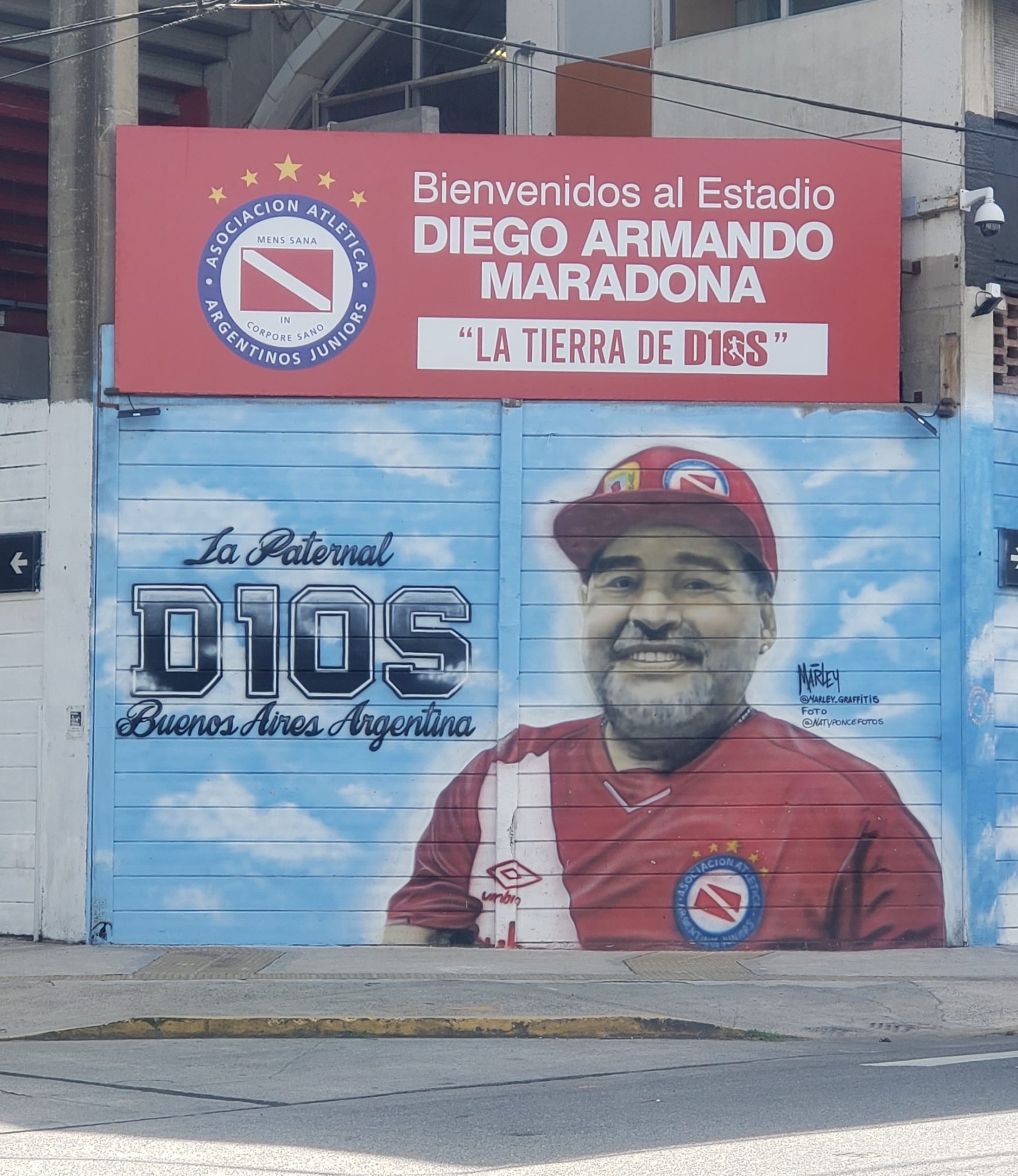 The Argentinos Juniors club was founded in 1904 and has won five national and international titles in its long history, including the Copa Libertadores de América. Time and again, world-class players have come from these ranks and got their start here at this sports venue. But the absolute idol is and remains, of course, the idolized and fantastic Maradona. In his honor, not only the stadium got its name, but also countless beautiful urban artworks in portrait style were created around the large building by local artist MARLEY, also there is a mosaic artwork at the museum from LAS AYA. Here you can find all the murals along the stadium façade, but the works are also marked on the Buenos Aires Map with their exact locations. Also check out our extensive Maradona Collection with collected works on this great soccer player from all over Buenos Aires. The photos were taken by streetart hunter ANALÍA PERTUSI aka PERTS JAM