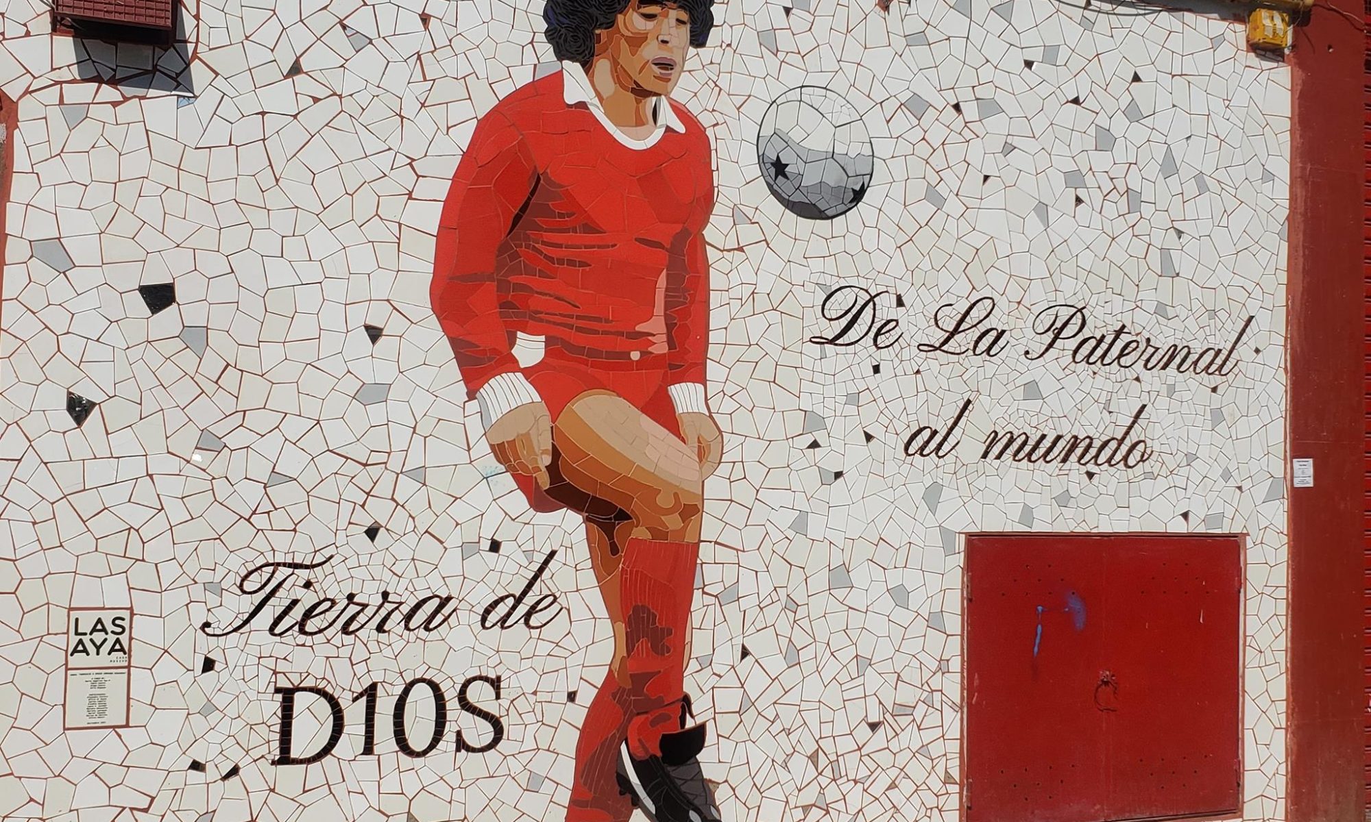 This artwork was created by the mosaic artists and agency LAS AYA in the district of Villa General Mitre in the province Ciudad Autónoma de Buenos Aires. It is located at Gavilán 2159 with the GPS coordinates 9GVG+FQ5 and was made as a tribute to the Argentine football player and coach Diego Armando Maradona Franco. Maradona is one of the “legends of world football” and is considered one of the best football players in history. He was born on October 30th 1960 in Lanús, Argentina, and died on November 25th 2020 in Dique Luján in Argentina.