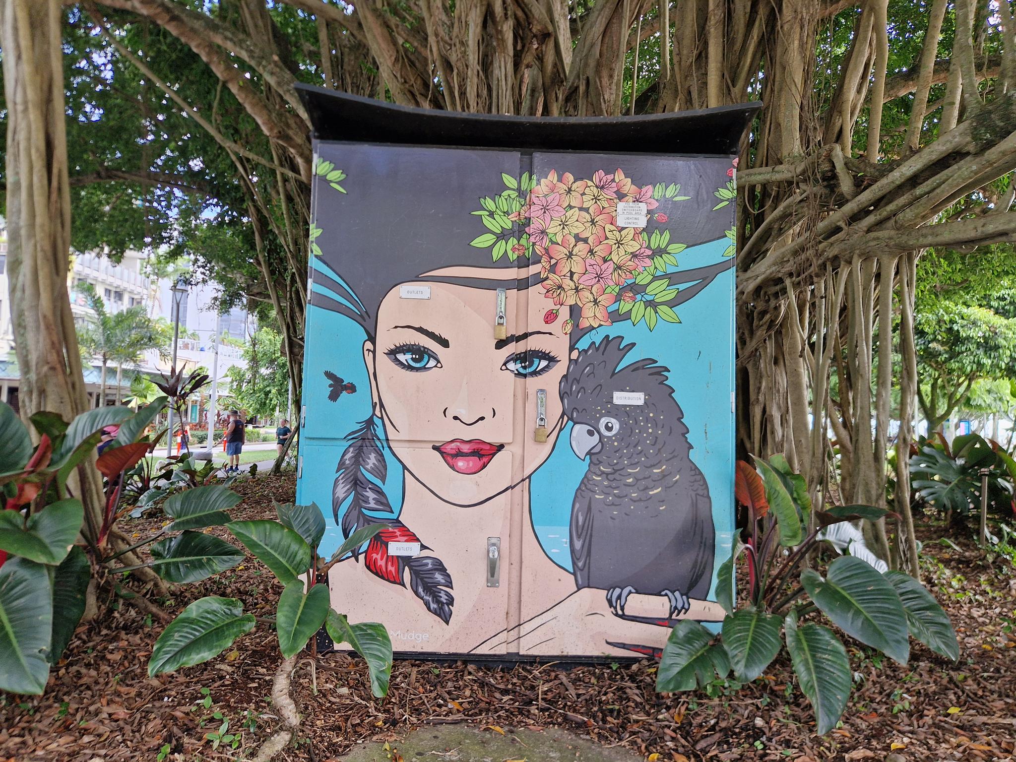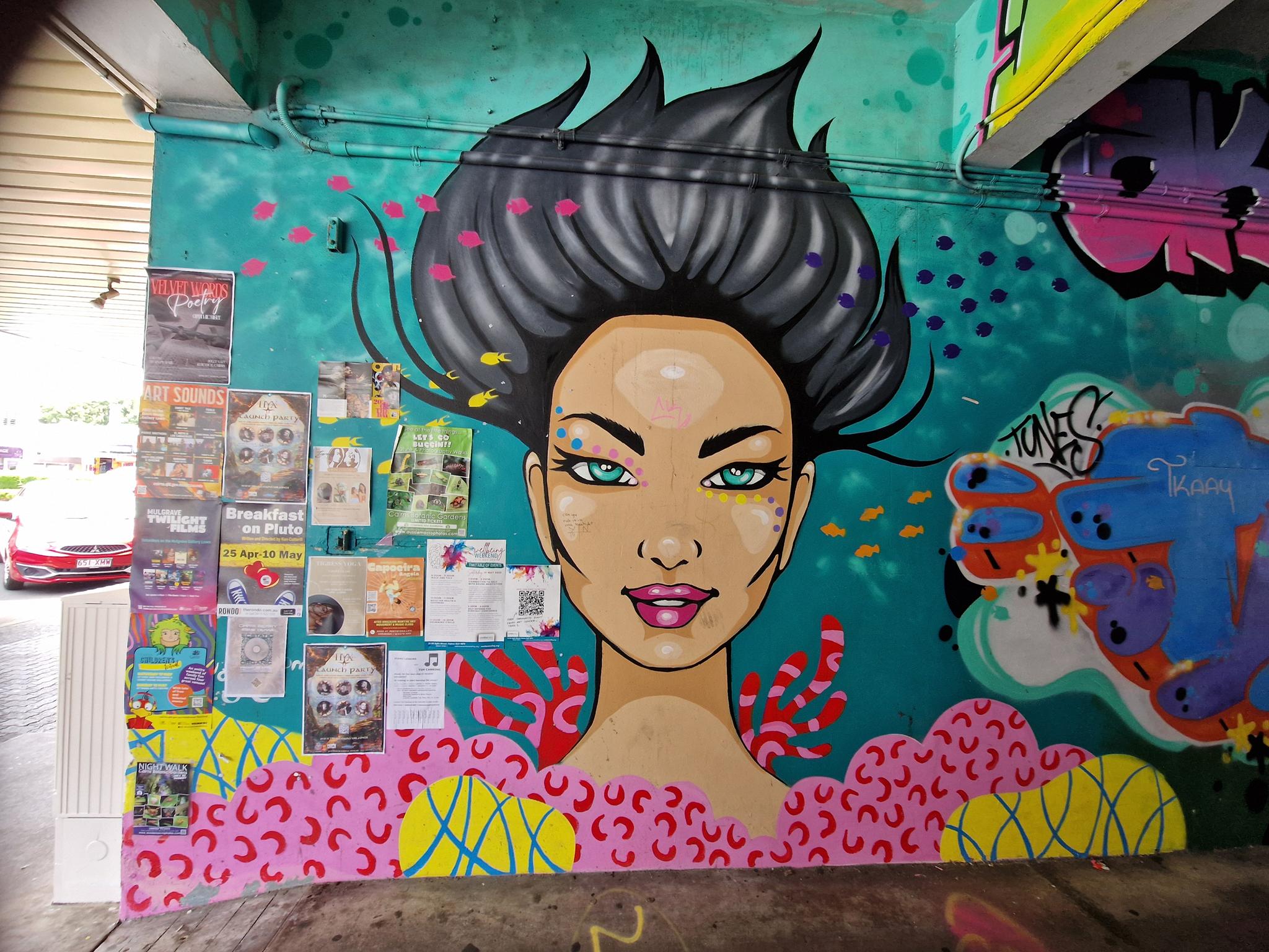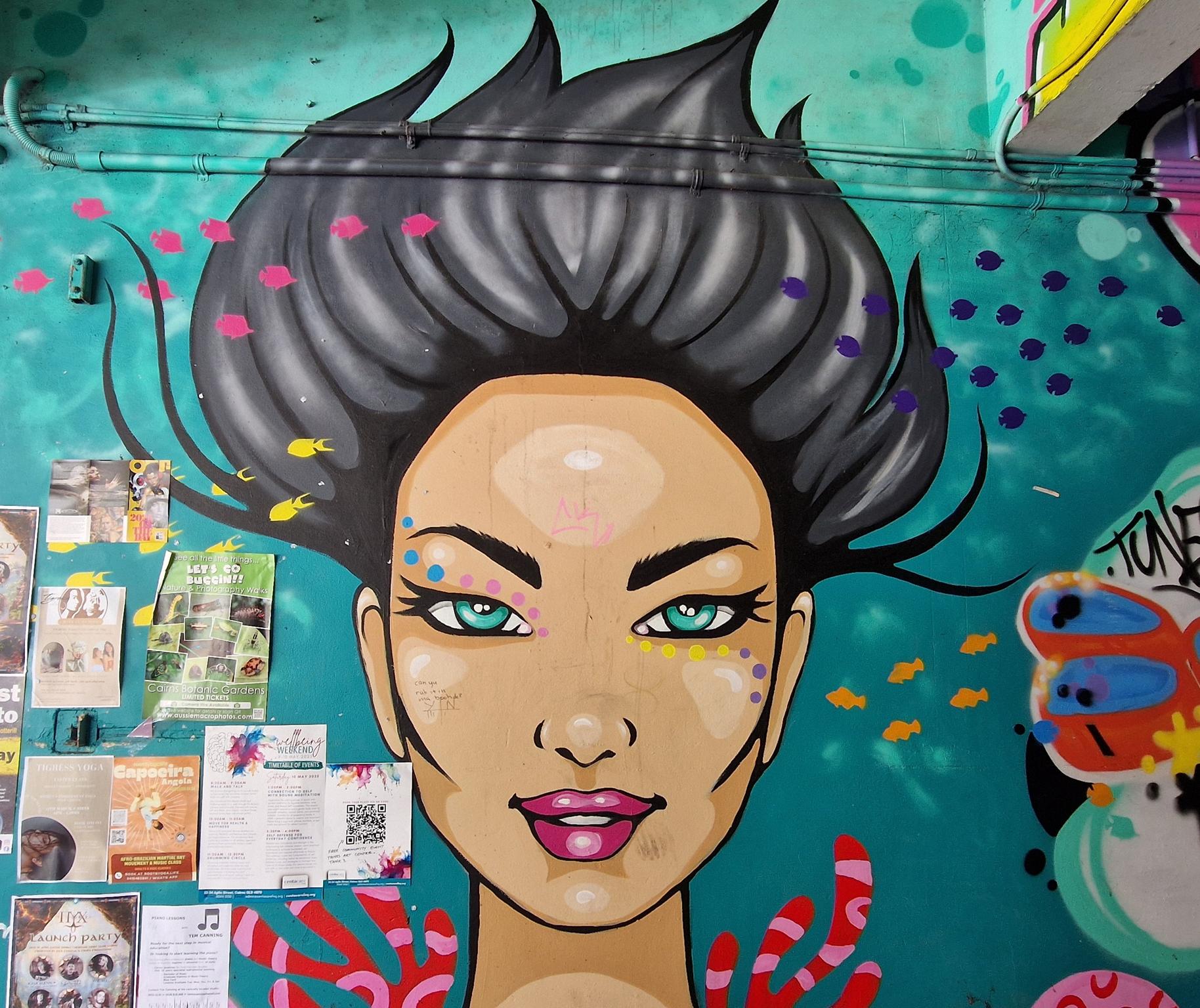 Cairns is a city in northern Queensland with around 150.000 residents in the urban area and it was established in the late 19th century as a port serving nearby gold and tin mining operations and later the sugar industry. In the 20th century the city grew into a key commercial and logistics hub and became an important military base in the Pacific during World War II. Today, it is best known as a gateway to the Great Barrier Reef and tropical northern Australia. Beyond tourism, Cairns has developed a growing urban art scene, with murals and public artworks playing an increasingly visible role in the cityscape. Many works reference Indigenous culture, tropical landscapes, and regional identity, often created in collaboration with local communities. A major platform for Indigenous contemporary art is the CAIRNS INDIGENOUS ART FAIR, which showcases Aboriginal and Torres Strait Islander artists and has become an important national cultural event. The CAIRNS FESTIVAL also contributes to the city’s public art culture through installations, performances, and street-based art projects. Alongside this, local artist collectives and mural initiatives supported by institutions such as the TANKS ART CENTRE. Here we have a collection of great urban artworks photographed by graffiti hunter and streetart lover MAZZANTI. Check out her instagram channel, where she regulalry presents great pictures from Sweden and from other countries all over the world.