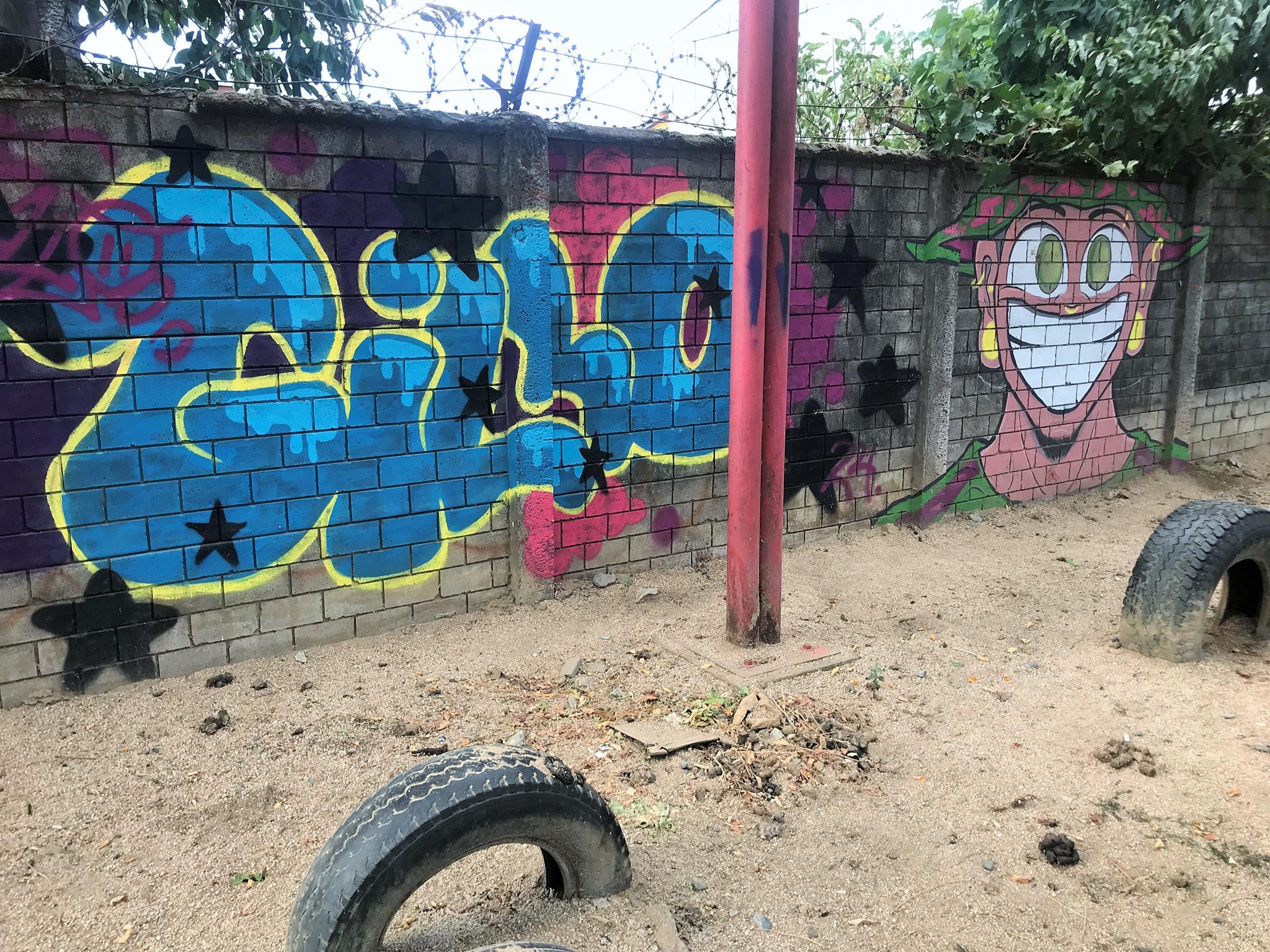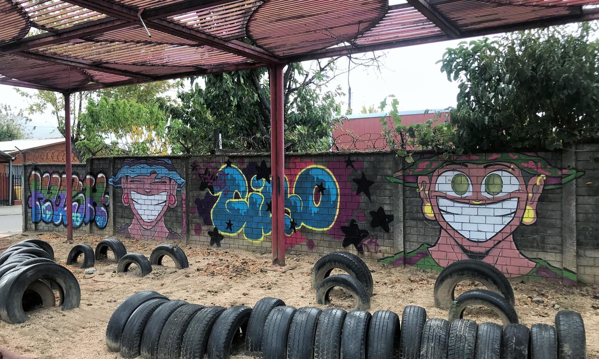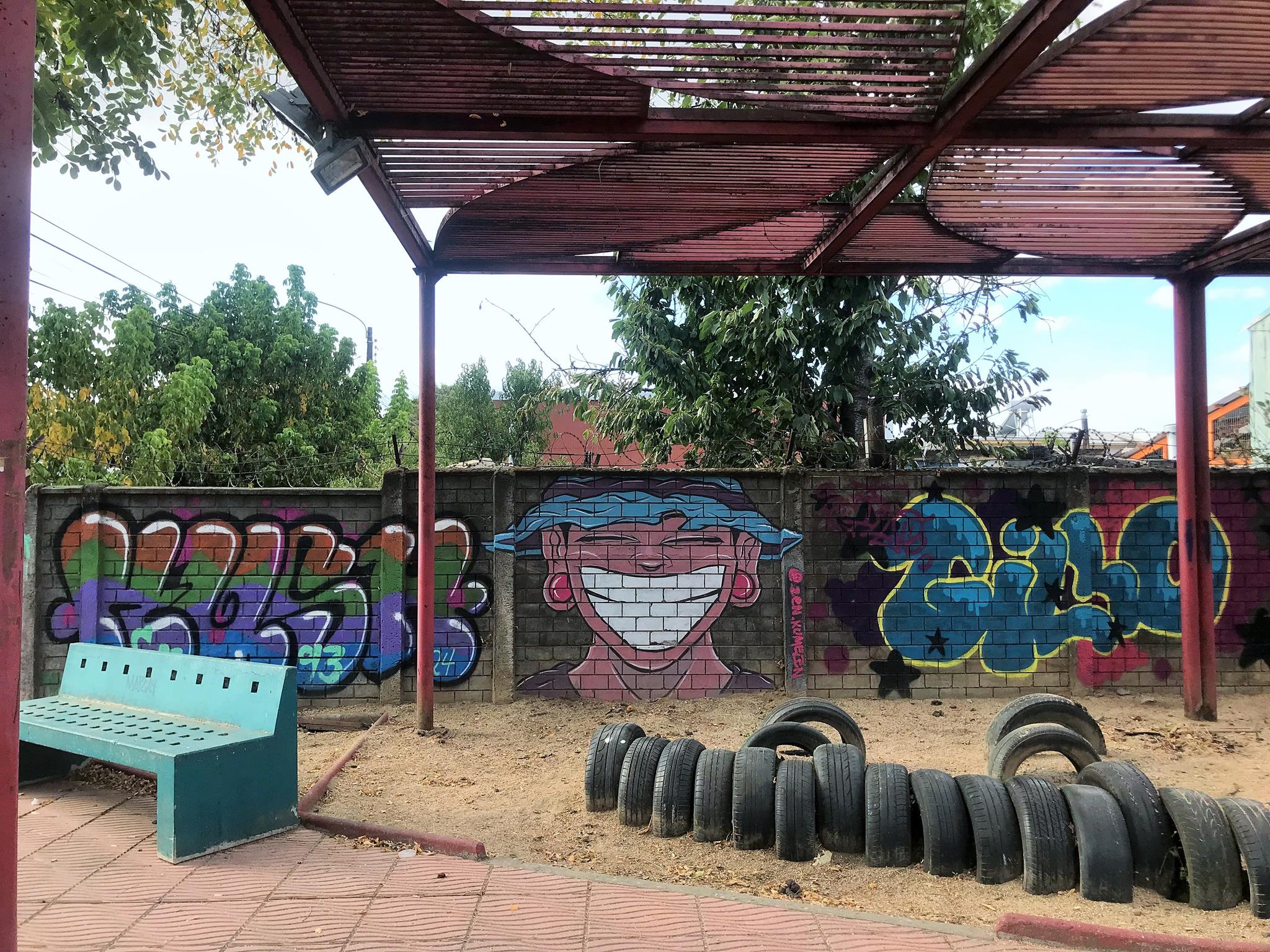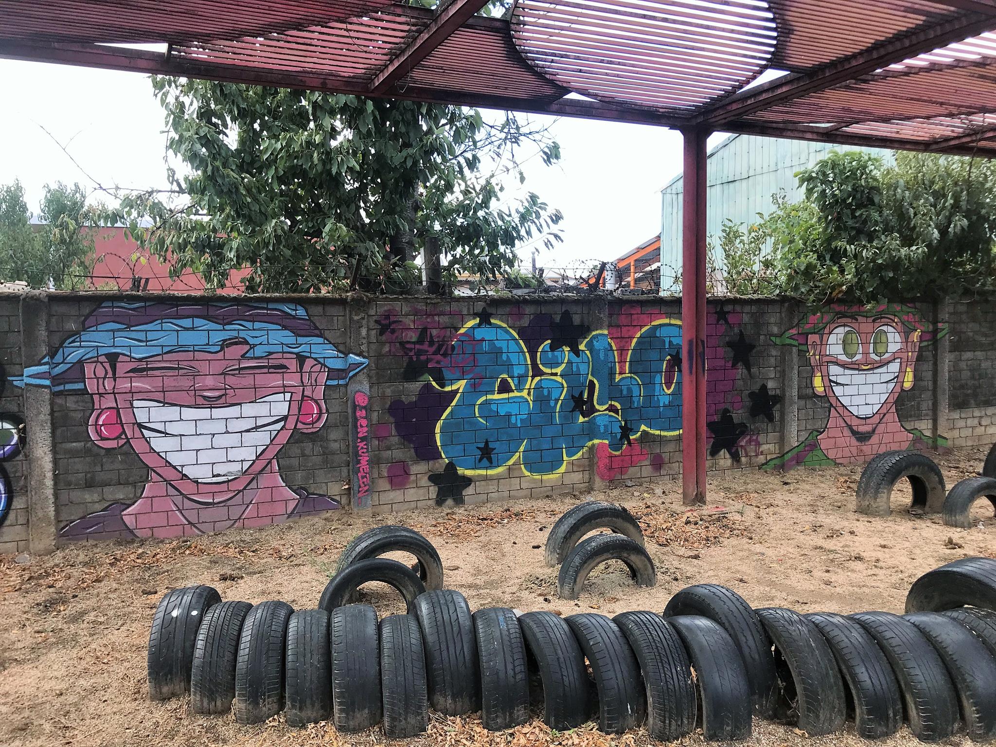 This modest community plaza is simple and made from recycled materials. You can see the half-buried tires which are a testament to this. This community square is covered by a metal structure that is already showing signs of deterioration. This is not the case with the graffiti that came to revitalize and brighten the plaza.