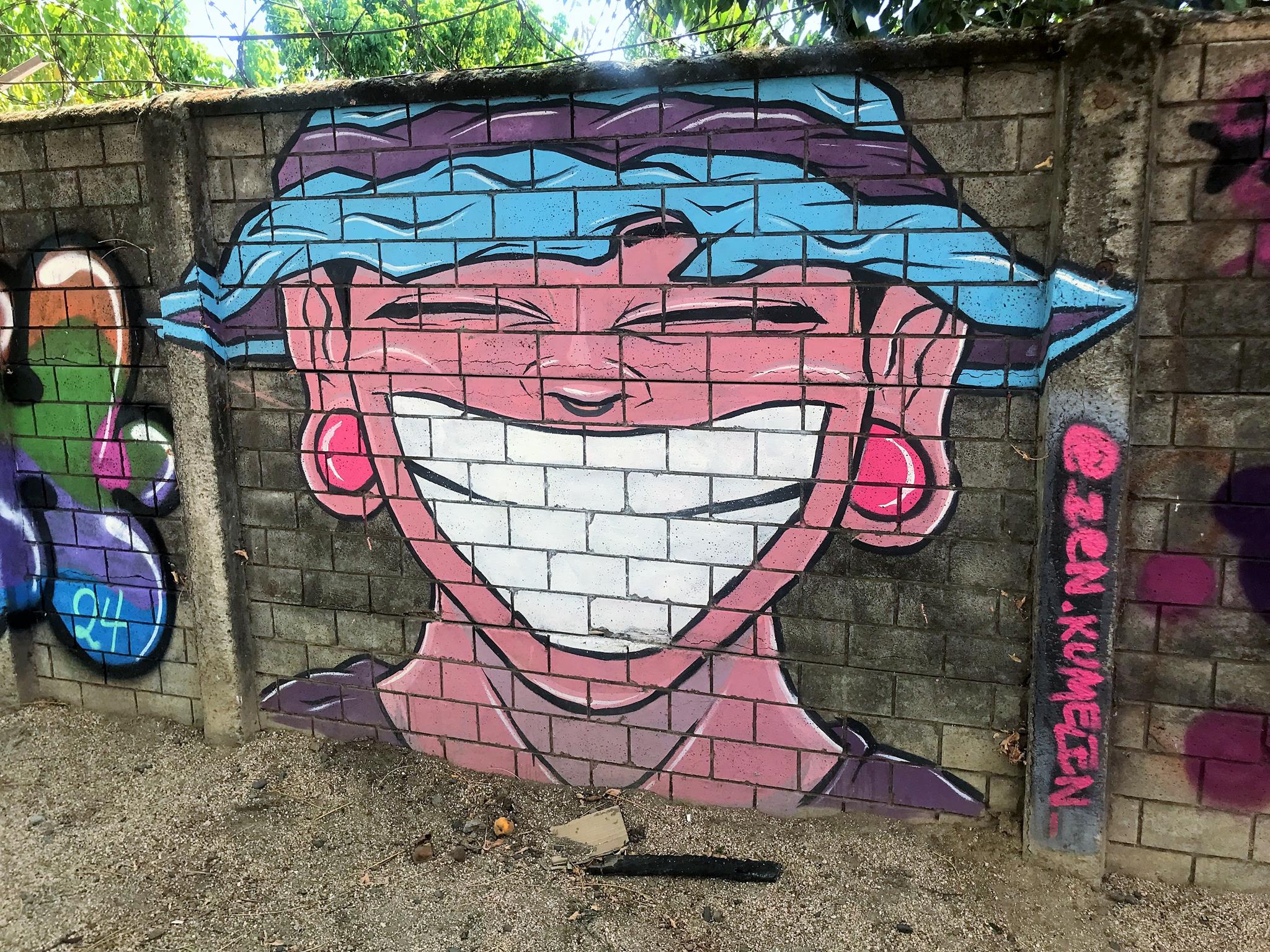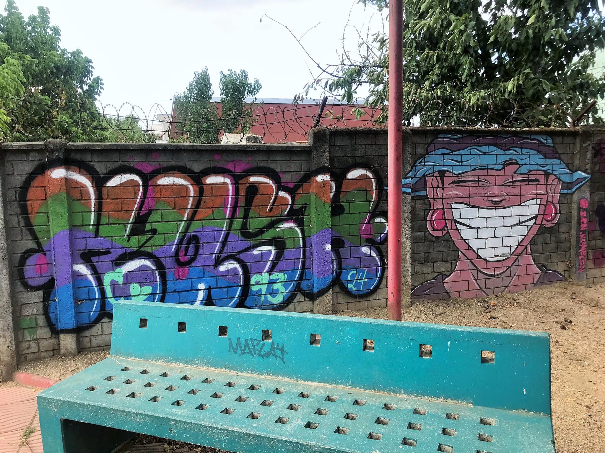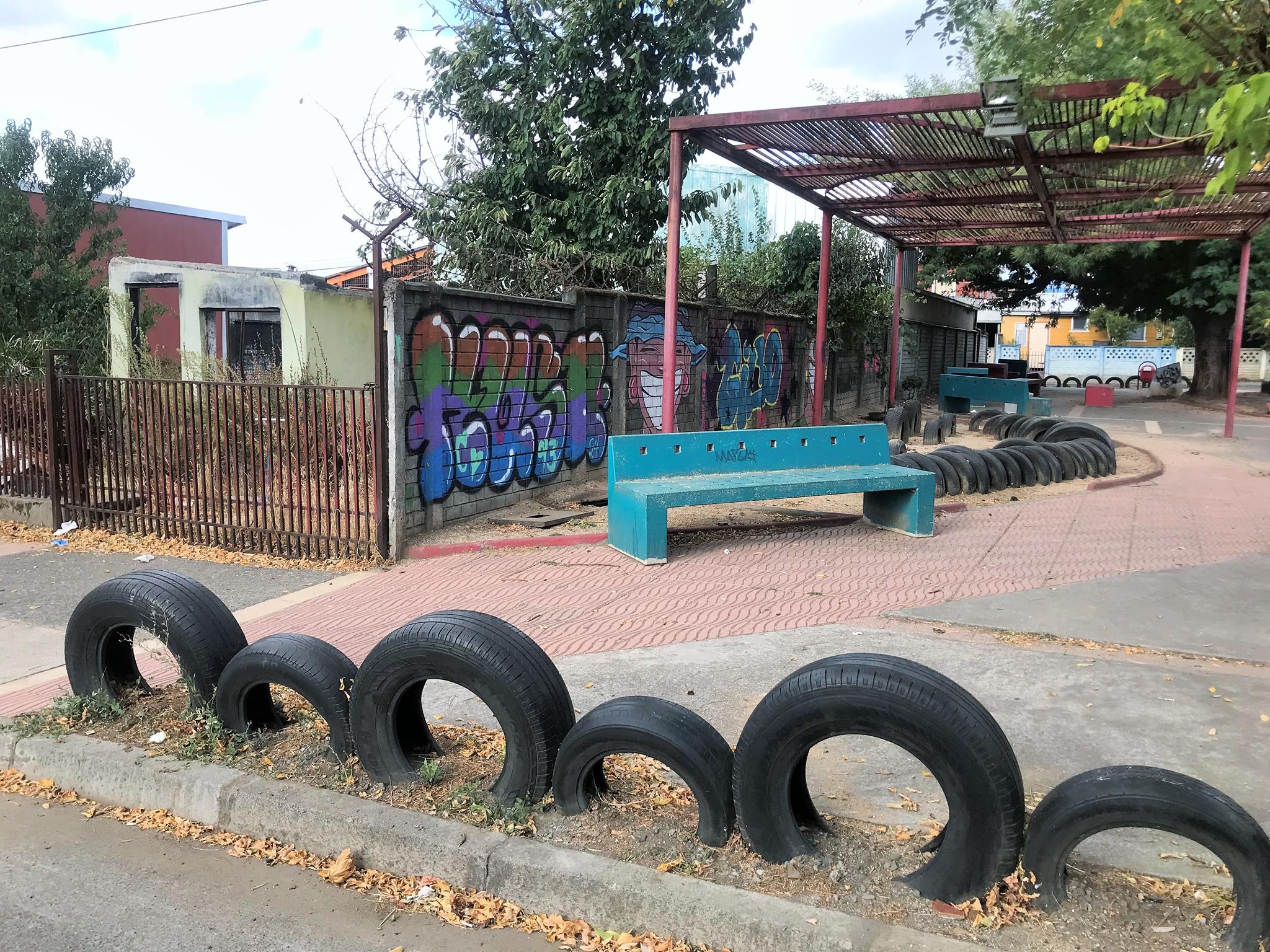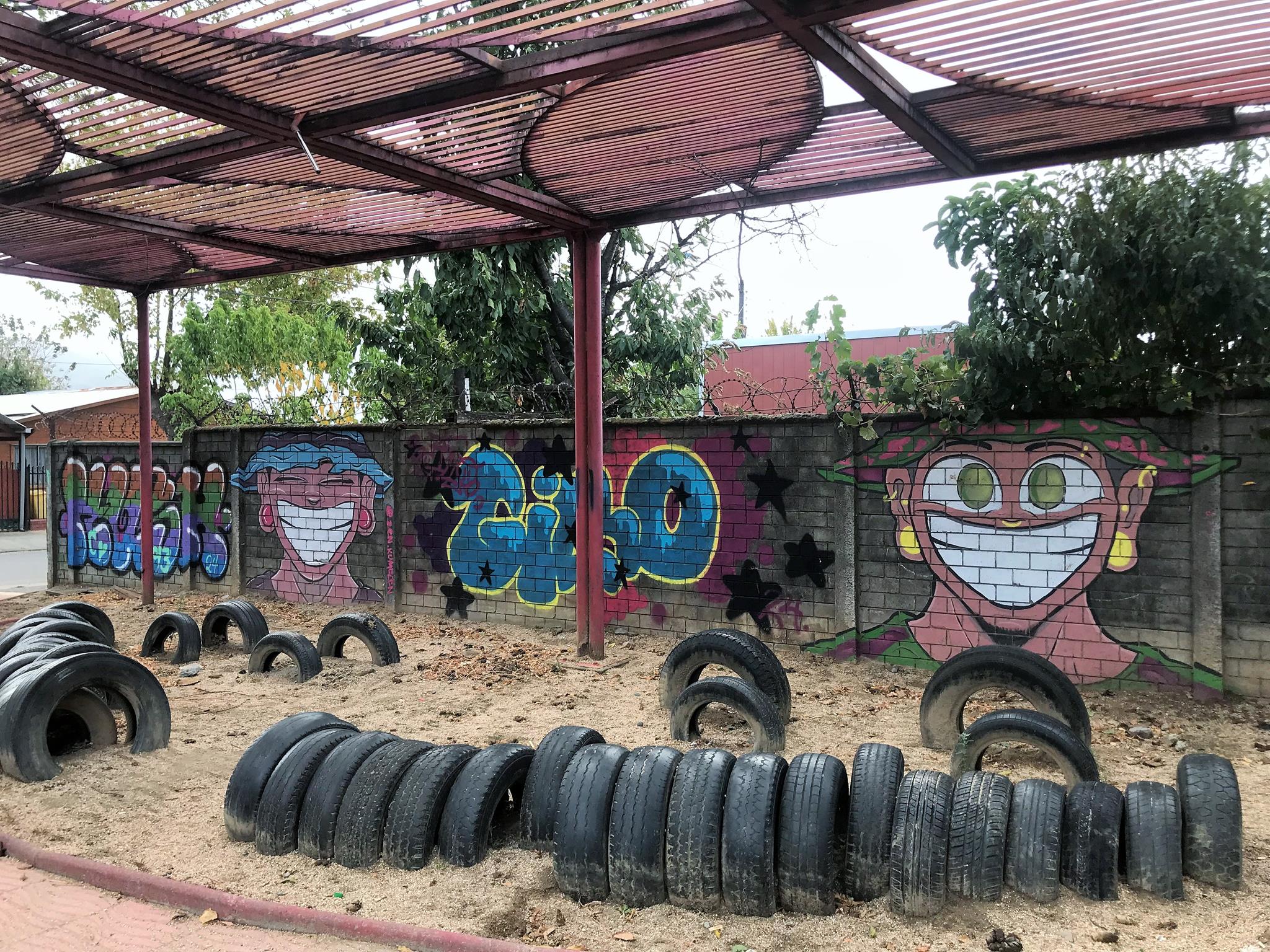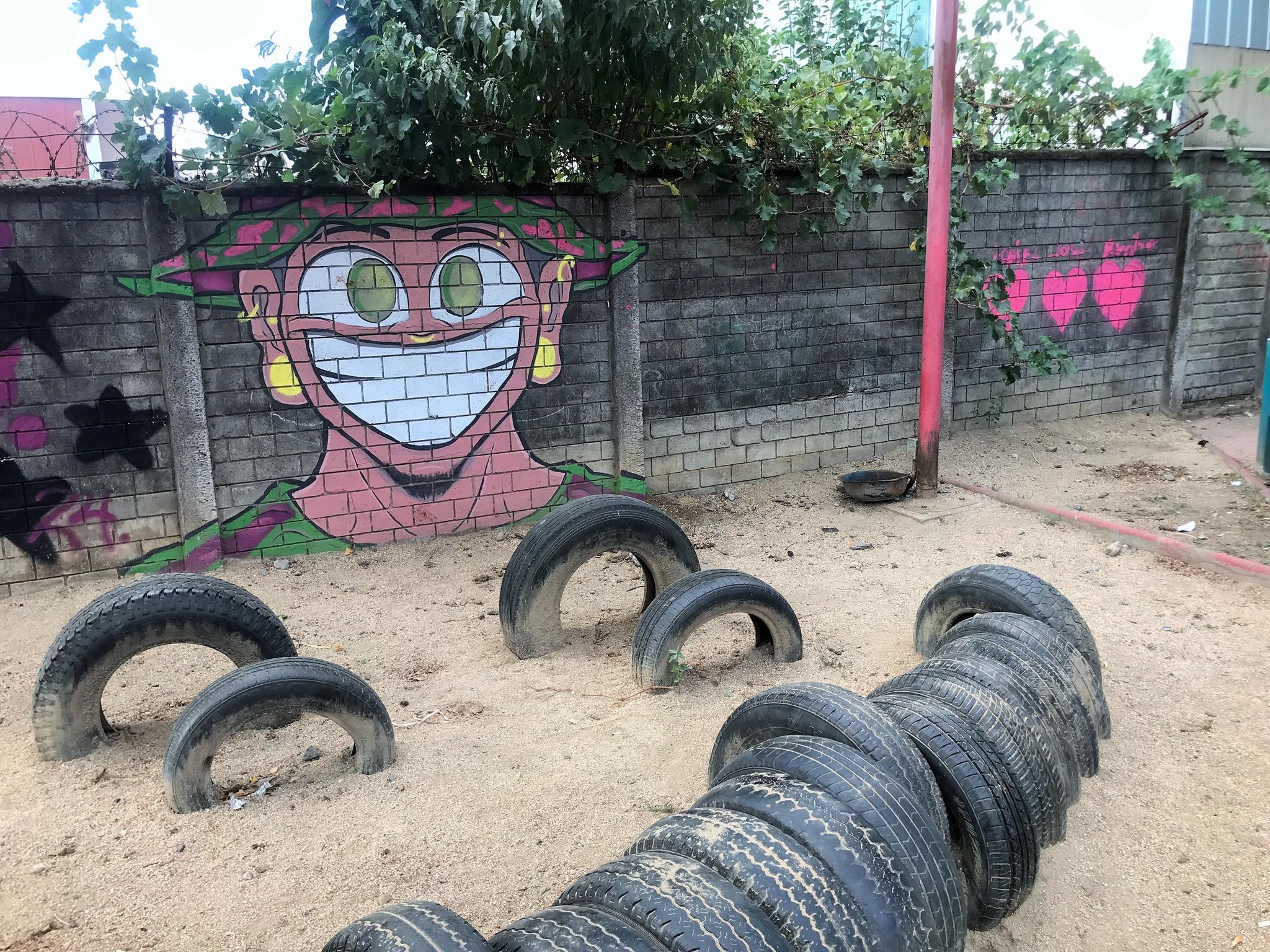 This modest community plaza is simple and made from recycled materials. You can see the half-buried tires which are a testament to this. This community square is covered by a metal structure that is already showing signs of deterioration. This is not the case with the graffiti that came to revitalize and brighten the plaza.