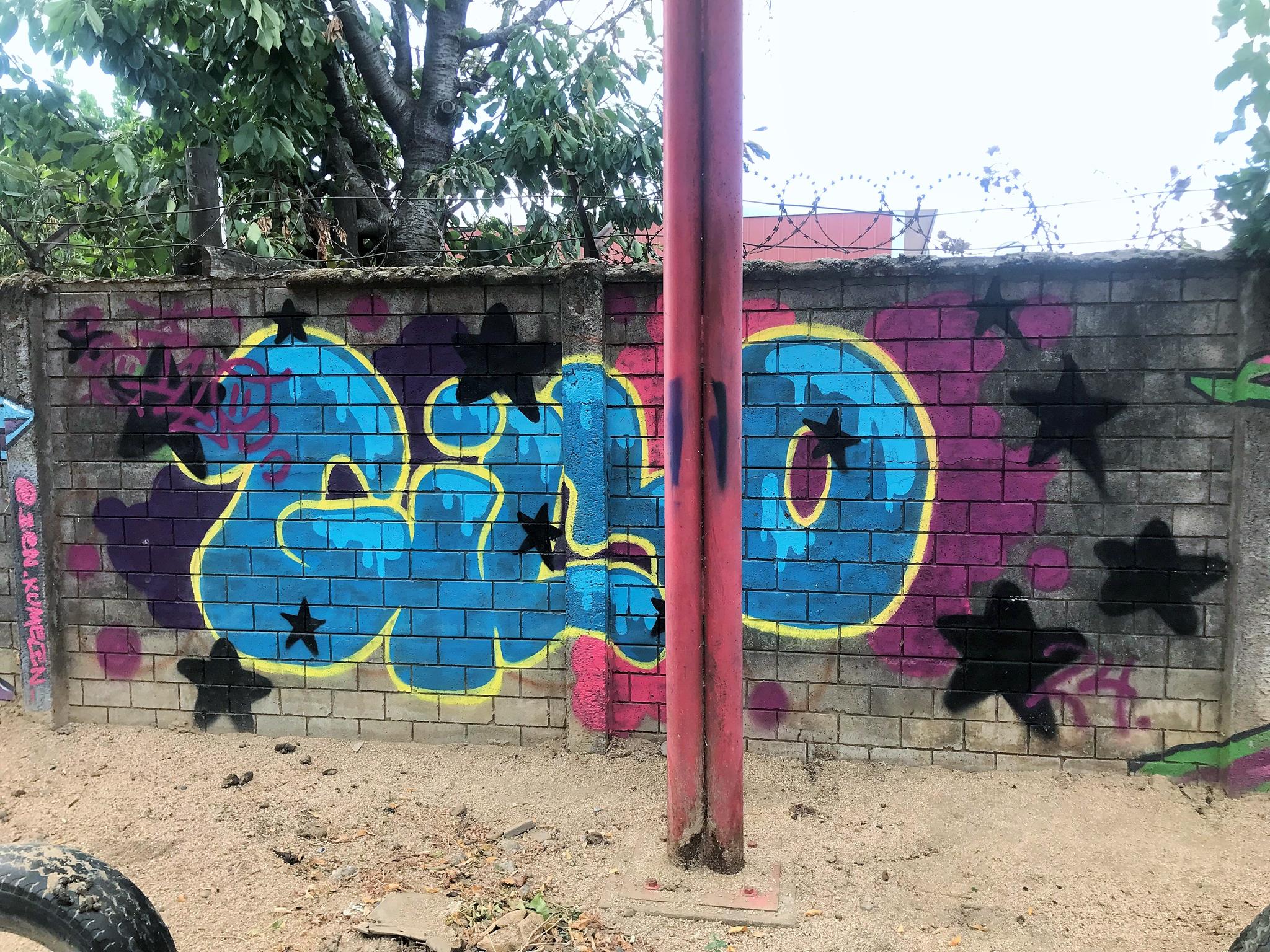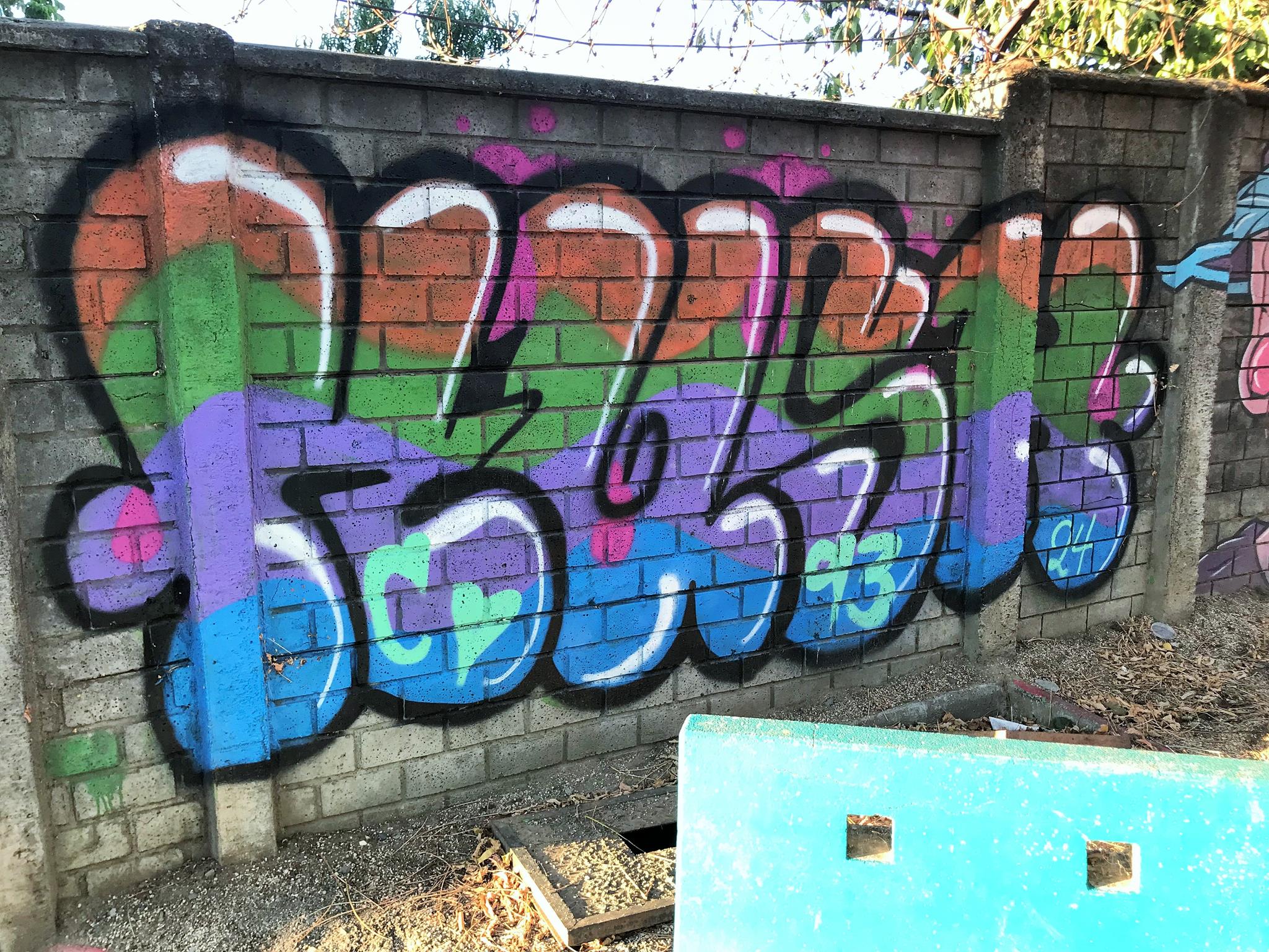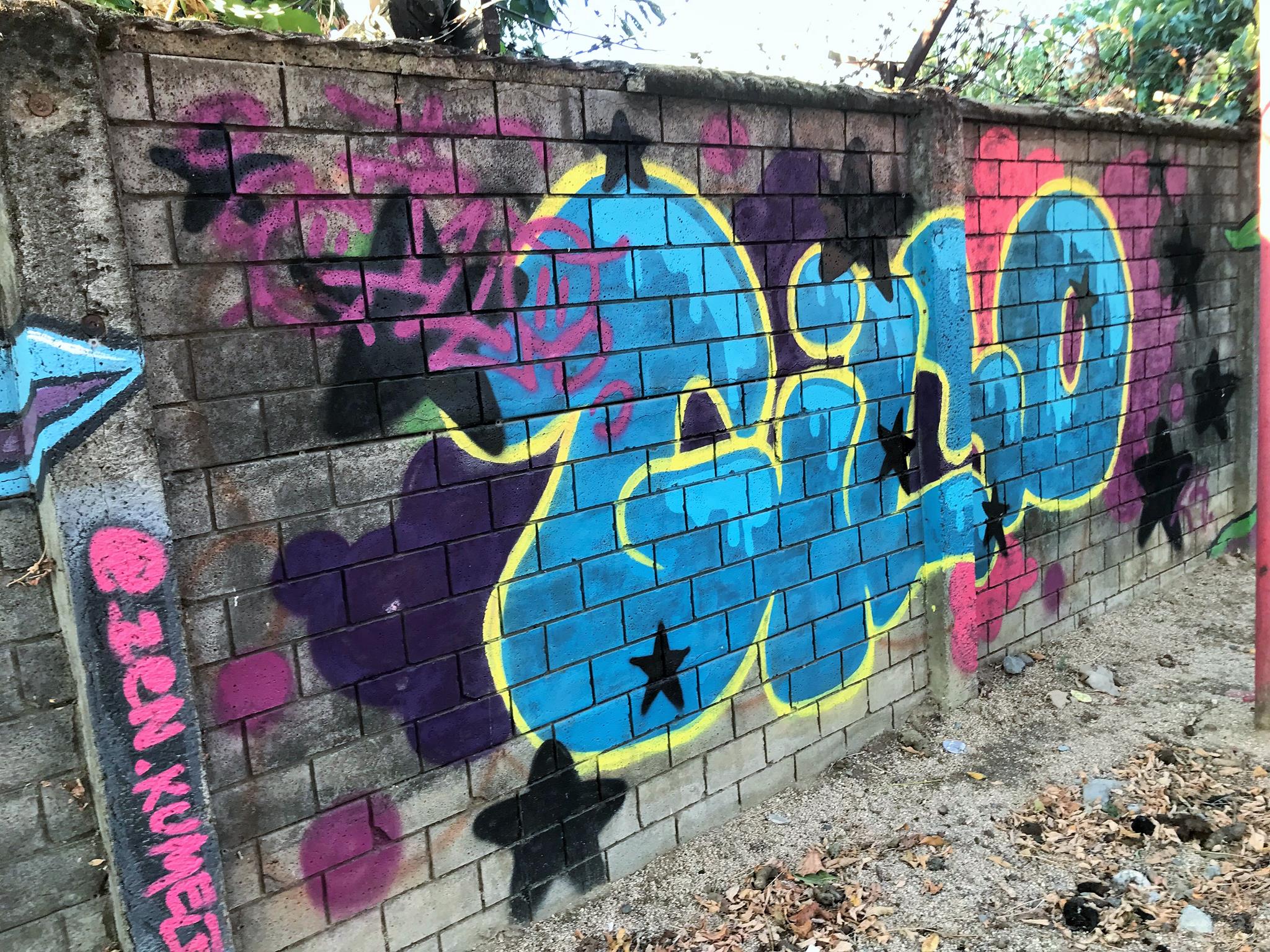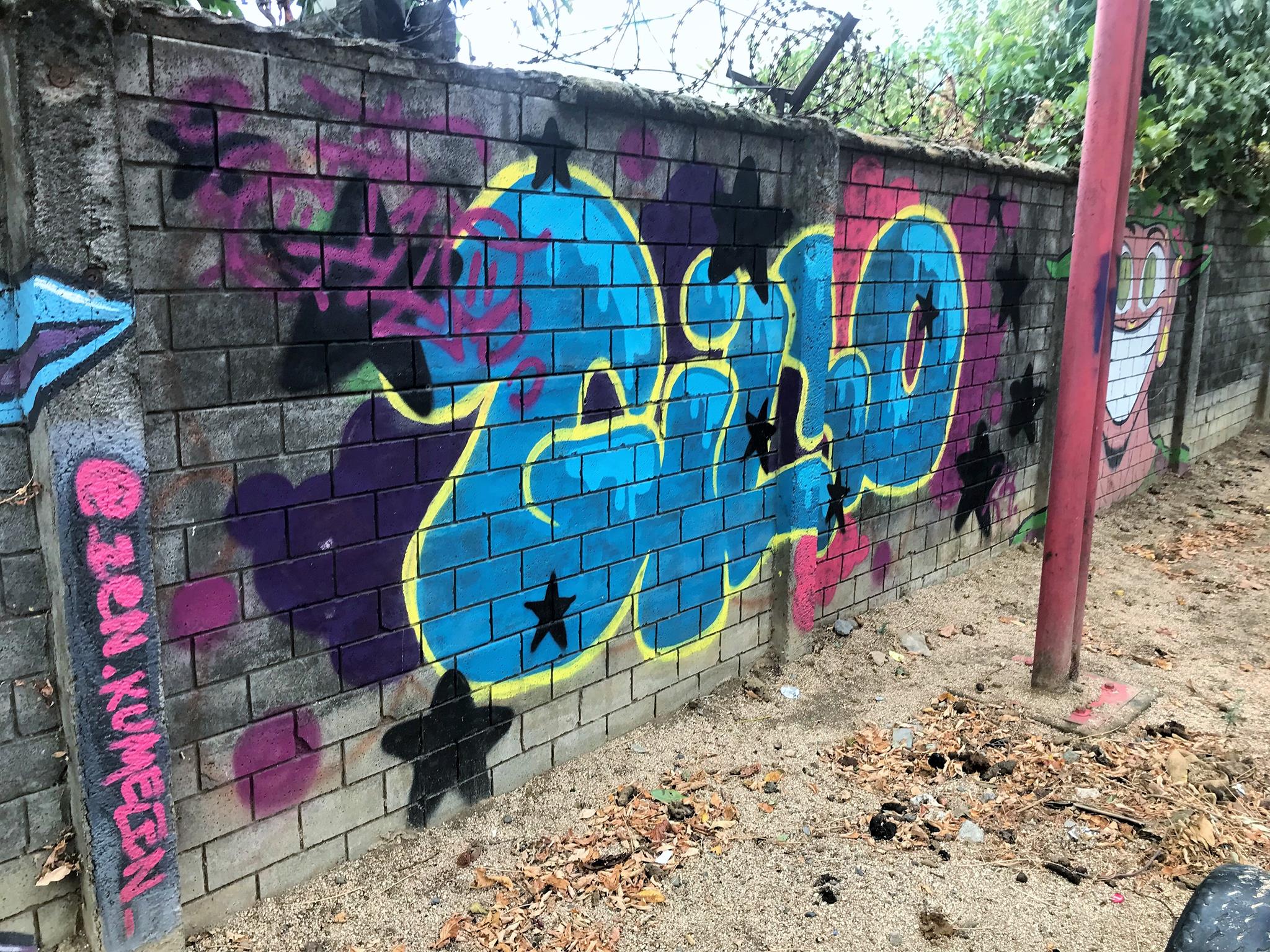 Starting on the left, we have a colorful, curved KUSH flop. Next is ZEN’s Smile character, this time with his eyes closed. His Instagram account stands out, written on one of the pillars of the wall. Next, a blue GILLO flop with a yellow border and surrounded by black stars that make the flop look like it’s floating in space. On the right, we have another graffiti of ZEN’s Smile character, this time with his eyes wide open! A few meters further to the right, and outside the covered space of the plaza, there are three hearts with names written above each one.