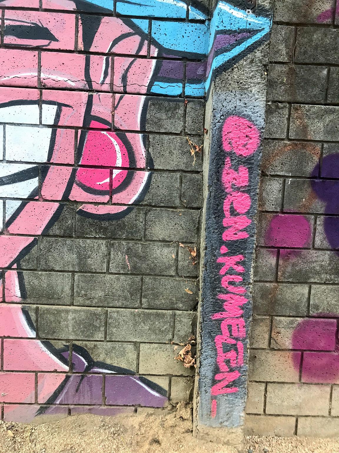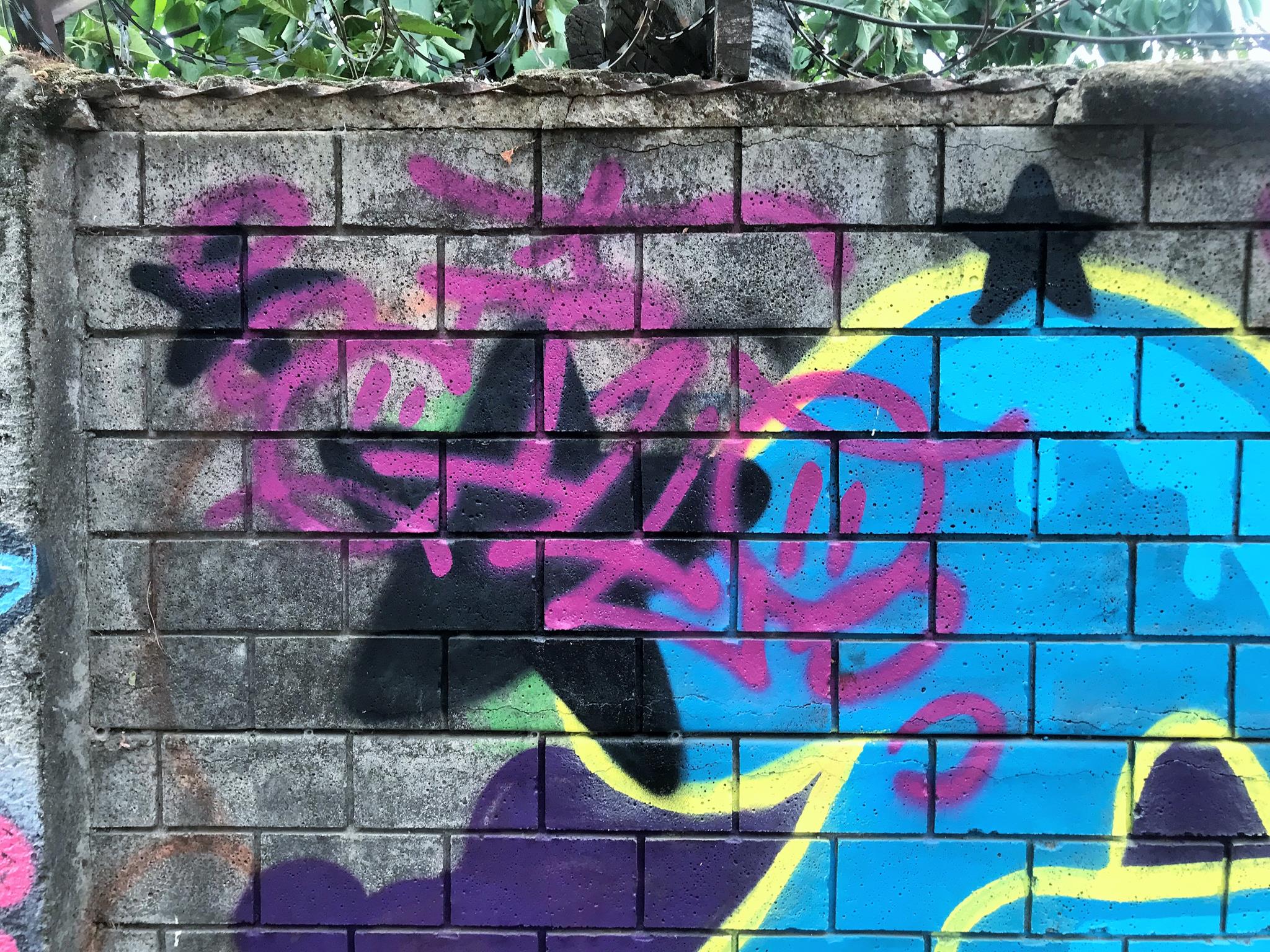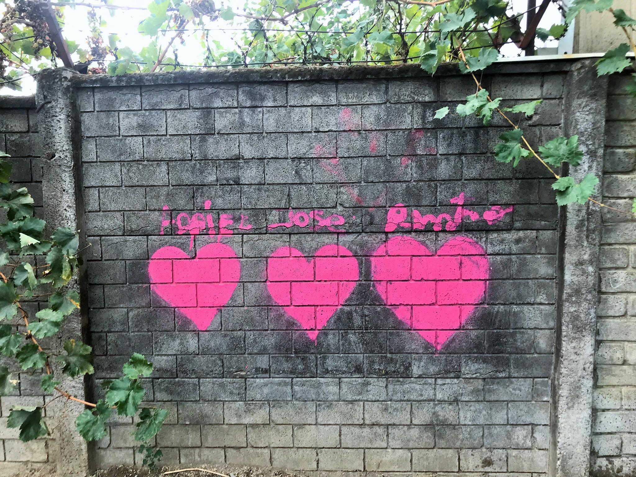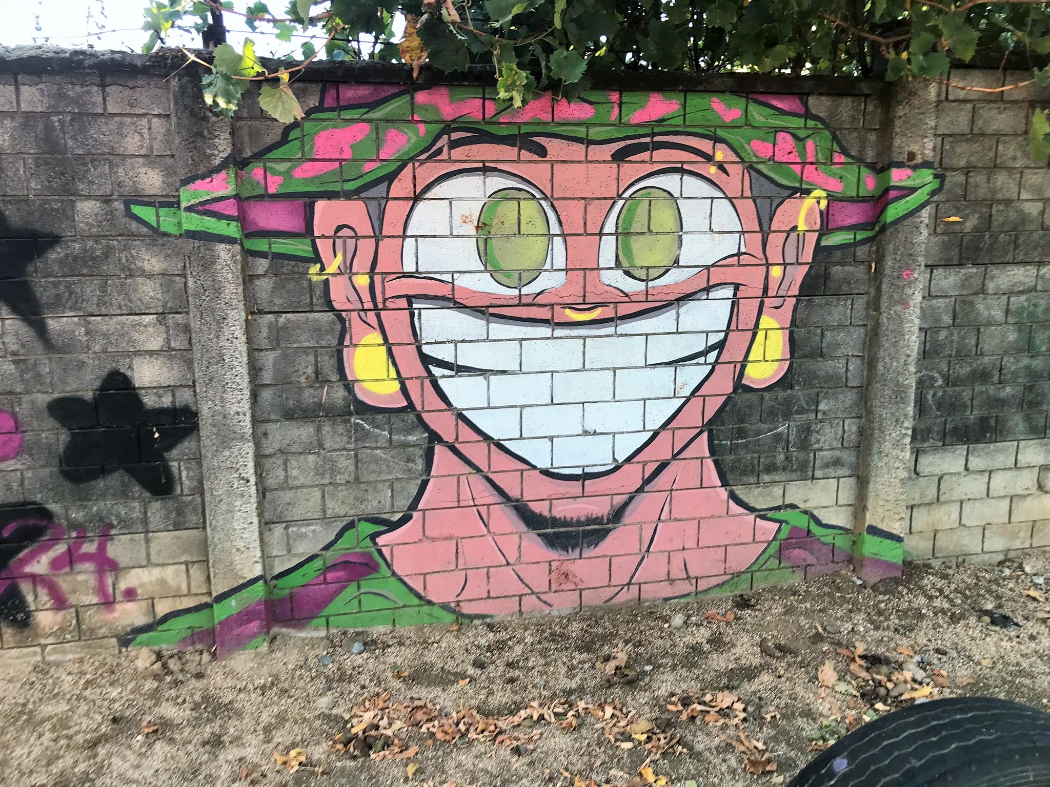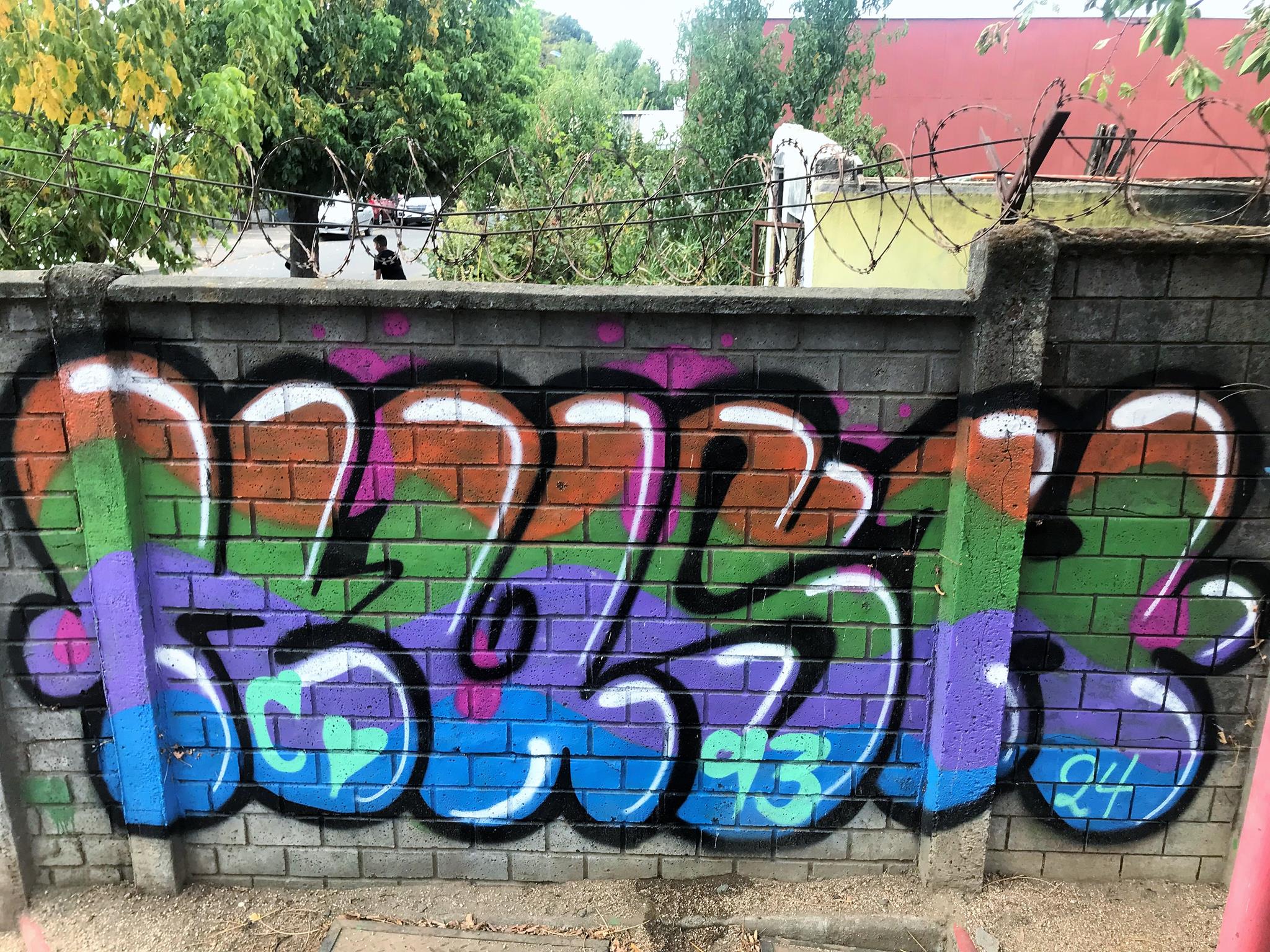 Starting on the left, we have a colorful, curved KUSH flop. Next is ZEN’s Smile character, this time with his eyes closed. His Instagram account stands out, written on one of the pillars of the wall. Next, a blue GILLO flop with a yellow border and surrounded by black stars that make the flop look like it’s floating in space. On the right, we have another graffiti of ZEN’s Smile character, this time with his eyes wide open! A few meters further to the right, and outside the covered space of the plaza, there are three hearts with names written above each one.