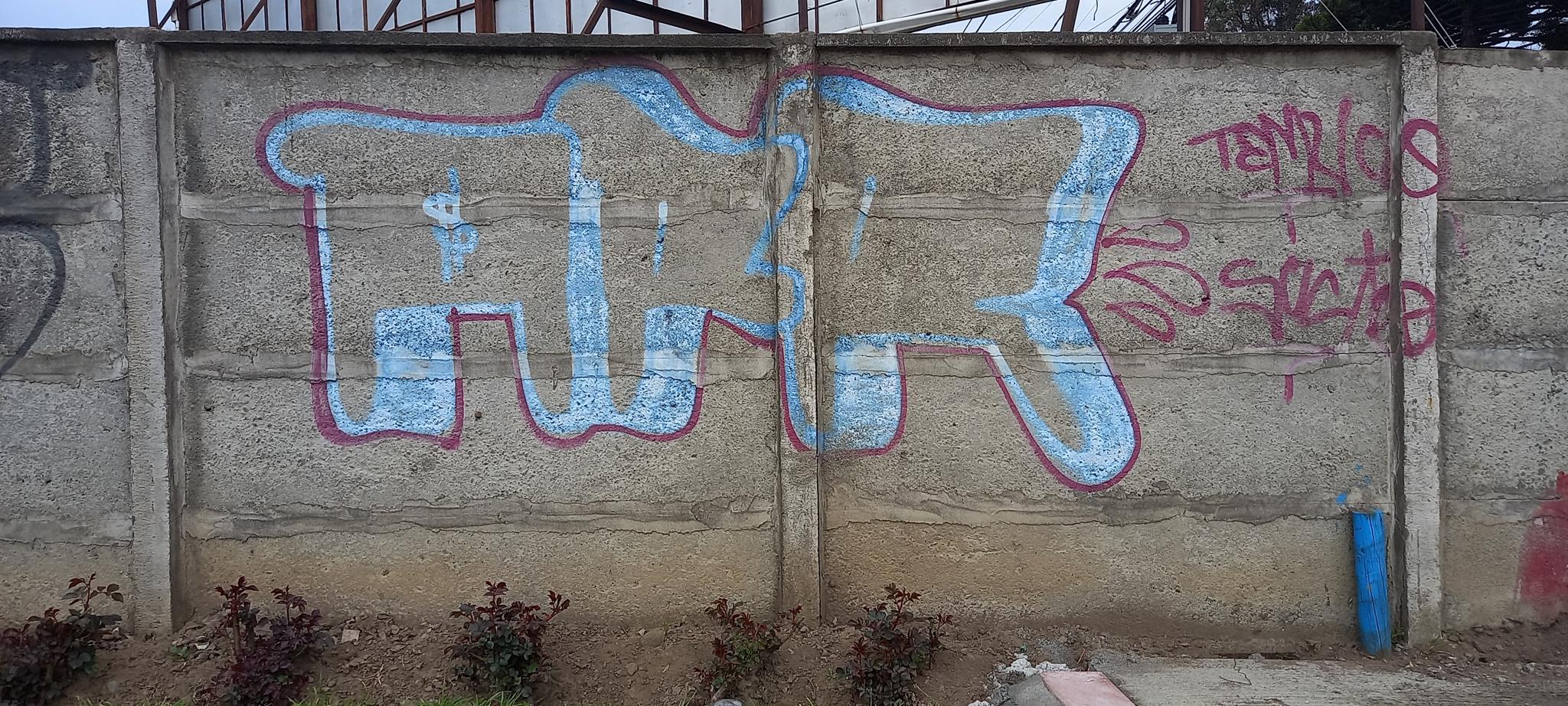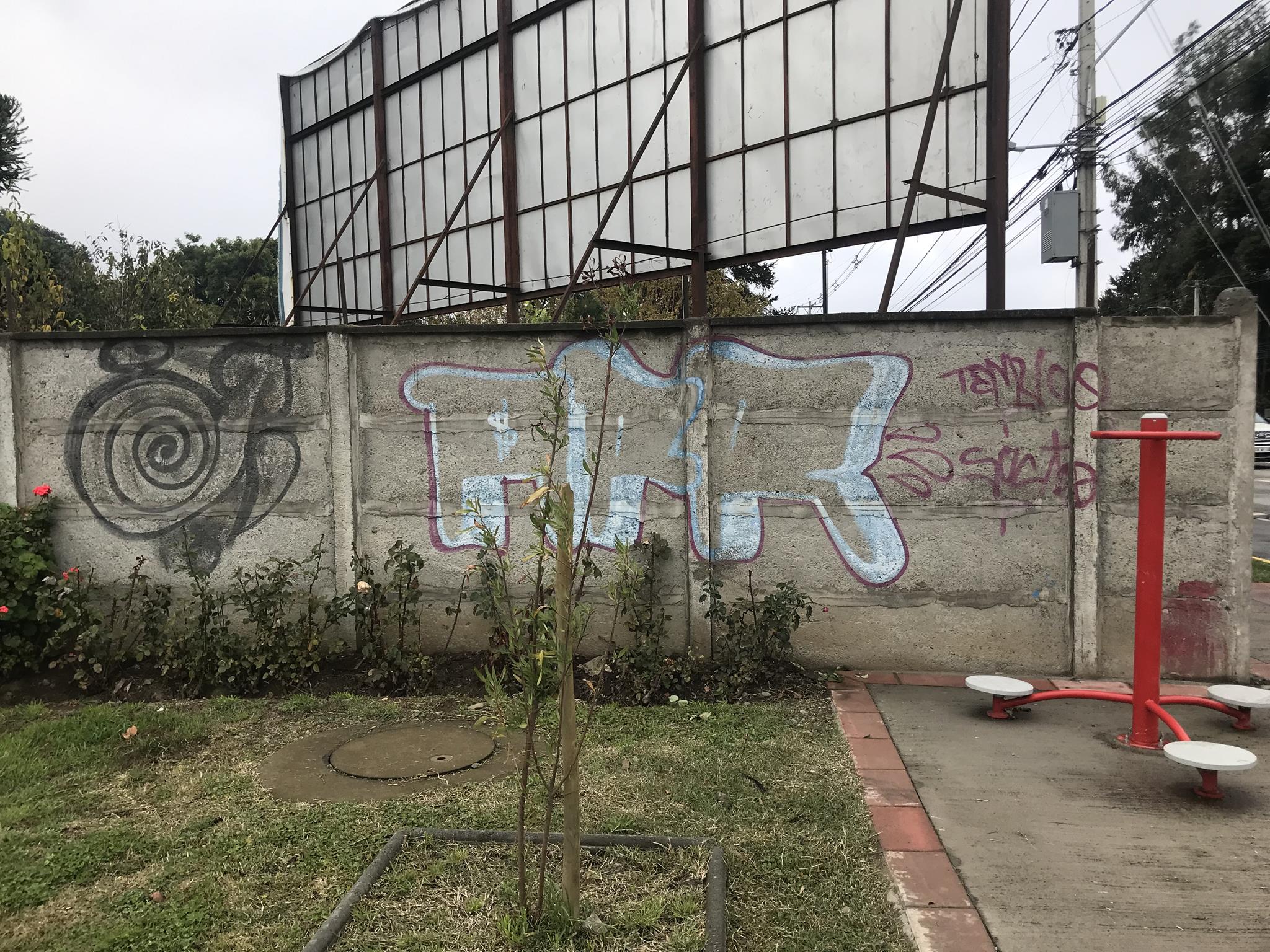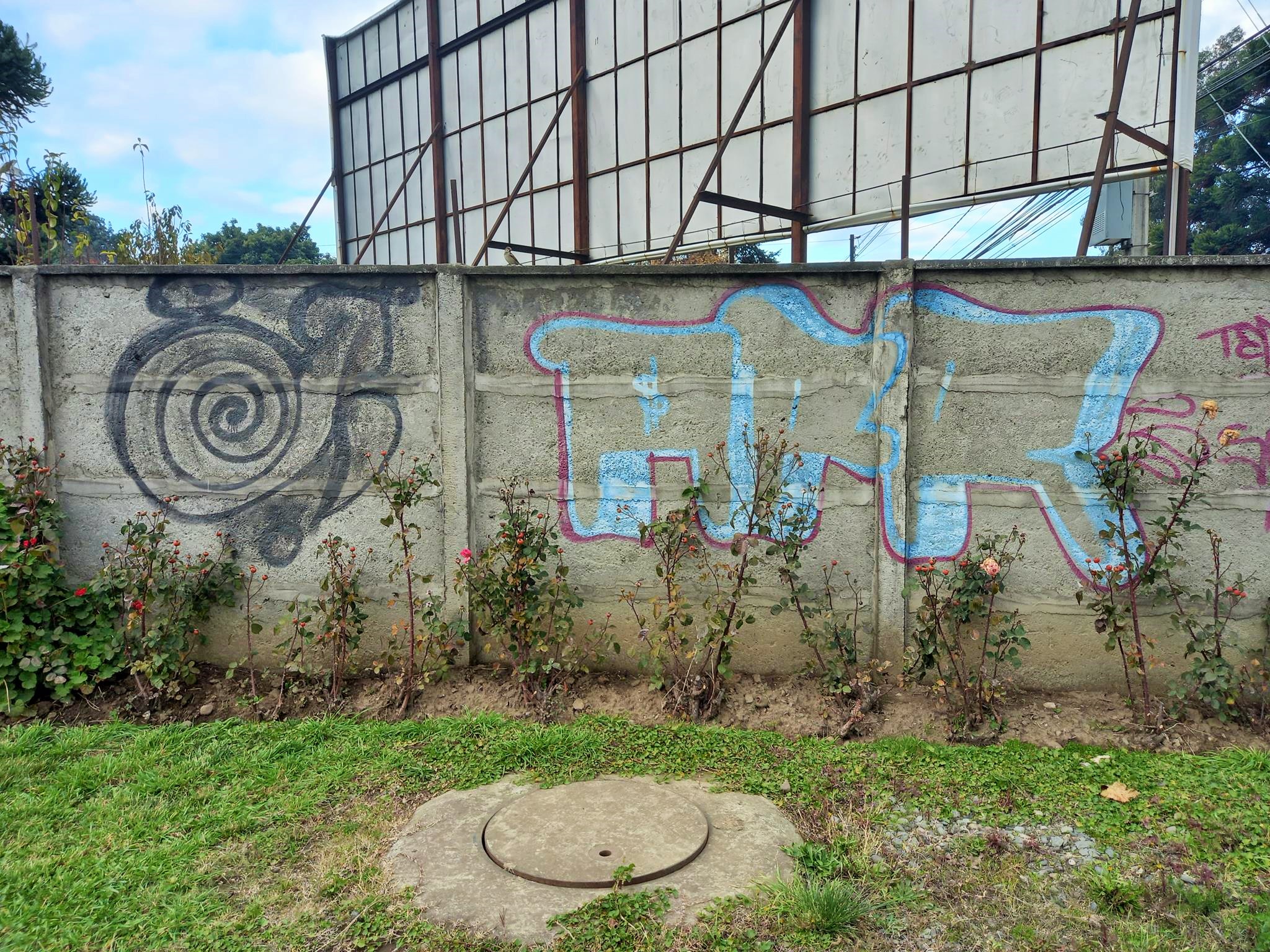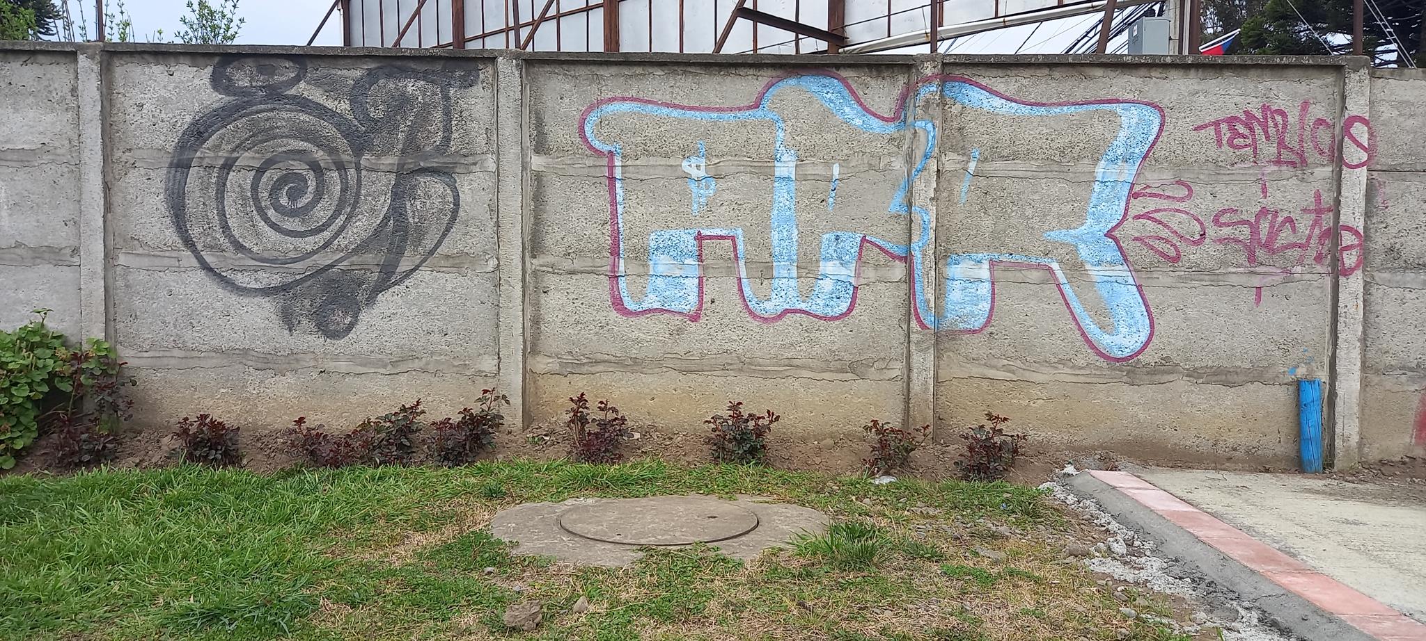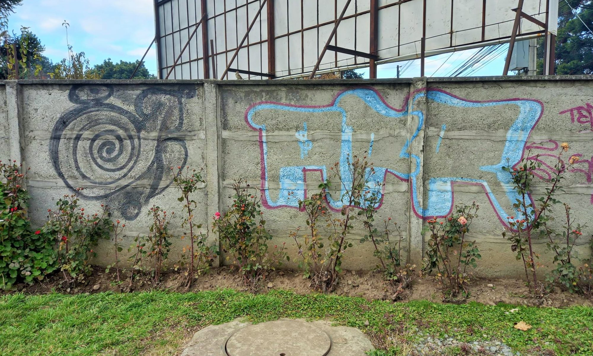 This quiet street called Mailén, where this street art is located, is the wall of the property at Av. Bernardo O’Higgins 1271. Originally, there was only grass and a few benches. Now there are gardens, playgrounds and exercise machines. On the corner wall is a typical flop by APR, also found elsewhere in Angol. To the left of the art by APR, there is a figure resembling a snail. No tag or trace of the artist. Its design and black color stand out next to the light blue APR flop. Some meters further to the left, there’s a bird that looks like it’s about to land on a tree branch. There’s no sign of the beautiful bird’s creator either.