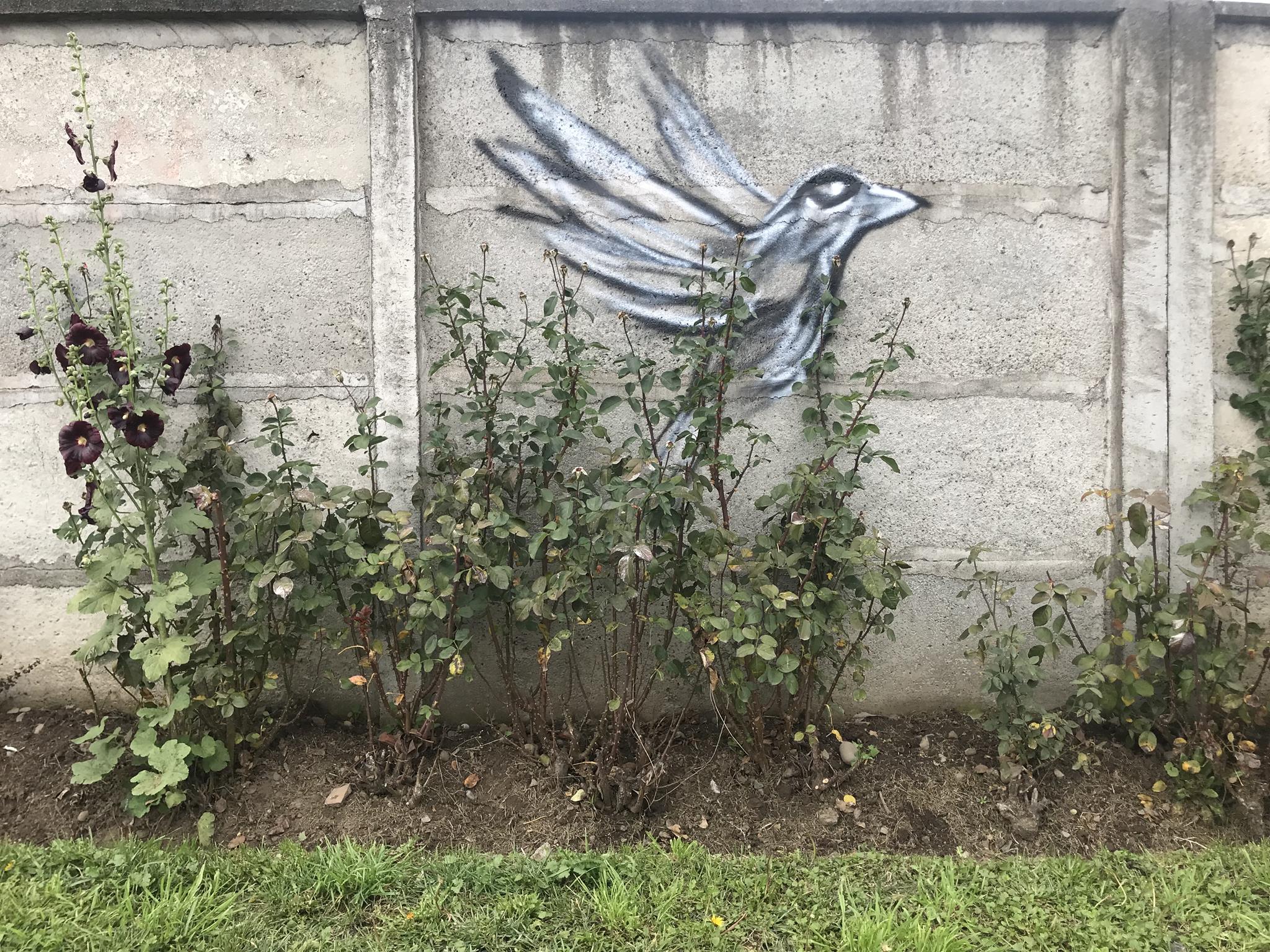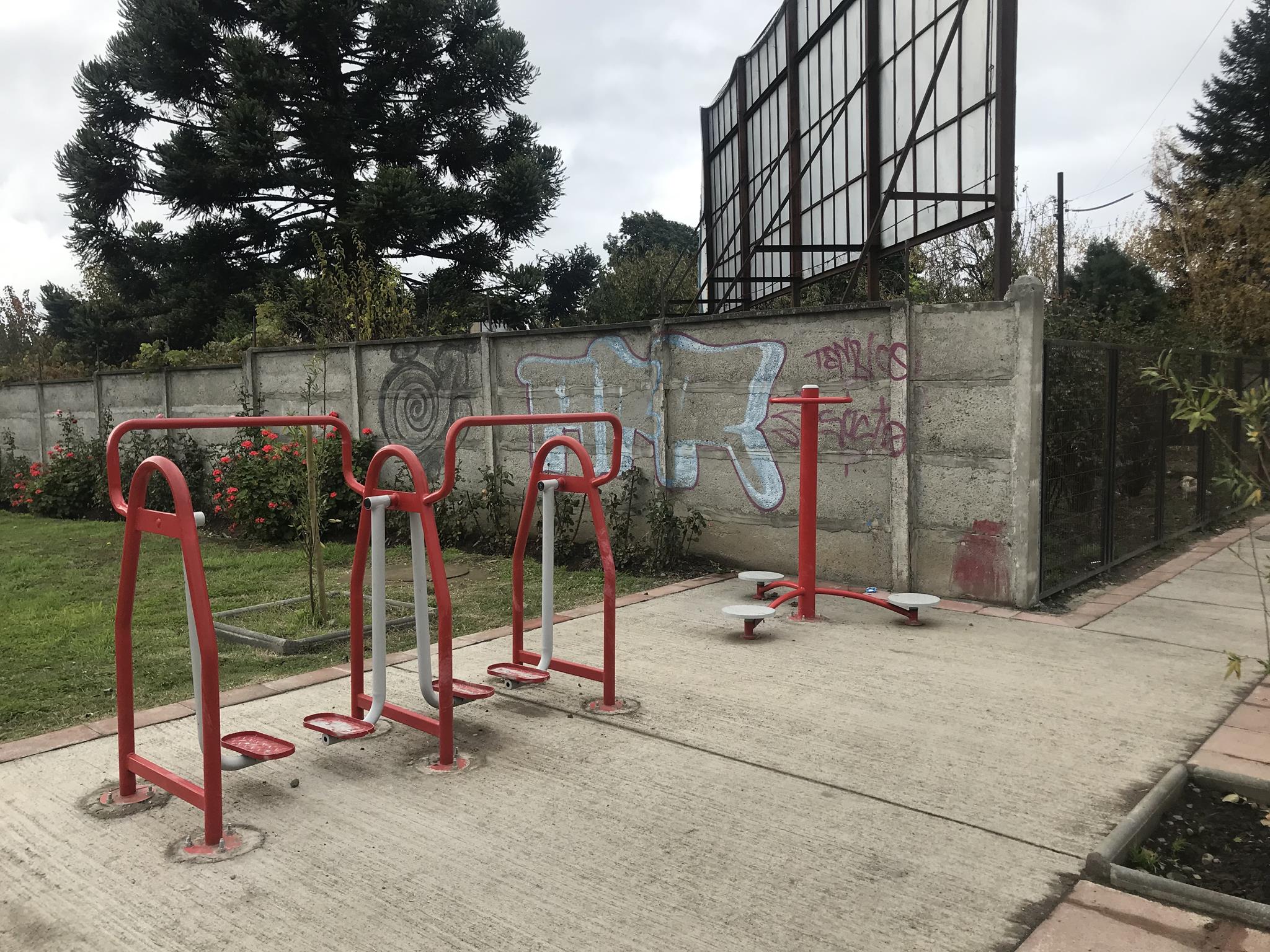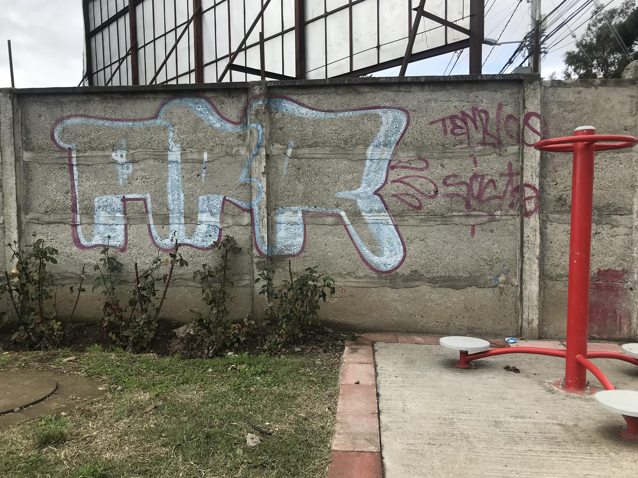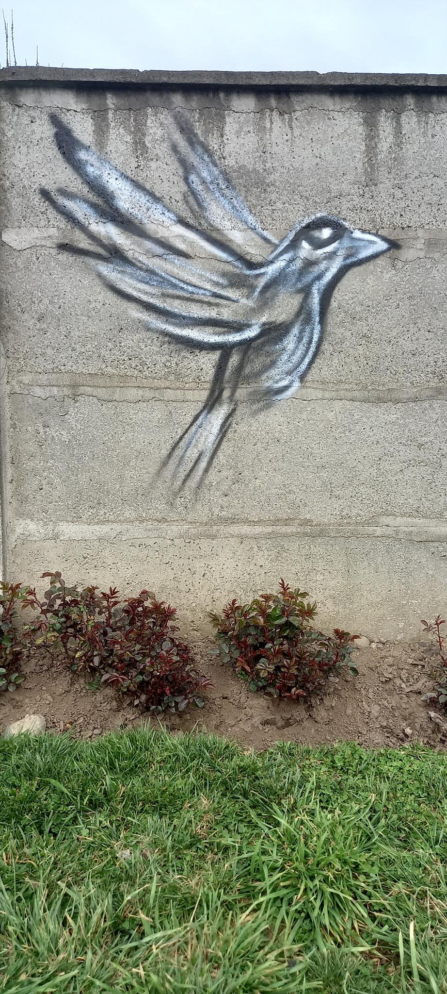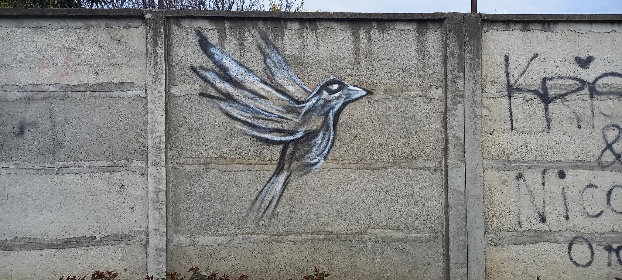 This quiet street called Mailén, where this street art is located, is the wall of the property at Av. Bernardo O’Higgins 1271. Originally, there was only grass and a few benches. Now there are gardens, playgrounds and exercise machines. On the corner wall is a typical flop by APR, also found elsewhere in Angol. To the left of the art by APR, there is a figure resembling a snail. No tag or trace of the artist. Its design and black color stand out next to the light blue APR flop. Some meters further to the left, there’s a bird that looks like it’s about to land on a tree branch. There’s no sign of the beautiful bird’s creator either.