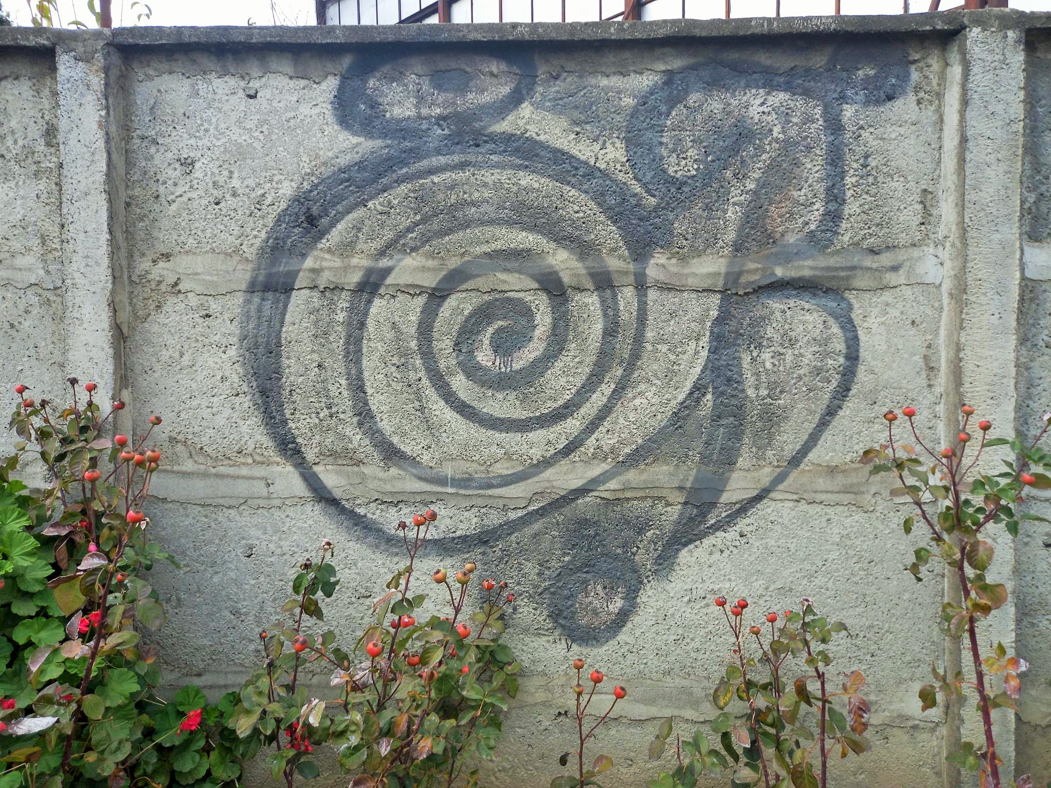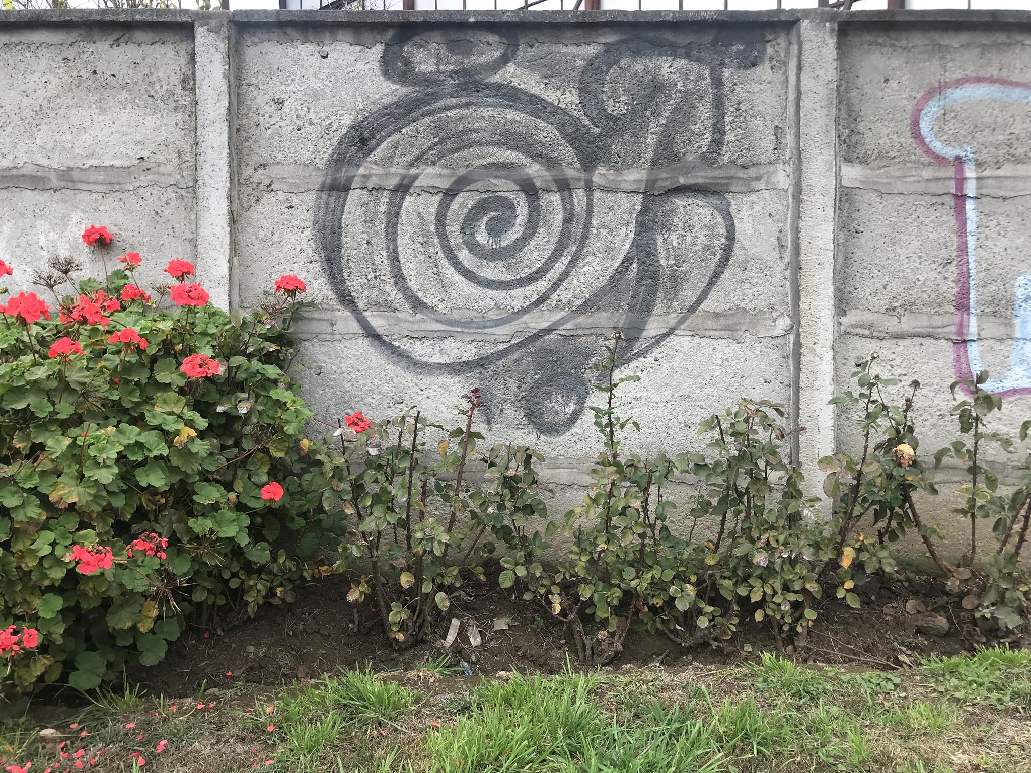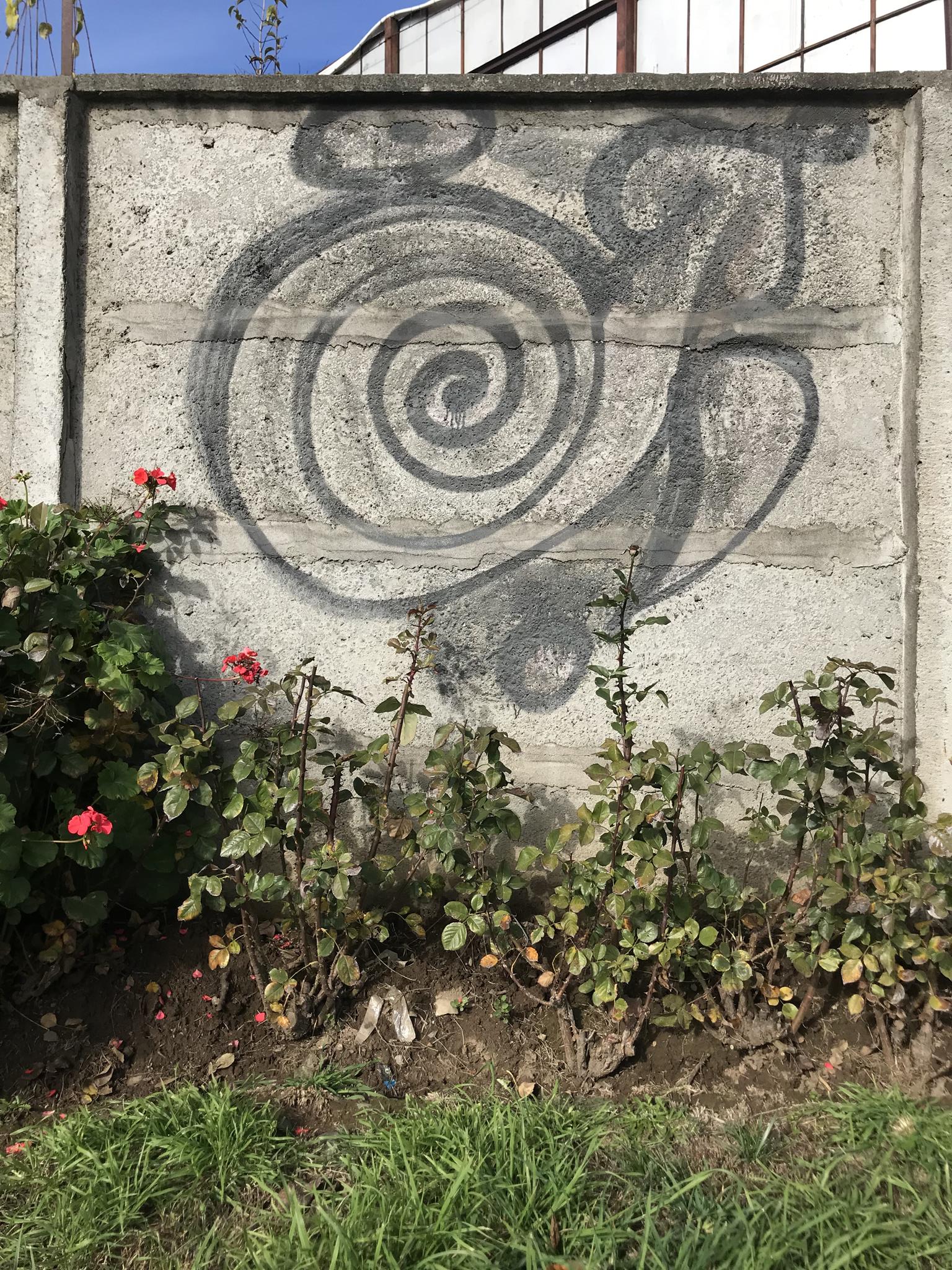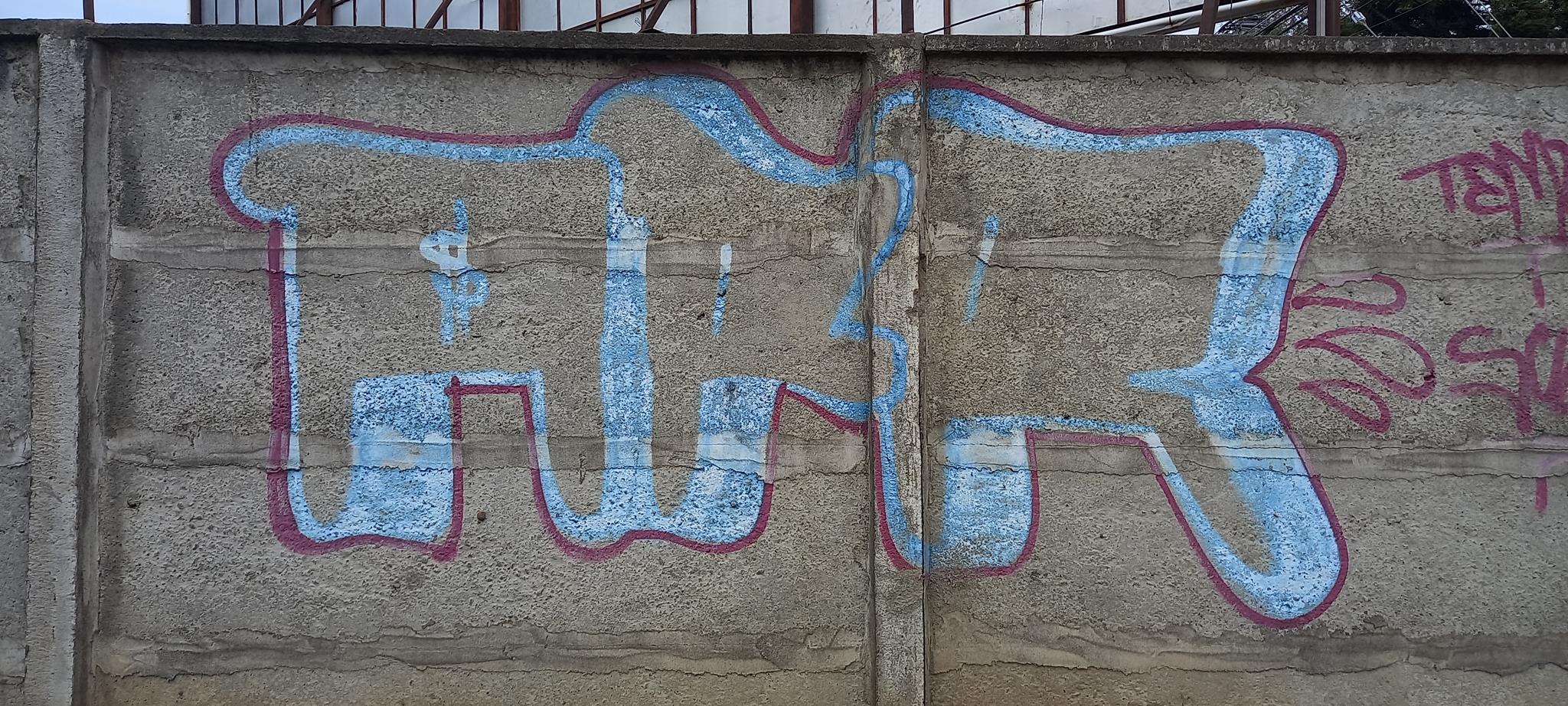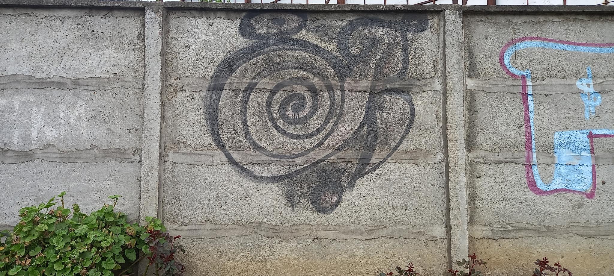 This quiet street called Mailén, where this street art is located, is the wall of the property at Av. Bernardo O’Higgins 1271. Originally, there was only grass and a few benches. Now there are gardens, playgrounds and exercise machines. On the corner wall is a typical flop by APR, also found elsewhere in Angol. To the left of the art by APR, there is a figure resembling a snail. No tag or trace of the artist. Its design and black color stand out next to the light blue APR flop. Some meters further to the left, there’s a bird that looks like it’s about to land on a tree branch. There’s no sign of the beautiful bird’s creator either.