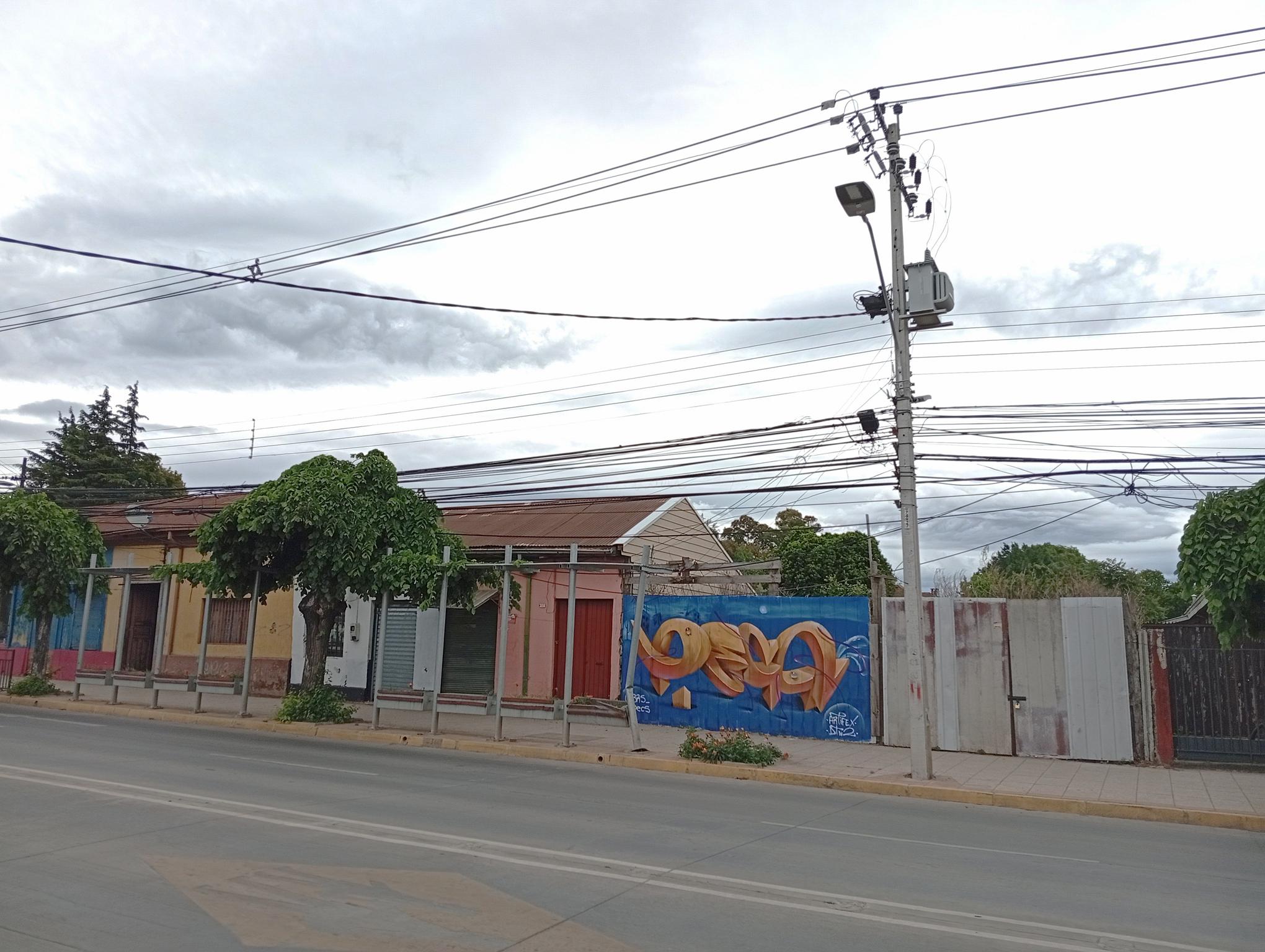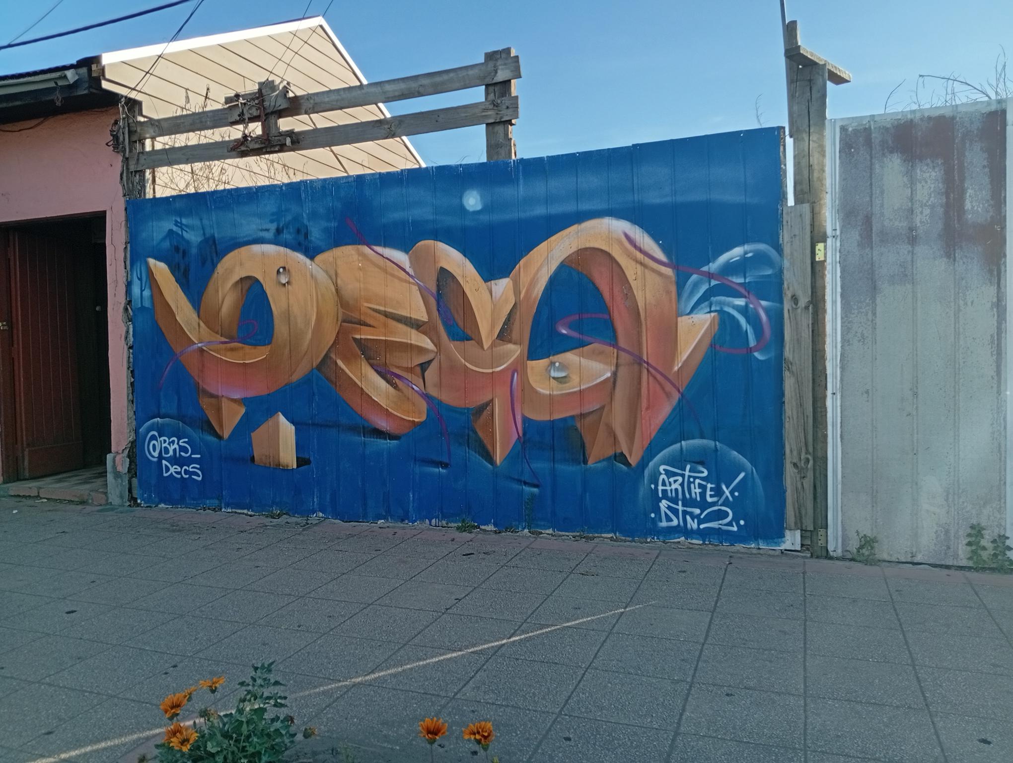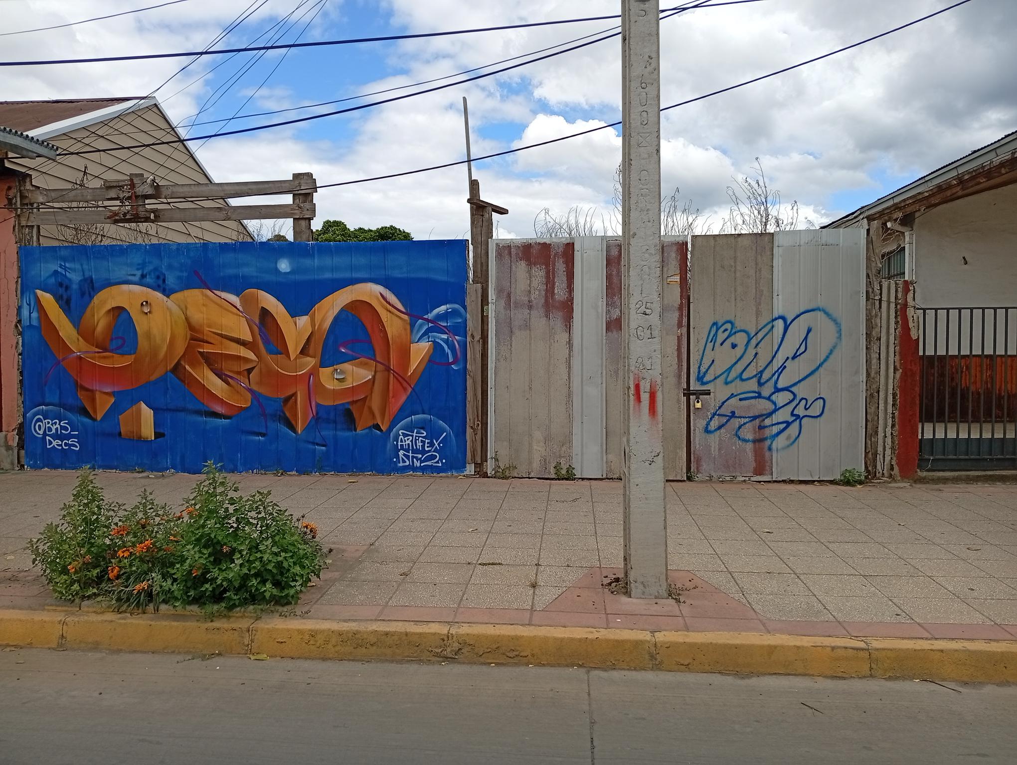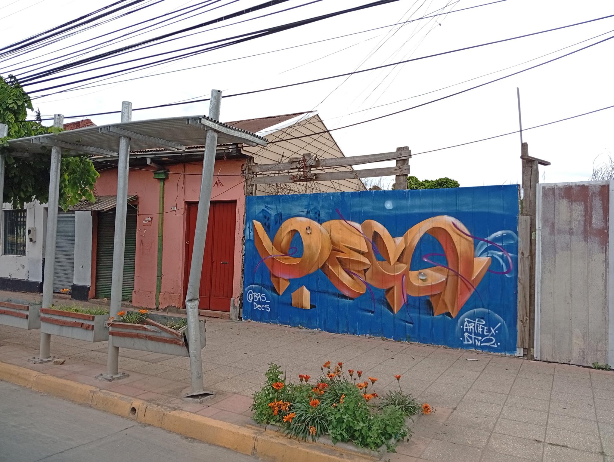 DECS, an artist from Temuco, was visiting a relative and wanted to leave his art on the main avenue of Angol, the one that crosses the Rehue River Bridge and leads to the city center or downtown. DECS belongs to the DETONAOS FAMILY aka DTN2 CREW, a group of great artists from Temuco, a city 130 km south of Angol. It is there that DECS began to develop his art. The graffiti shown here is a flop that says DECS, short for the Spanish word “decoras” (decorate). The artist intends to decorate everything with their paint and do it wholeheartedly, which is why they chose DECS as their artistic name.