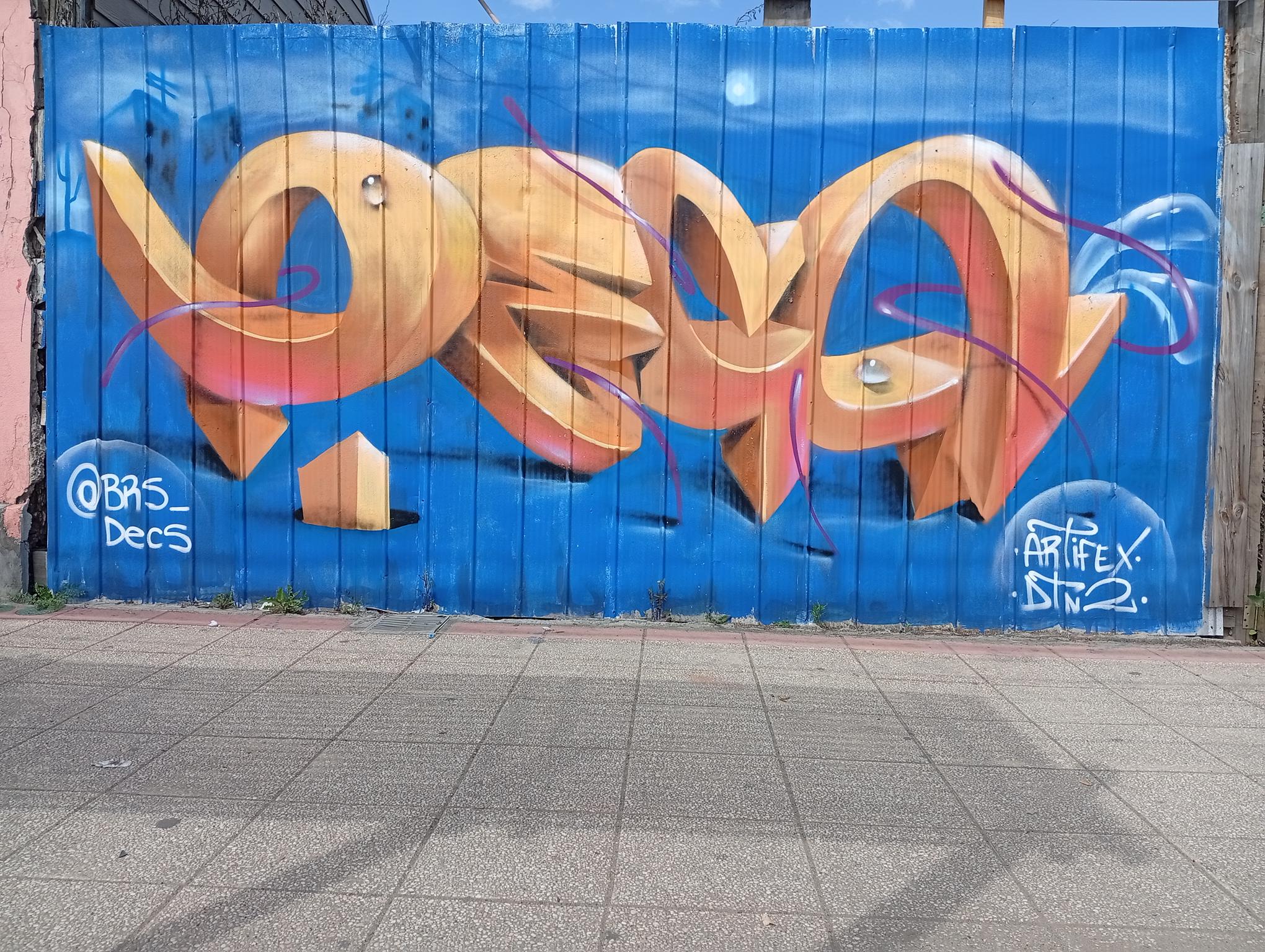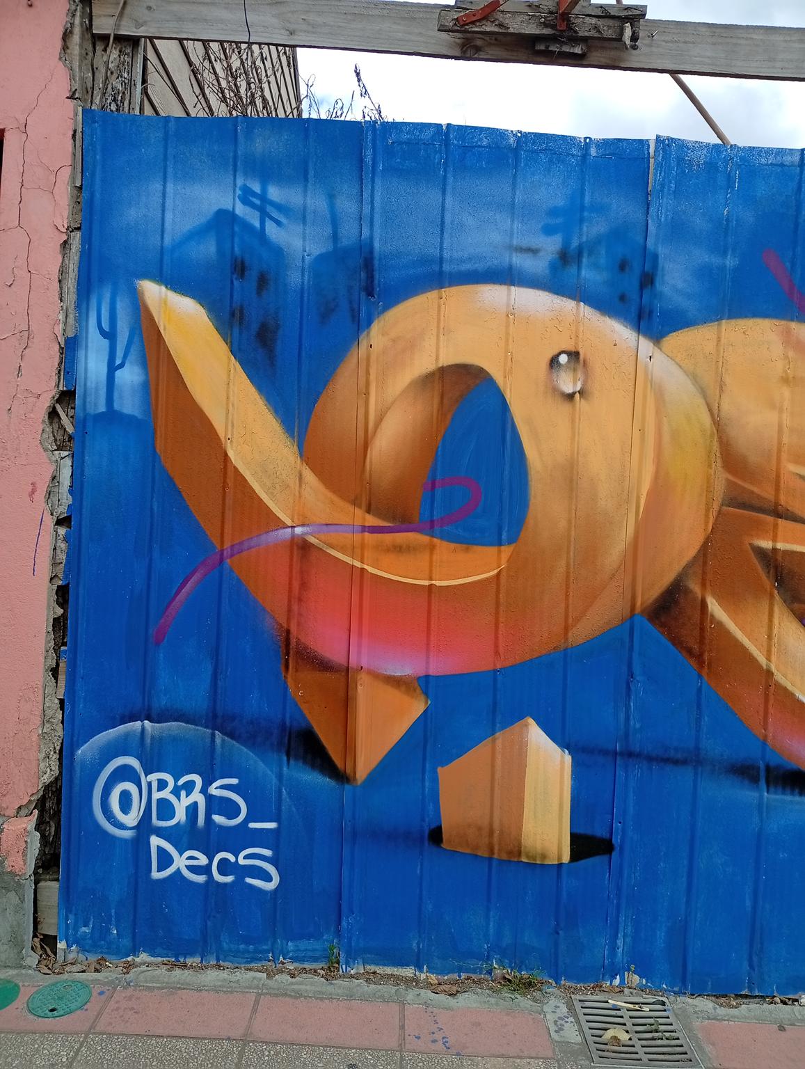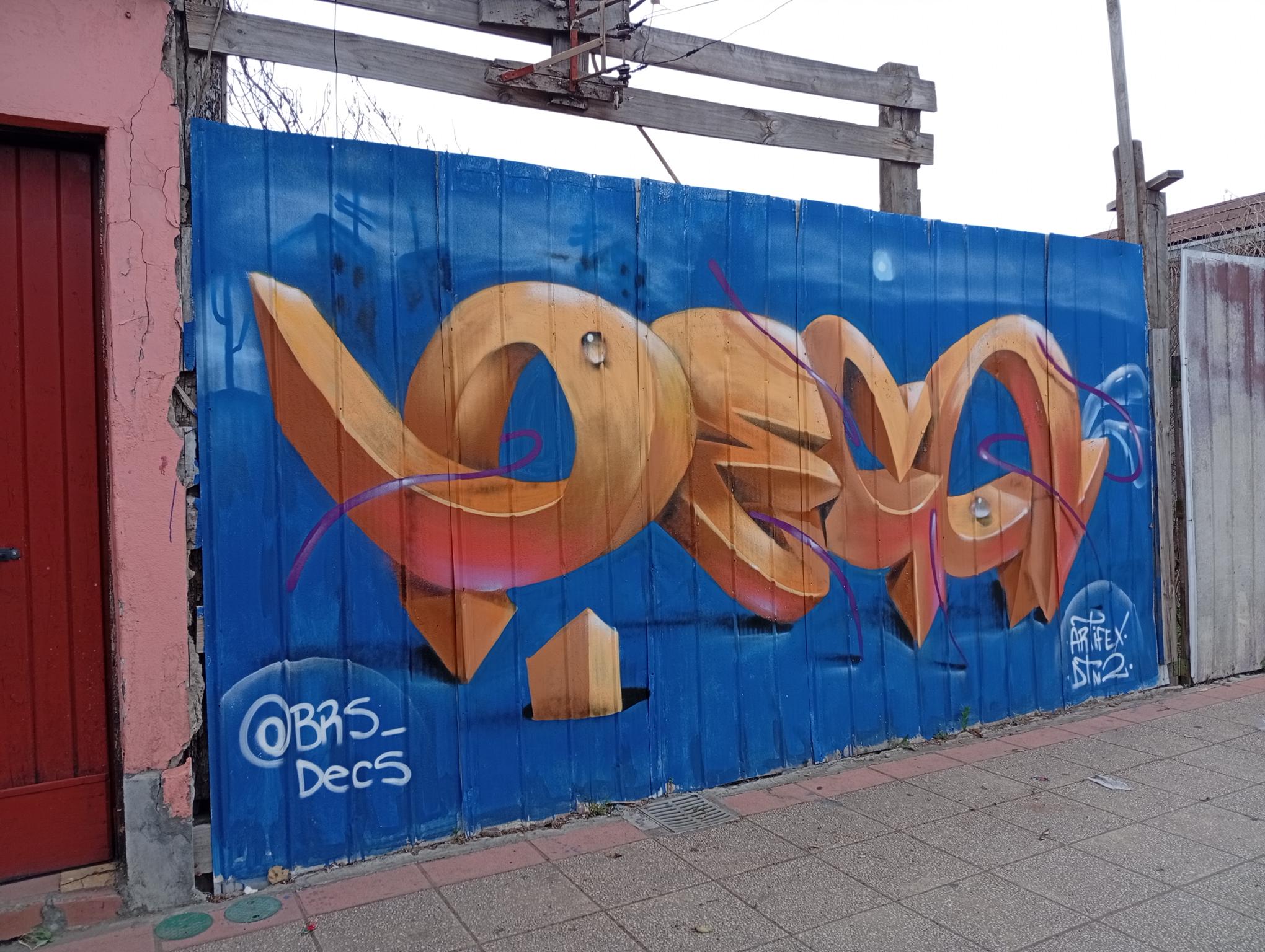 DECS, an artist from Temuco, was visiting a relative and wanted to leave his art on the main avenue of Angol, the one that crosses the Rehue River Bridge and leads to the city center or downtown. DECS belongs to the DETONAOS FAMILY aka DTN2 CREW, a group of great artists from Temuco, a city 130 km south of Angol. It is there that DECS began to develop his art. The graffiti shown here is a flop that says DECS, short for the Spanish word “decoras” (decorate). The artist intends to decorate everything with their paint and do it wholeheartedly, which is why they chose DECS as their artistic name.
