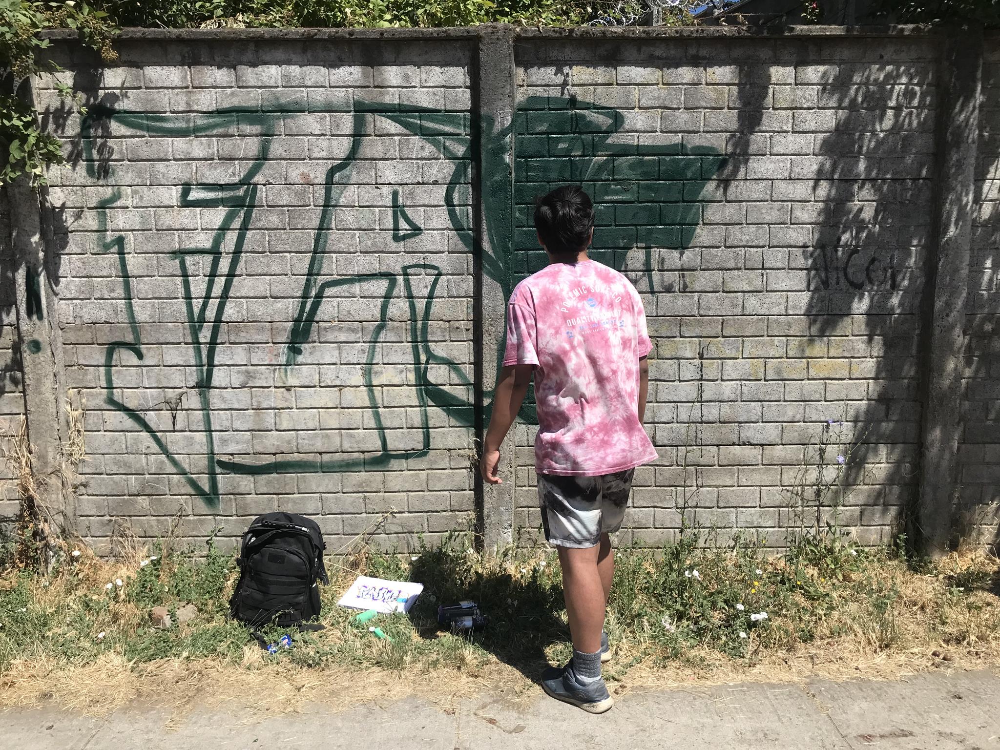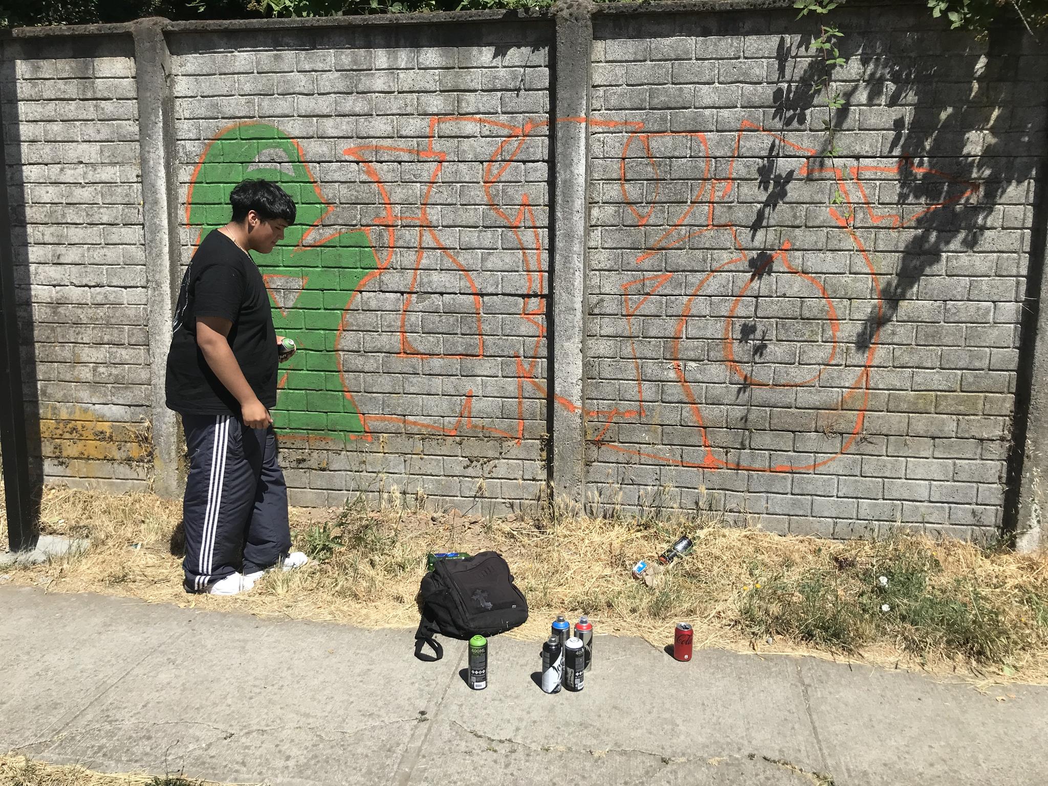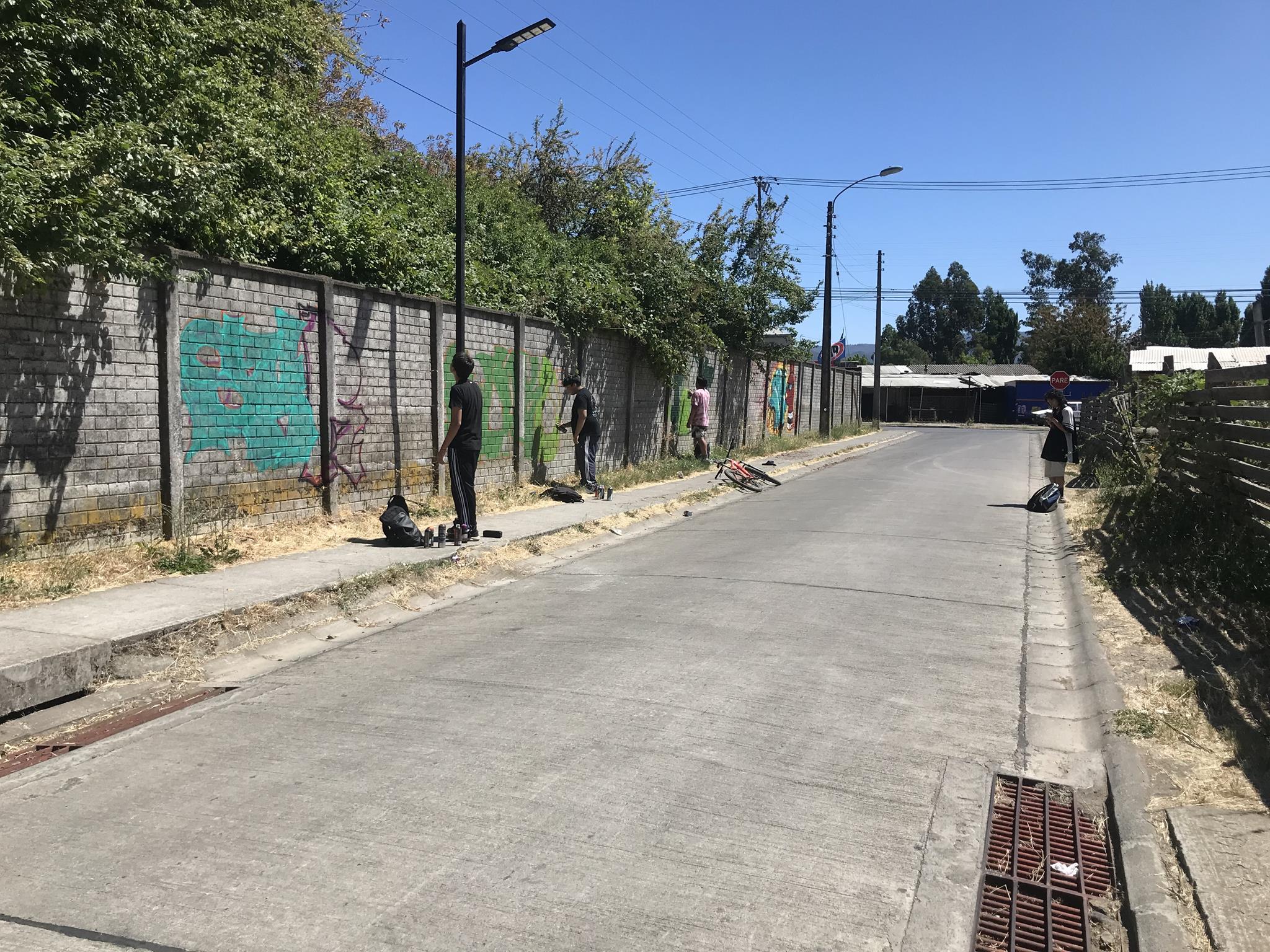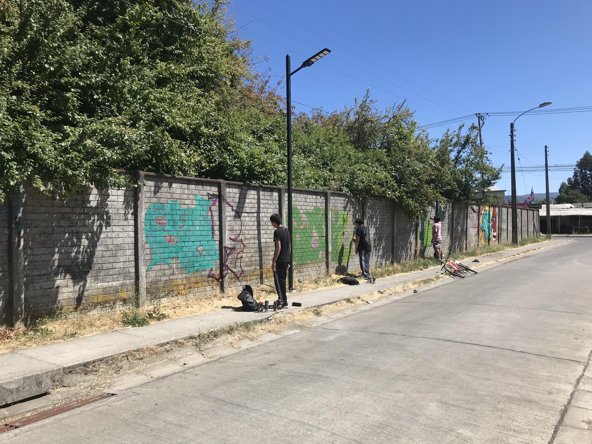 Once her graffiti was finished, GILLO organized and directed the creation of more graffiti with her friends from Angol. It should be noted that all those who participated in the beautification of Circunvalación Oriente wall are young people who are still in high school and who are the future of graffiti in Angol. In the photo below you can see how GILLO directs and organizes her friends from behind while they are painting their graffiti.