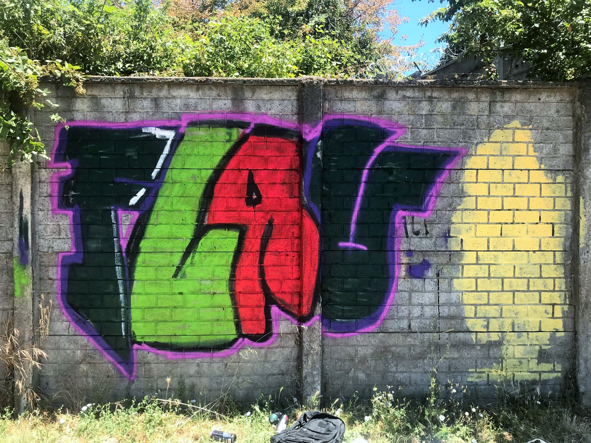 One of the last photos says RASKAS CREW, which is the former M26 CREW, a group to which all these artists belong and also others from Angol who could not attend this artistic meeting. Curiously, at some point during his graffiti drawing, FLAUNO wanted to clean his brush and to get the black color out, he painted the tag RASKAS CREW on the wall.