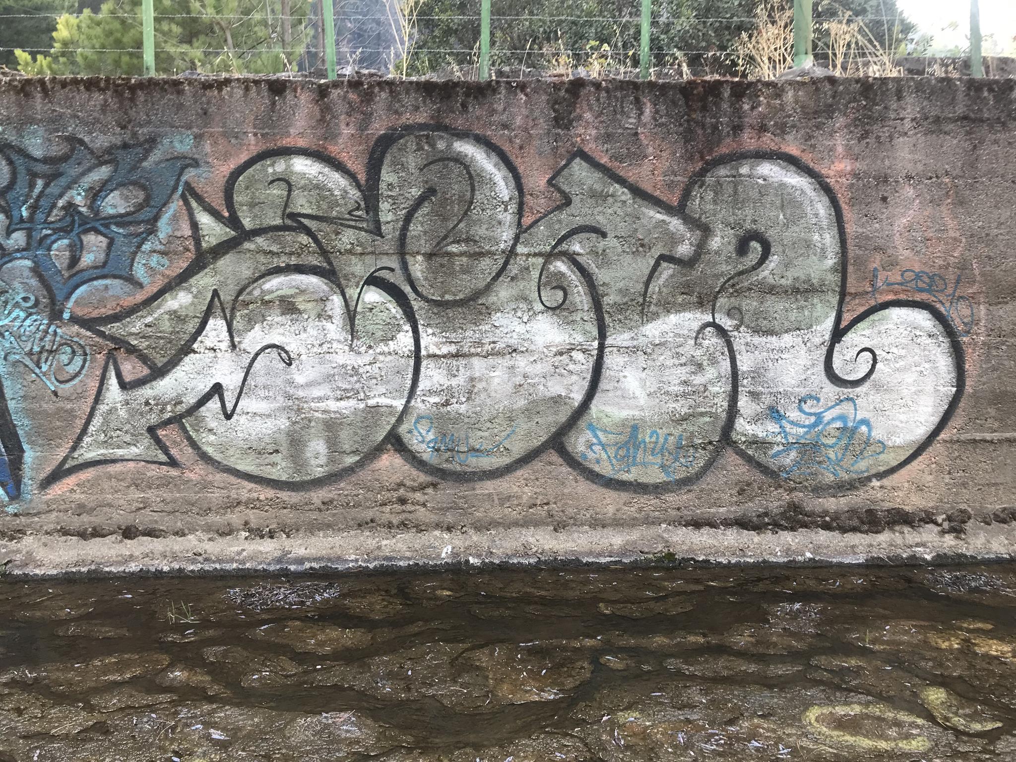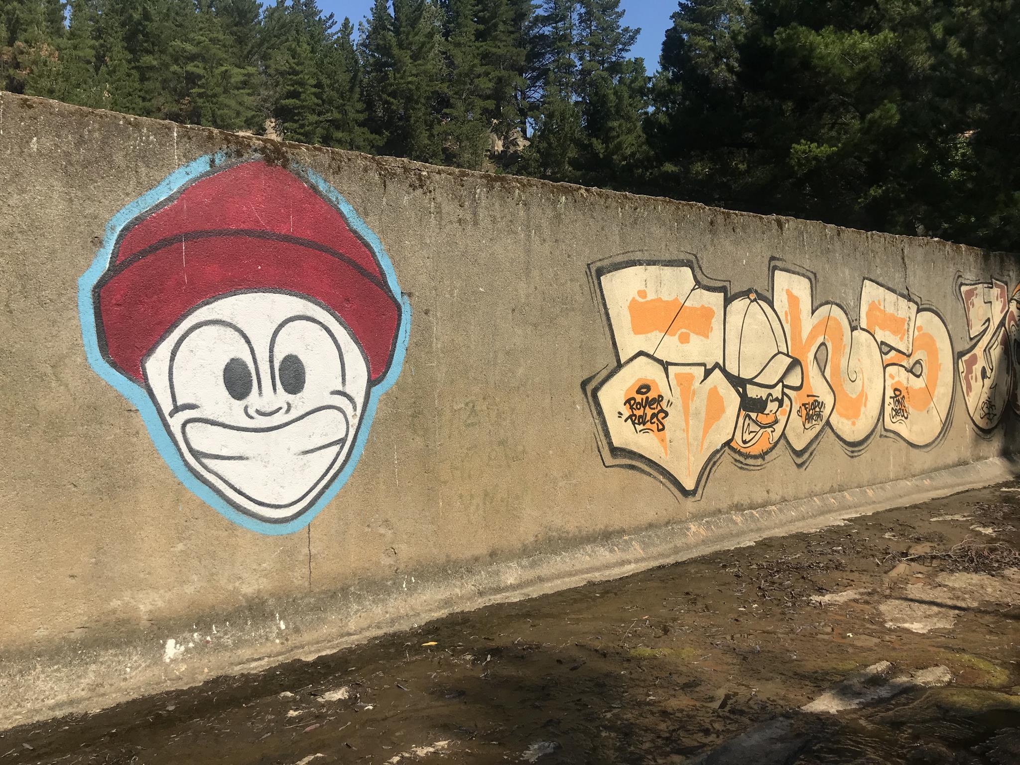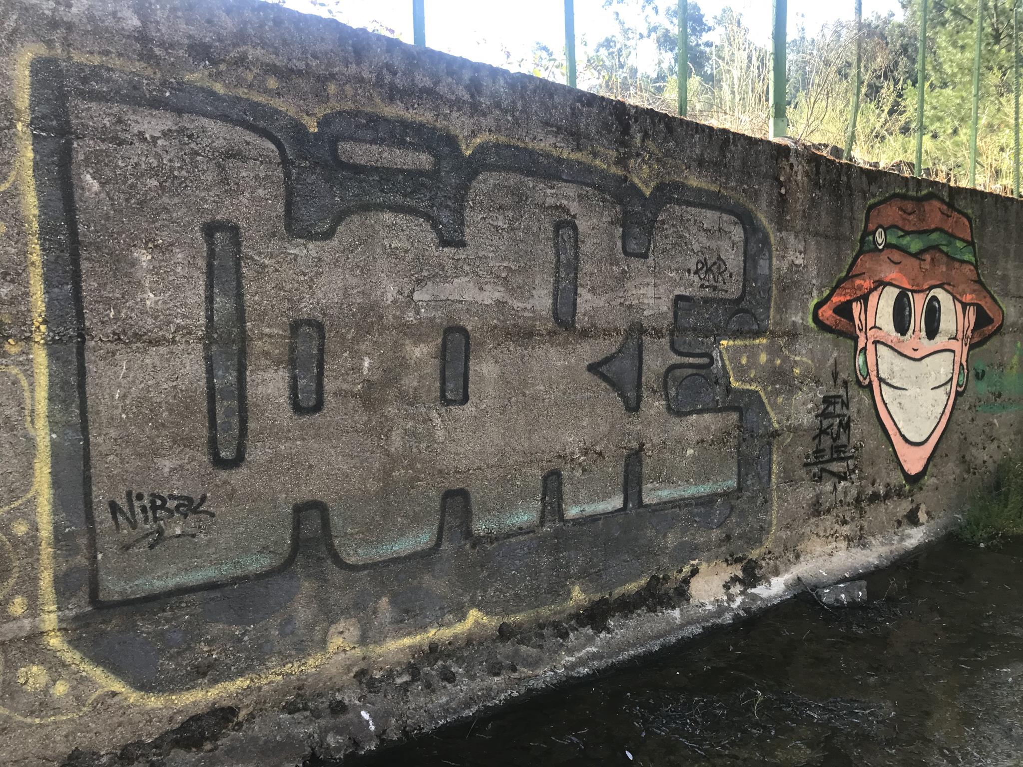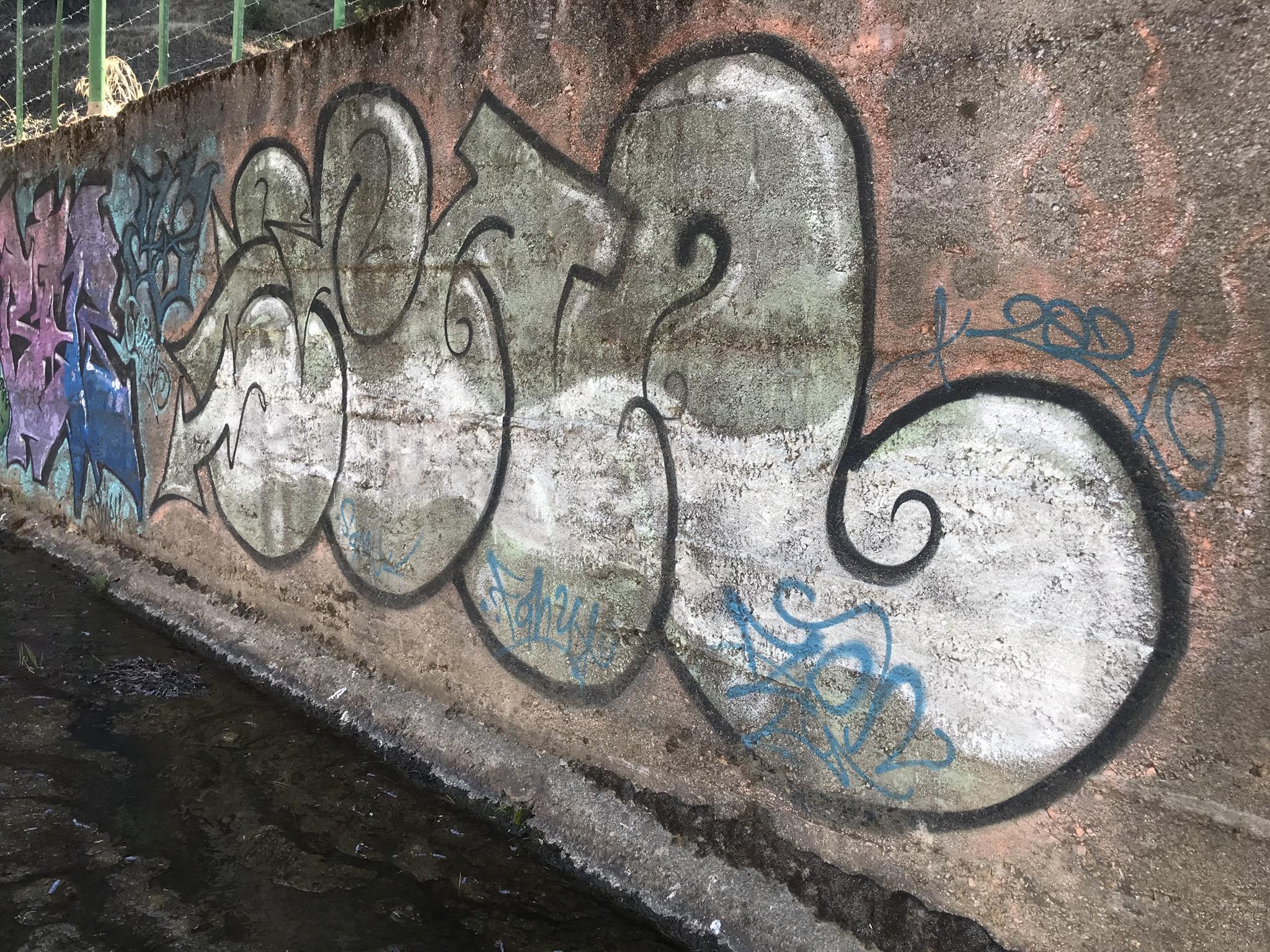 Here, at the back of the Canteras de Deuco, where canals run through, we also have graffiti on those canals’ walls. First, we find a large DYRE flop next to ZEN’s Smile character, this occasion with different tags near his ears. A few meters further on, we find three different connected graffiti: first, a colorful flop by KUSH; second, a spectacular flop featuring a dragon, created by DIBERZO; and finally, a white flop by ZEN. Finally, on another wall of the channel, you can see another Smile character drawn by ZEN. Next to the right, is the TONS flop signed by PABLO ANTAY. The last flop also says ZEN. Check out as well the page about the graffiti at the Canteras de Deuco and the the page about the history of that place.