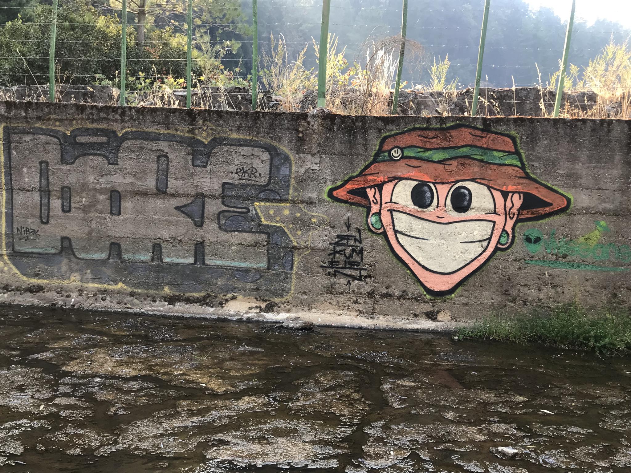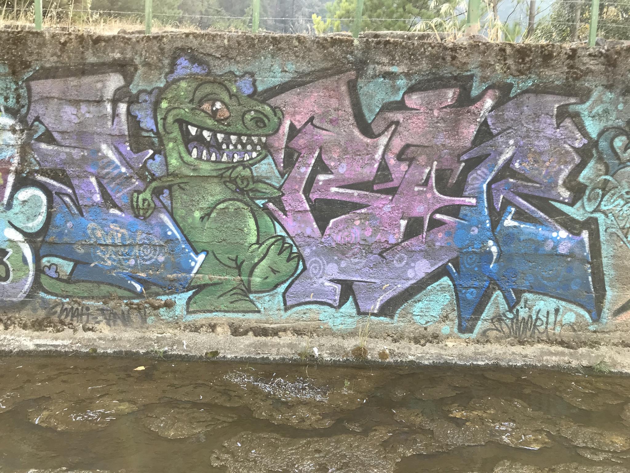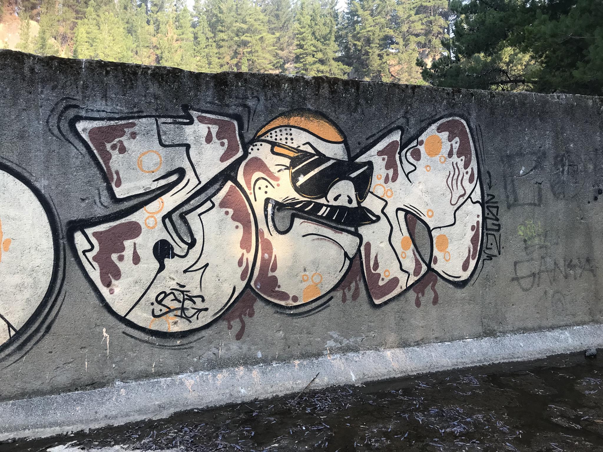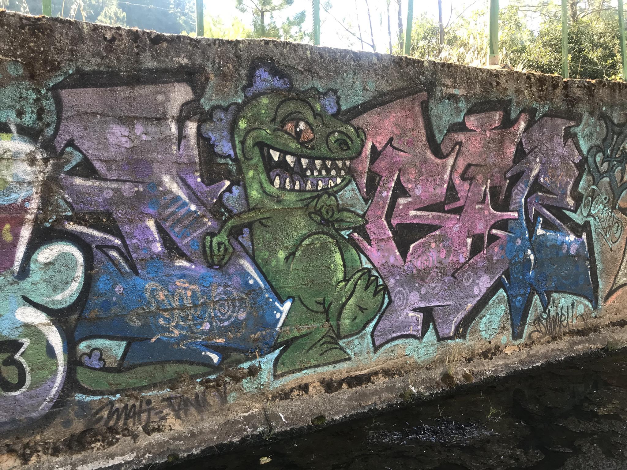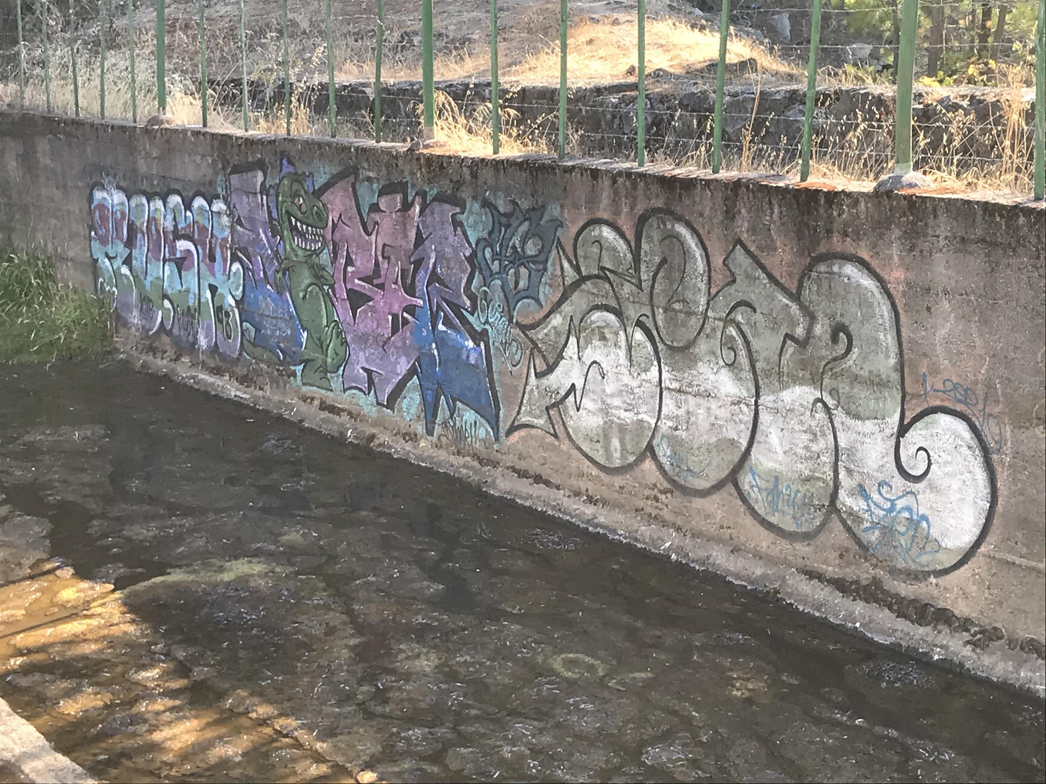 Here, at the back of the Canteras de Deuco, where canals run through, we also have graffiti on those canals’ walls. First, we find a large DYRE flop next to ZEN’s Smile character, this occasion with different tags near his ears. A few meters further on, we find three different connected graffiti: first, a colorful flop by KUSH; second, a spectacular flop featuring a dragon, created by DIBERZO; and finally, a white flop by ZEN. Finally, on another wall of the channel, you can see another Smile character drawn by ZEN. Next to the right, is the TONS flop signed by PABLO ANTAY. The last flop also says ZEN. Check out as well the page about the graffiti at the Canteras de Deuco and the the page about the history of that place.
