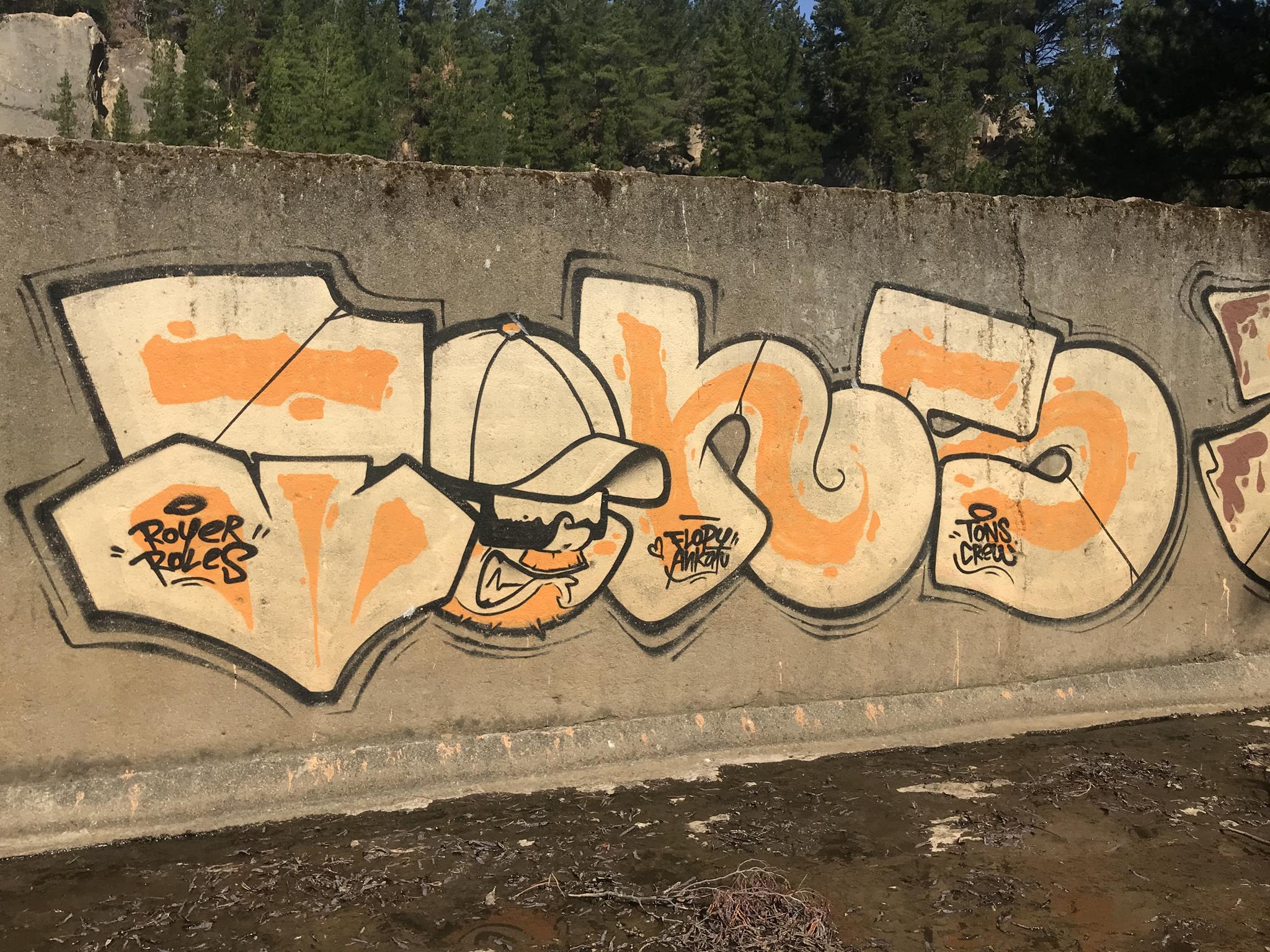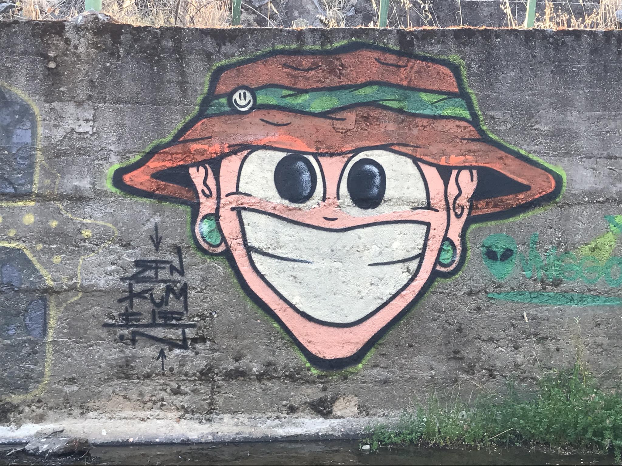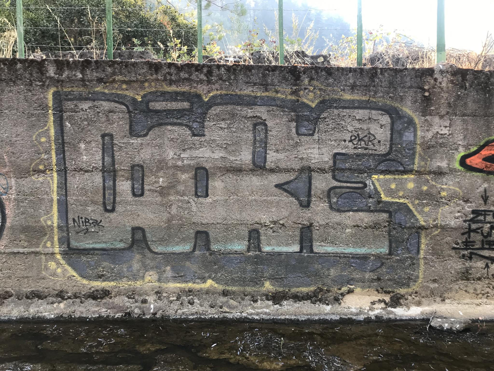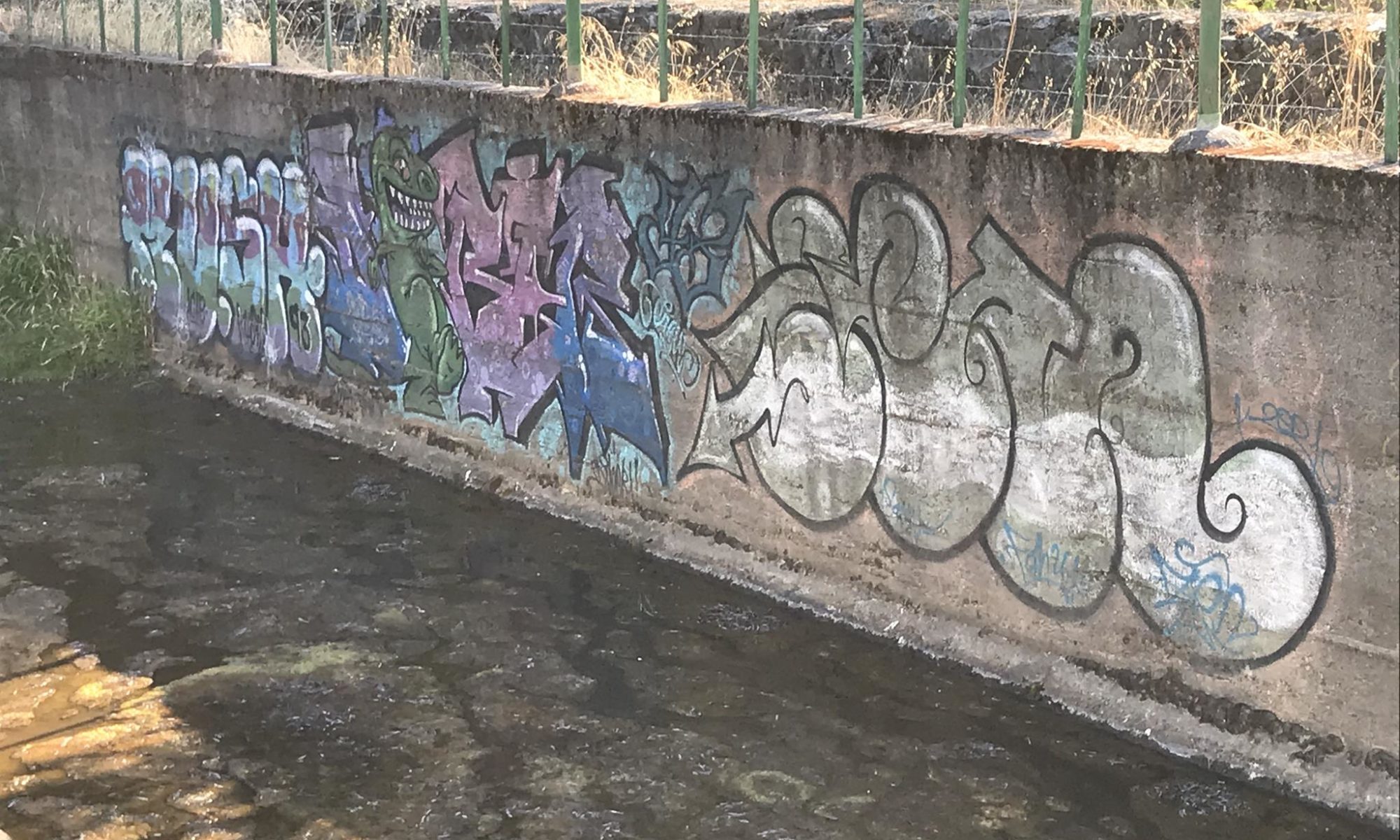 Here, at the back of the Canteras de Deuco, where canals run through, we also have graffiti on those canals’ walls. First, we find a large DYRE flop next to ZEN’s Smile character, this occasion with different tags near his ears. A few meters further on, we find three different connected graffiti: first, a colorful flop by KUSH; second, a spectacular flop featuring a dragon, created by DIBERZO; and finally, a white flop by ZEN. Finally, on another wall of the channel, you can see another Smile character drawn by ZEN. Next to the right, is the TONS flop signed by PABLO ANTAY. The last flop also says ZEN. Check out as well the page about the graffiti at the Canteras de Deuco and the the page about the history of that place.