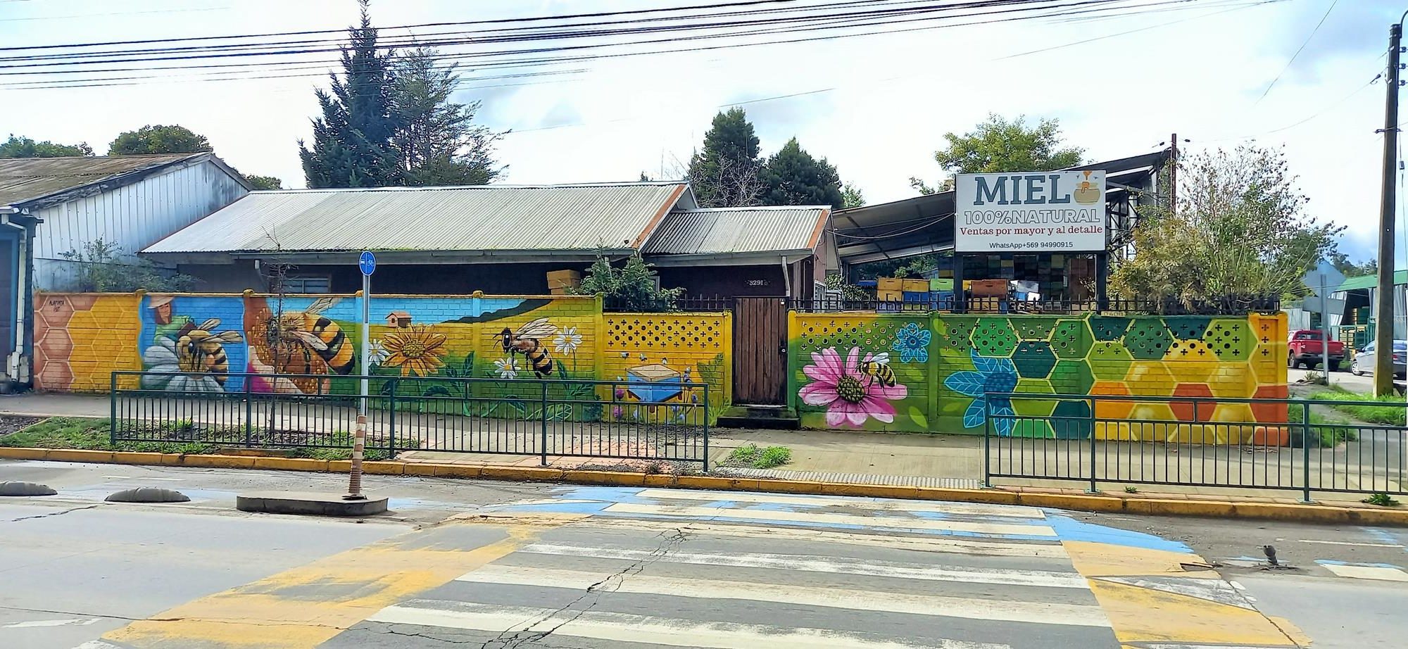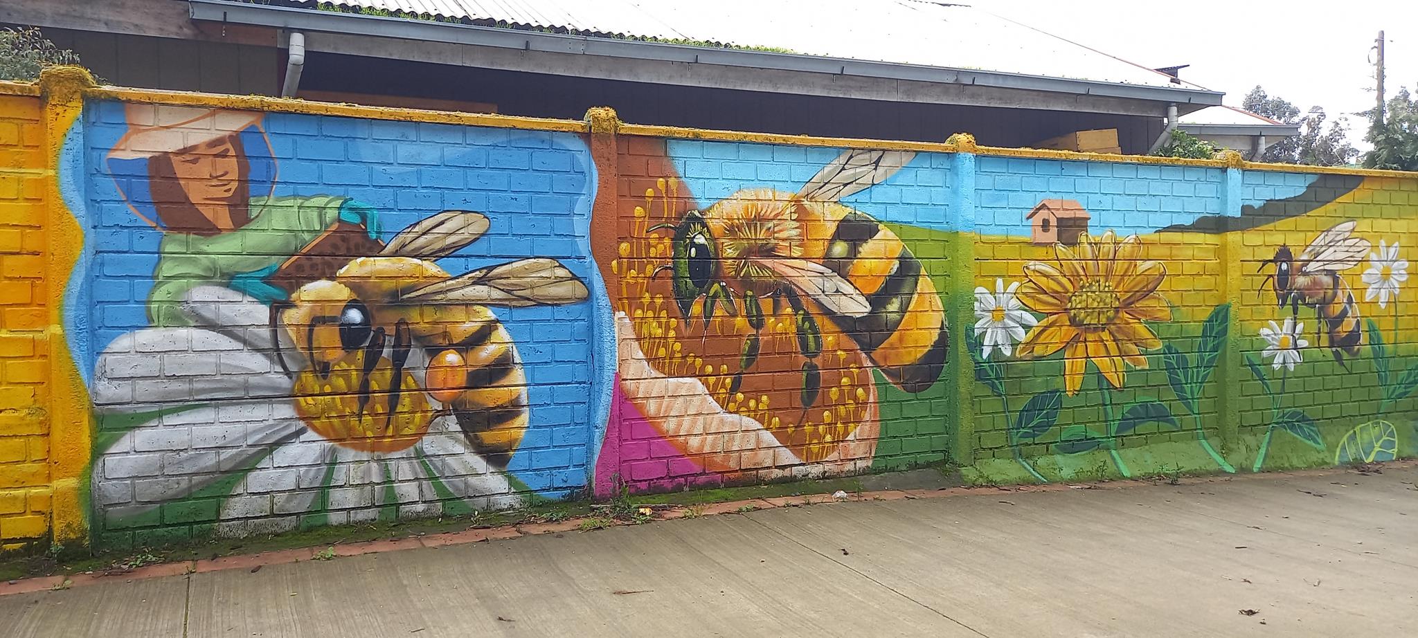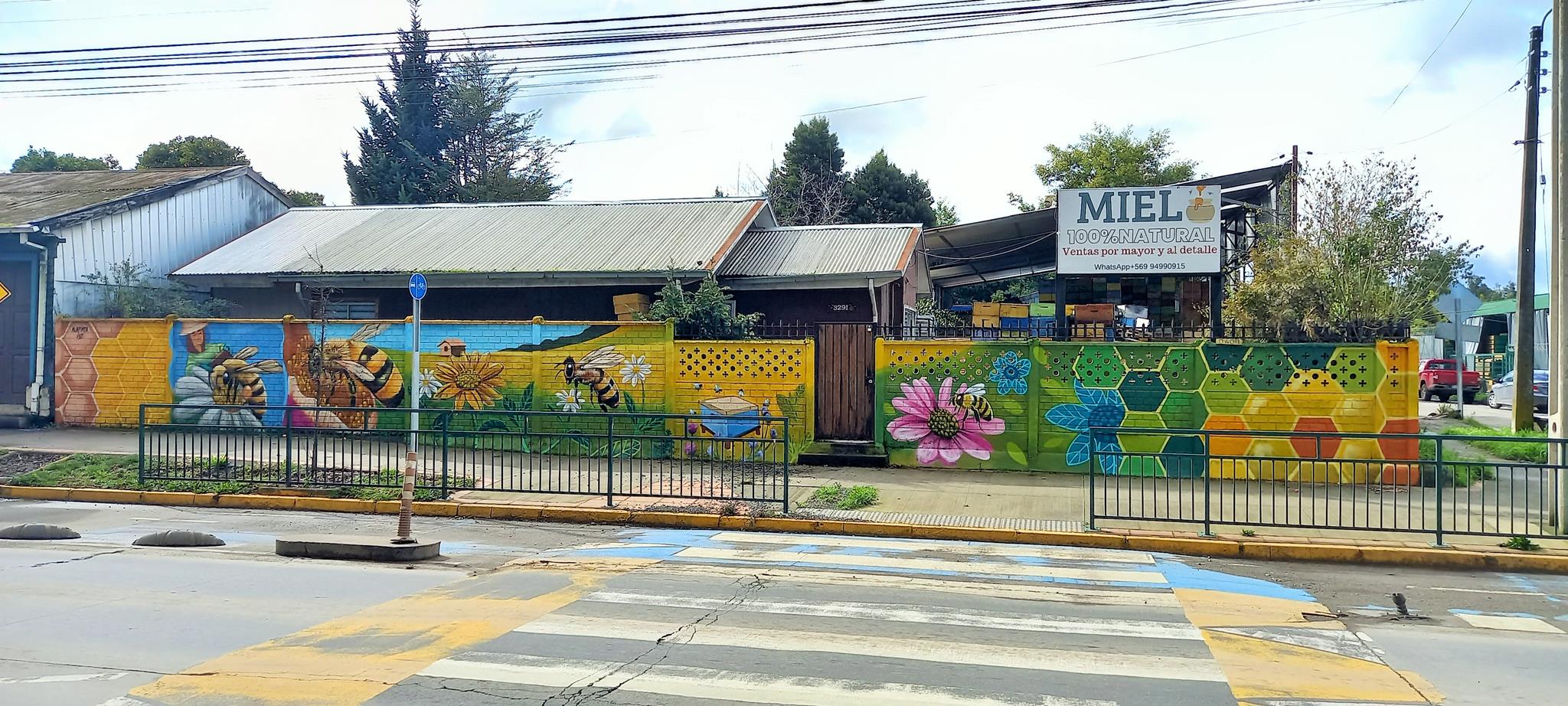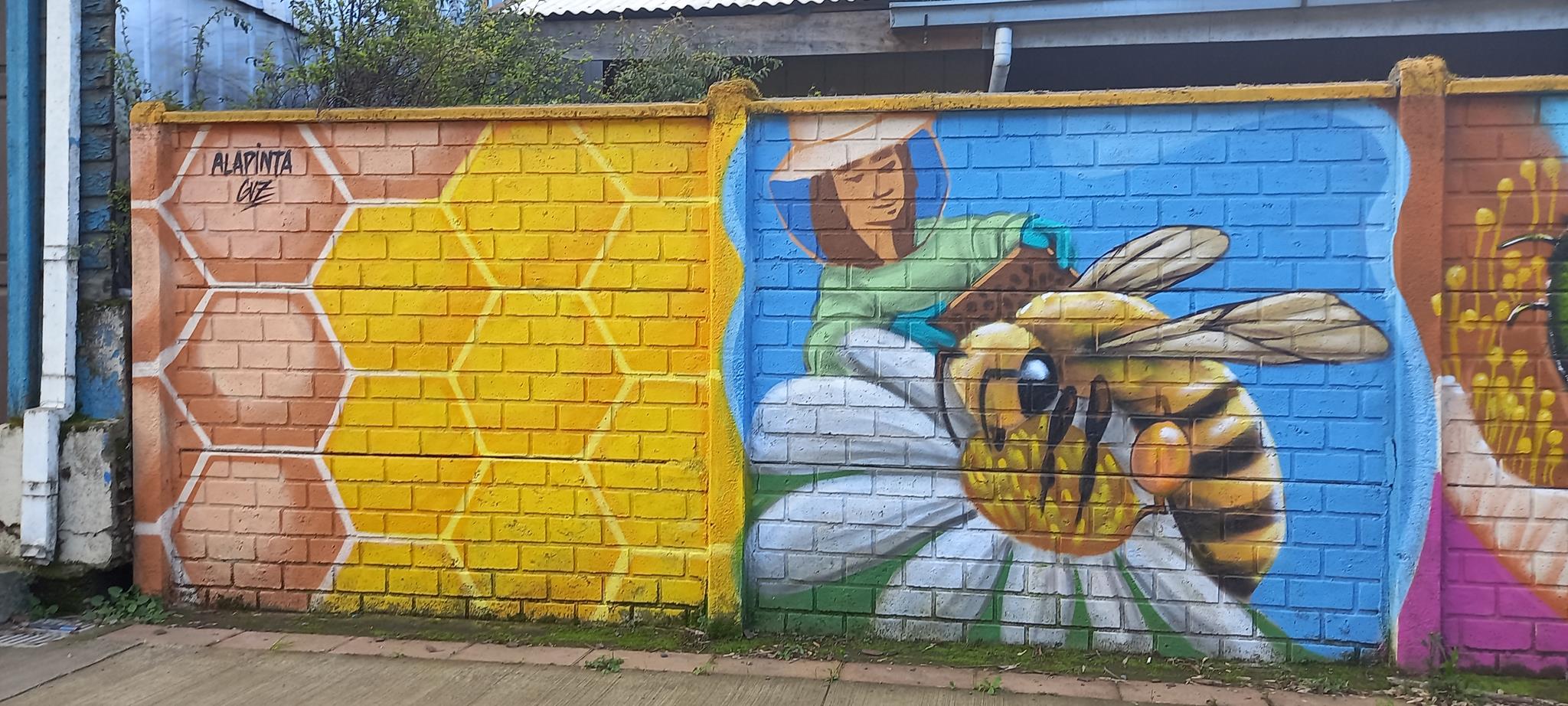 This beautiful ALAPINTA mural was created for Apícola El Encanto, a company that sells products and provides services related to bees. That’s why the ALAPINTA mural depicts bees pollinating flowers and fruits, and also shows the beehives from which the honey the company sells is obtained. The company also rents beehives to pollinate the fields of trees and flowers in and around the Angol area.