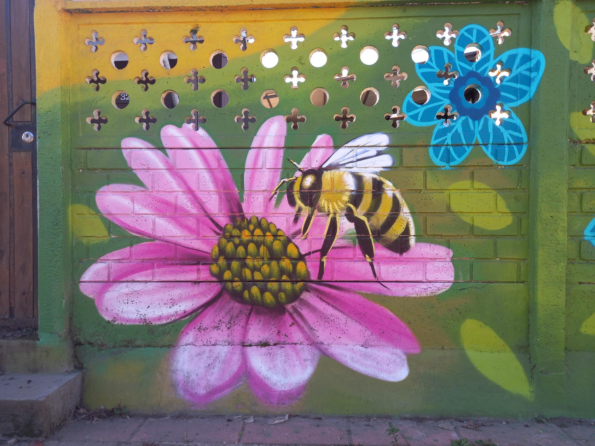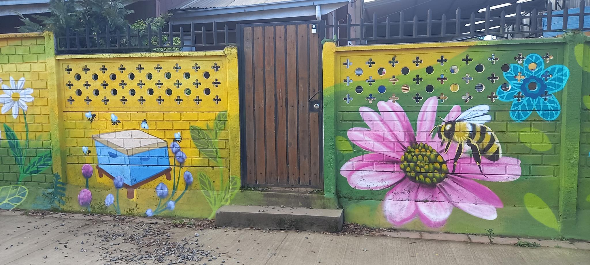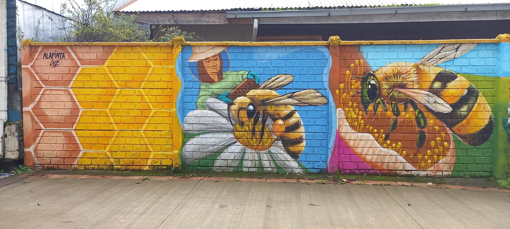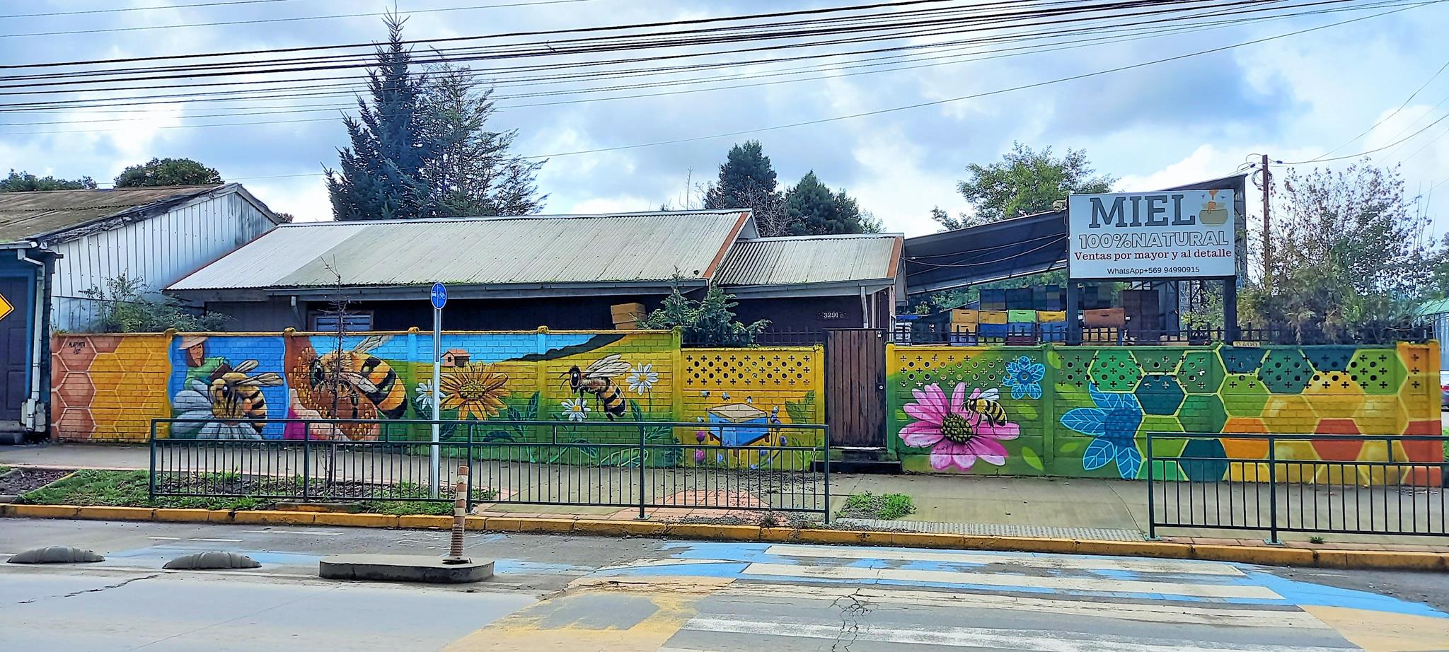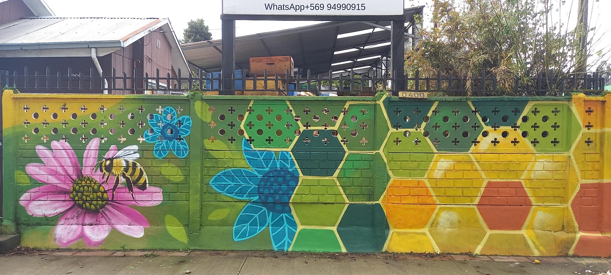 This beautiful ALAPINTA mural was created for Apícola El Encanto, a company that sells products and provides services related to bees. That’s why the ALAPINTA mural depicts bees pollinating flowers and fruits, and also shows the beehives from which the honey the company sells is obtained. The company also rents beehives to pollinate the fields of trees and flowers in and around the Angol area.
