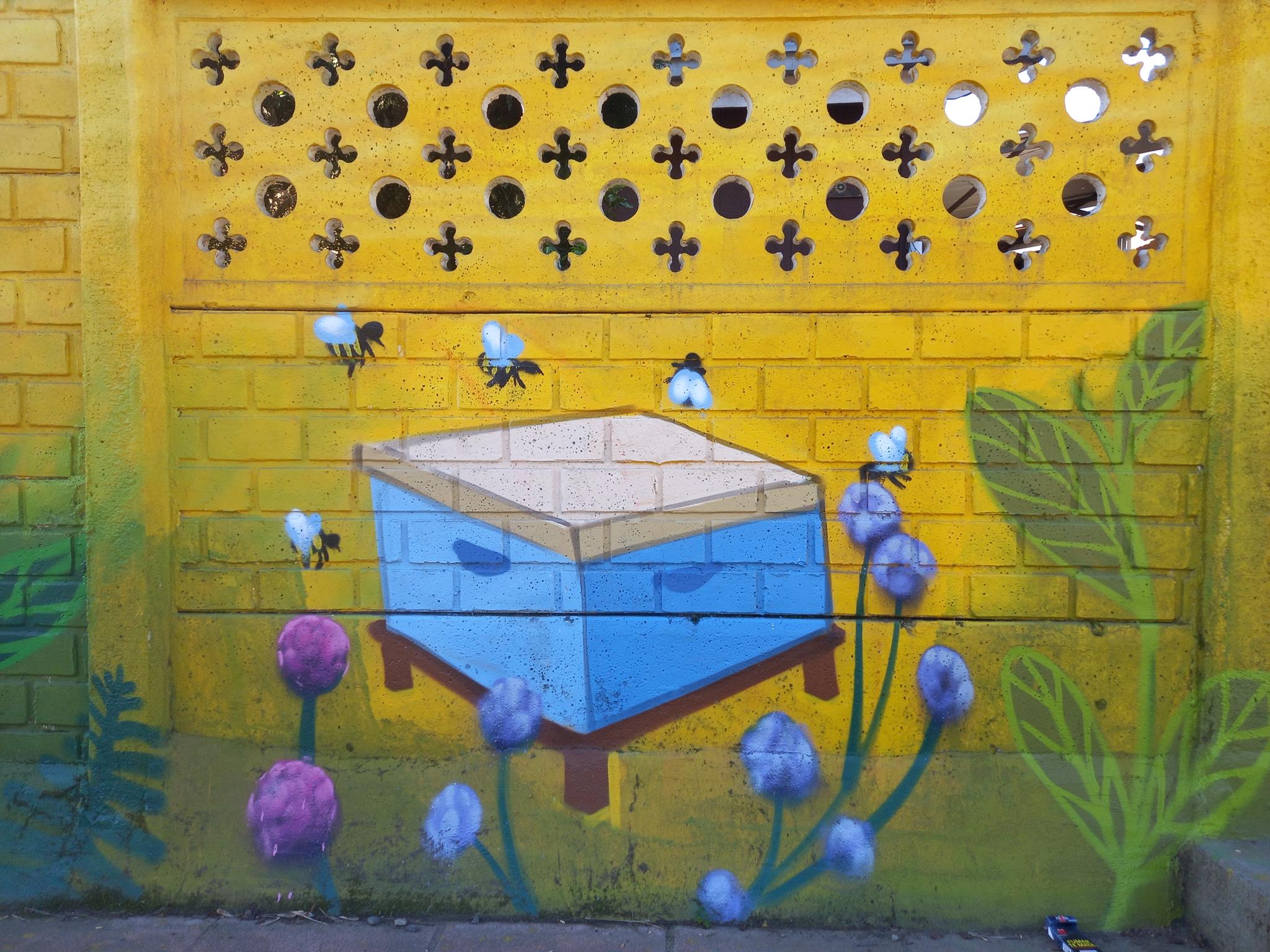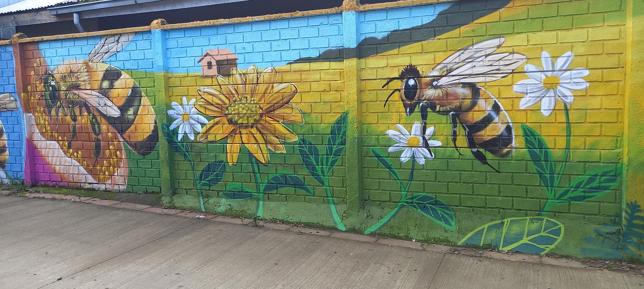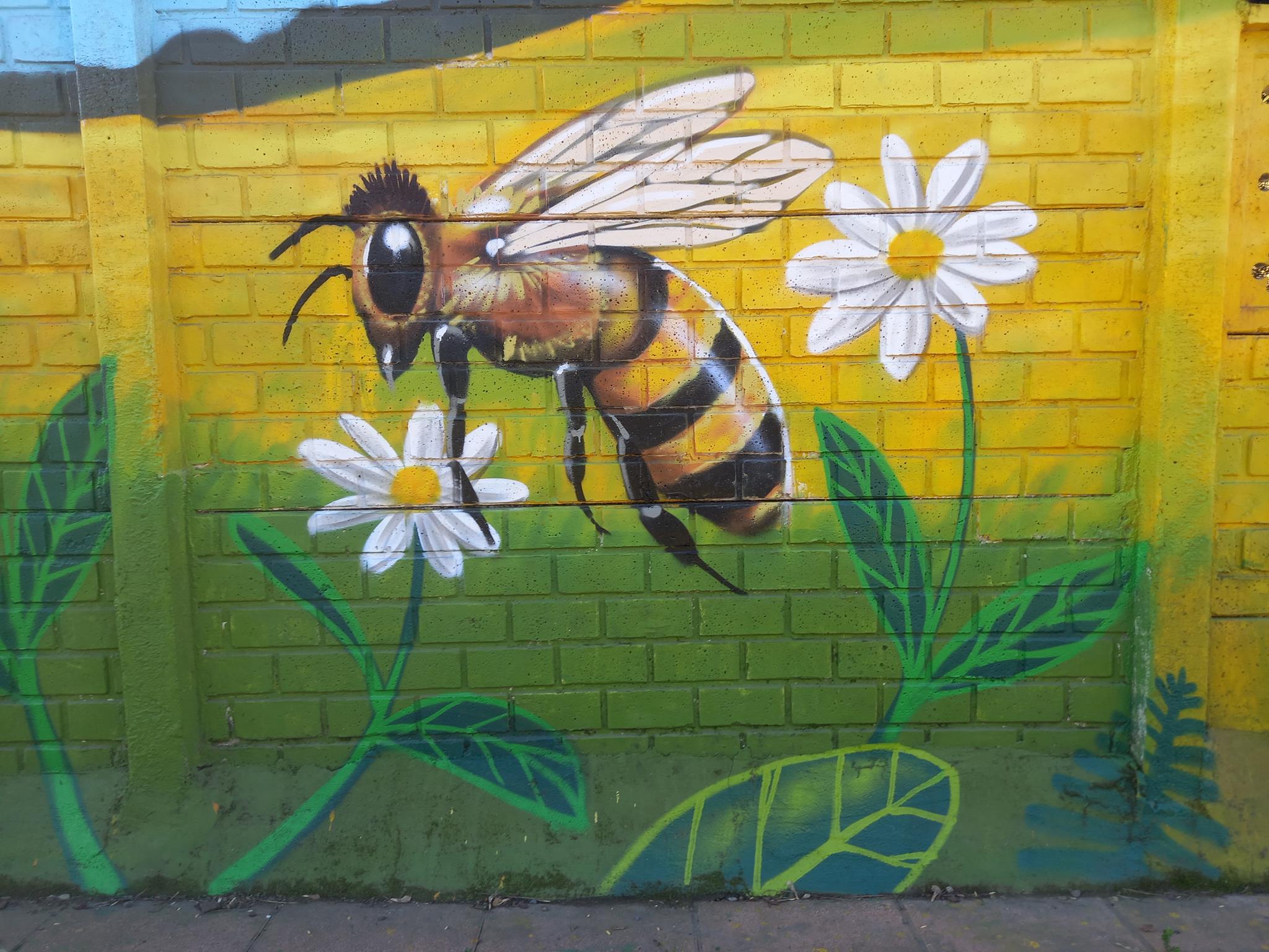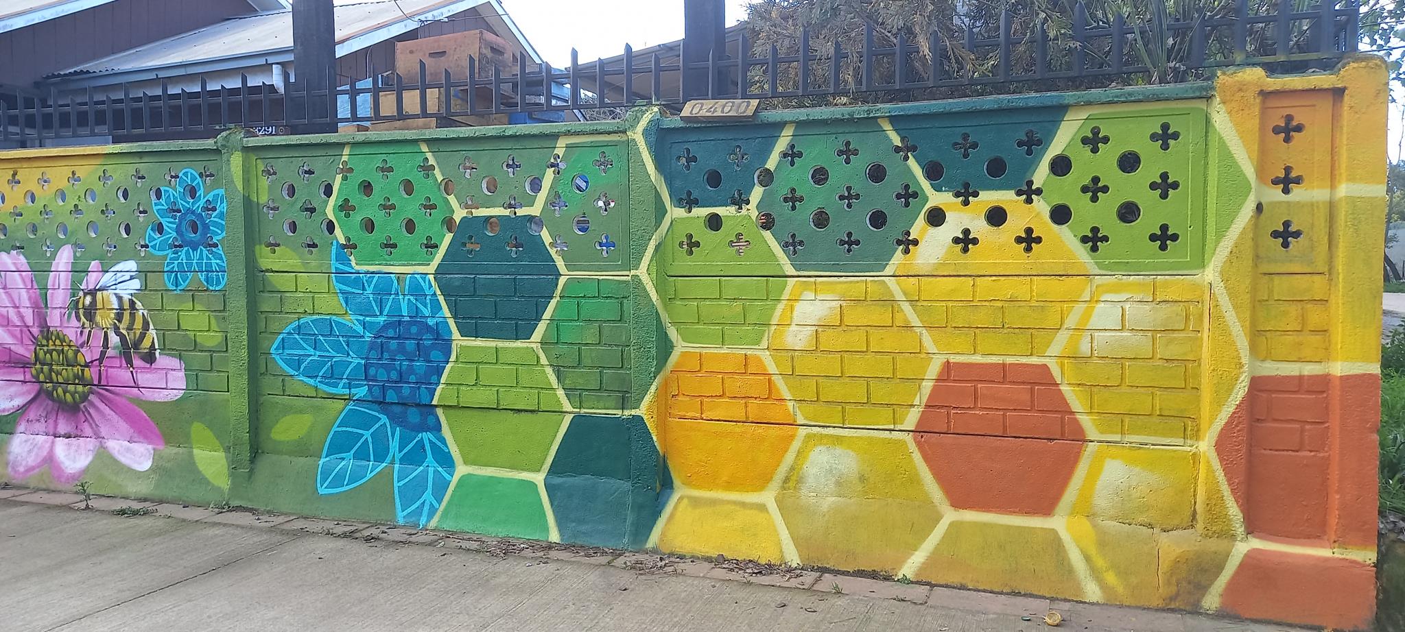 This beautiful ALAPINTA mural was created for Apícola El Encanto, a company that sells products and provides services related to bees. That’s why the ALAPINTA mural depicts bees pollinating flowers and fruits, and also shows the beehives from which the honey the company sells is obtained. The company also rents beehives to pollinate the fields of trees and flowers in and around the Angol area.