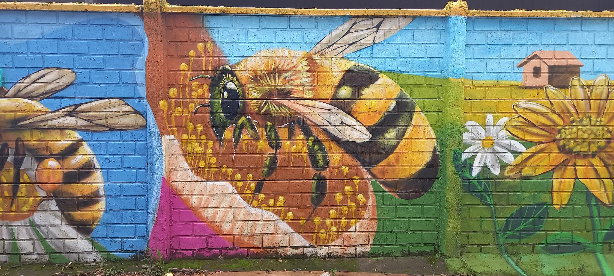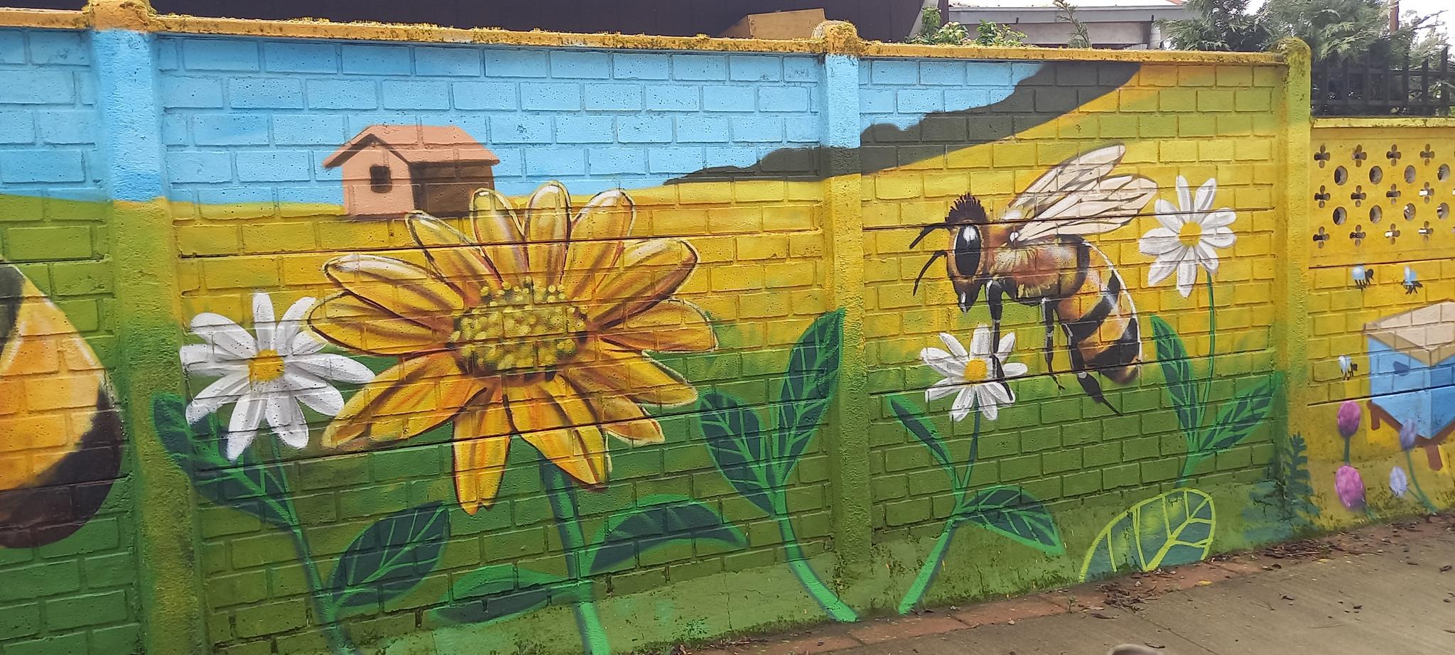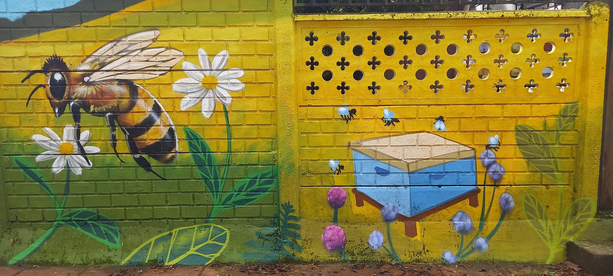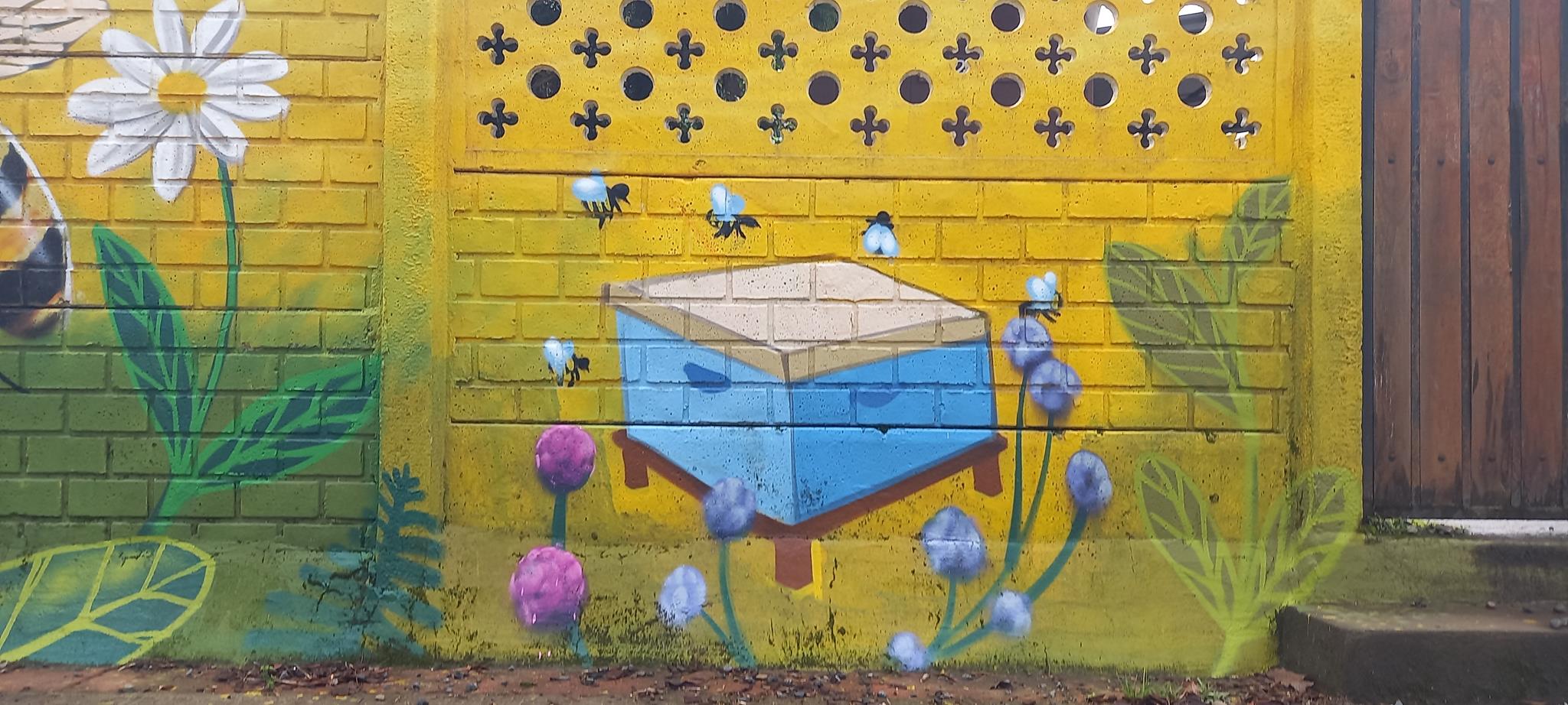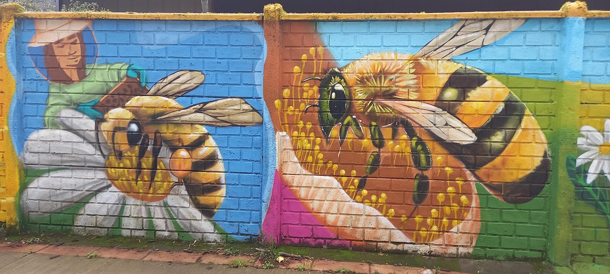 This beautiful ALAPINTA mural was created for Apícola El Encanto, a company that sells products and provides services related to bees. That’s why the ALAPINTA mural depicts bees pollinating flowers and fruits, and also shows the beehives from which the honey the company sells is obtained. The company also rents beehives to pollinate the fields of trees and flowers in and around the Angol area.