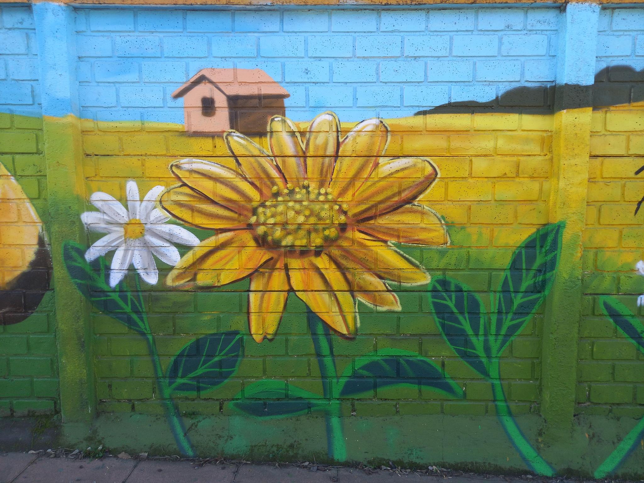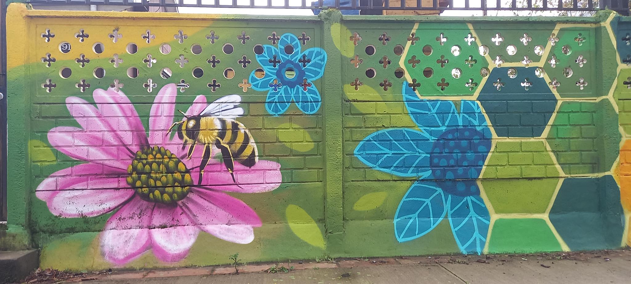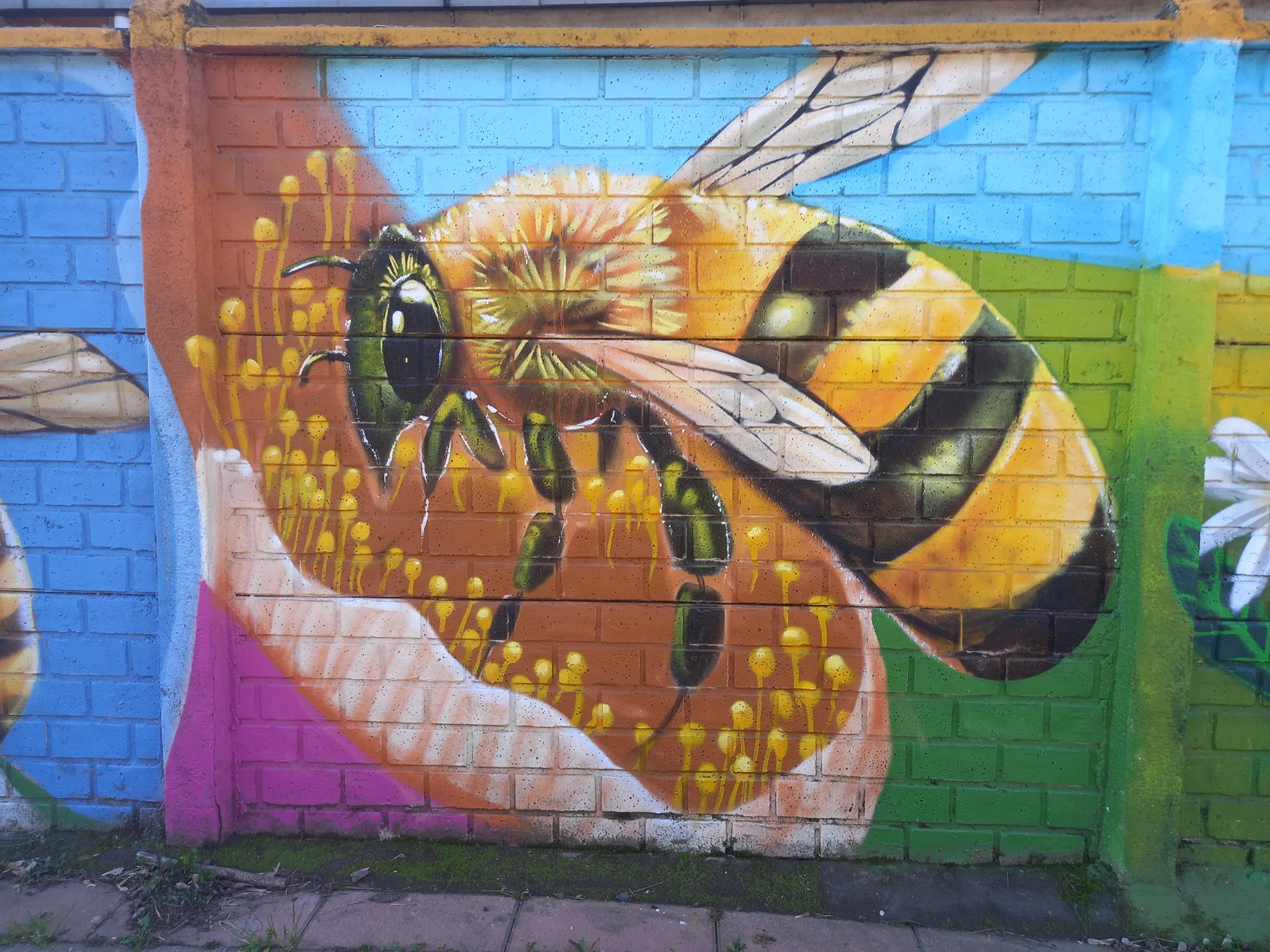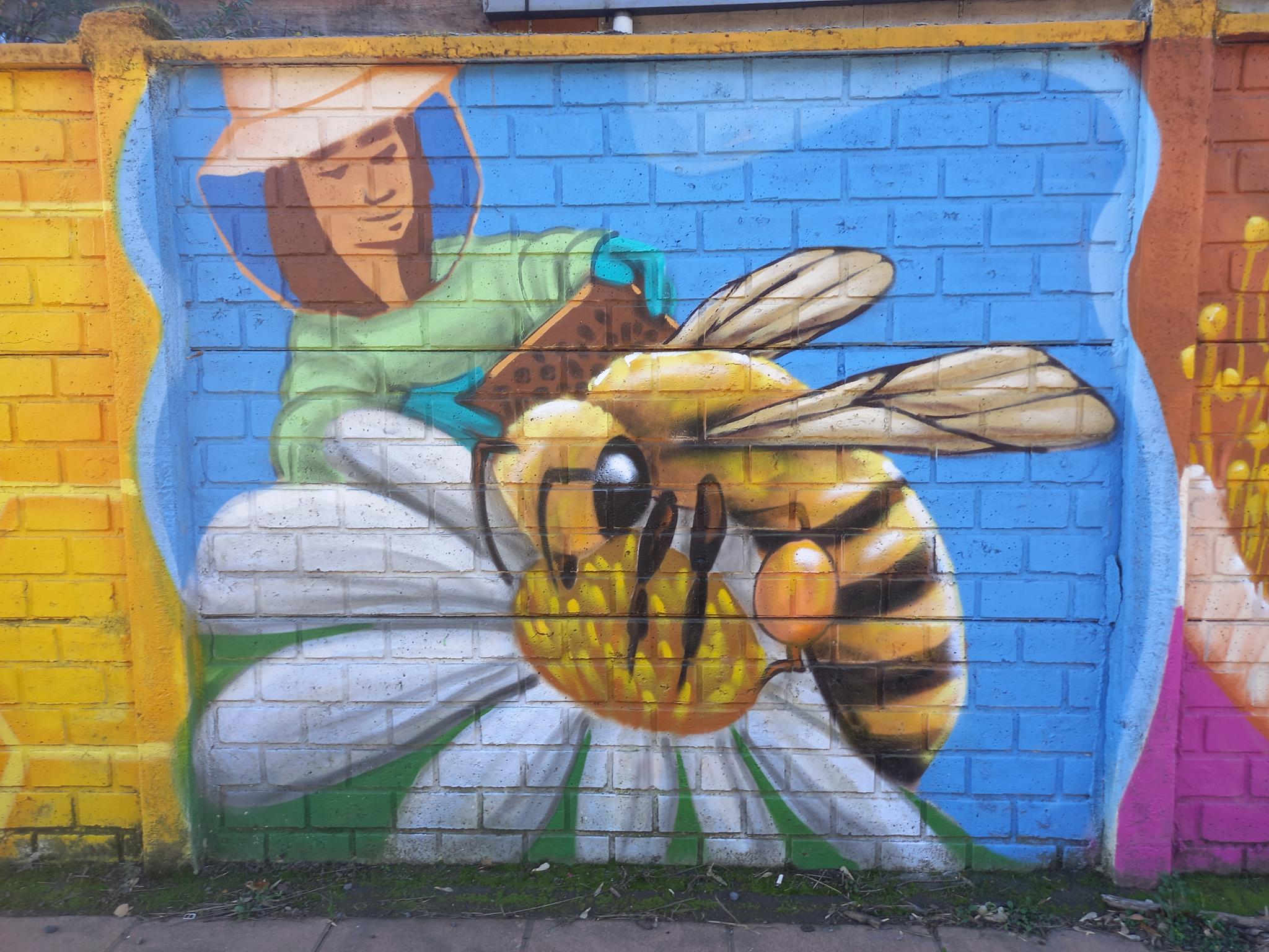 This beautiful ALAPINTA mural was created for Apícola El Encanto, a company that sells products and provides services related to bees. That’s why the ALAPINTA mural depicts bees pollinating flowers and fruits, and also shows the beehives from which the honey the company sells is obtained. The company also rents beehives to pollinate the fields of trees and flowers in and around the Angol area.