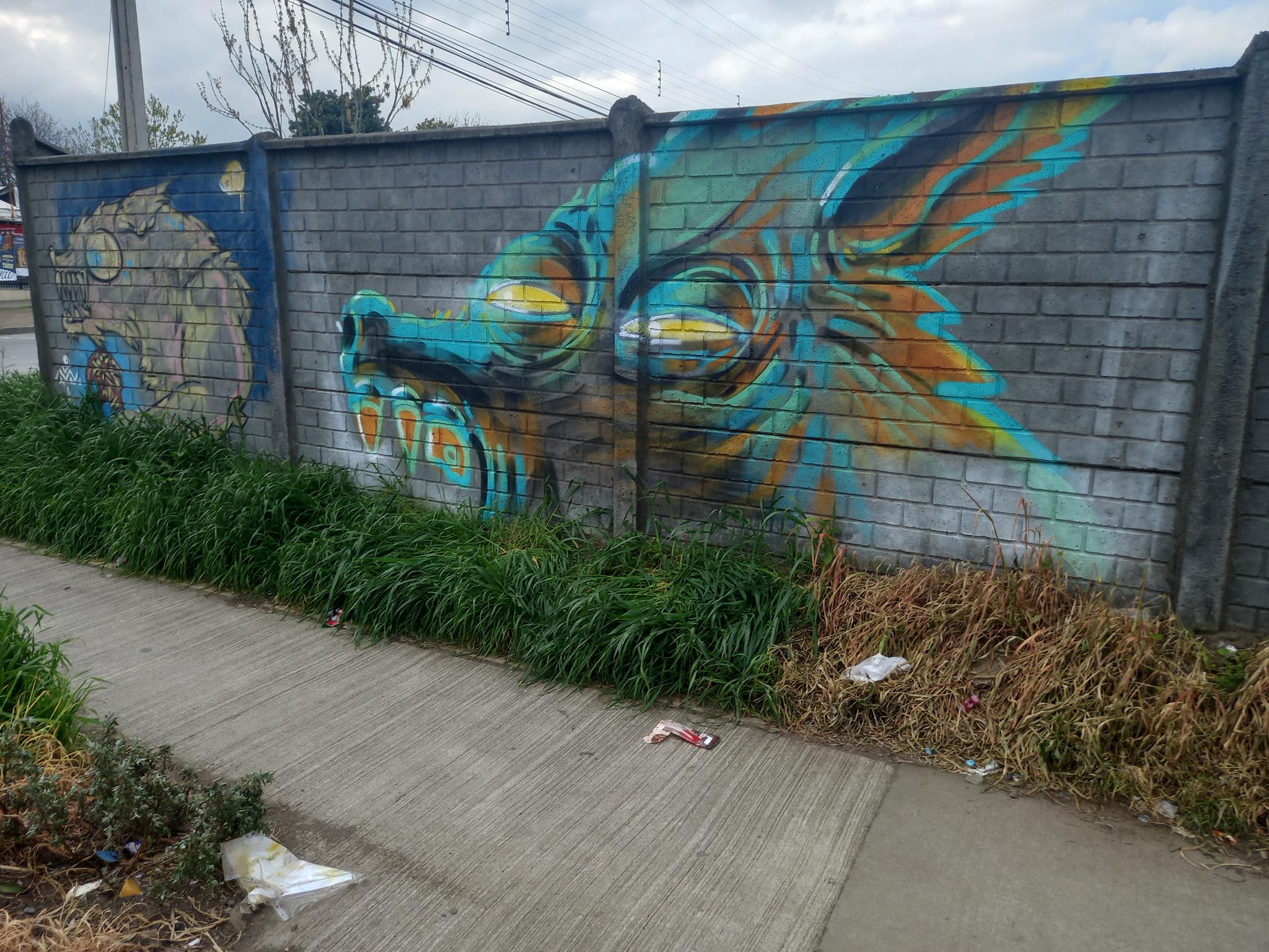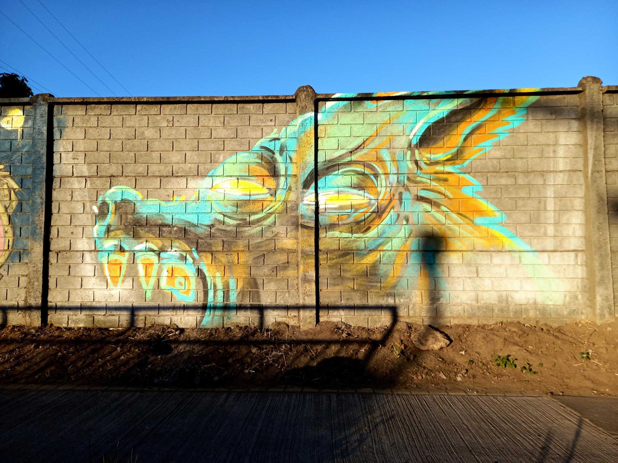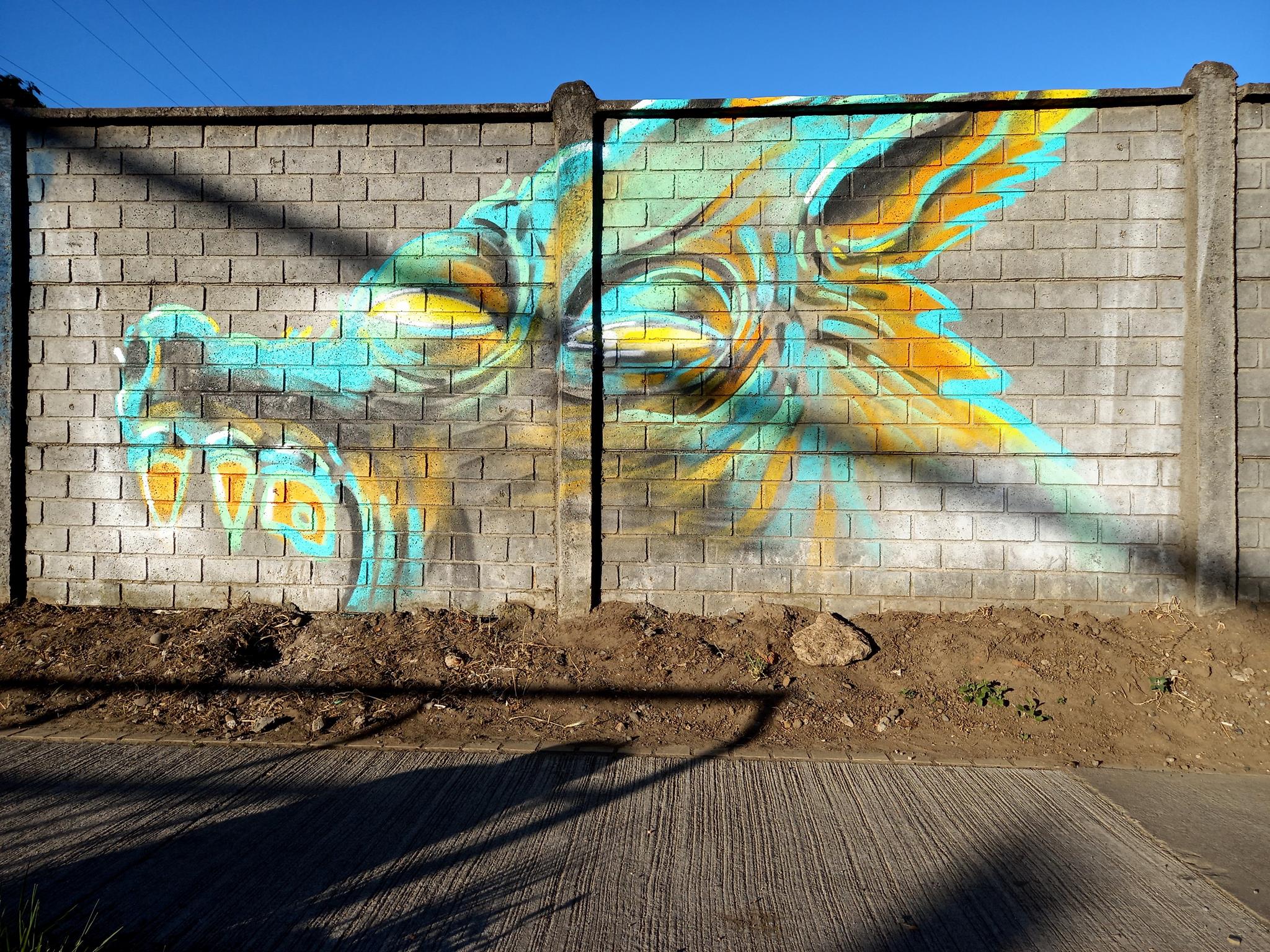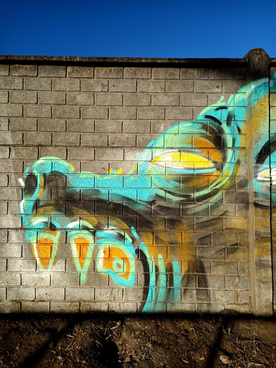 This “big bad wolf” is drawn with very unique colors, which change depending on the light of the day, as can be seen in the sequence of these photographs. This wolf was painted more than a year after the other wolf done at José Bunster 615A. This new wolf appears much larger than the previous wolf of. So much so, that the entire head of the wolf cannot be seen, only the teeth and upper jaw.