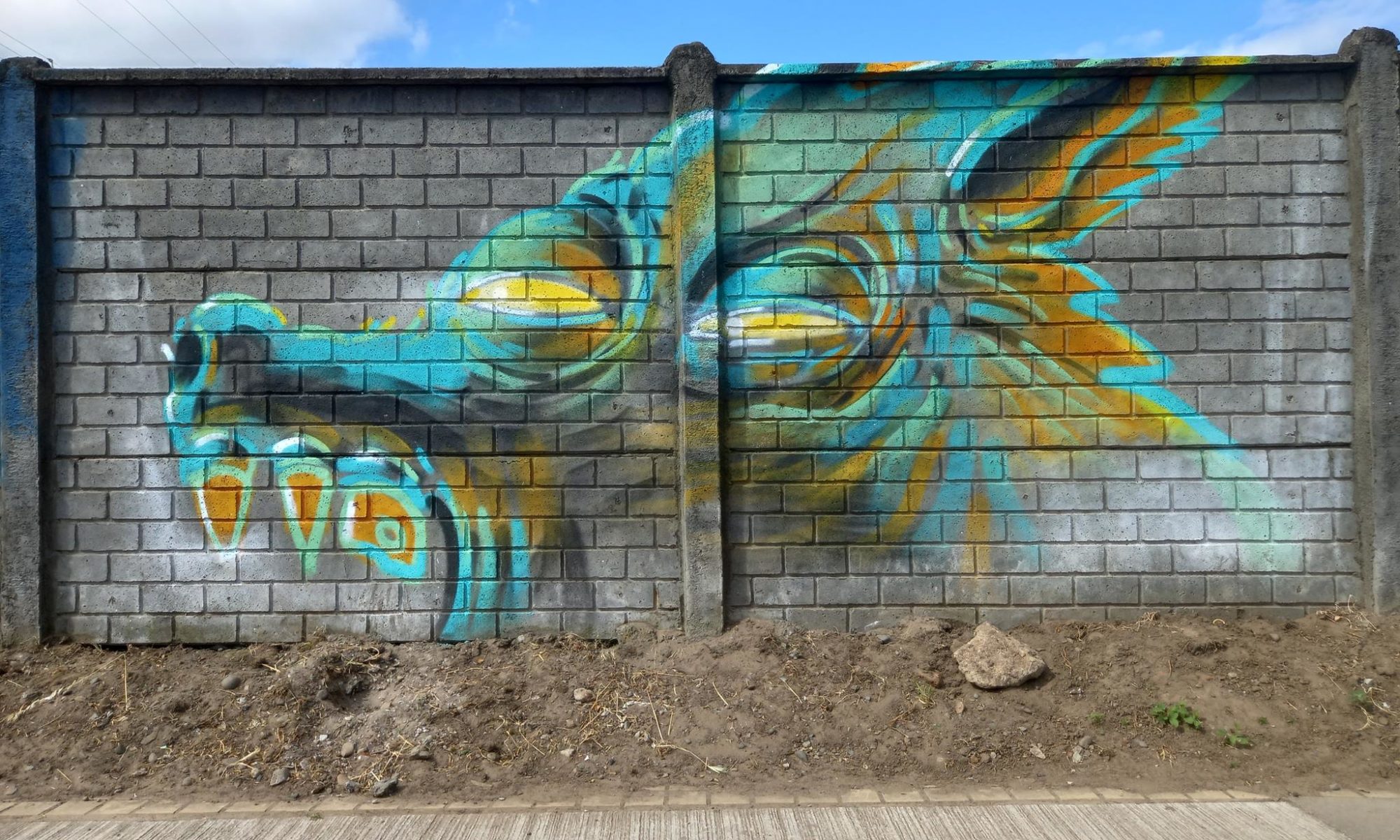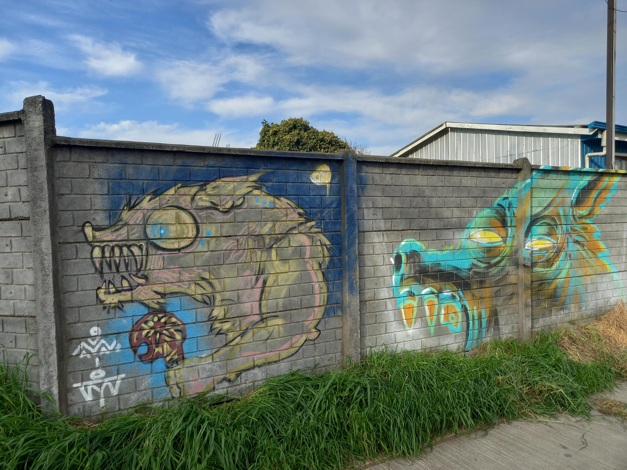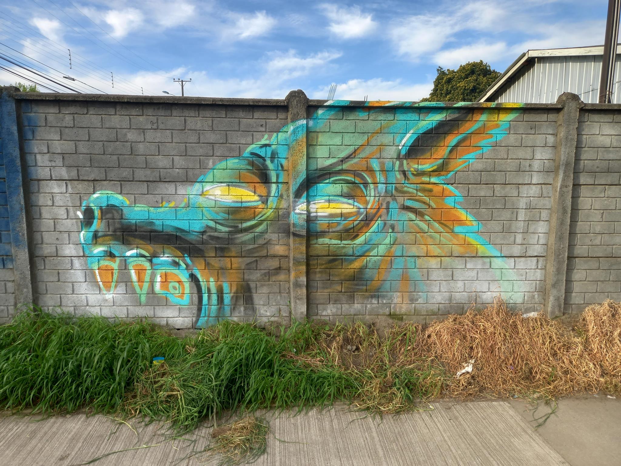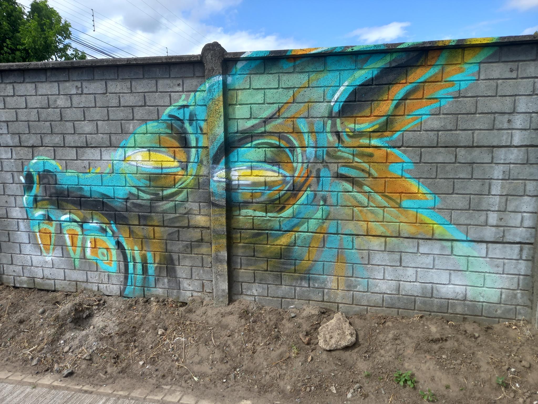 This “big bad wolf” is drawn with very unique colors, which change depending on the light of the day, as can be seen in the sequence of these photographs. This wolf was painted more than a year after the other wolf done at José Bunster 615A. This new wolf appears much larger than the previous wolf of. So much so, that the entire head of the wolf cannot be seen, only the teeth and upper jaw.