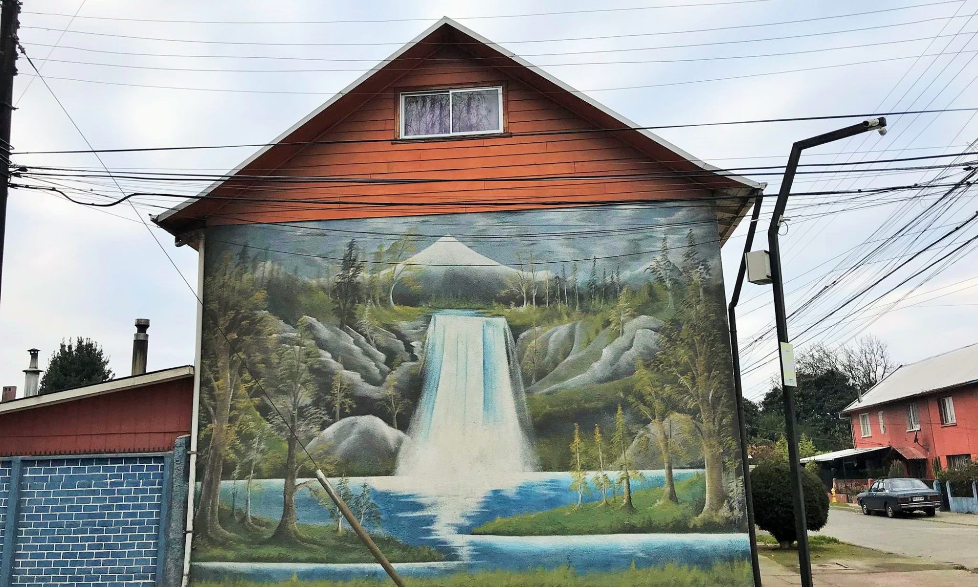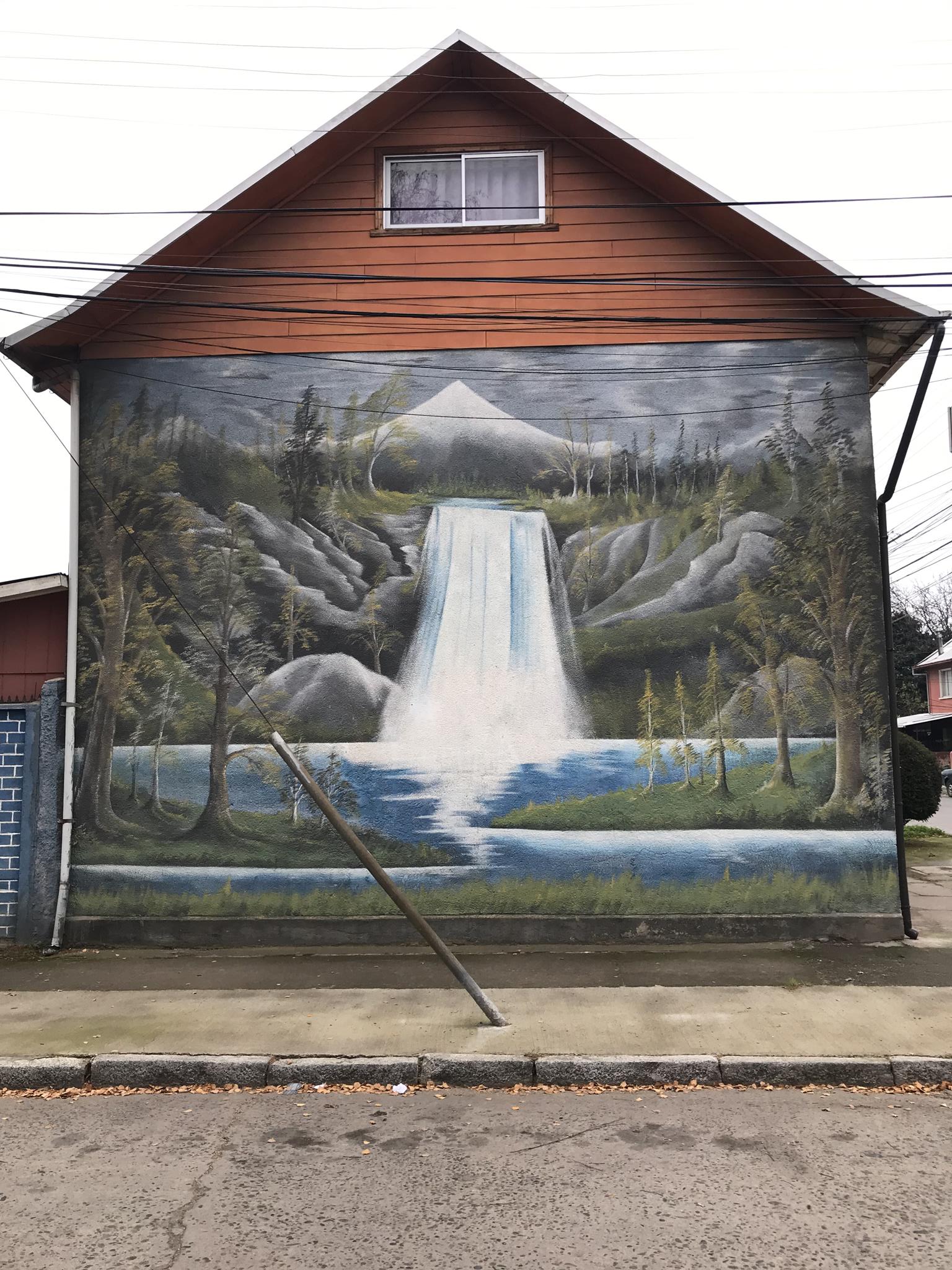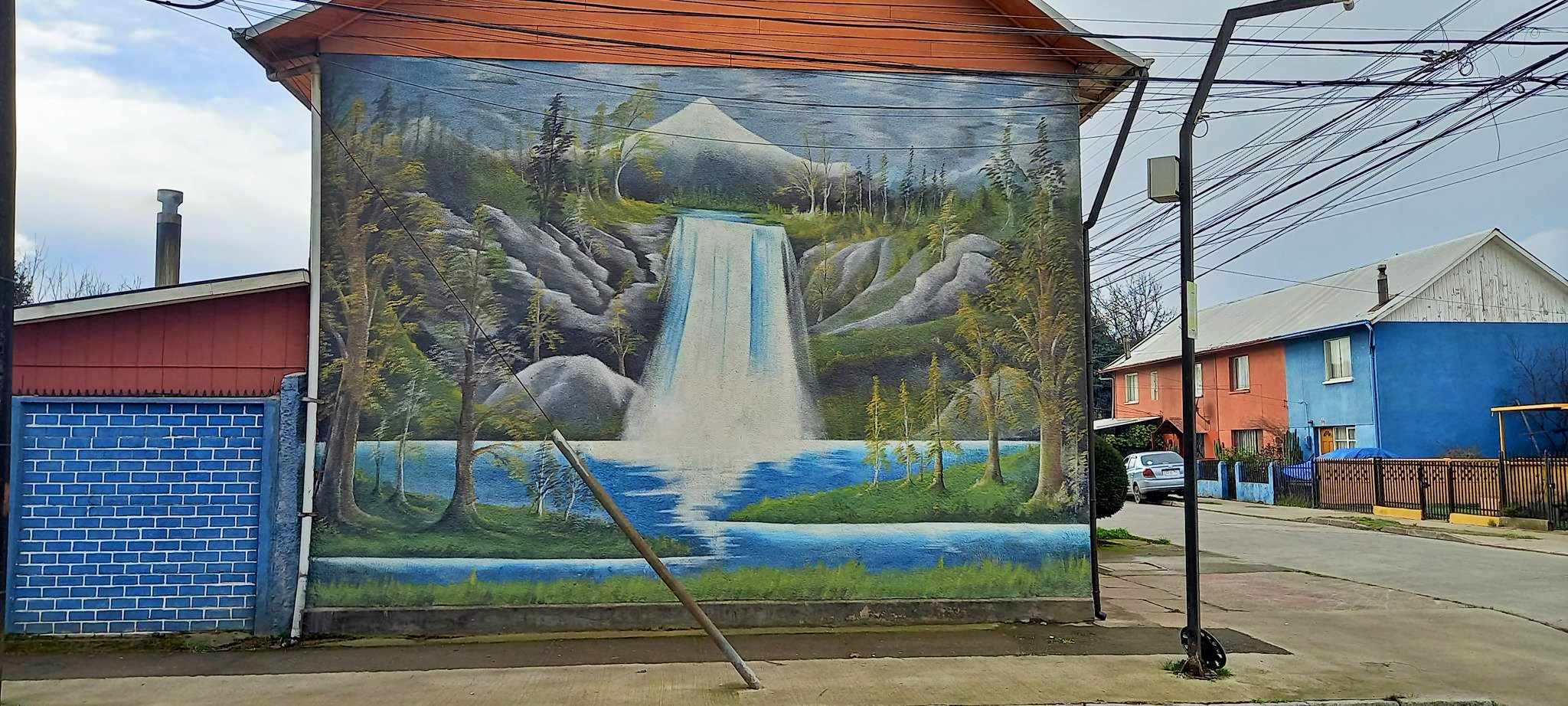 This small street, located in a 1959 housing complex, included a community plaza from which you can see two symmetrical buildings, each with a distinct expression, style, and history of street art on their walls. This building here is on the West part of the street José Joaquín Prieto, but has an entrance on General Urrutia Street around the corner. It features a realistic and bucolic mural depicting a waterfall in a landscape typical of Araucanía: a snow-capped volcano and lush vegetation. This mural is the work of KARZON, an artist who predated spray paint and cans. He uses traditional paint and brushes to do his mural.