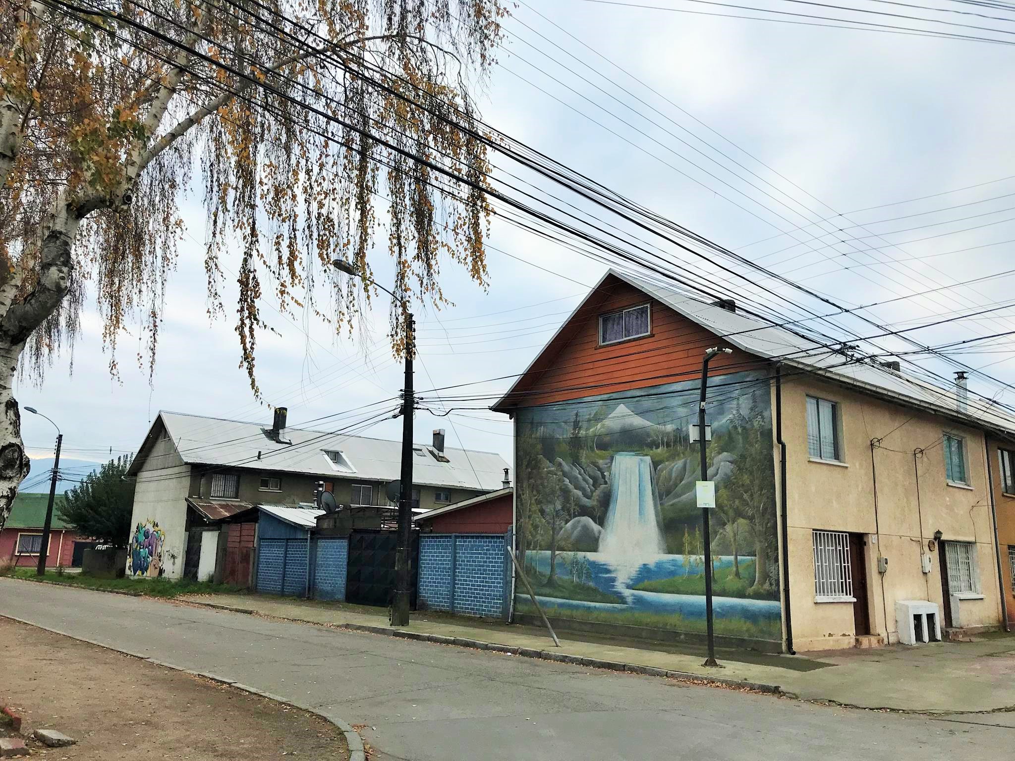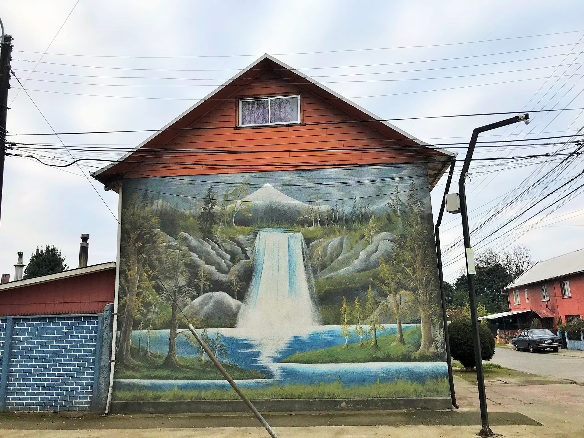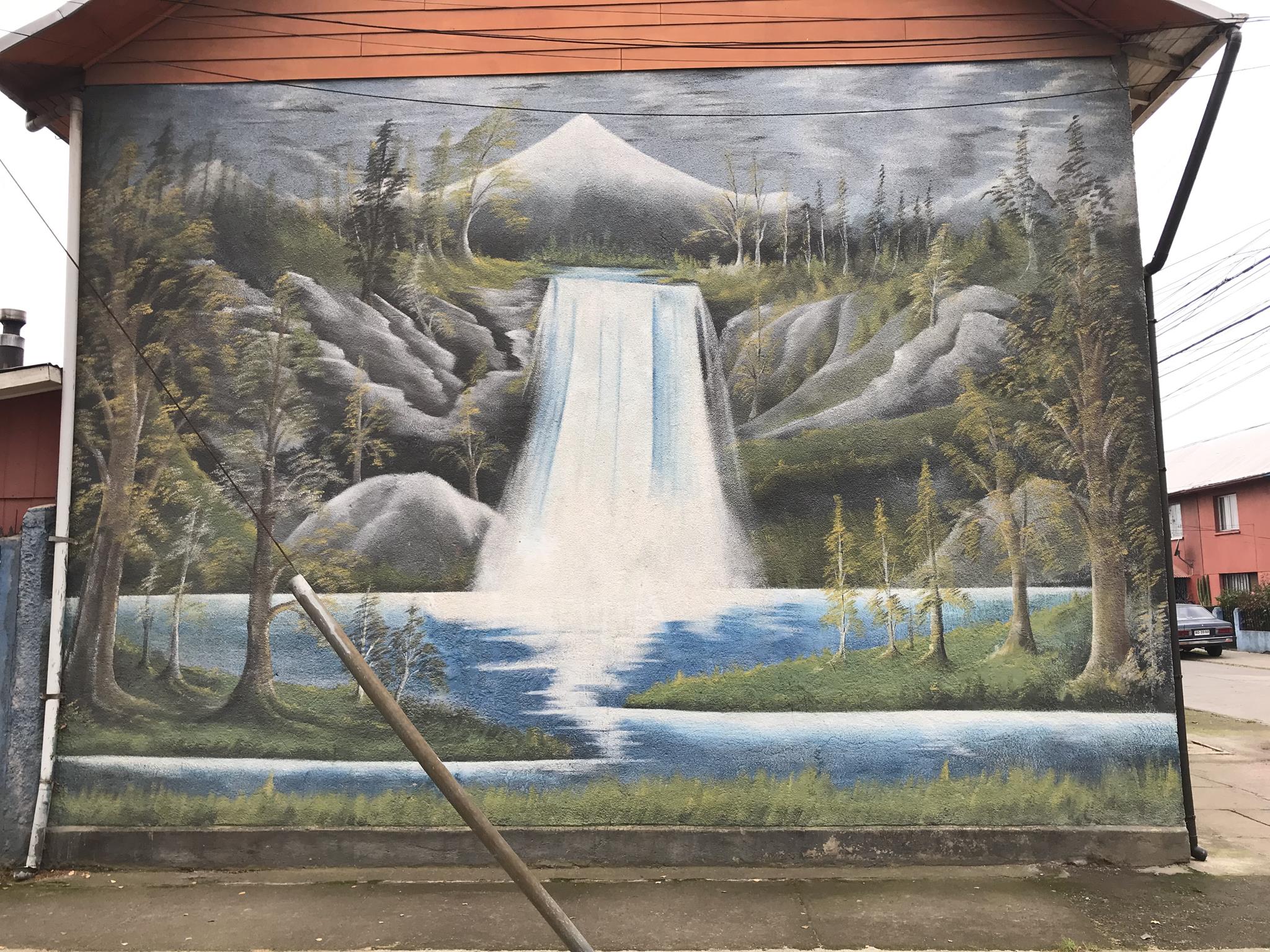 This small street, located in a 1959 housing complex, included a community plaza from which you can see two symmetrical buildings, each with a distinct expression, style, and history of street art on their walls. This building here is on the West part of the street José Joaquín Prieto, but has an entrance on General Urrutia Street around the corner. It features a realistic and bucolic mural depicting a waterfall in a landscape typical of Araucanía: a snow-capped volcano and lush vegetation. This mural is the work of KARZON, an artist who predated spray paint and cans. He uses traditional paint and brushes to do his mural.