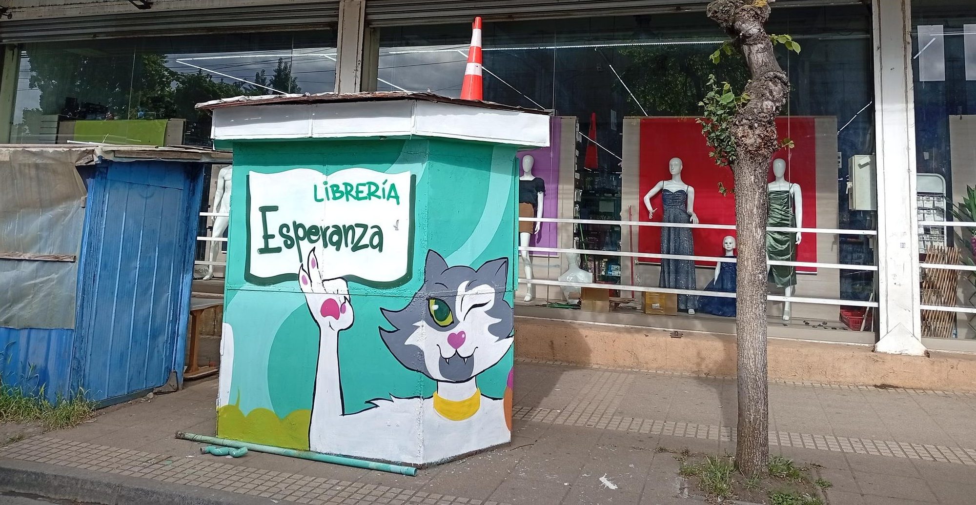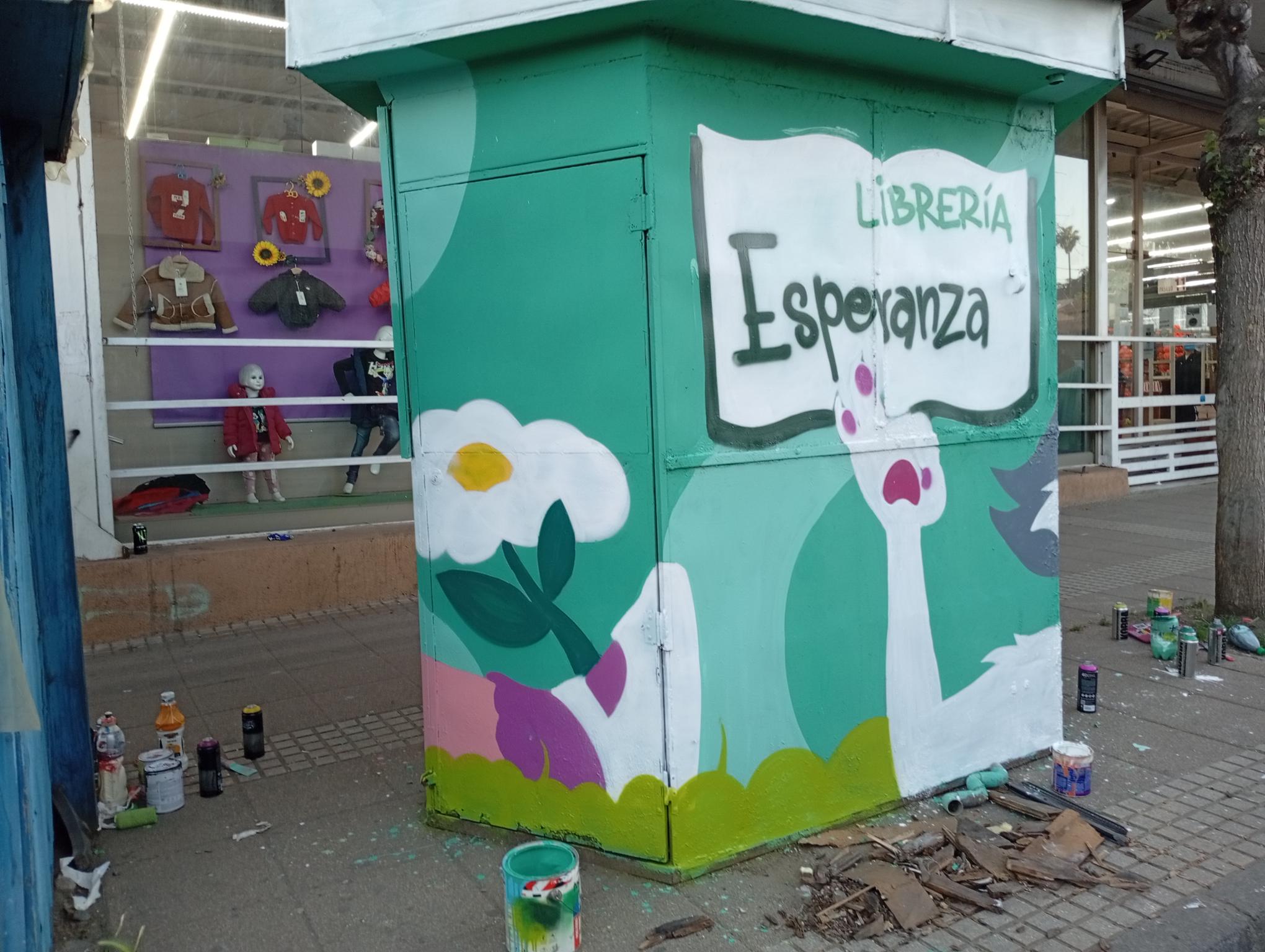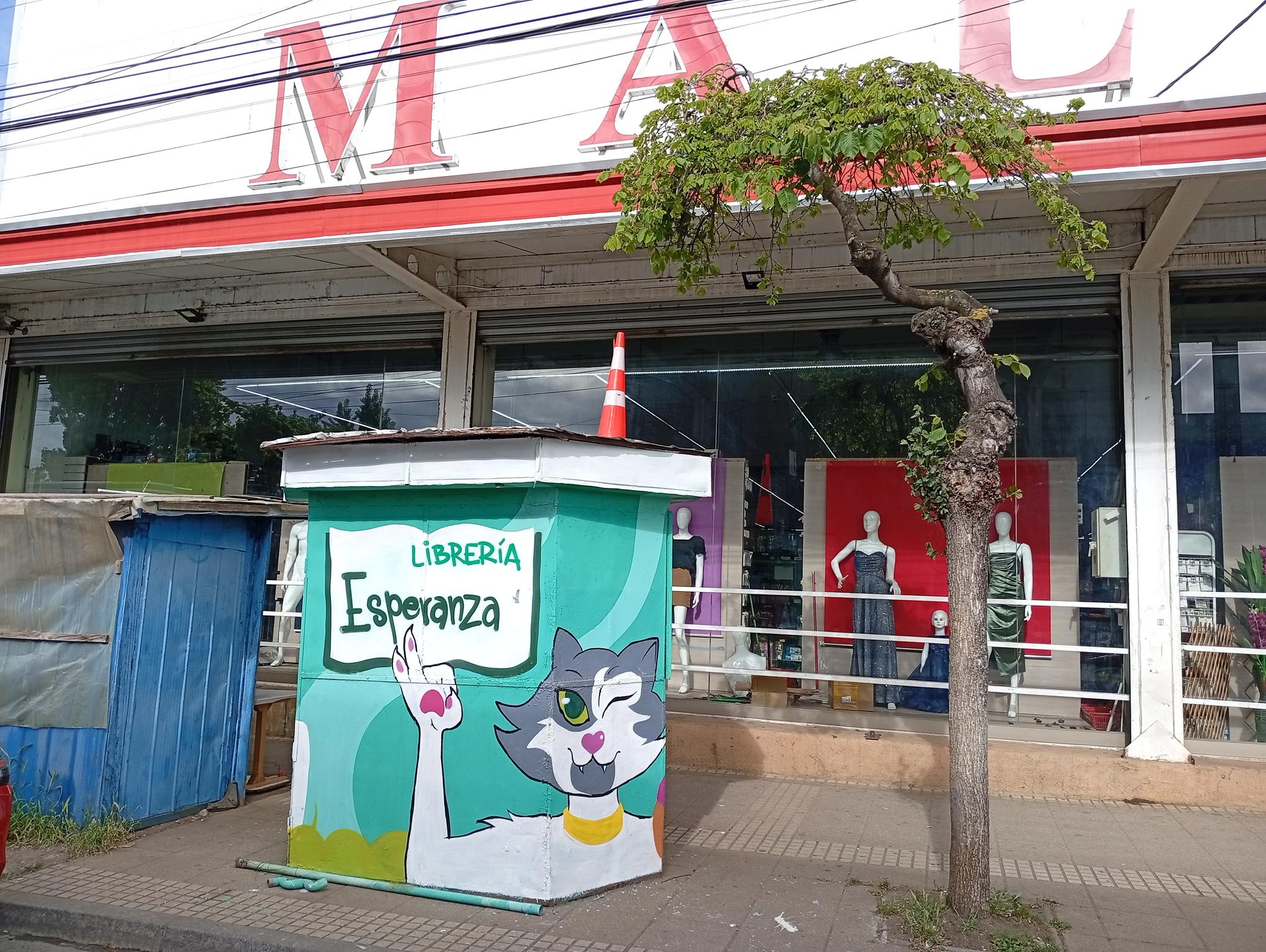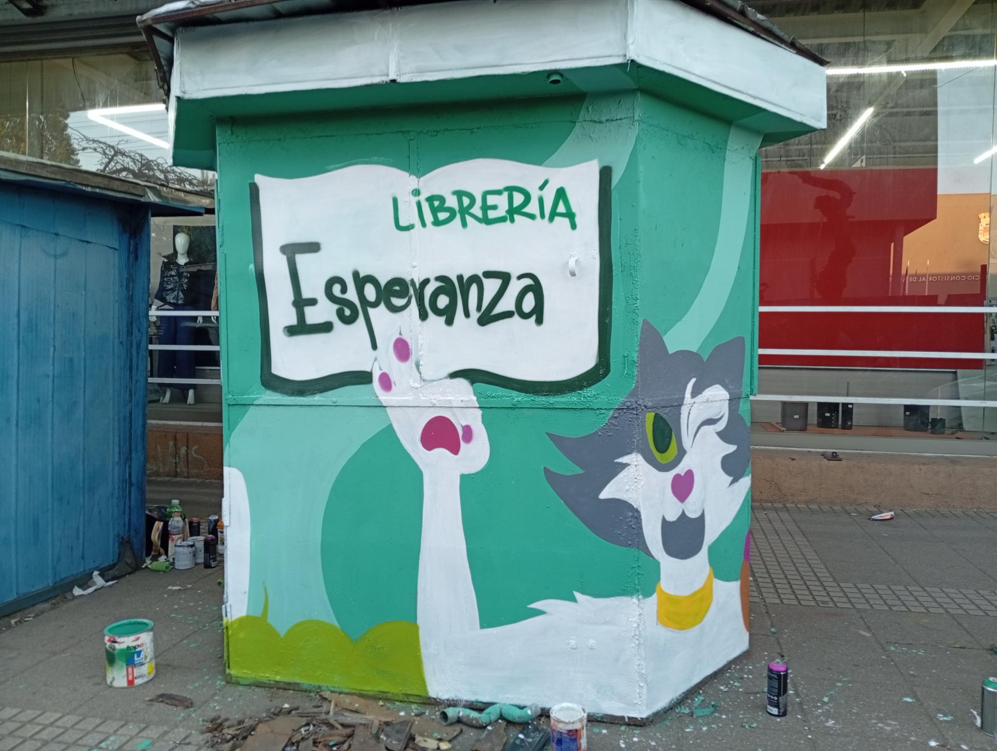 Outside the Chinese Mall there are several kiosks selling different products; for example, crafts, perfumes, books and a lot more. All the kiosks are painted blue on all four sides. Andrea San Martín, owner of one of these kiosks, sells books under the name Librería Esperanza. Andrea decided to reinitiate her business. Among the main ideas, was to decorate and highlight her kiosk. Since Andrea was already familiar with ZEN’s work, she contacted him to have his artwork featured on the kiosk, thus making it stand out.
