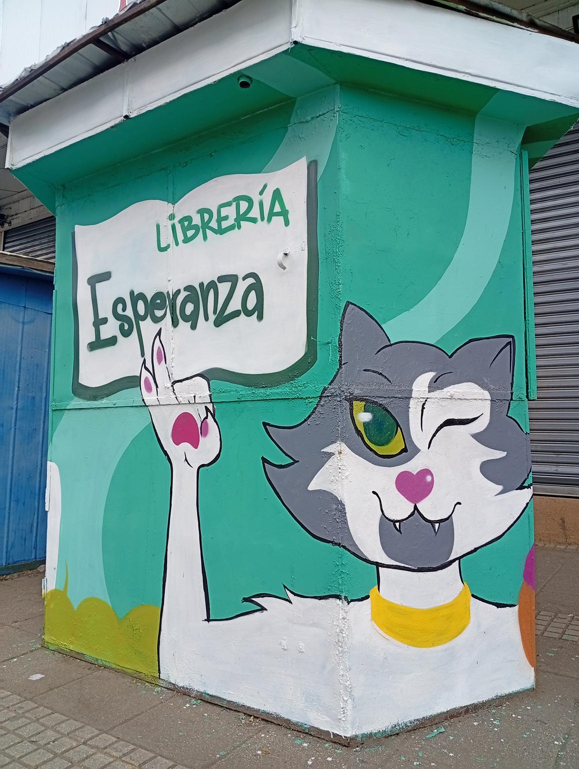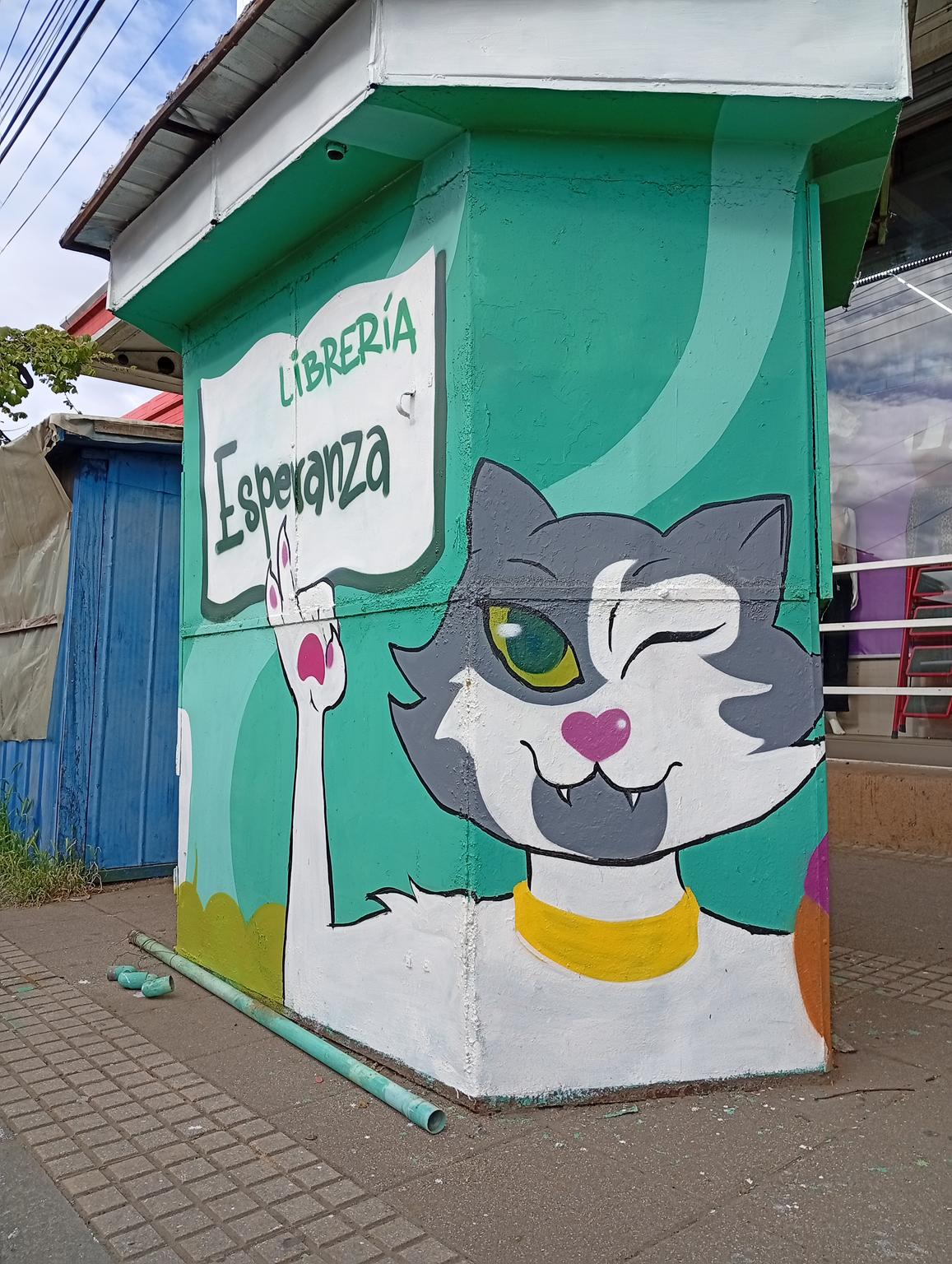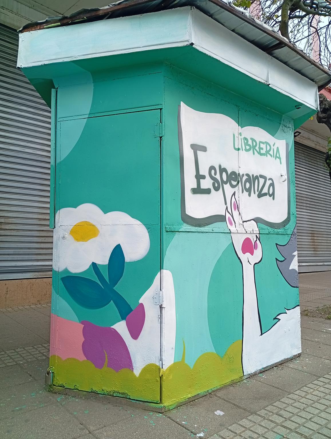 On the side of the kiosk facing the street, the side that isn’t open to the public, ZEN painted an open book with the name Librería Esperanza (Hope Bookstore), held aloft by a cat. On the side facing the sidewalk, where the kiosk is open to the public, ZEN painted a little girl lying in nature, reading a book. A real magnet to draw young readers in to find their own books.