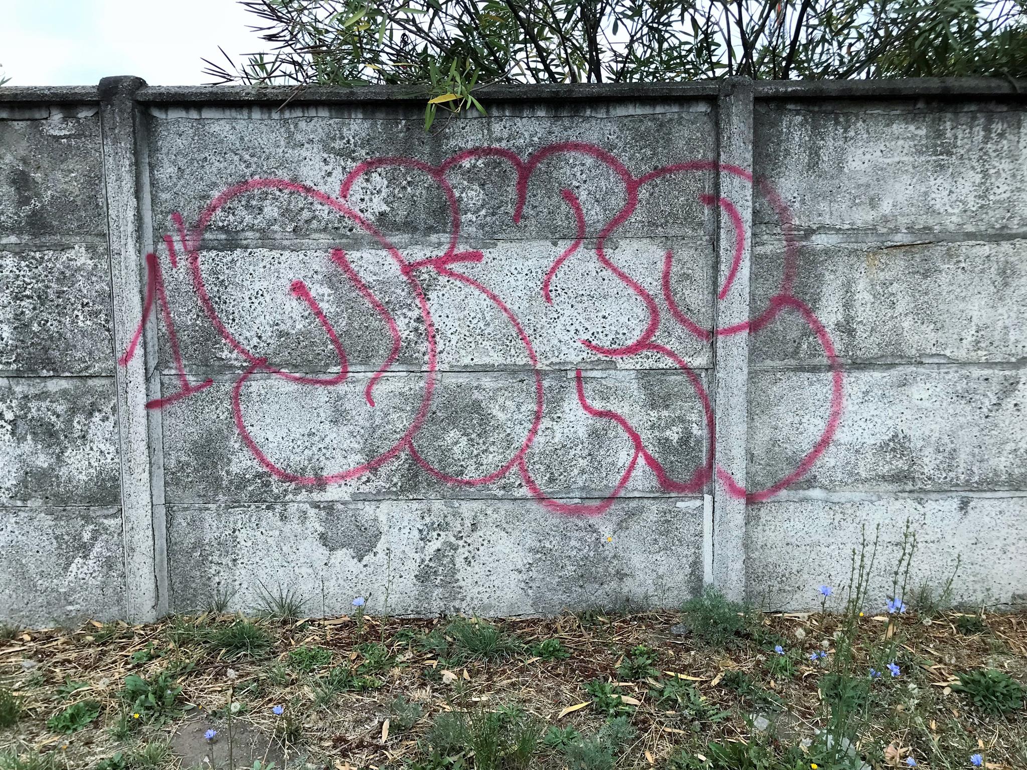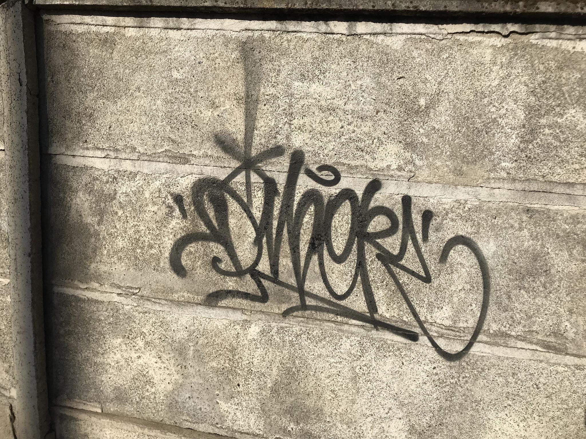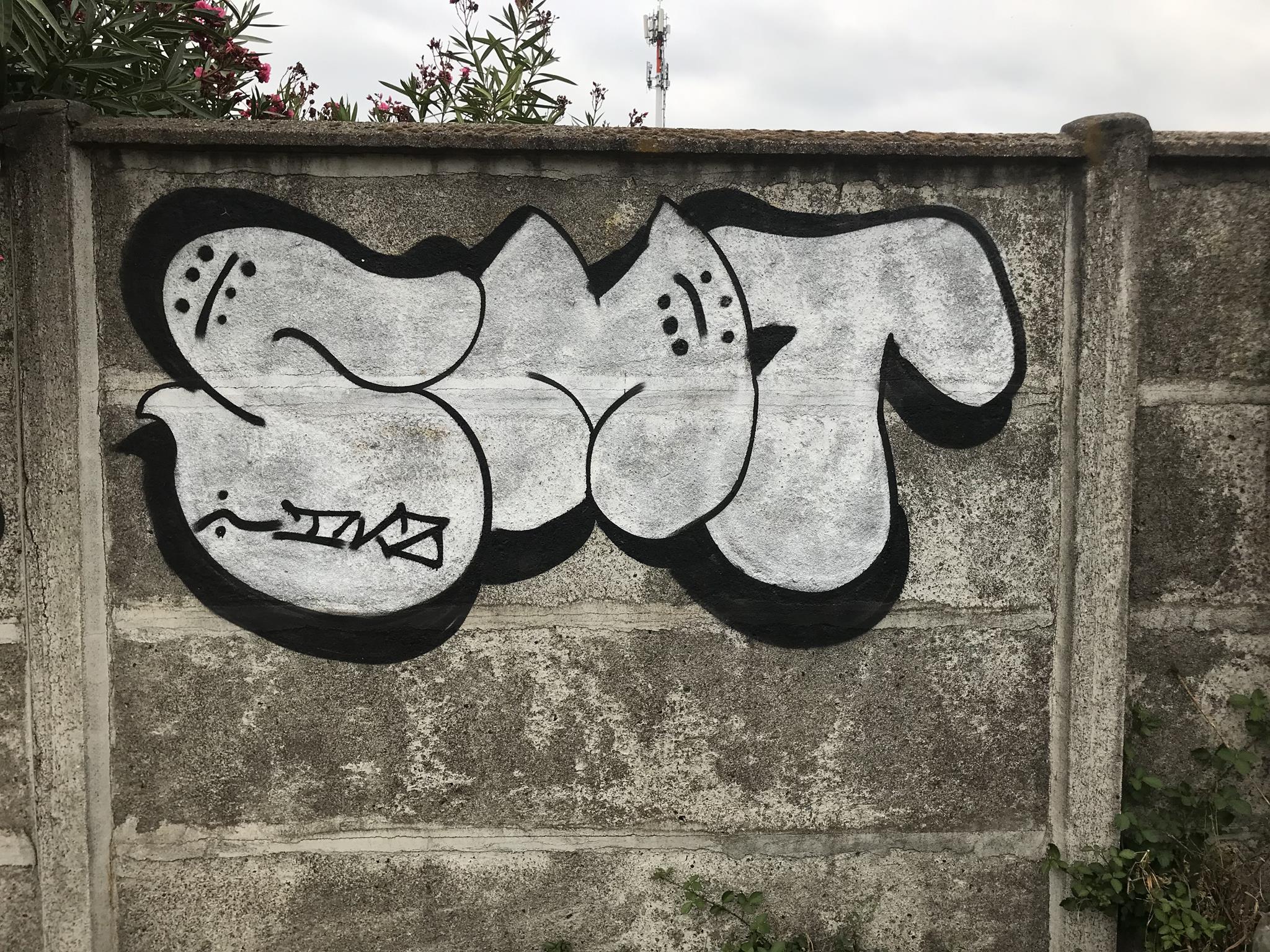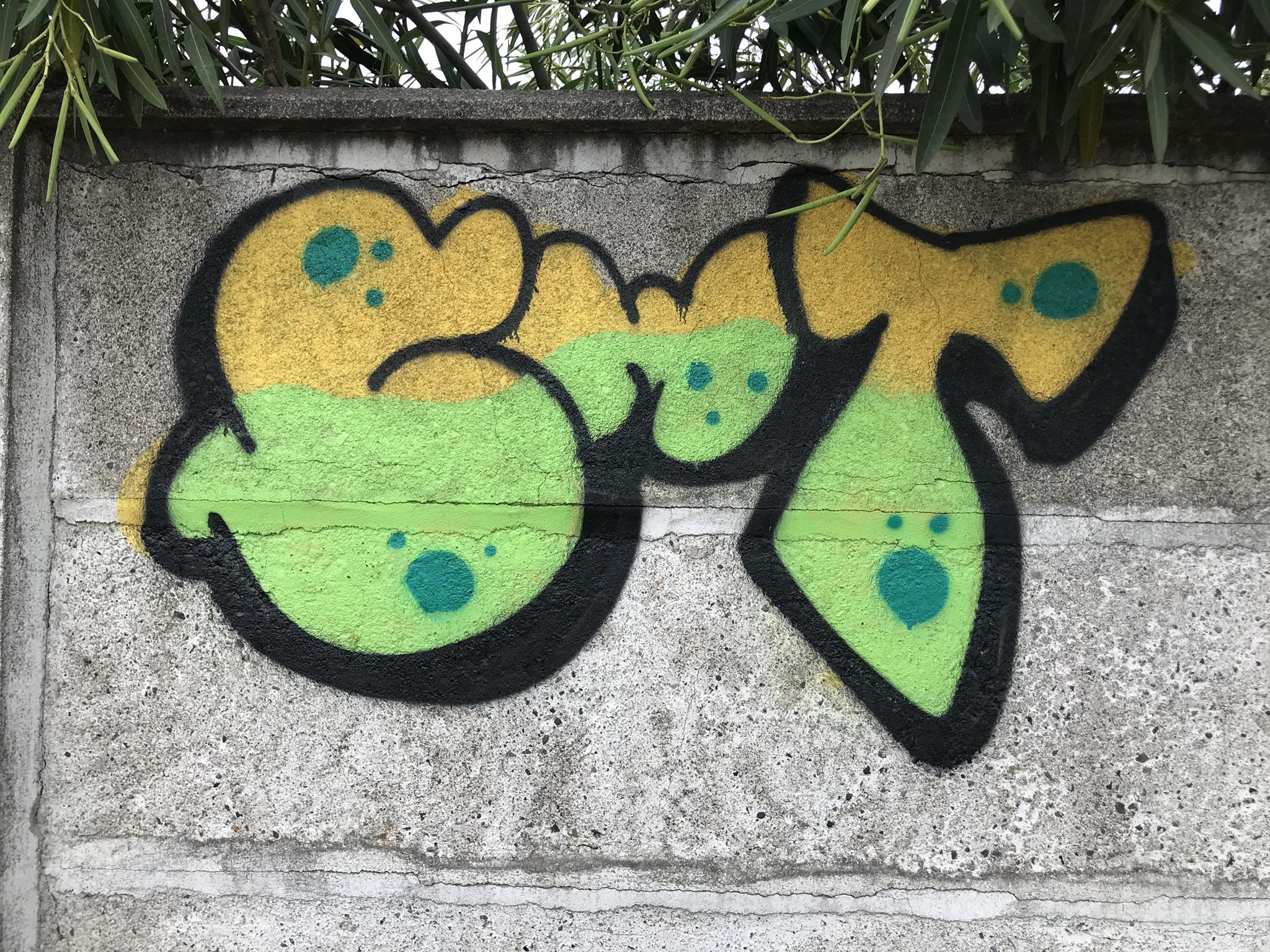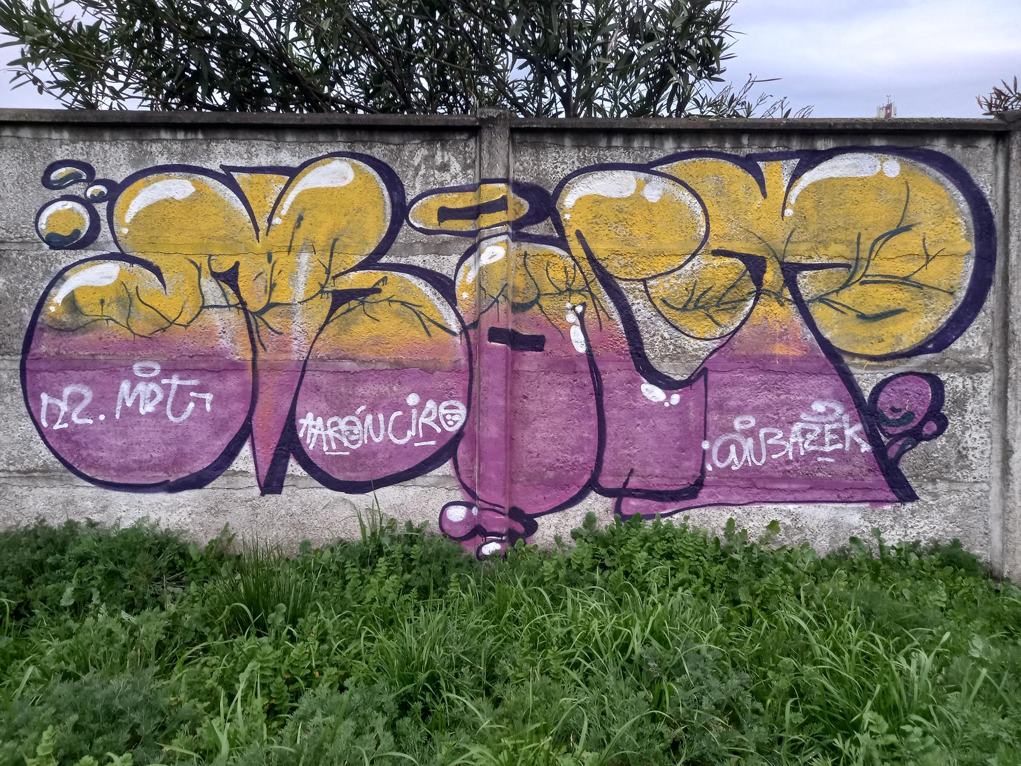 A second group of graffiti begins with a flop with a yellow top and a pinky bottom, by unknown artist.