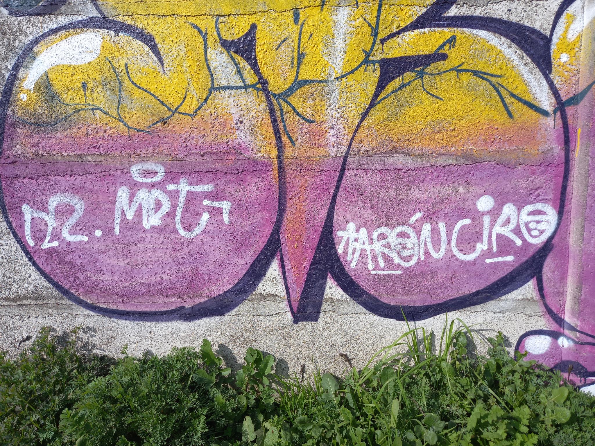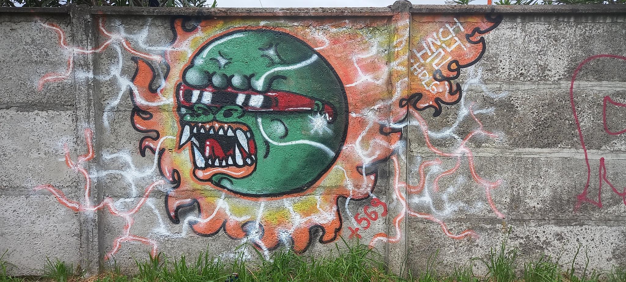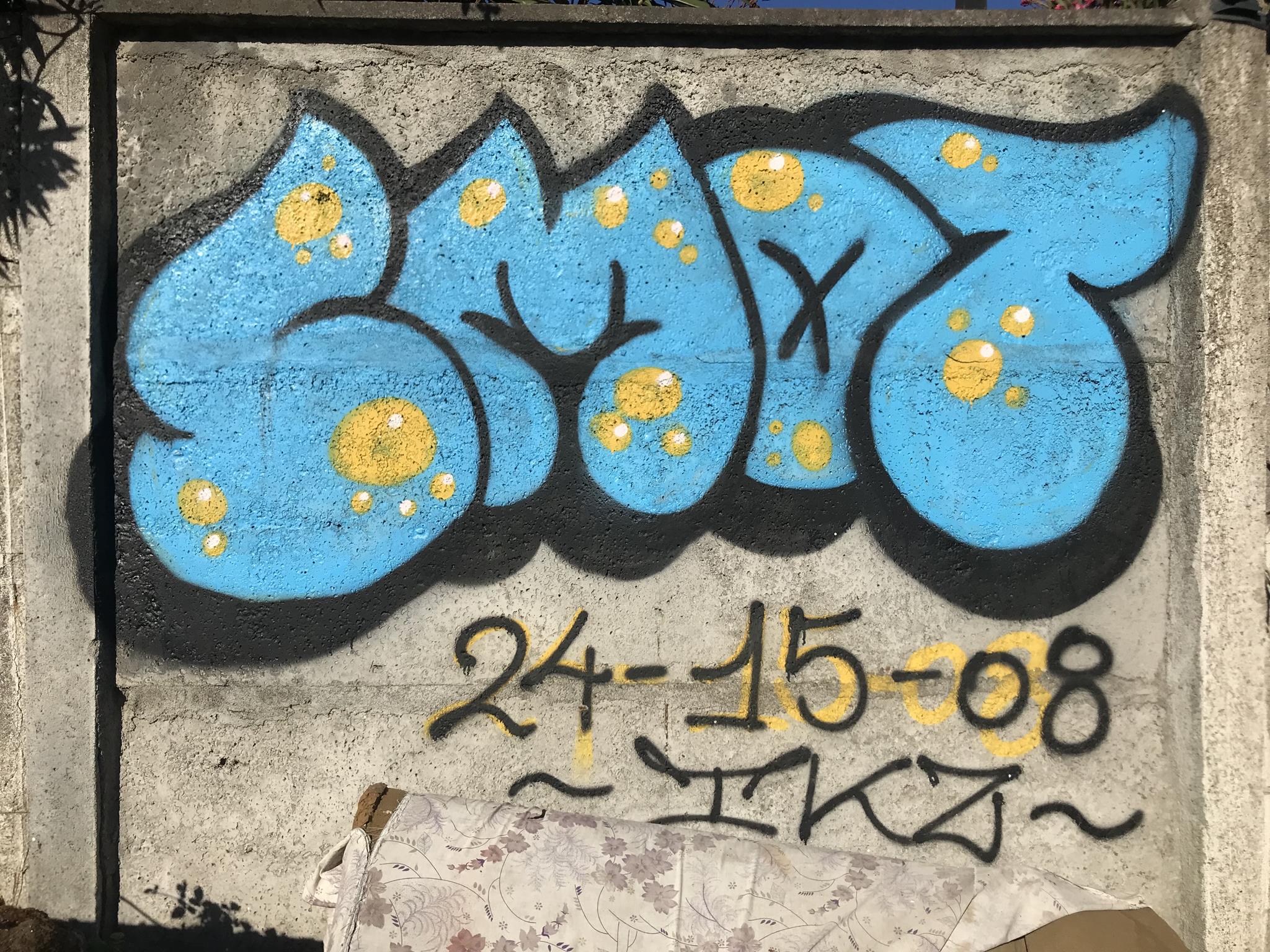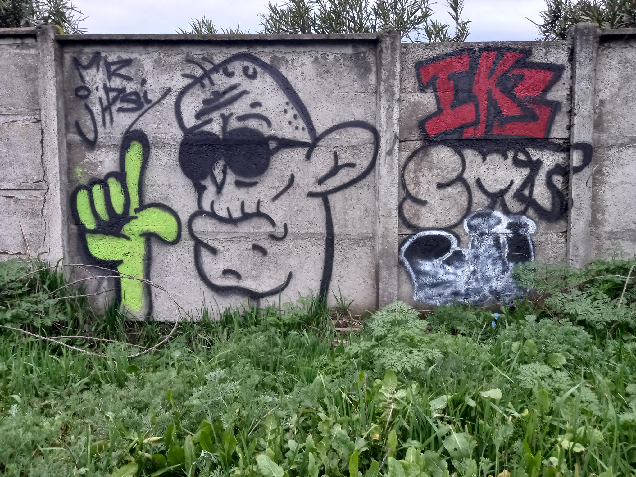 Another group of graffiti located about 25 meters from General Oscar Bonilla Street features a figure wearing black glasses and a green hand pointing upward with its index finger. Also featured are several SMT flops in various styles and colors, also by unknown artist.