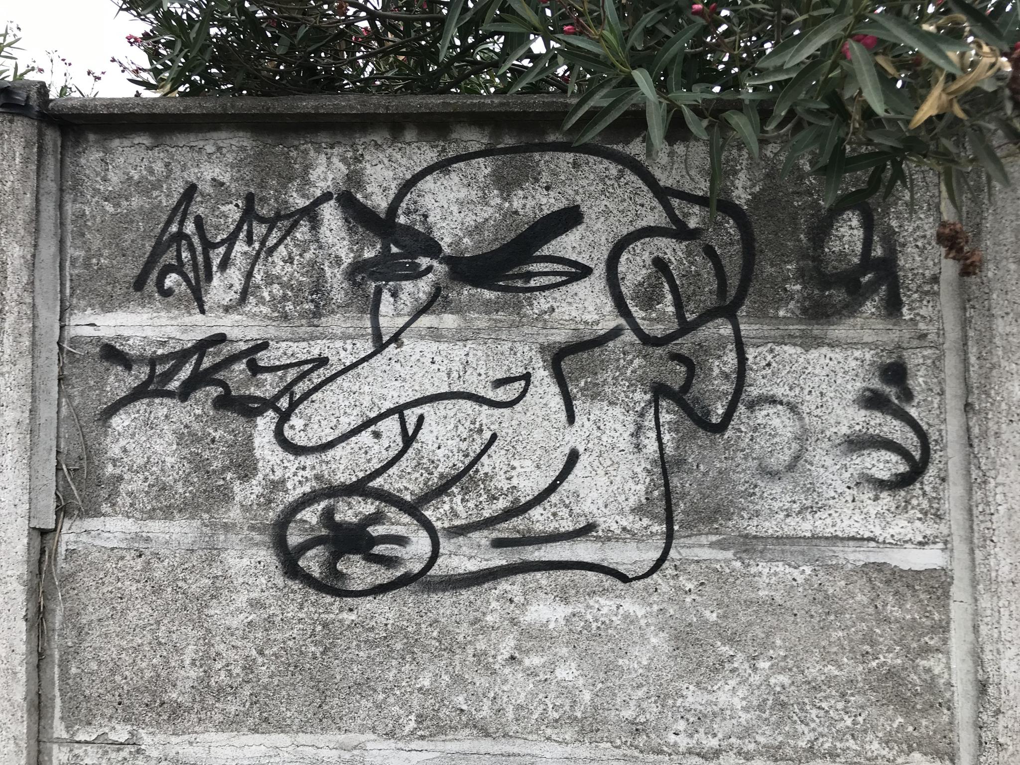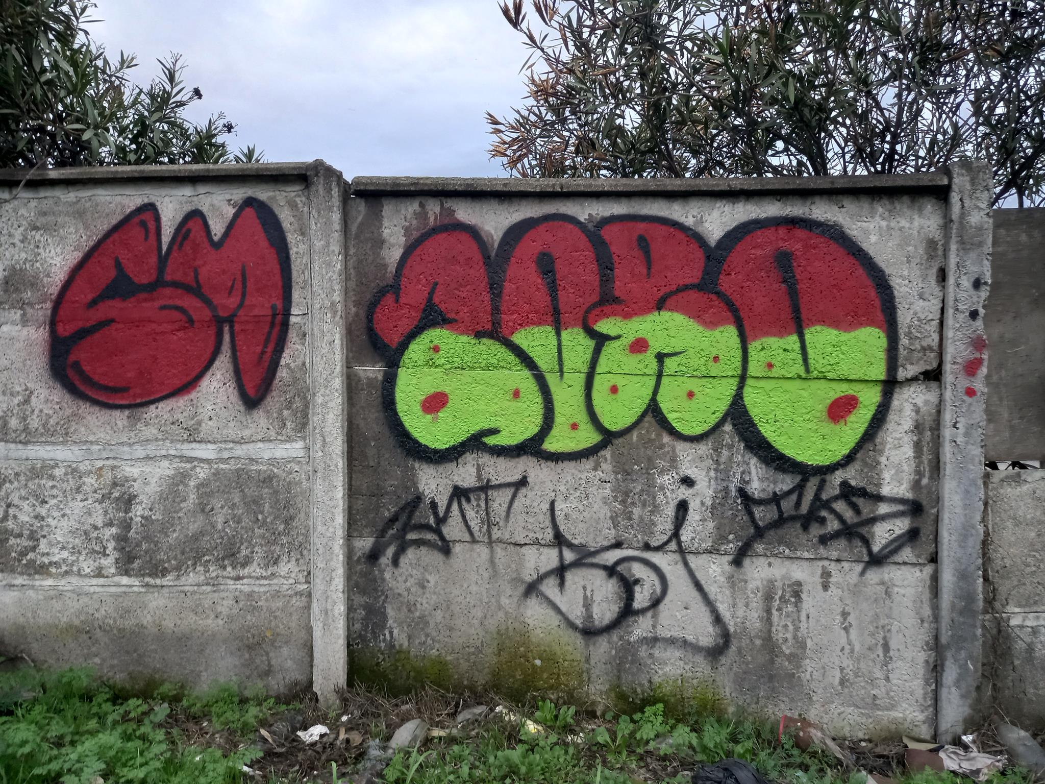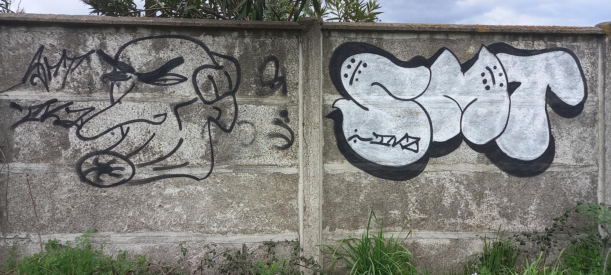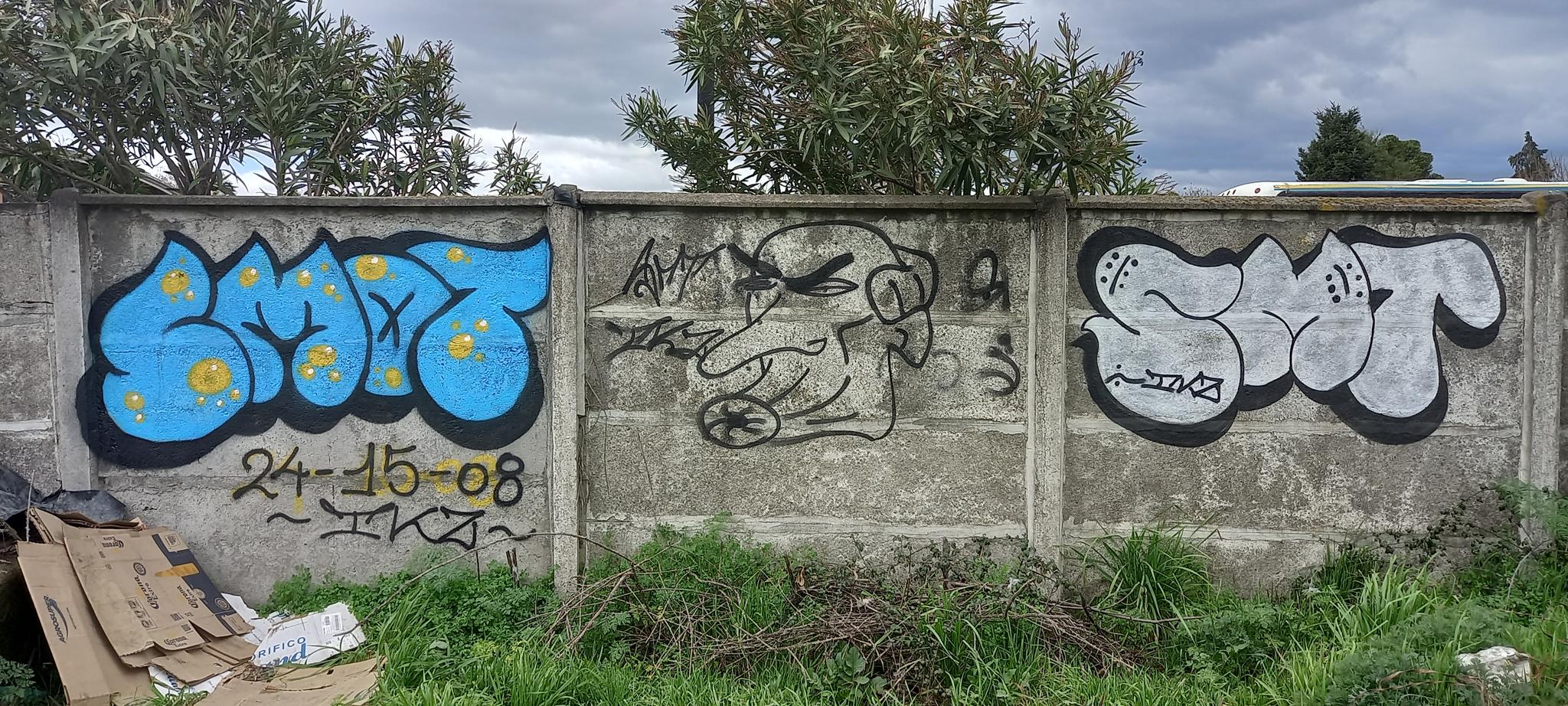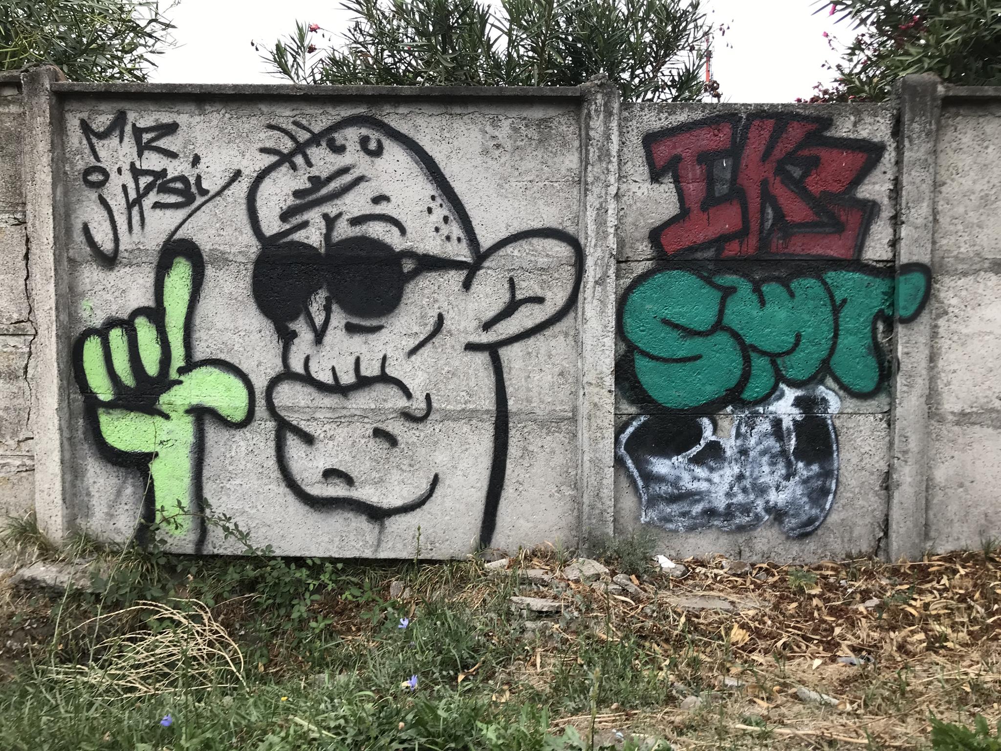 Another group of graffiti located about 25 meters from General Oscar Bonilla Street features a figure wearing black glasses and a green hand pointing upward with its index finger. Also featured are several SMT flops in various styles and colors, also by unknown artist.