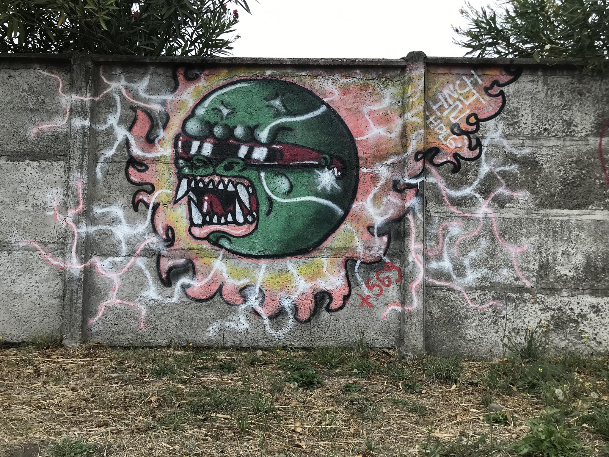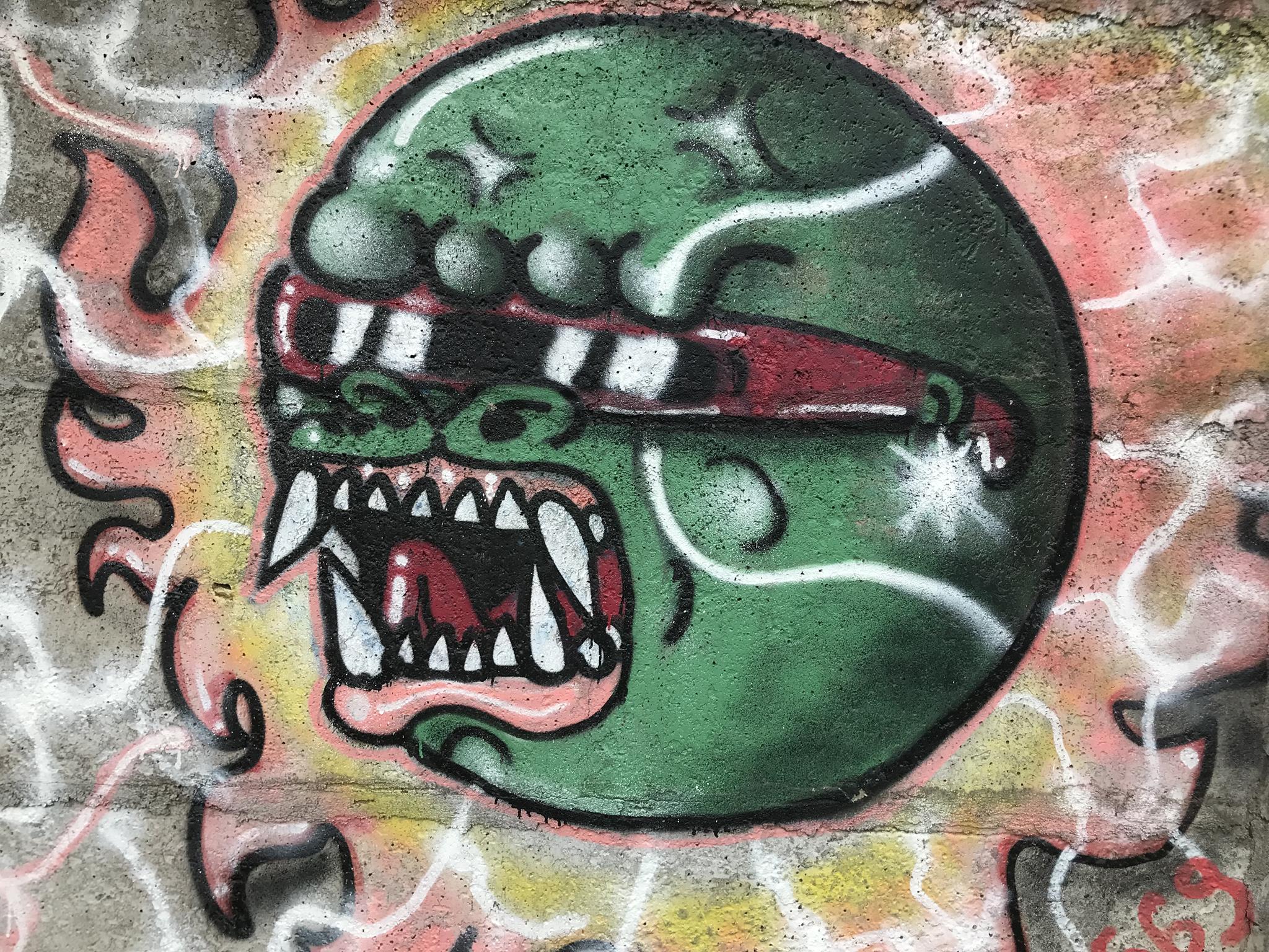 The next graffiti is a face by HNCH, a sinister, green-skinned figure moving while wrapped in flames, creating a nice movement effect.