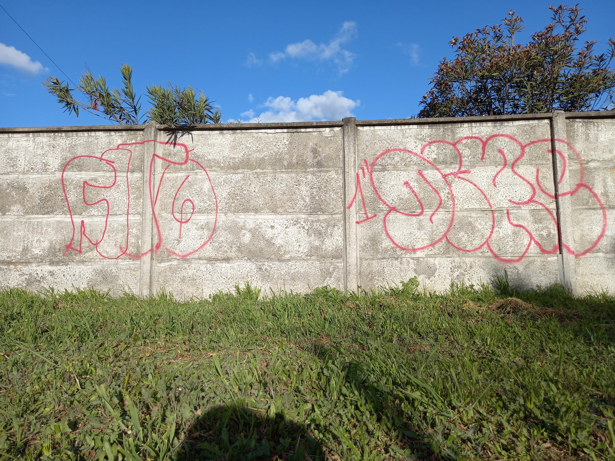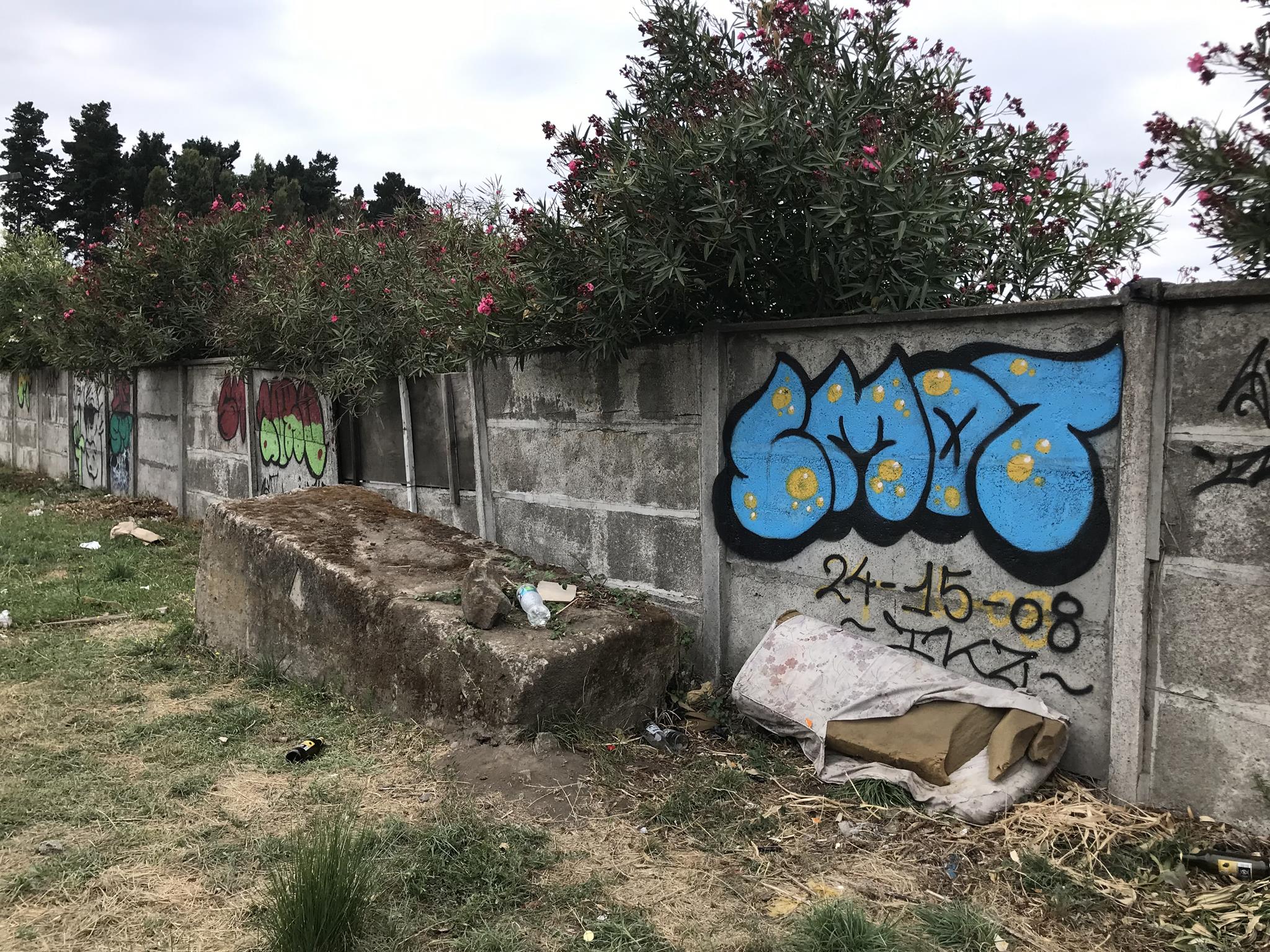 The first graffiti is almost where this street intersects with General Oscar Bonilla Street. It’s a flop by APR, and in the second photo you can already see that part of the wall has collapsed. To one side is a tag by DIBERZO.