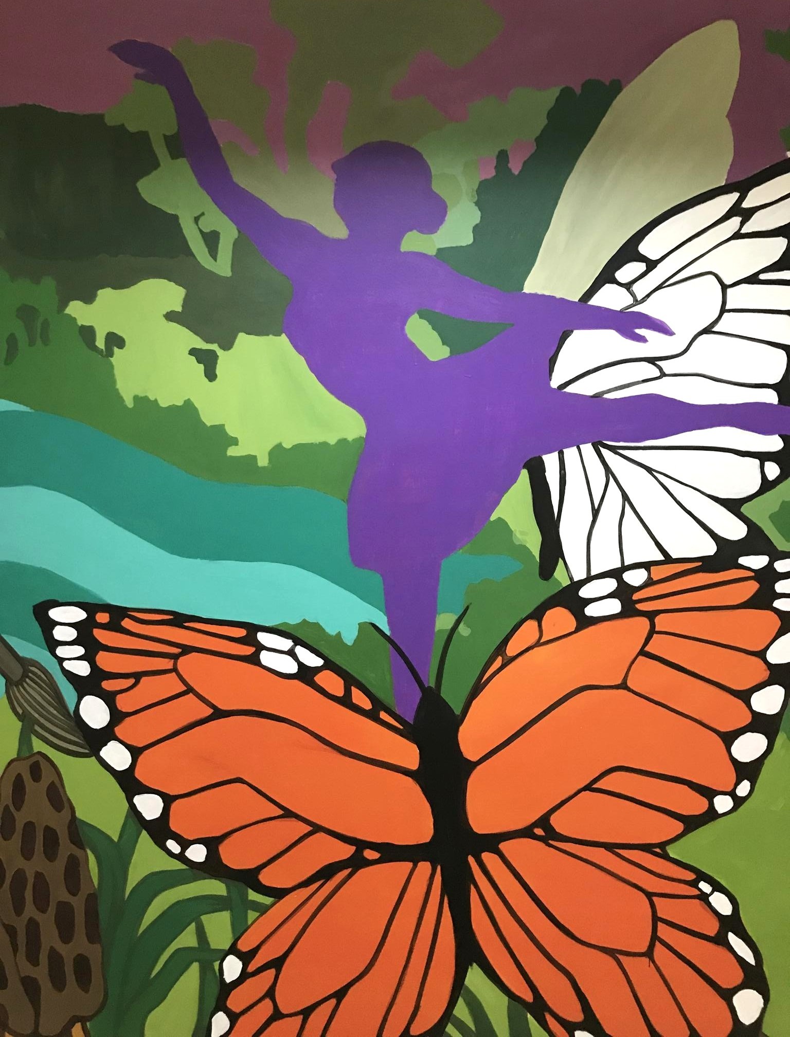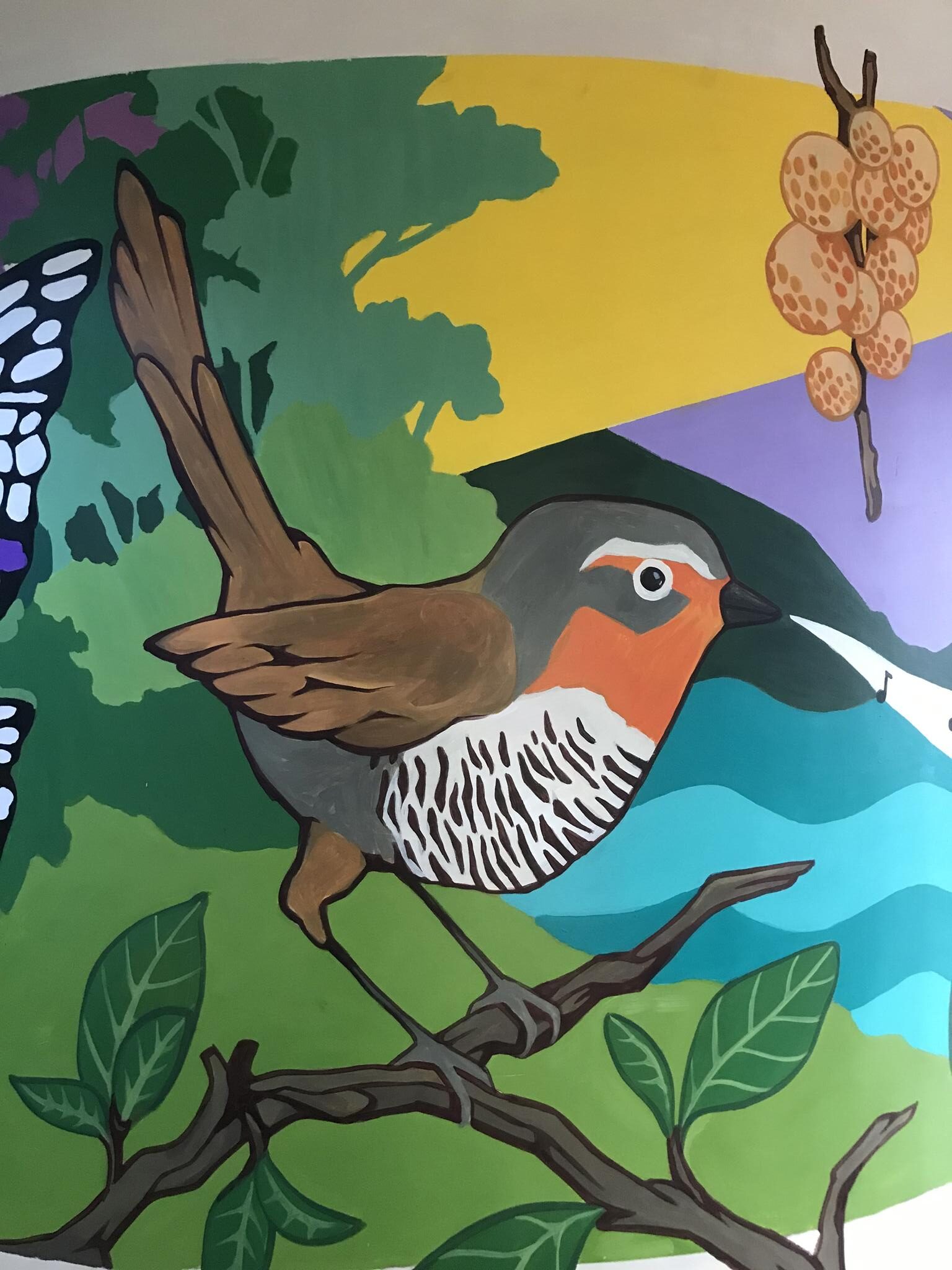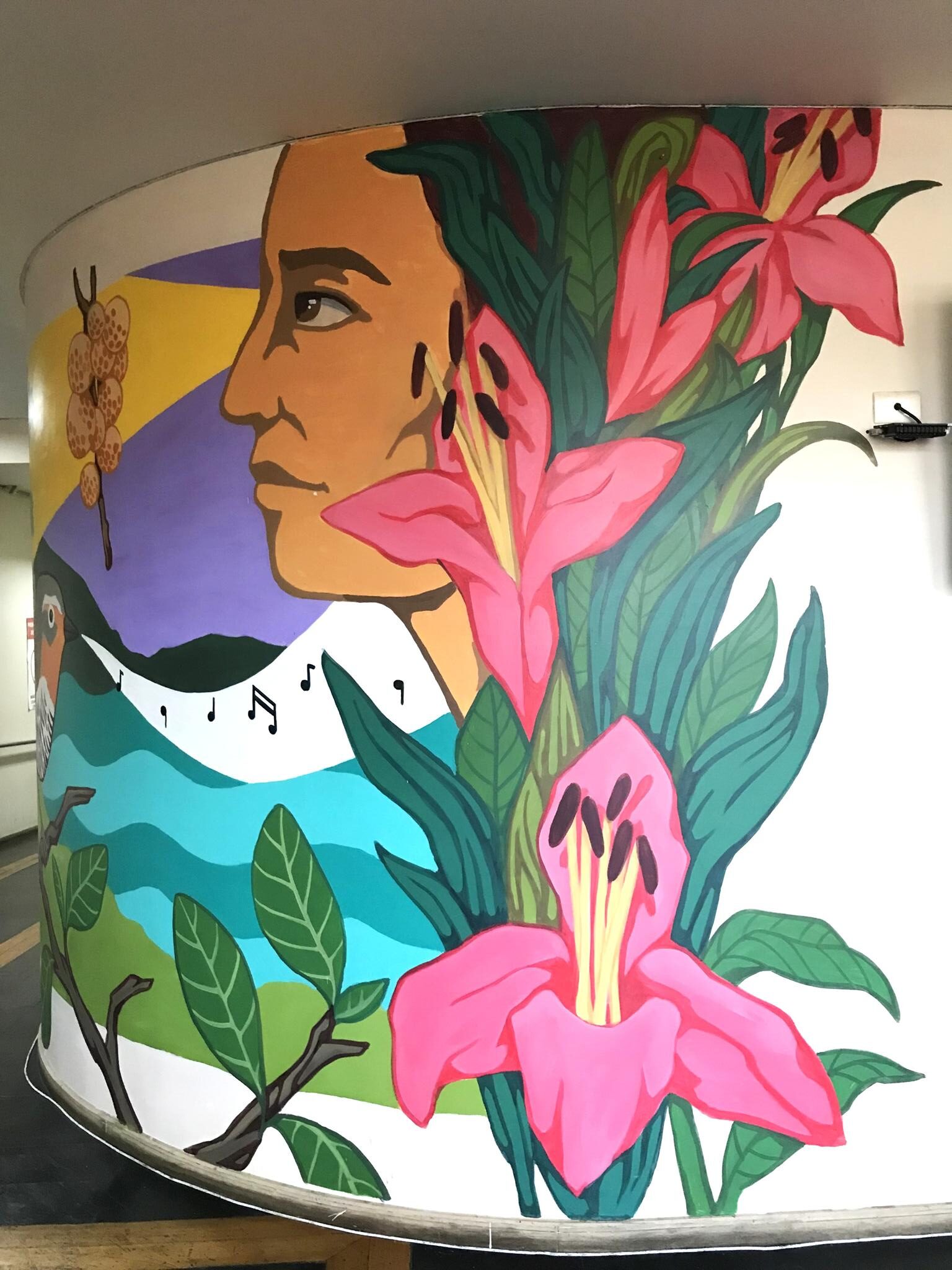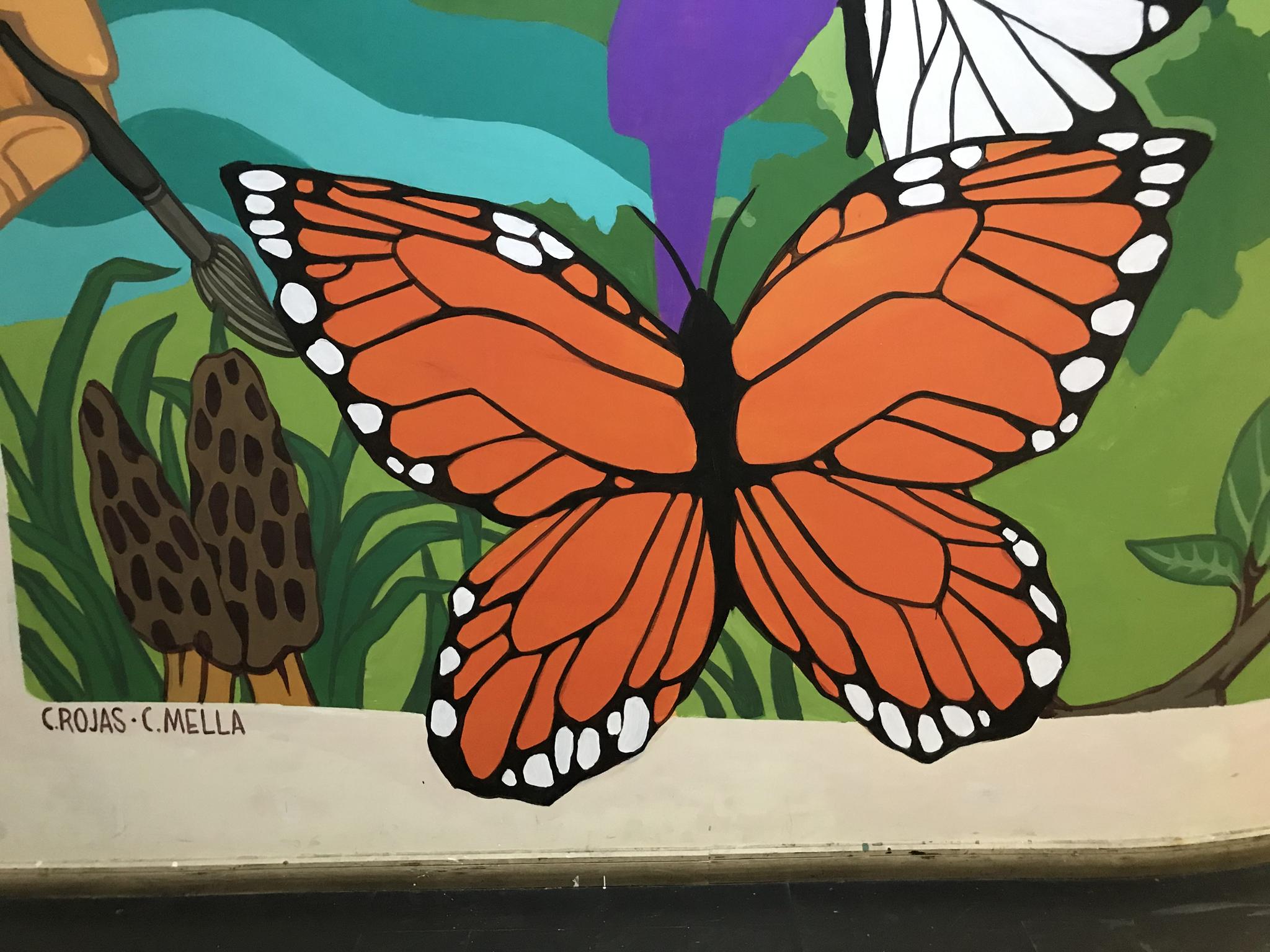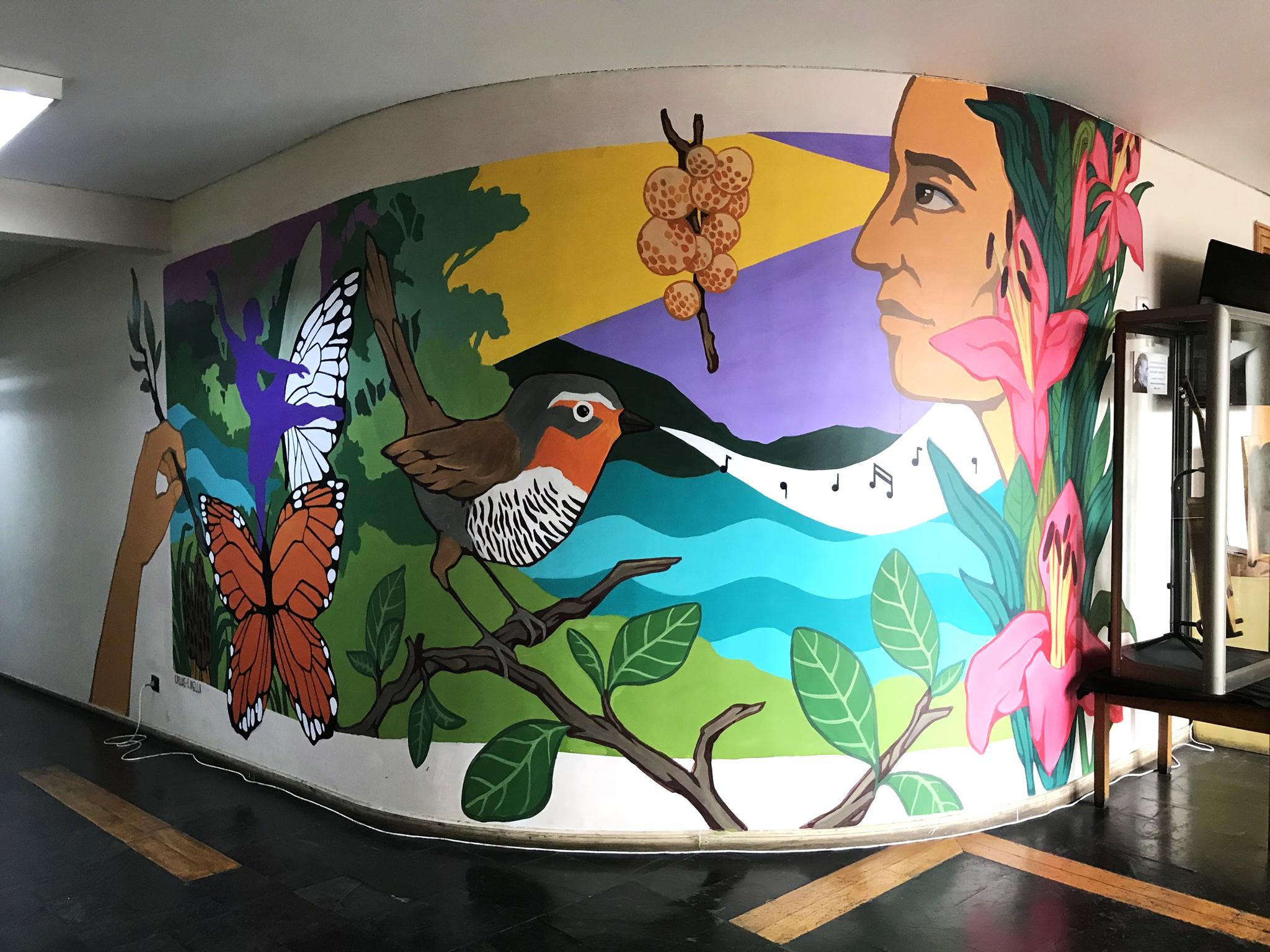 Starting from the left, the painting is rendered with a hand and brush. Above an endemic butterfly, a woman performing ballet represents the diverse dance styles teach in the cultural center. Further to the right, a Chucao tapaculo (Scelorchilus rubecula) sings, its musical notes emanating from its beak. Above the bird is a painting of digüeñe, an endemic orange and white fungus that is eaten in Araucanía. The mural ends with flowers and a woman watching the theater and performance that the cultural center also puts on. Also have a look on the wooden totem artwork by sculptor RODRIGO ZAPATA LUNA in front of the center.