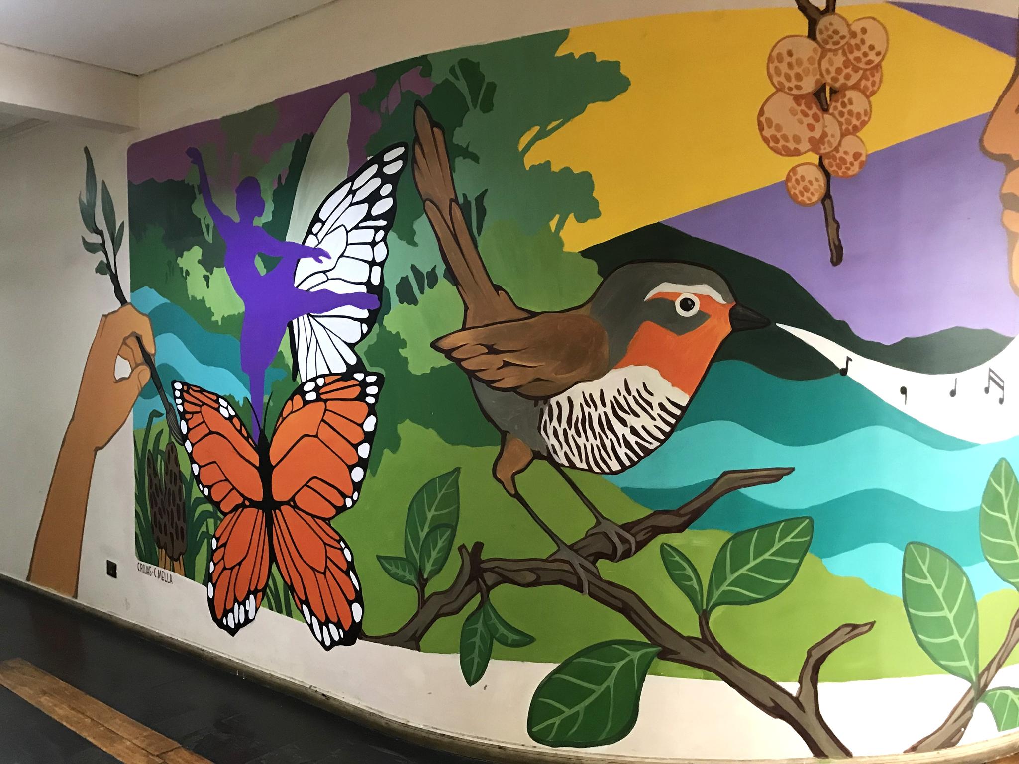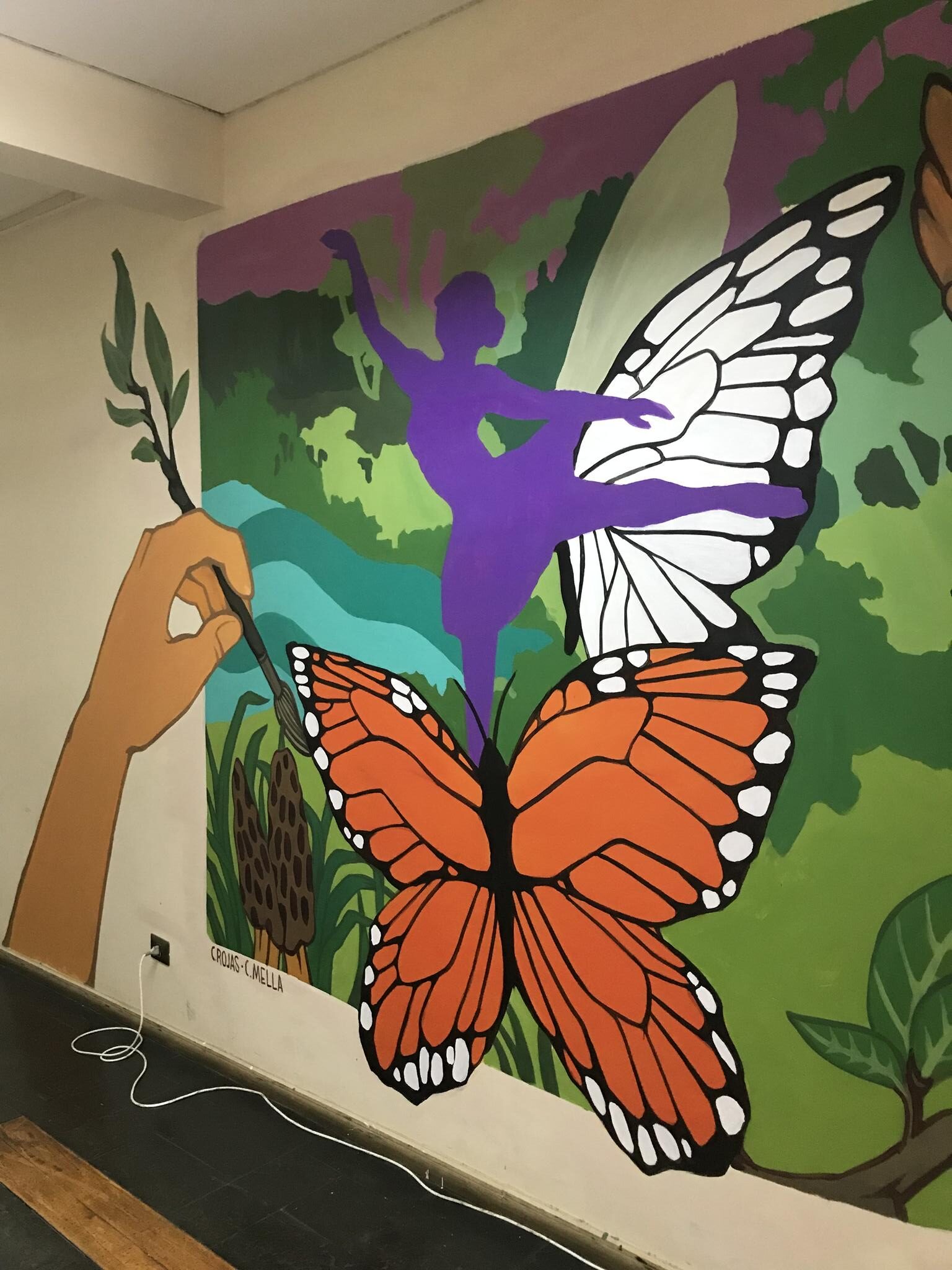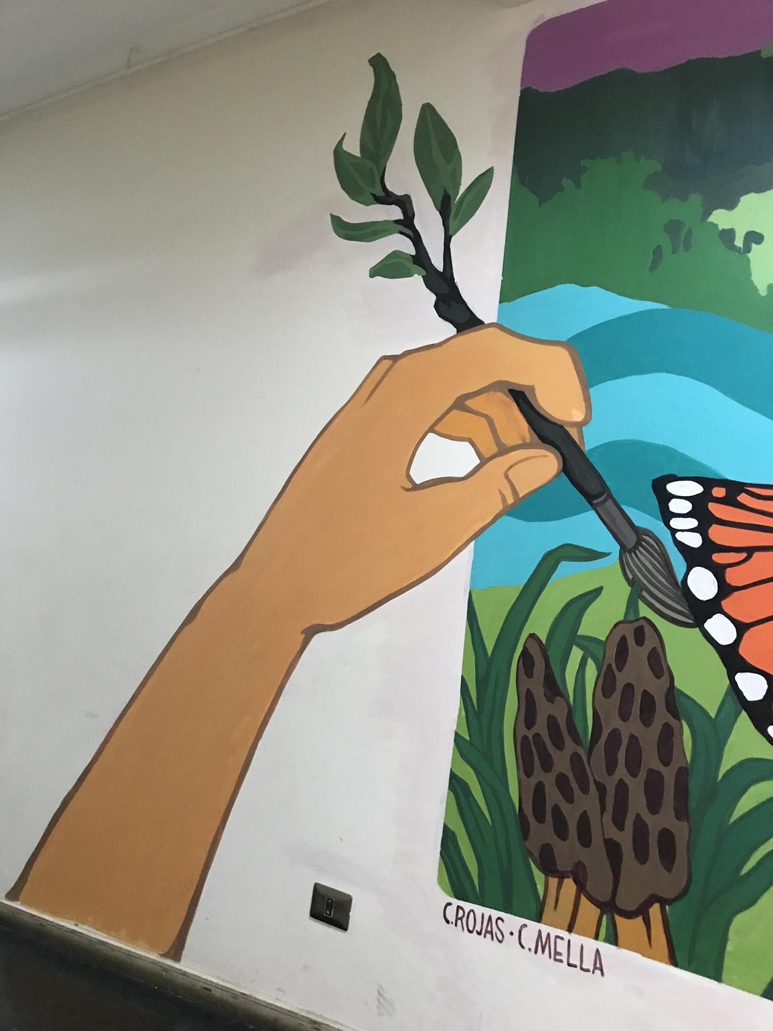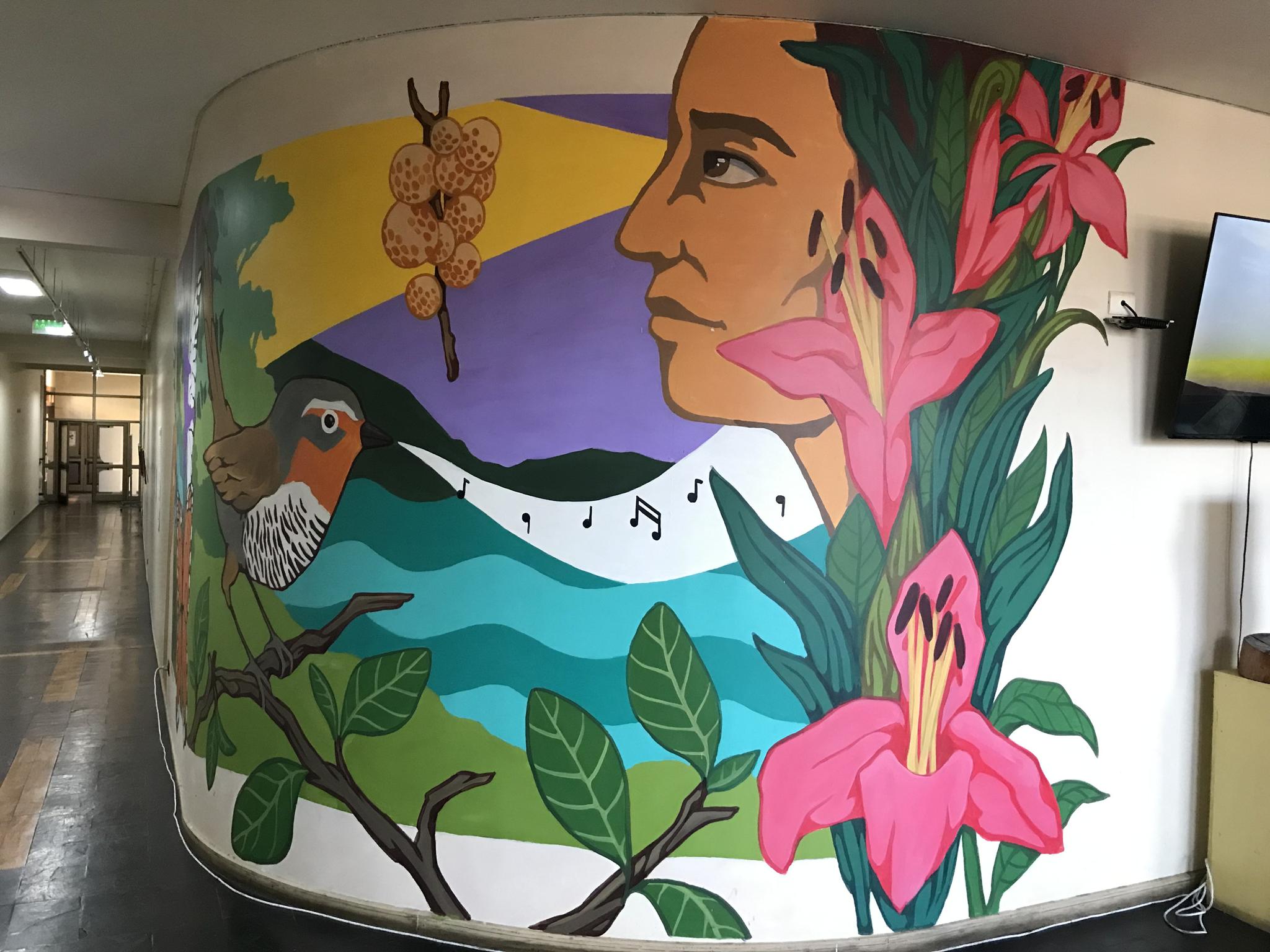 In November 2024 the cultural manager and sociologist CLAUDIO MELLA organized the painting of a mural on the interior walls of the Angol Cultural Center. He sought out the artist CRISTIAN ROJAS, also known as MACRO, who conceived the mural according to the original design, which called for showcasing the artistic disciplines taught at the center with a local natural setting. It’s also worth noting that he was supported by FEBICIDAD HOY and the mural was painted together with children participating in various workshops offered by the Angol Cultural Center.