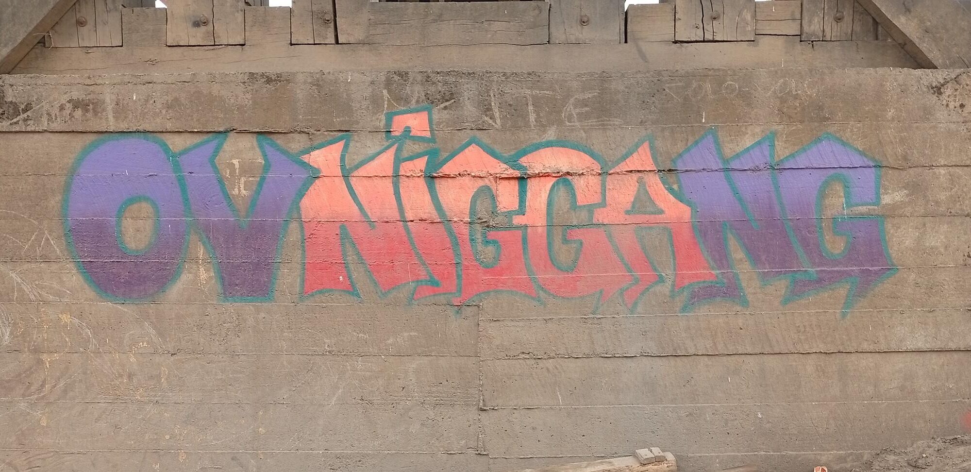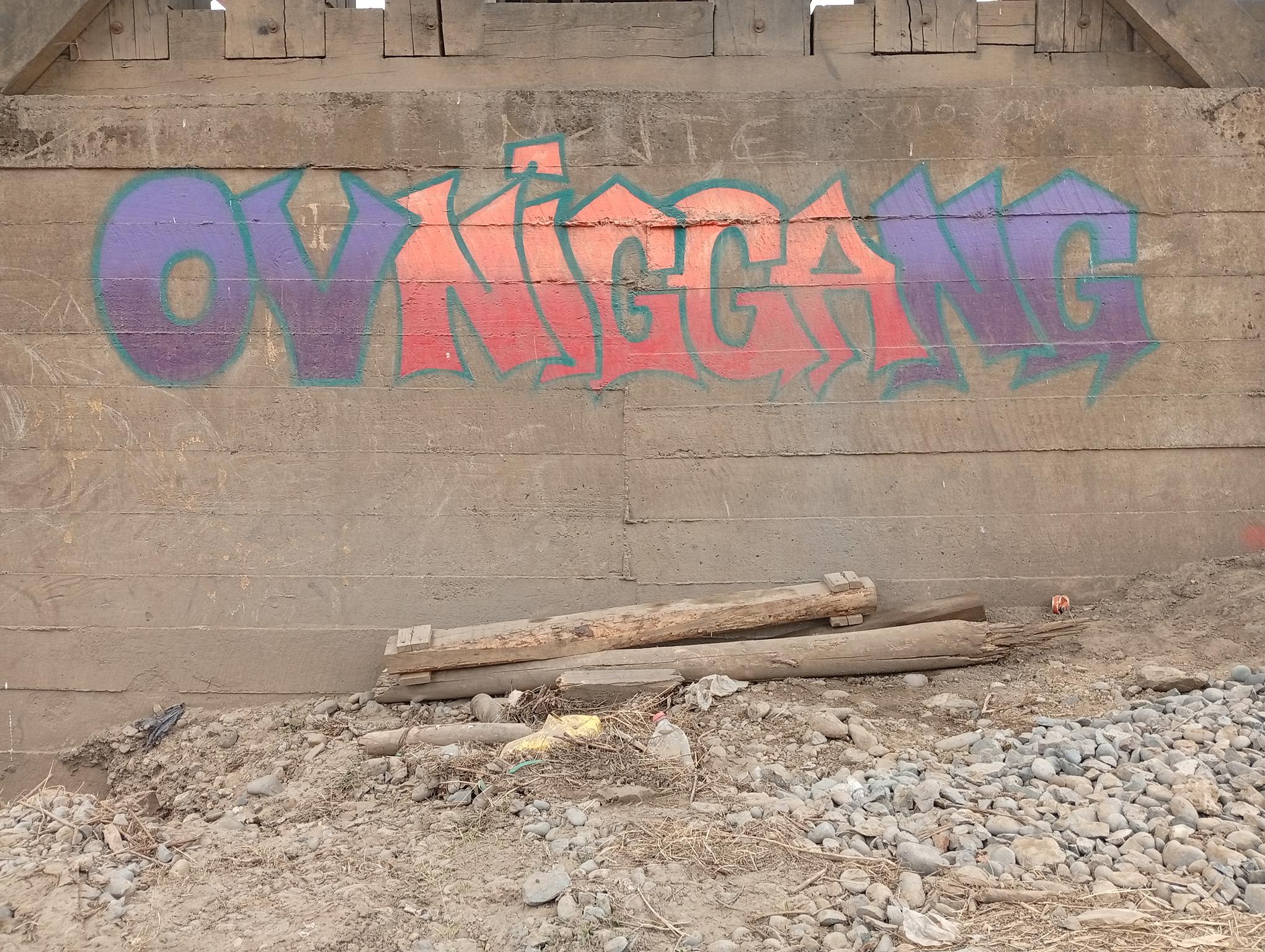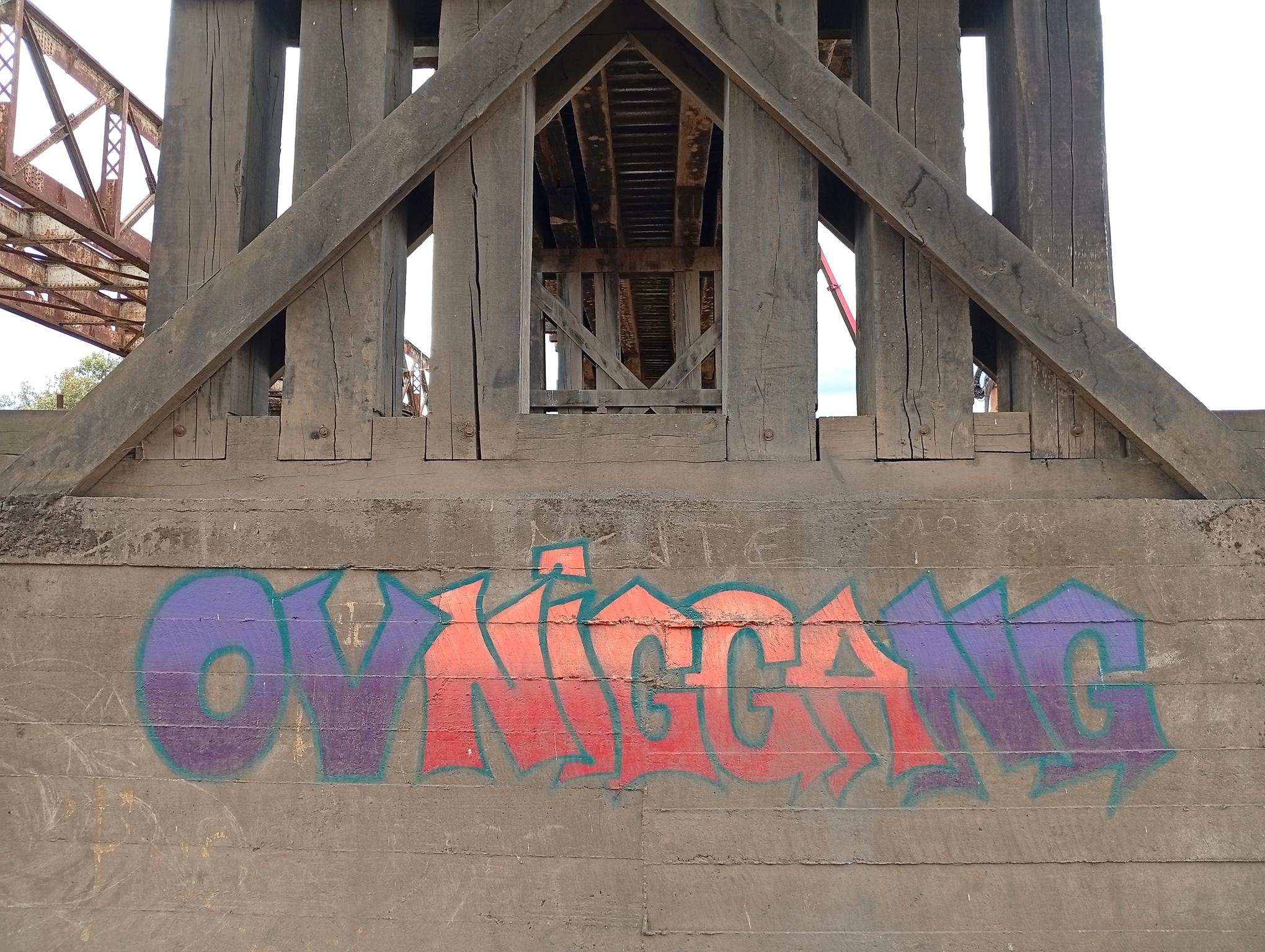 The graffiti and flop “Ovniggang” by the artist SINNEYM from the OVNIGGANG CREW was painted on the base of the wooden bridge used by cars. To one side stands the imposing railway bridge over the Malleco River. The graffiti was done in two colors with a green border. Check out as well the individual page for the bridge, its architecture and history.