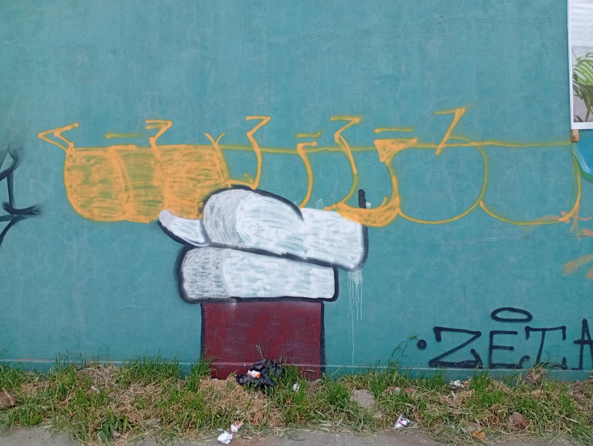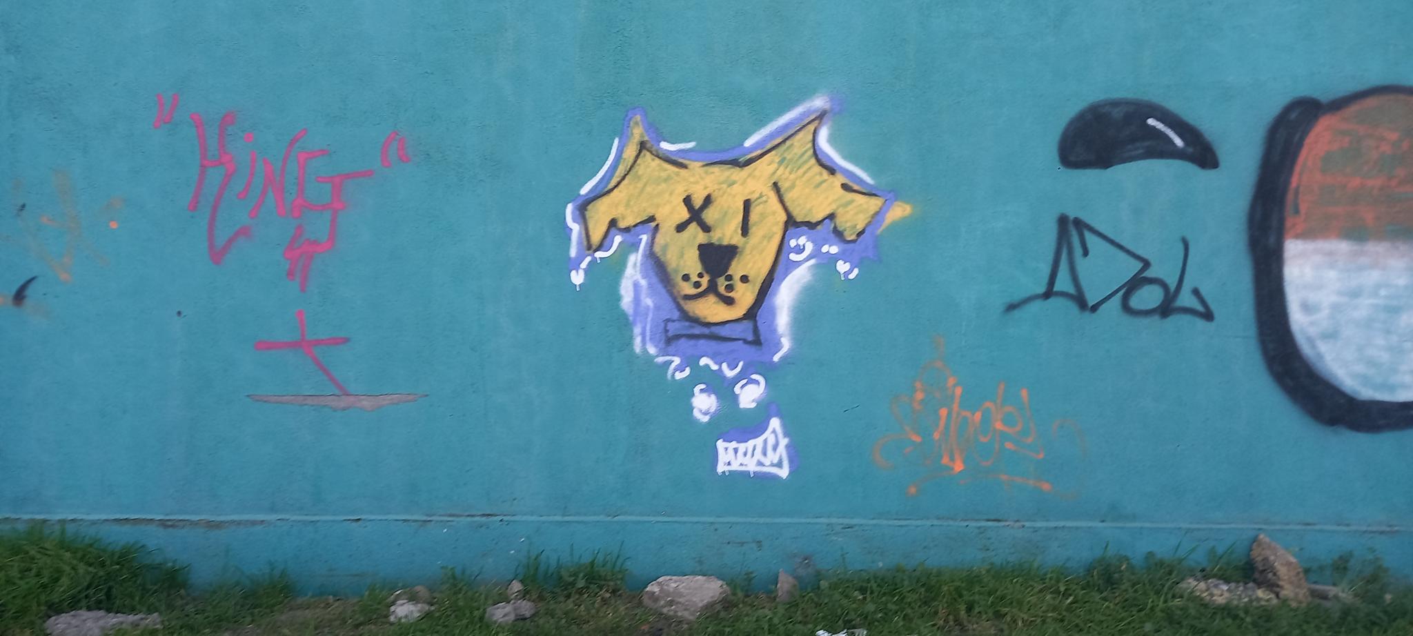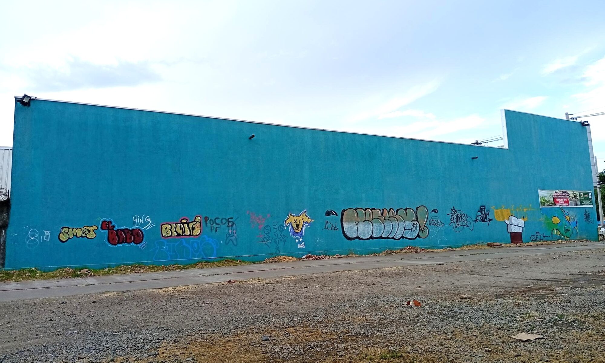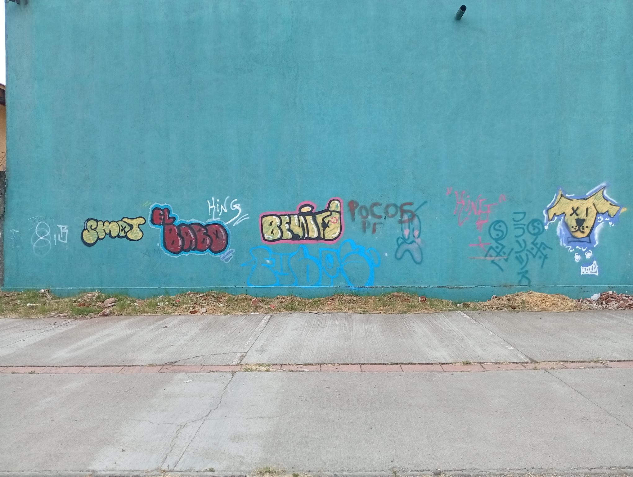 This large wall is located where the train tracks used to run, at the corner of Bernardo O’Higgins Avenue. Most of the streetart of this wall are flops that say things like SMOT, EL BABO, BENID, MAFLAY and FUGAS, among others. There are also several tags, including two by DIBERZO, which were probably done when he was painting across the existing train track at Train Line Nº4. Finally, there are also some graffiti pieces, such as a dog at the middle of the wall and a wolf at the end of the wall, that have all the characteristics of the wolf done by probably the same artist who created the graffiti located in Jose Bunster 615.