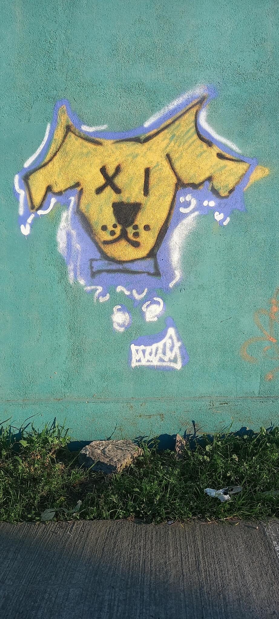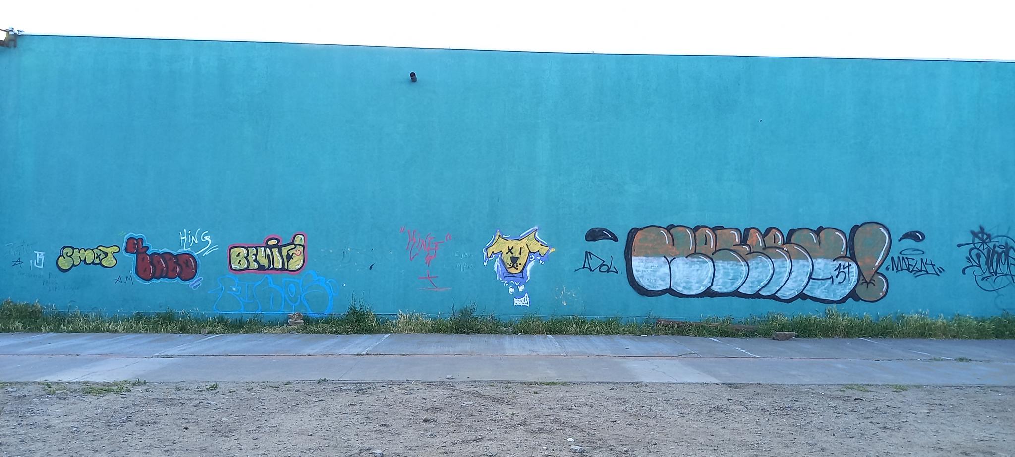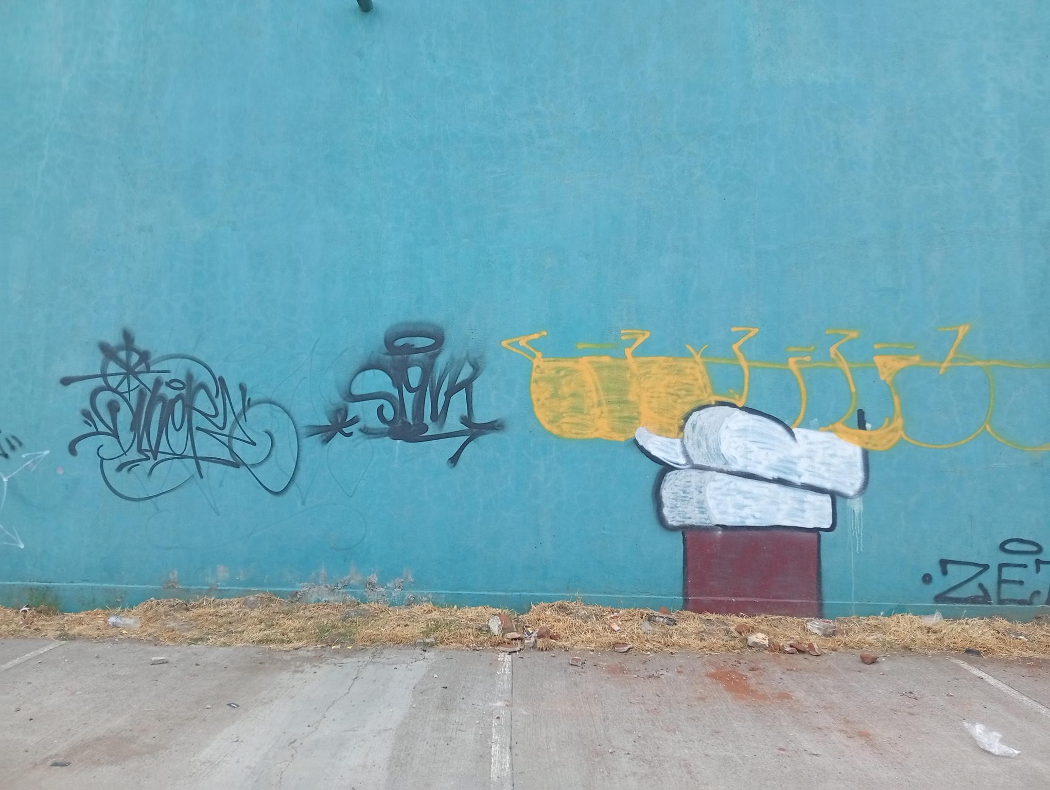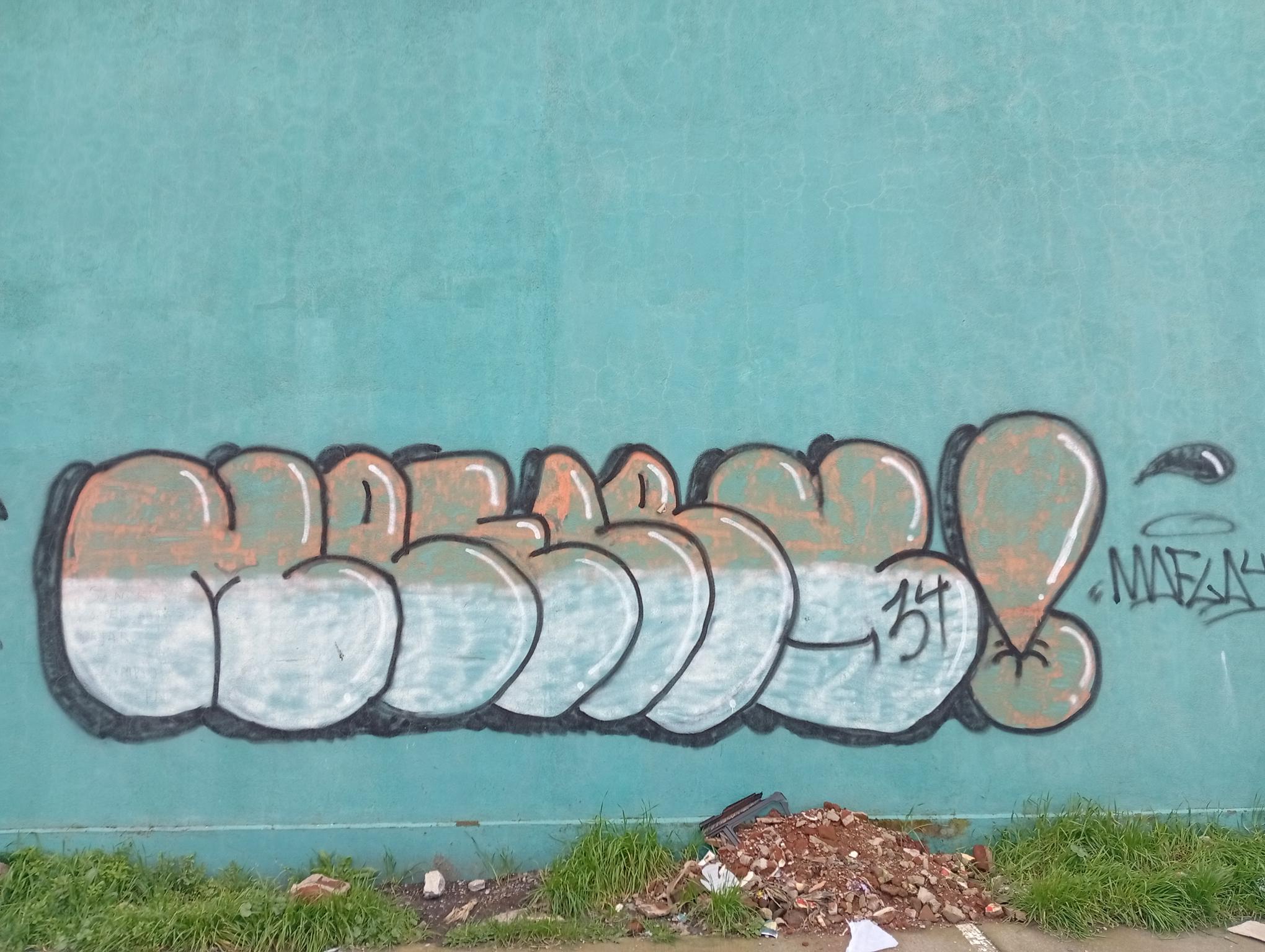 This large wall is located where the train tracks used to run, at the corner of Bernardo O’Higgins Avenue. Most of the streetart of this wall are flops that say things like SMOT, EL BABO, BENID, MAFLAY and FUGAS, among others. There are also several tags, including two by DIBERZO, which were probably done when he was painting across the existing train track at Train Line Nº4. Finally, there are also some graffiti pieces, such as a dog at the middle of the wall and a wolf at the end of the wall, that have all the characteristics of the wolf done by probably the same artist who created the graffiti located in Jose Bunster 615.
