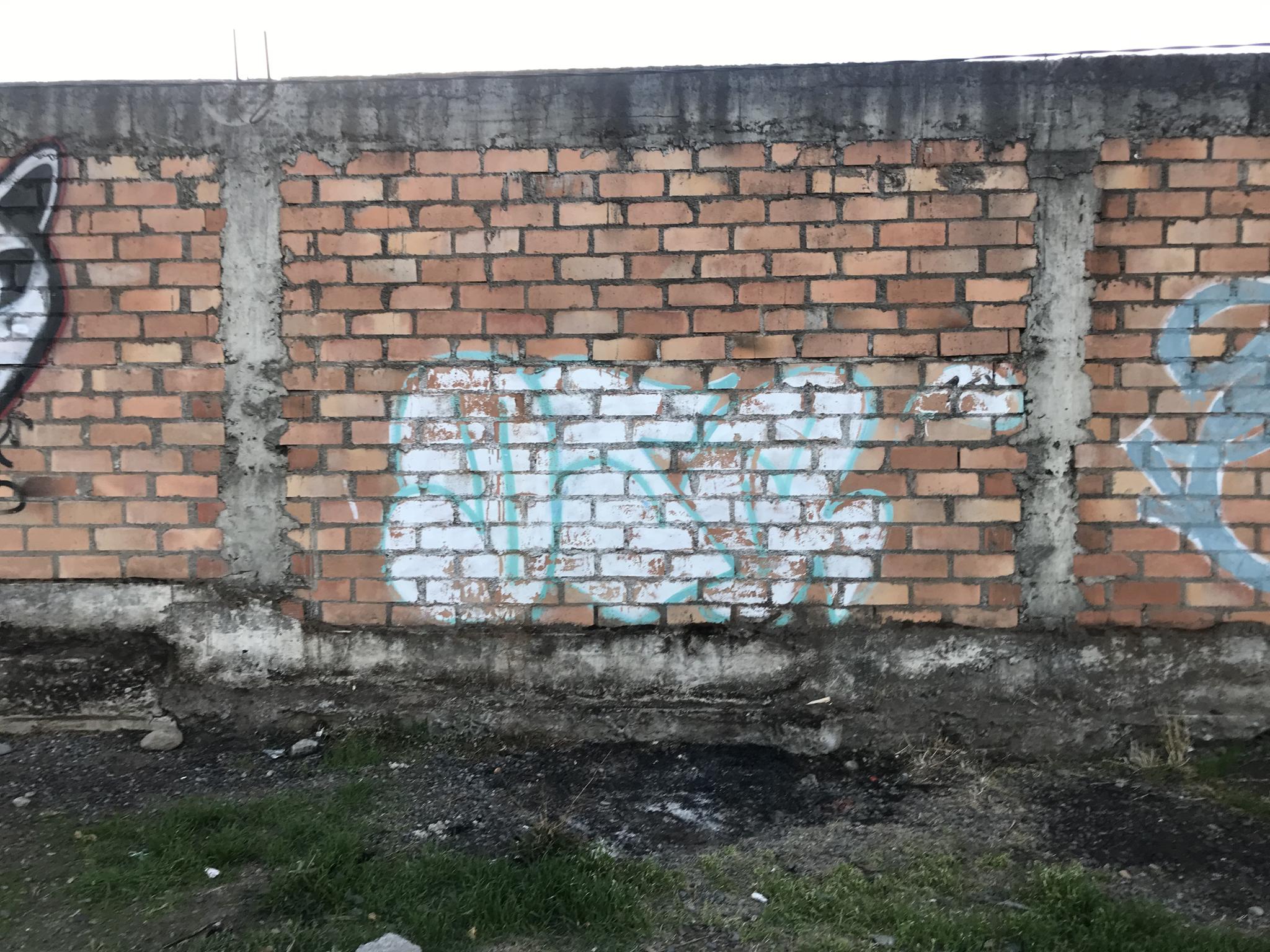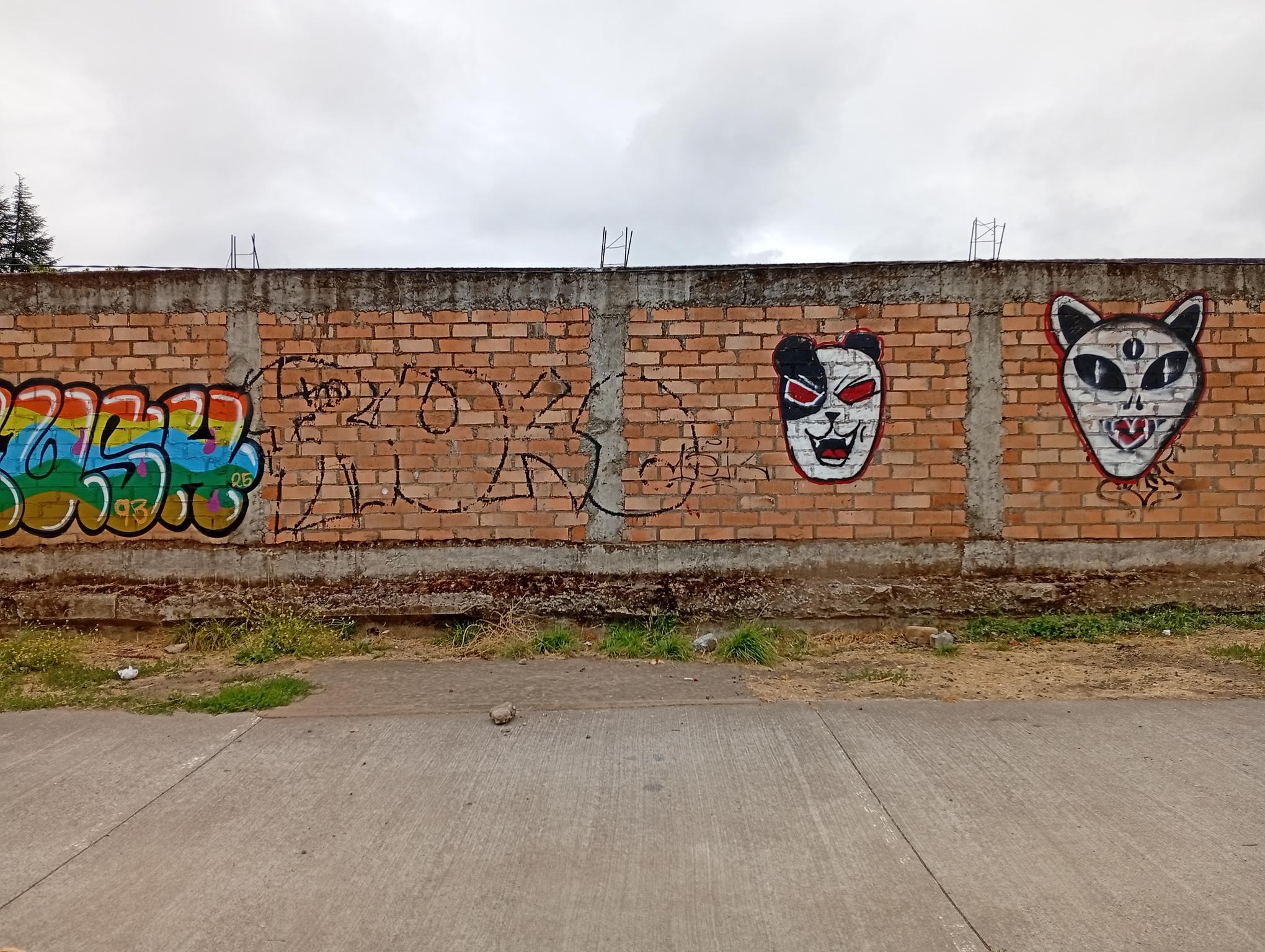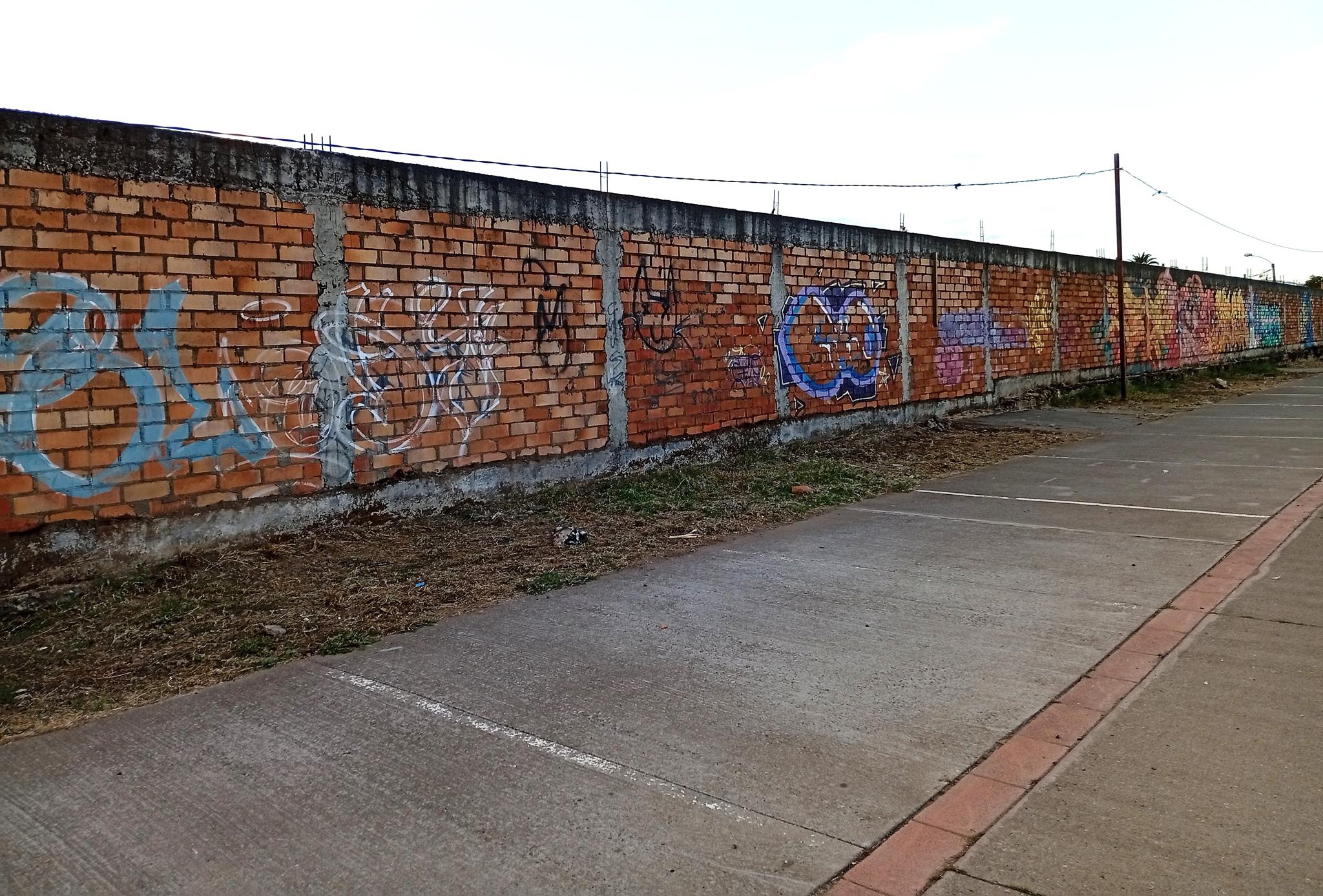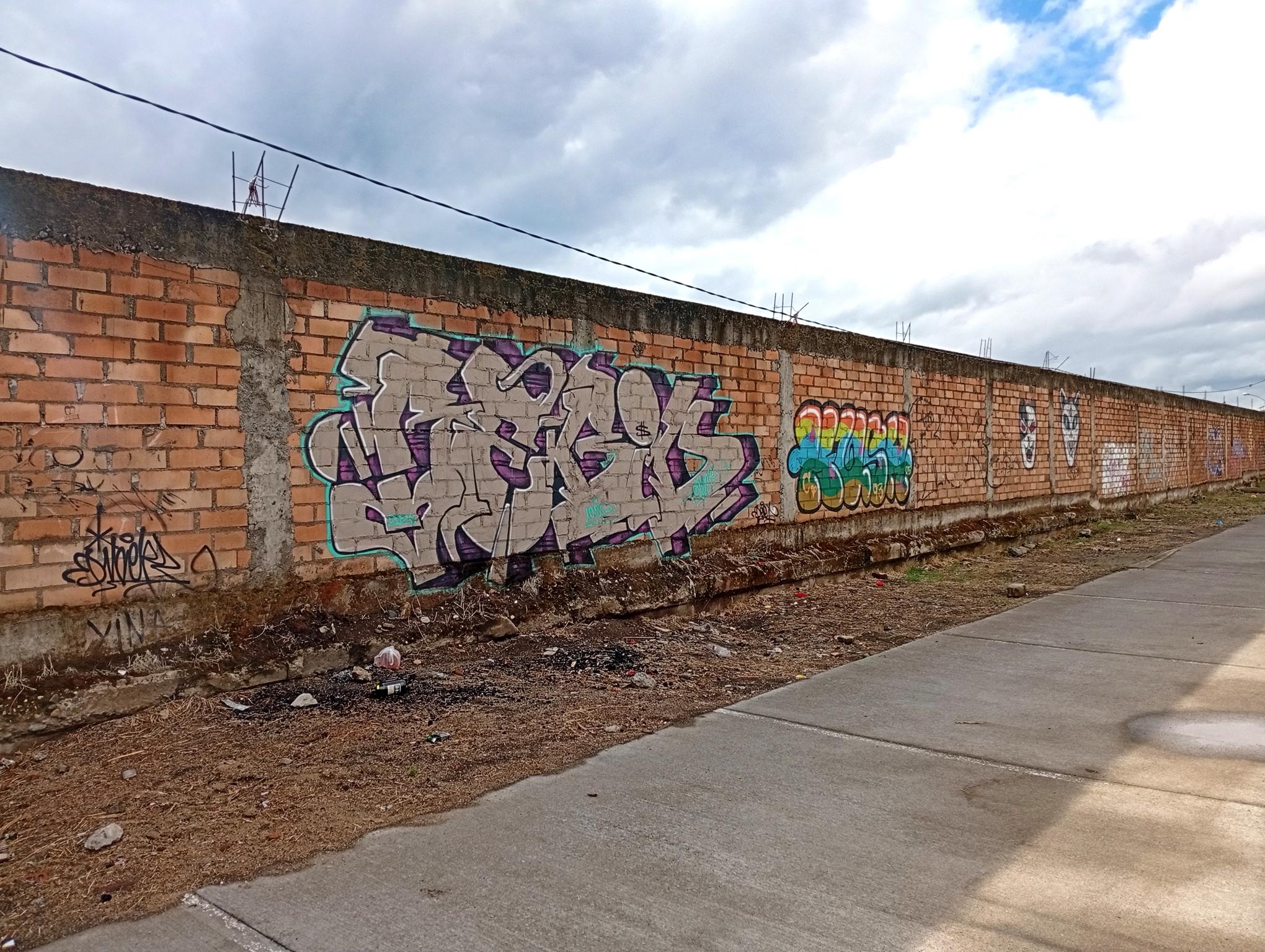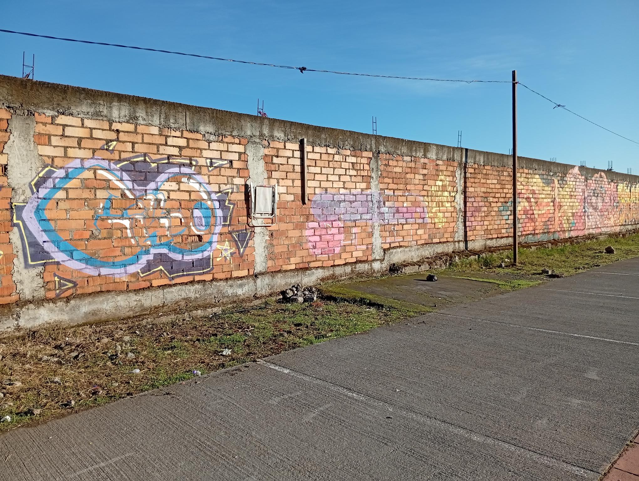 This section of the wall, located where the train used to run, displays graffiti from different periods. The most recent graffiti was painted in early 2026 by KUSH and DIBERZO, who painted a flop with clear lettering, purple borders, and a light blue outline. To the right is KUSH’s unmistakable flop, where he changes colors, creating a rainbow of flops that spreads throughout Angol. Immediately to the right of KUSH’s graffiti, there’s a transparent flop by RUKO, and a little further to the right, GILLO had drawn a character, which was covered later by one of the painted faces with one of a dog and the other a face of a cat. GILLO’s drawing ended up under the cat’s head; I don’t know who the artist of that graffiti is.