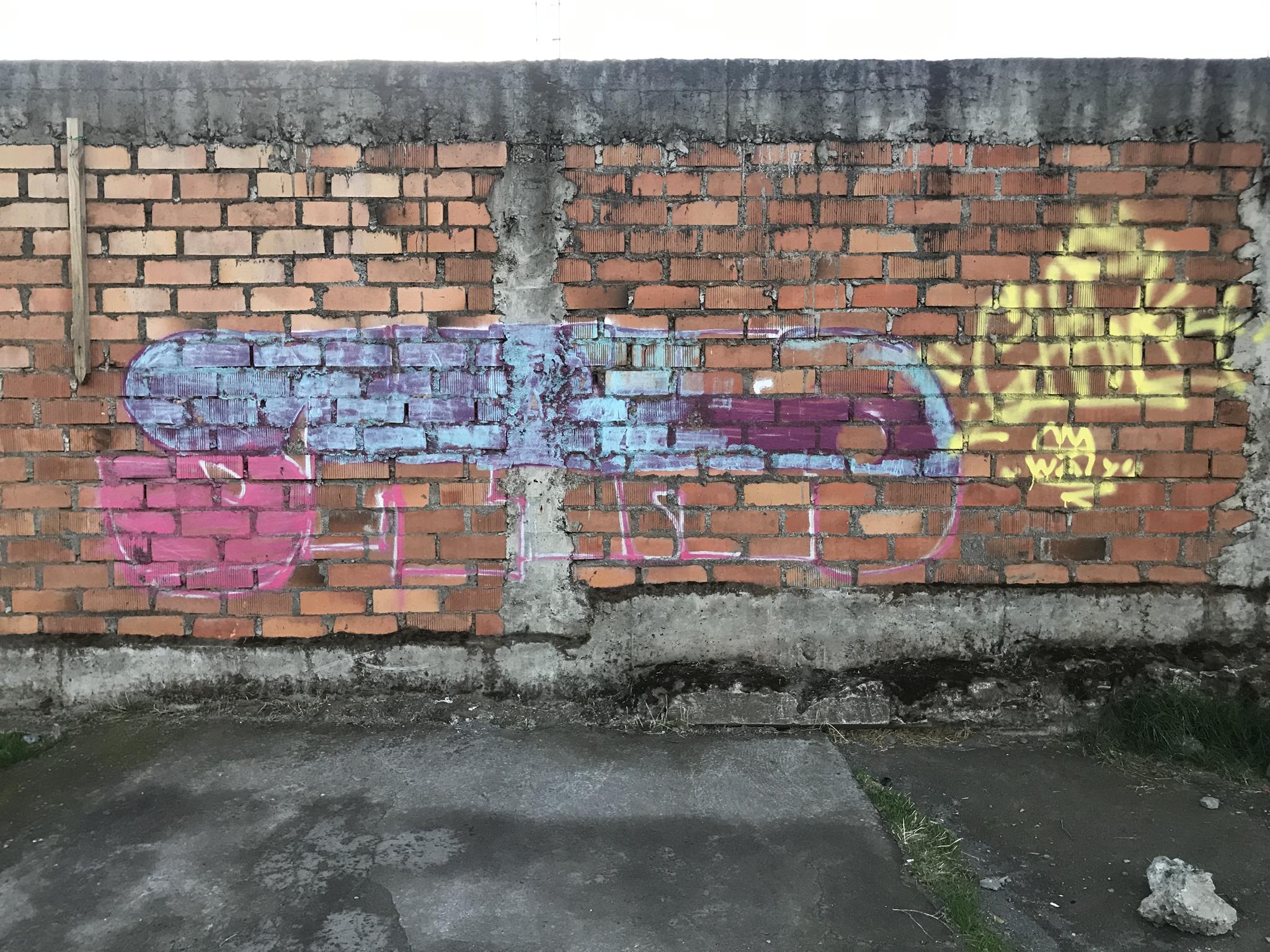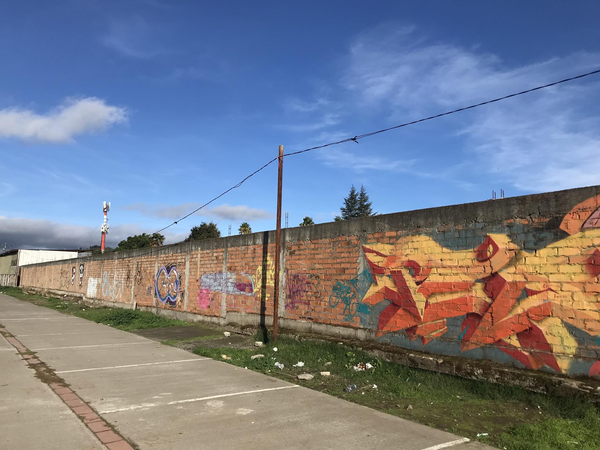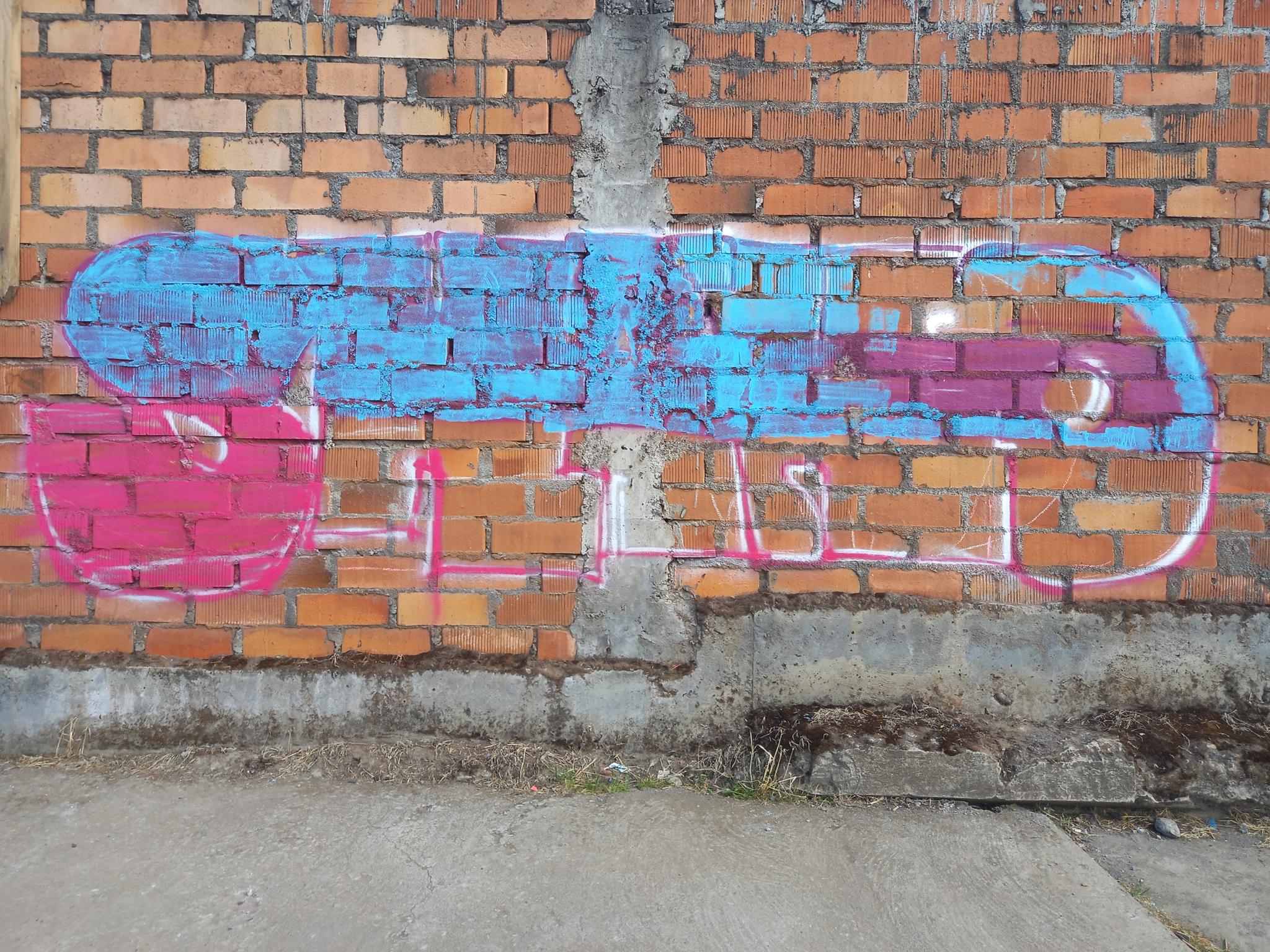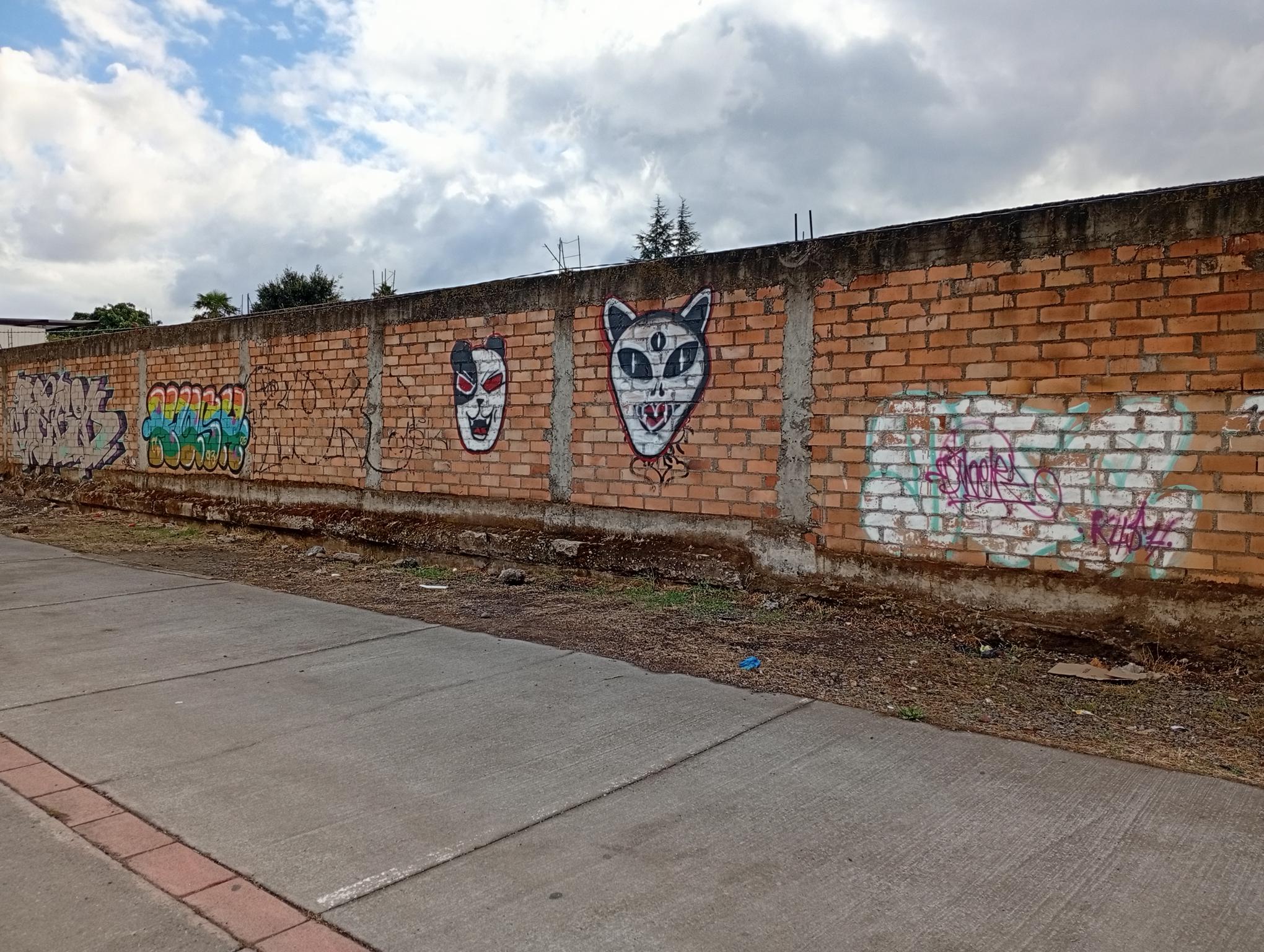 This section of the wall, located where the train used to run, displays graffiti from different periods. The most recent graffiti was painted in early 2026 by KUSH and DIBERZO, who painted a flop with clear lettering, purple borders, and a light blue outline. To the right is KUSH’s unmistakable flop, where he changes colors, creating a rainbow of flops that spreads throughout Angol. Immediately to the right of KUSH’s graffiti, there’s a transparent flop by RUKO, and a little further to the right, GILLO had drawn a character, which was covered later by one of the painted faces with one of a dog and the other a face of a cat. GILLO’s drawing ended up under the cat’s head; I don’t know who the artist of that graffiti is.