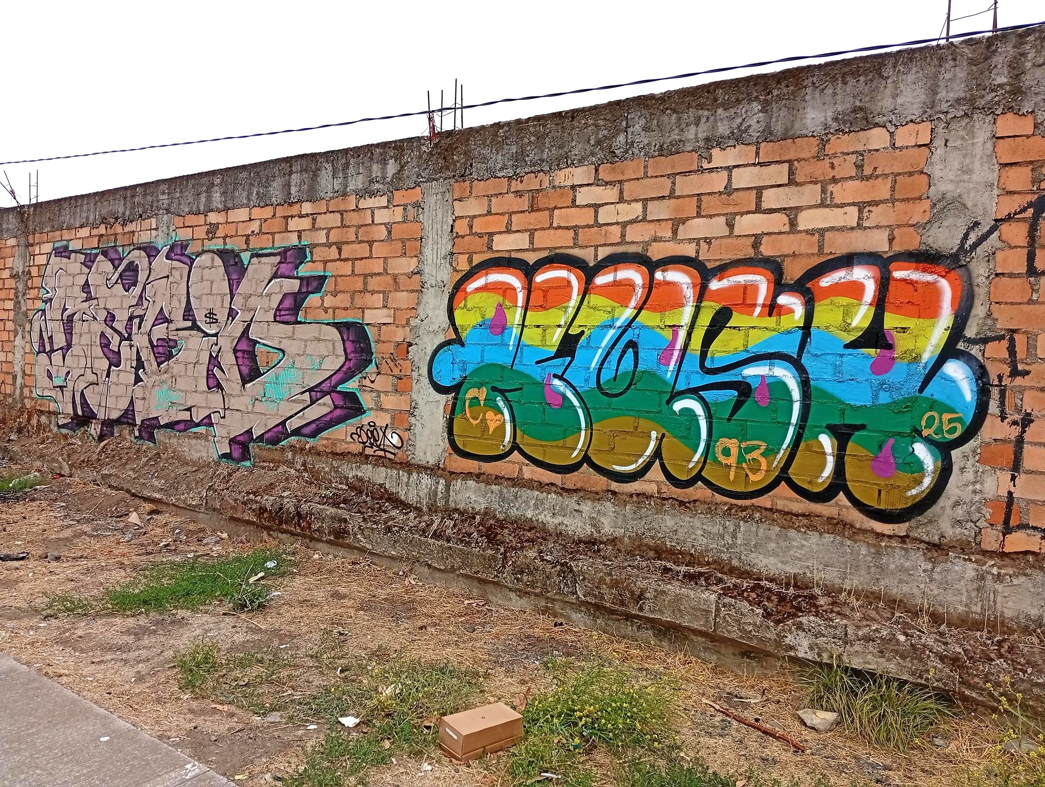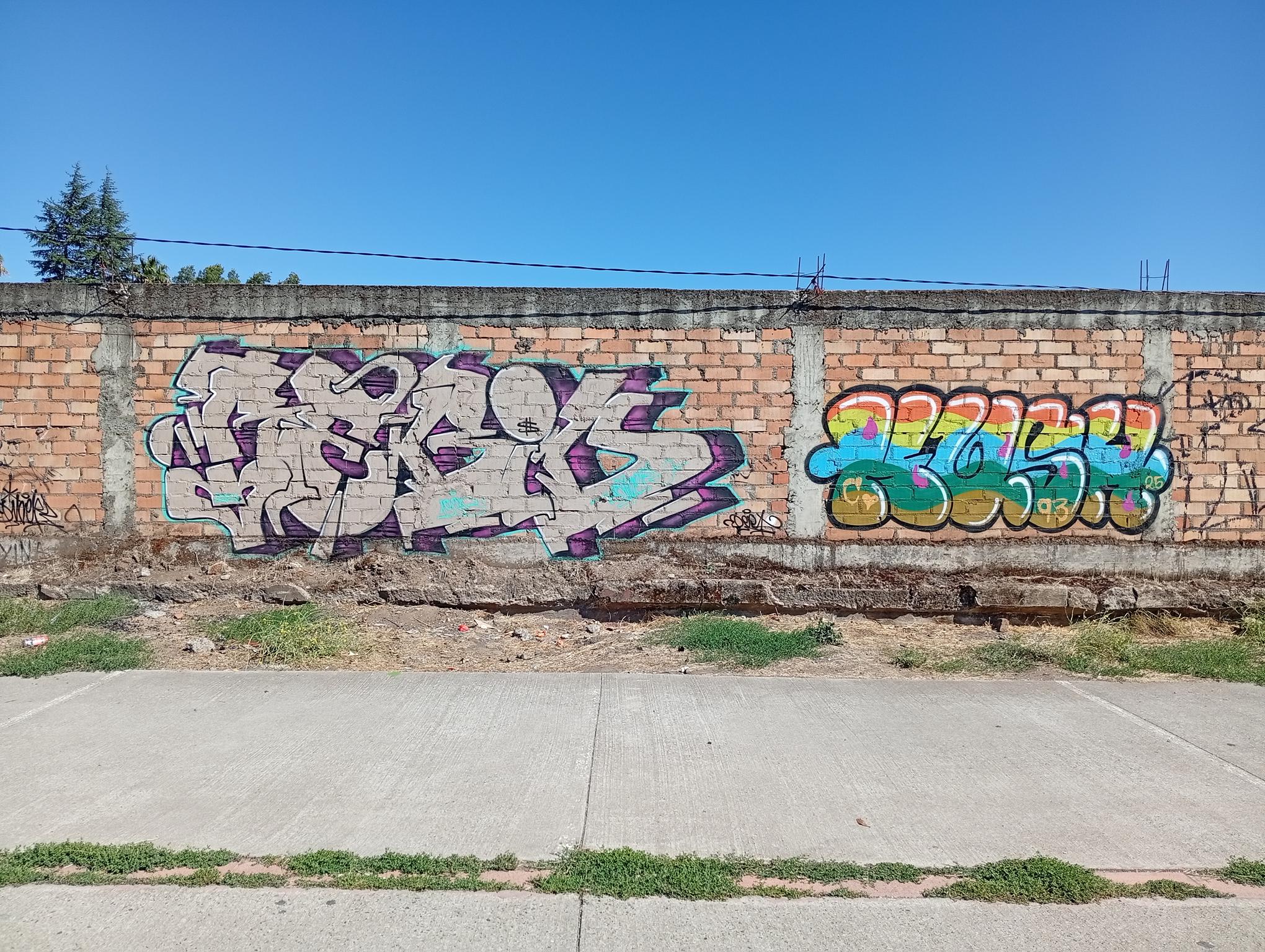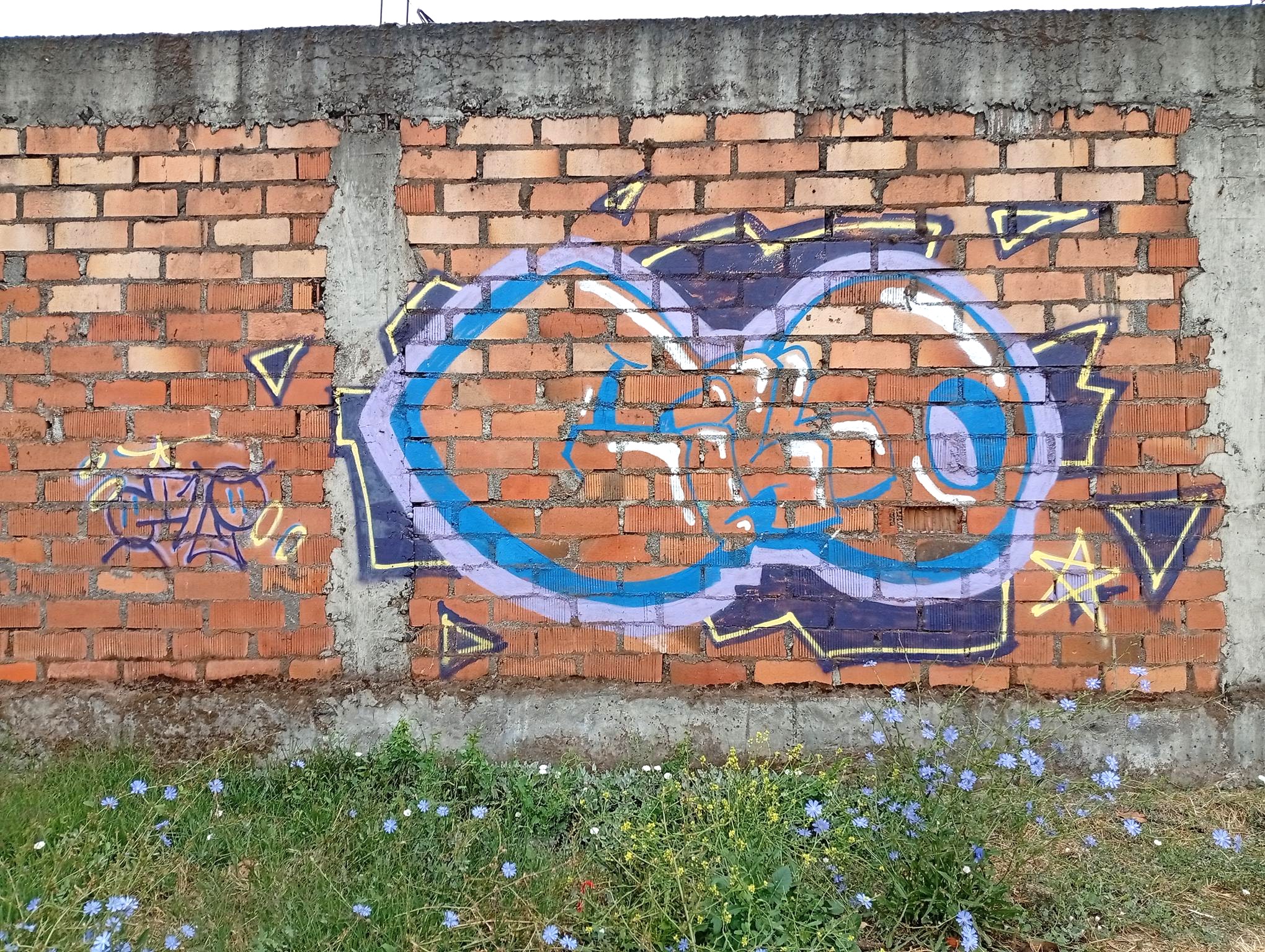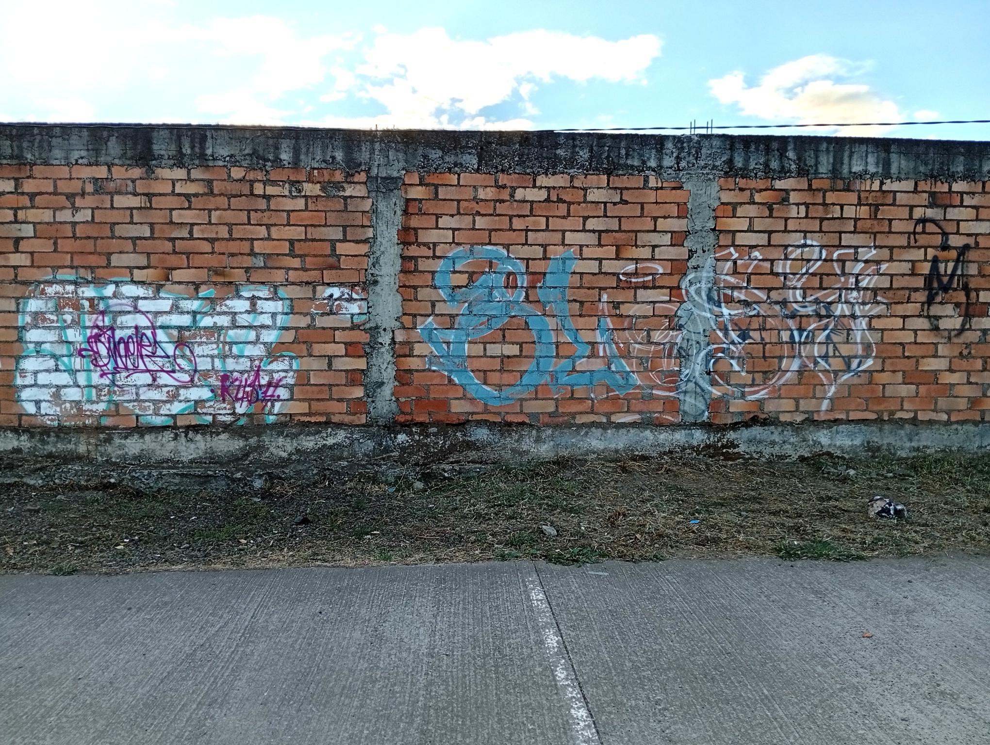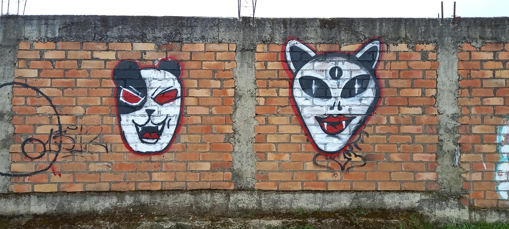 This section of the wall, located where the train used to run, displays graffiti from different periods. The most recent graffiti was painted in early 2026 by KUSH and DIBERZO, who painted a flop with clear lettering, purple borders, and a light blue outline. To the right is KUSH’s unmistakable flop, where he changes colors, creating a rainbow of flops that spreads throughout Angol. Immediately to the right of KUSH’s graffiti, there’s a transparent flop by RUKO, and a little further to the right, GILLO had drawn a character, which was covered later by one of the painted faces with one of a dog and the other a face of a cat. GILLO’s drawing ended up under the cat’s head; I don’t know who the artist of that graffiti is.