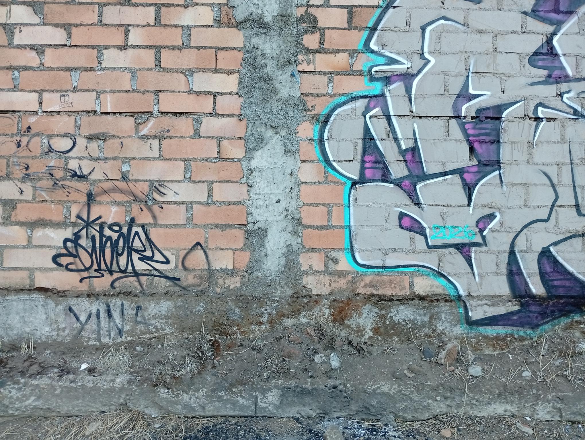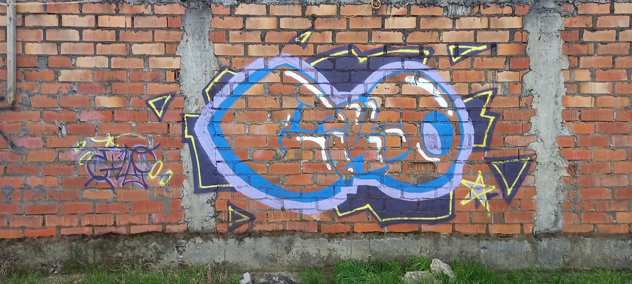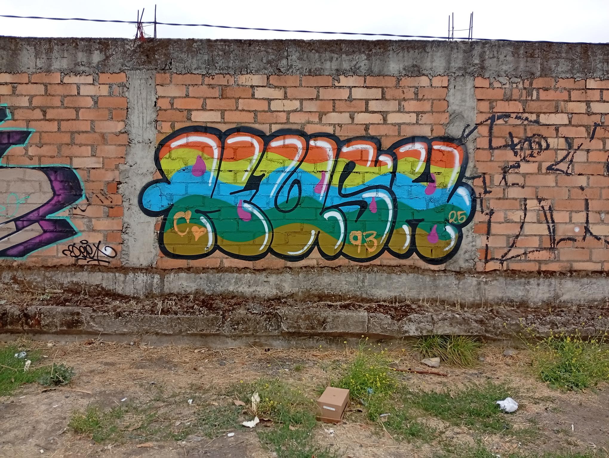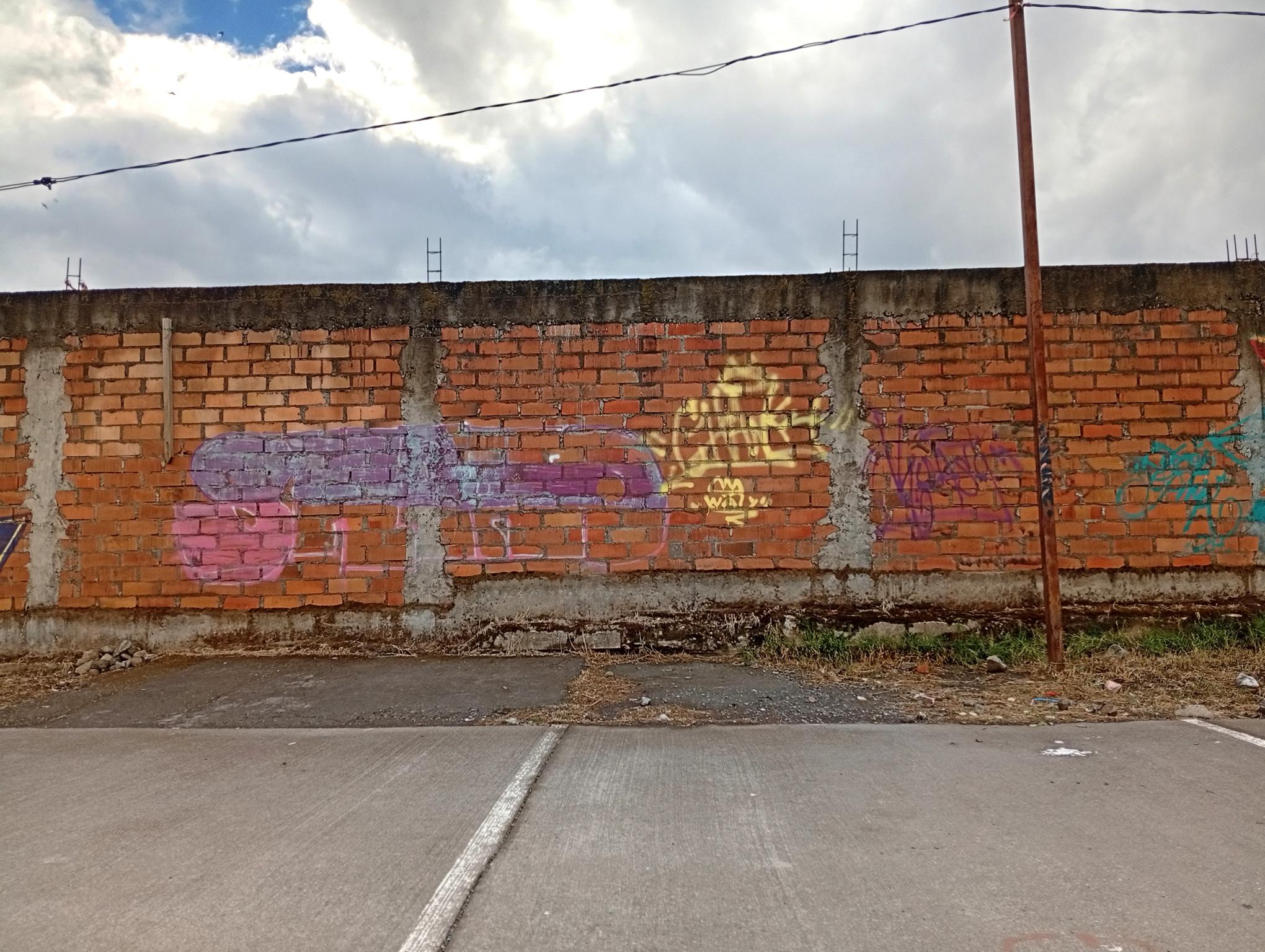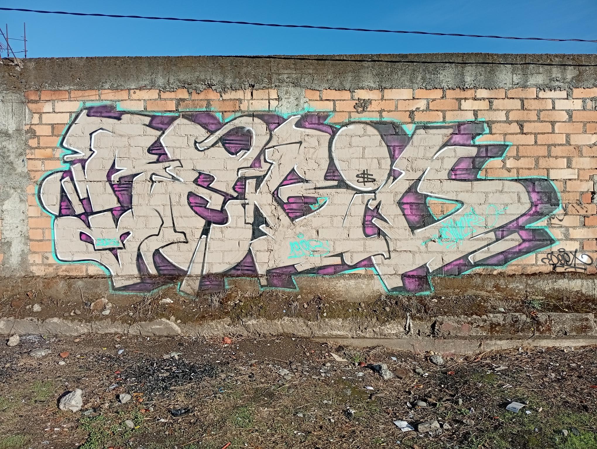 This section of the wall, located where the train used to run, displays graffiti from different periods. The most recent graffiti was painted in early 2026 by KUSH and DIBERZO, who painted a flop with clear lettering, purple borders, and a light blue outline. To the right is KUSH’s unmistakable flop, where he changes colors, creating a rainbow of flops that spreads throughout Angol. Immediately to the right of KUSH’s graffiti, there’s a transparent flop by RUKO, and a little further to the right, GILLO had drawn a character, which was covered later by one of the painted faces with one of a dog and the other a face of a cat. GILLO’s drawing ended up under the cat’s head; I don’t know who the artist of that graffiti is.