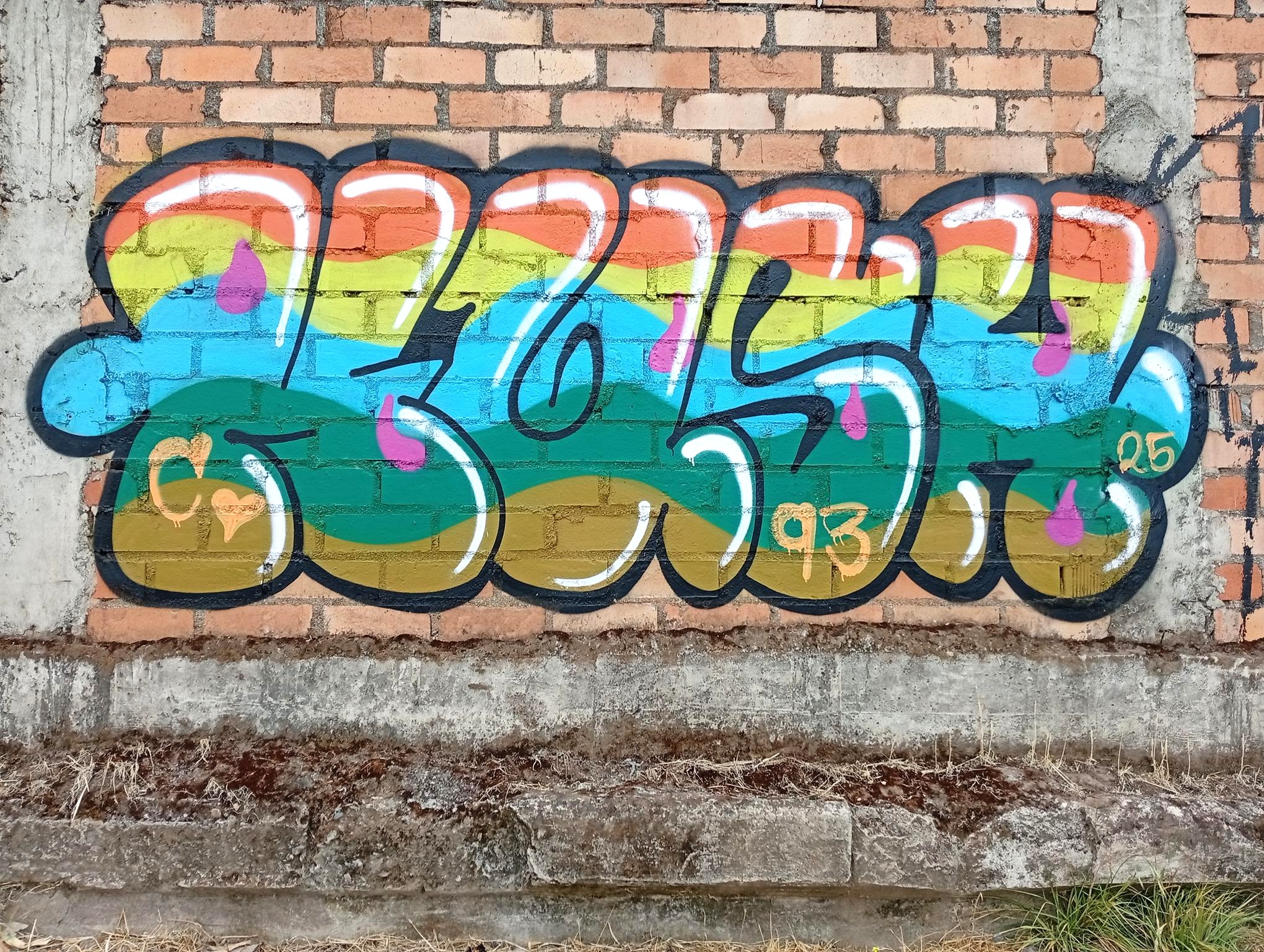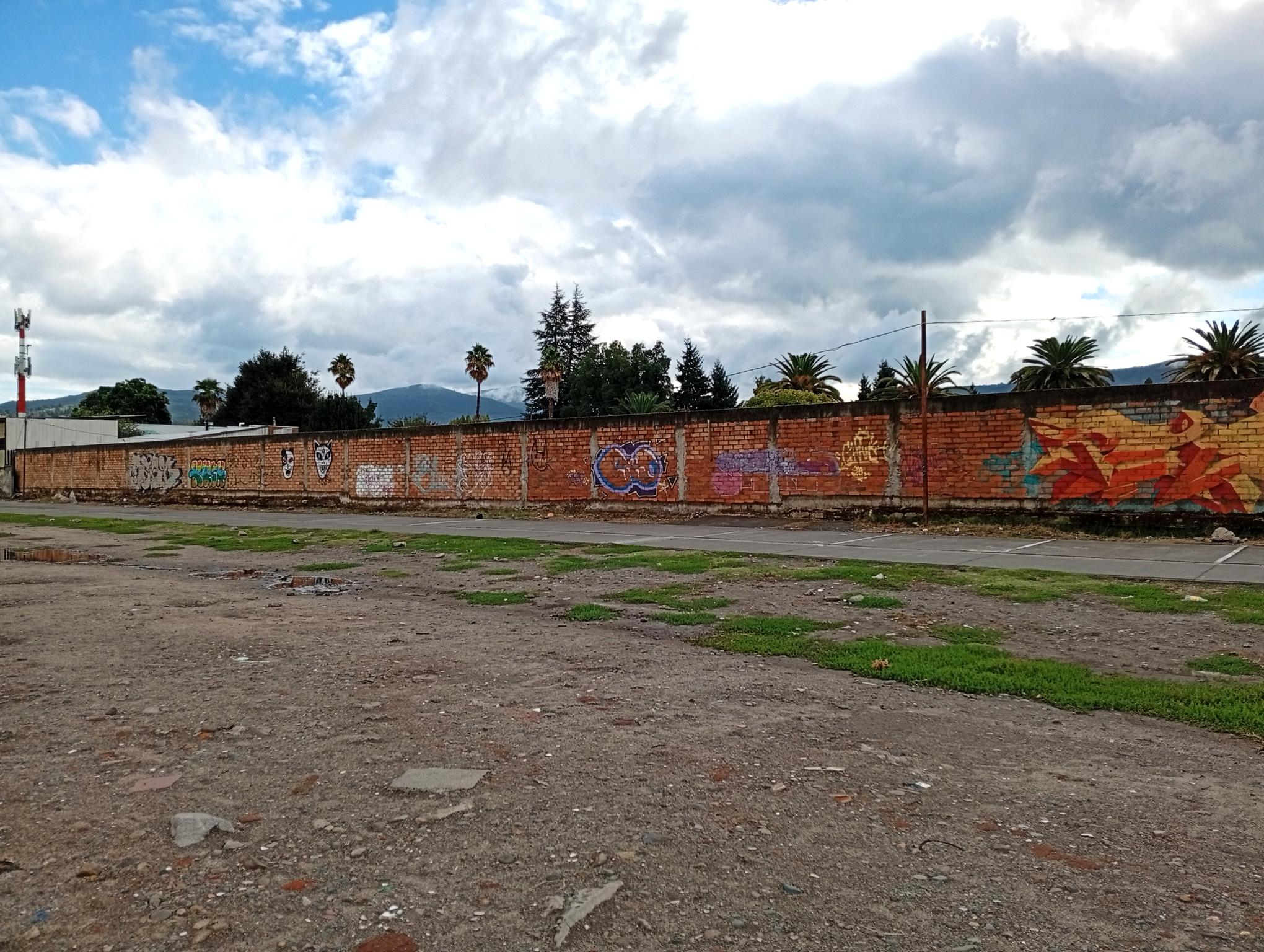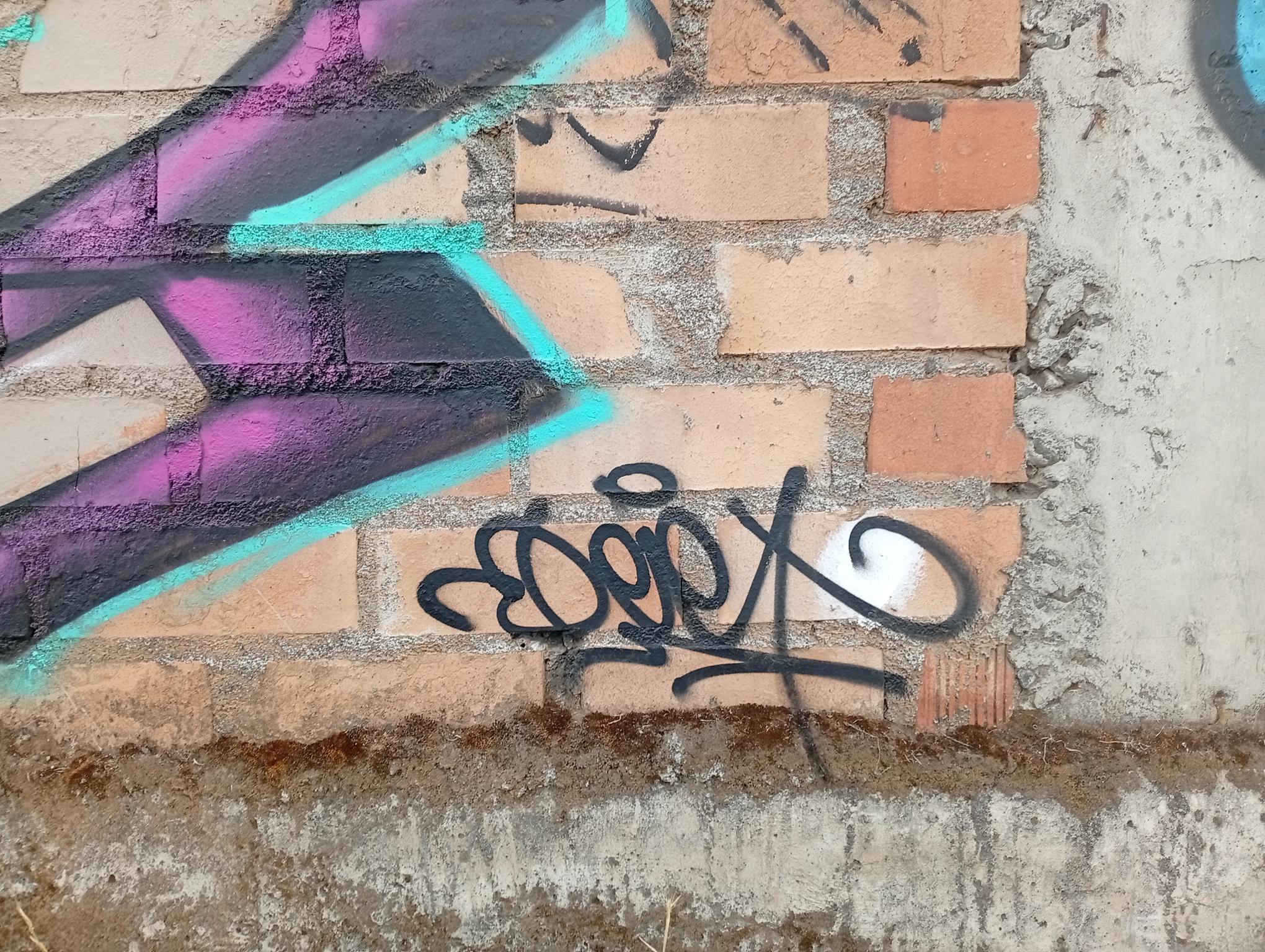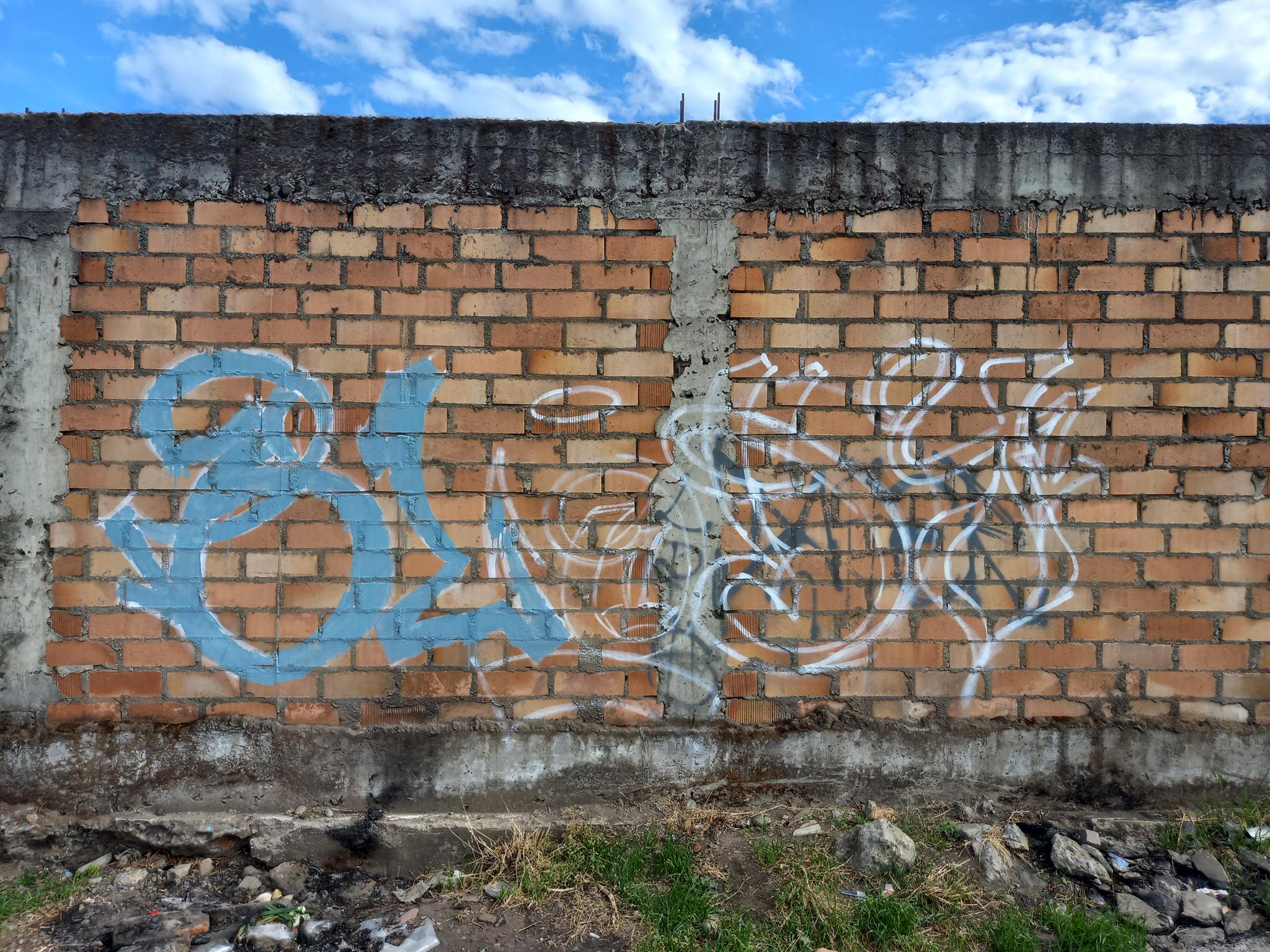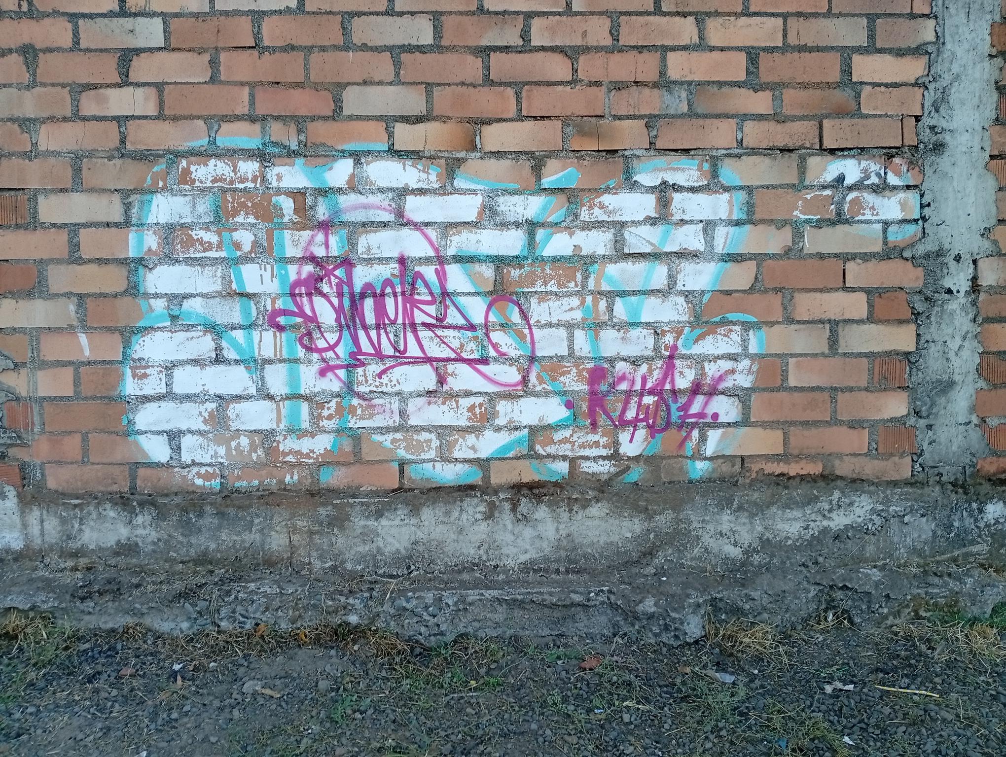 This section of the wall, located where the train used to run, displays graffiti from different periods. The most recent graffiti was painted in early 2026 by KUSH and DIBERZO, who painted a flop with clear lettering, purple borders, and a light blue outline. To the right is KUSH’s unmistakable flop, where he changes colors, creating a rainbow of flops that spreads throughout Angol. Immediately to the right of KUSH’s graffiti, there’s a transparent flop by RUKO, and a little further to the right, GILLO had drawn a character, which was covered later by one of the painted faces with one of a dog and the other a face of a cat. GILLO’s drawing ended up under the cat’s head; I don’t know who the artist of that graffiti is.
