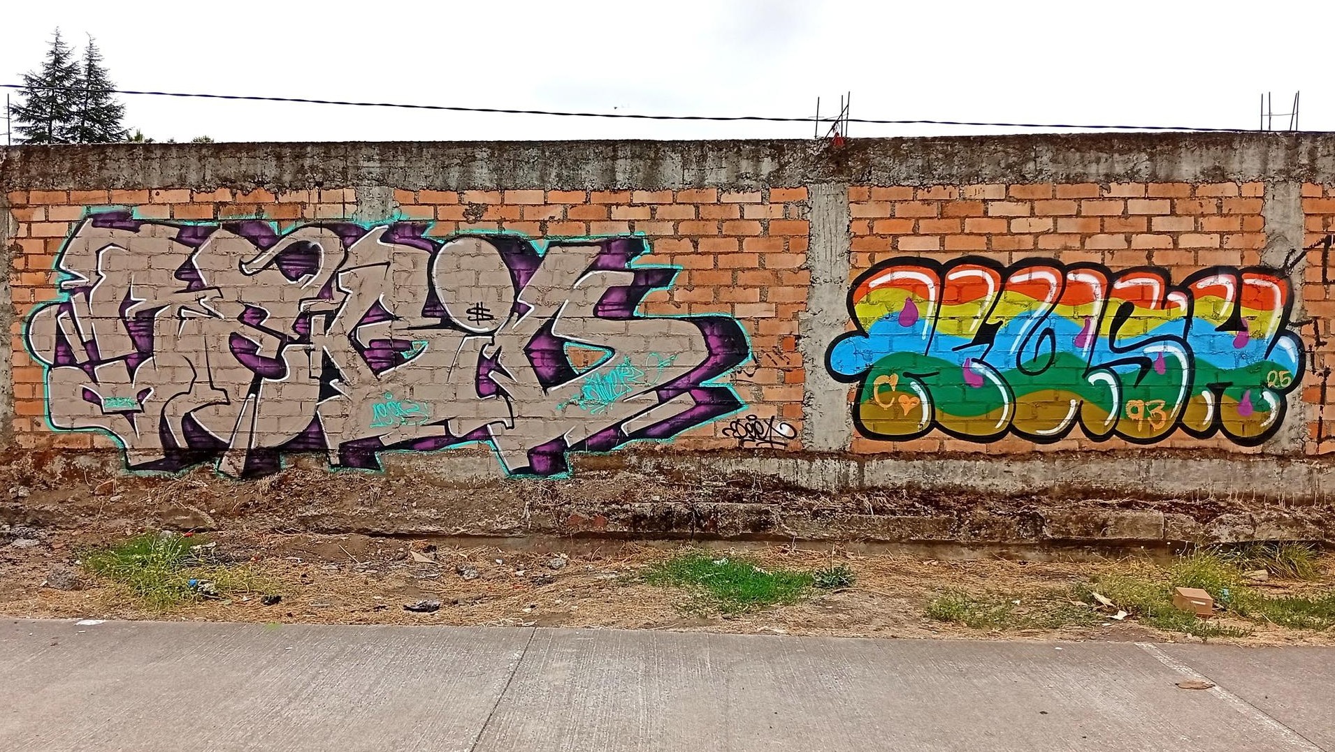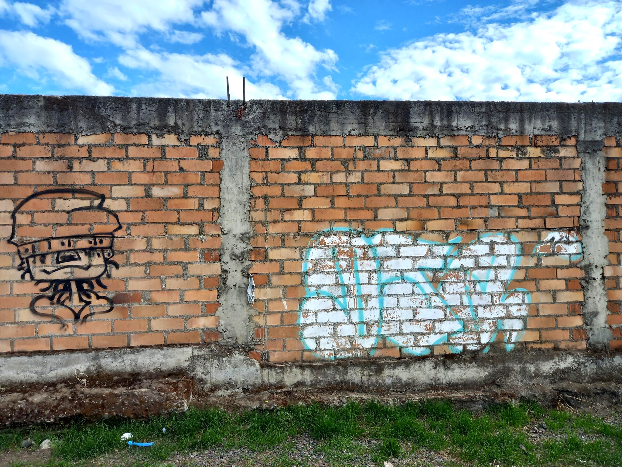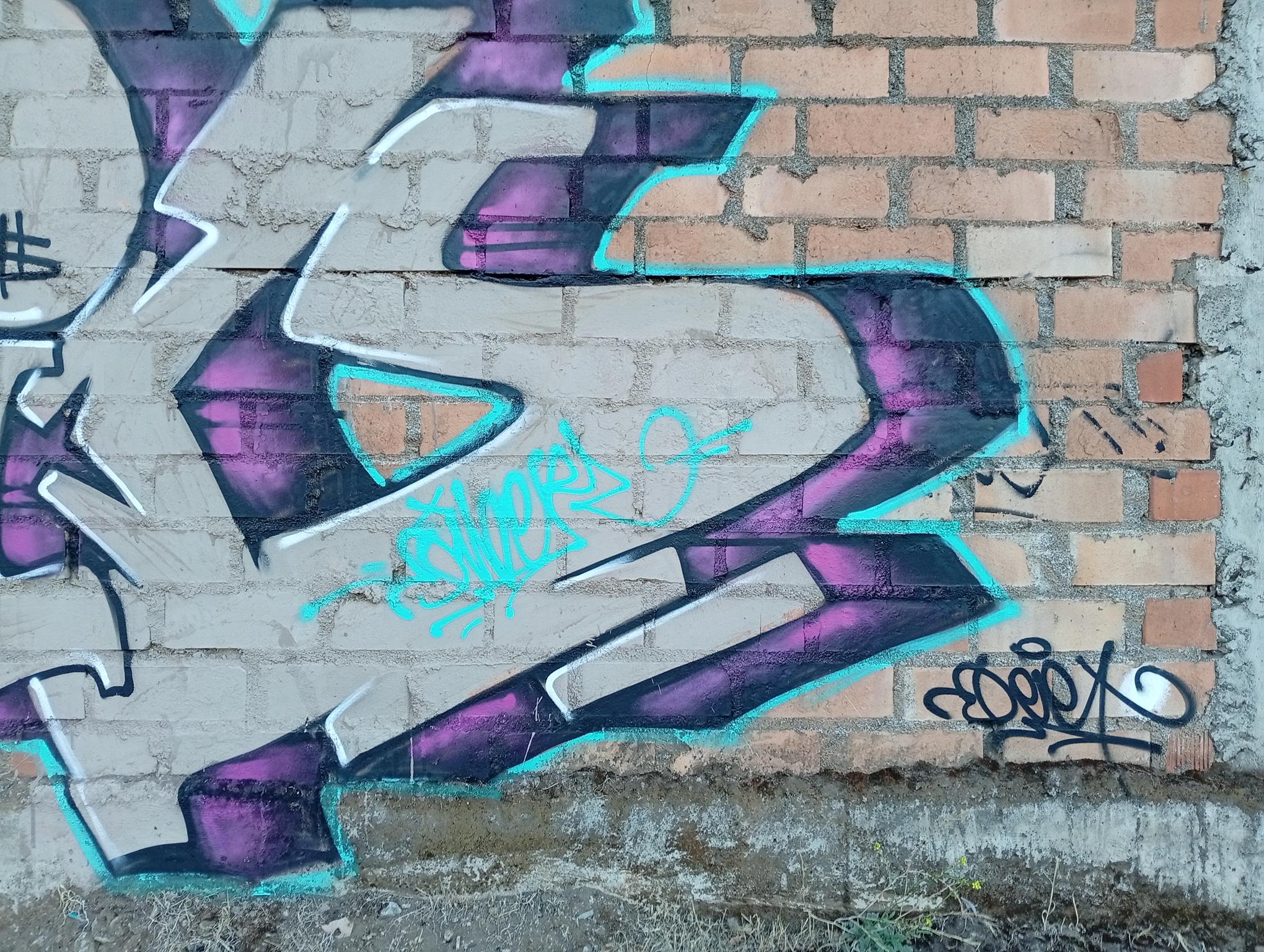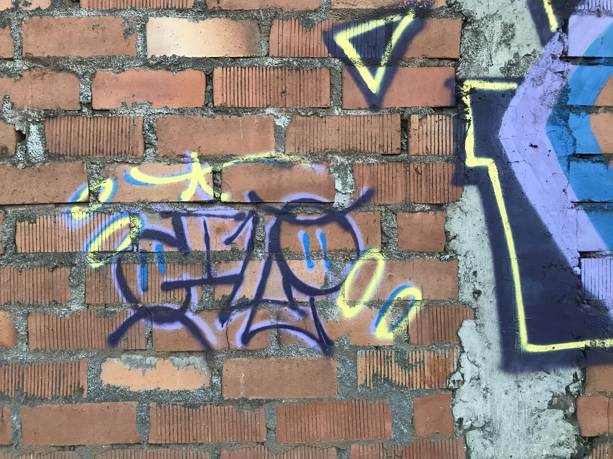 This section of the wall, located where the train used to run, displays graffiti from different periods. The most recent graffiti was painted in early 2026 by KUSH and DIBERZO, who painted a flop with clear lettering, purple borders, and a light blue outline. To the right is KUSH’s unmistakable flop, where he changes colors, creating a rainbow of flops that spreads throughout Angol. Immediately to the right of KUSH’s graffiti, there’s a transparent flop by RUKO, and a little further to the right, GILLO had drawn a character, which was covered later by one of the painted faces with one of a dog and the other a face of a cat. GILLO’s drawing ended up under the cat’s head; I don’t know who the artist of that graffiti is.