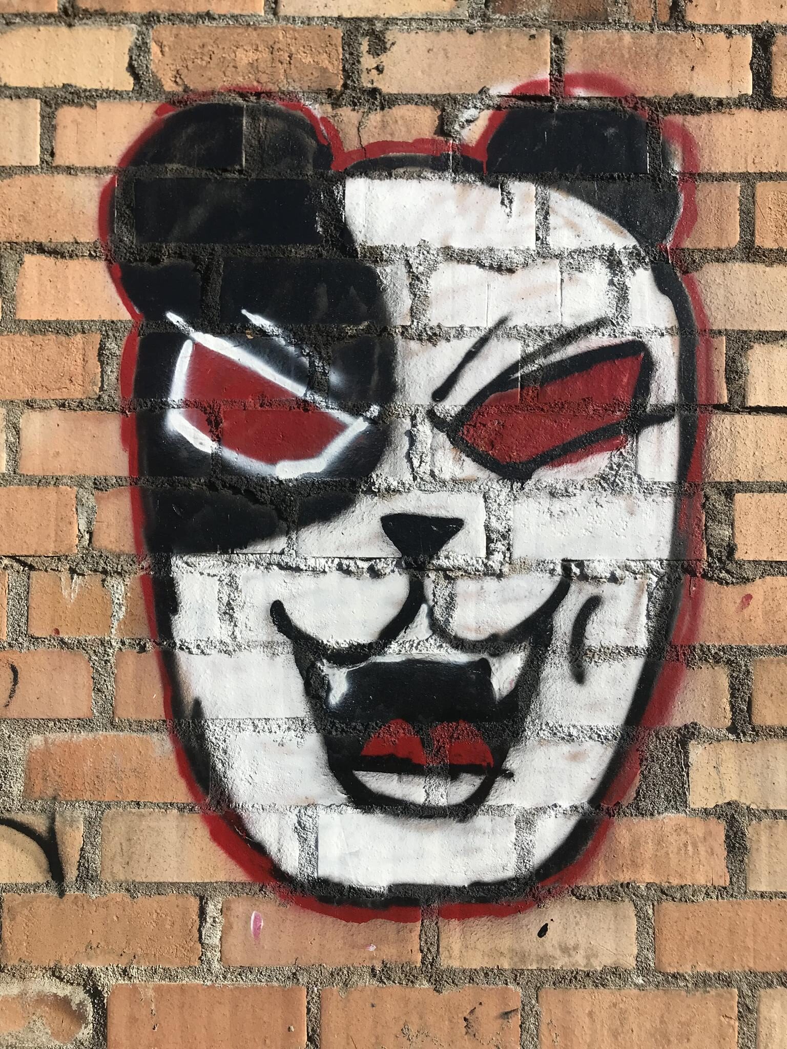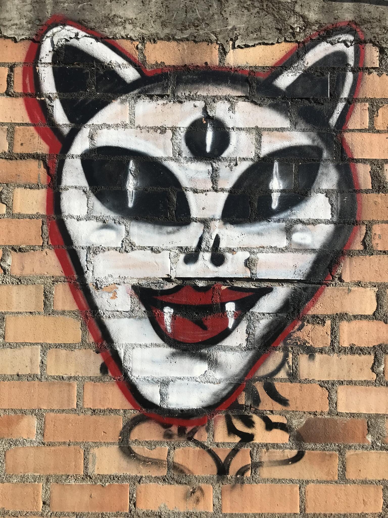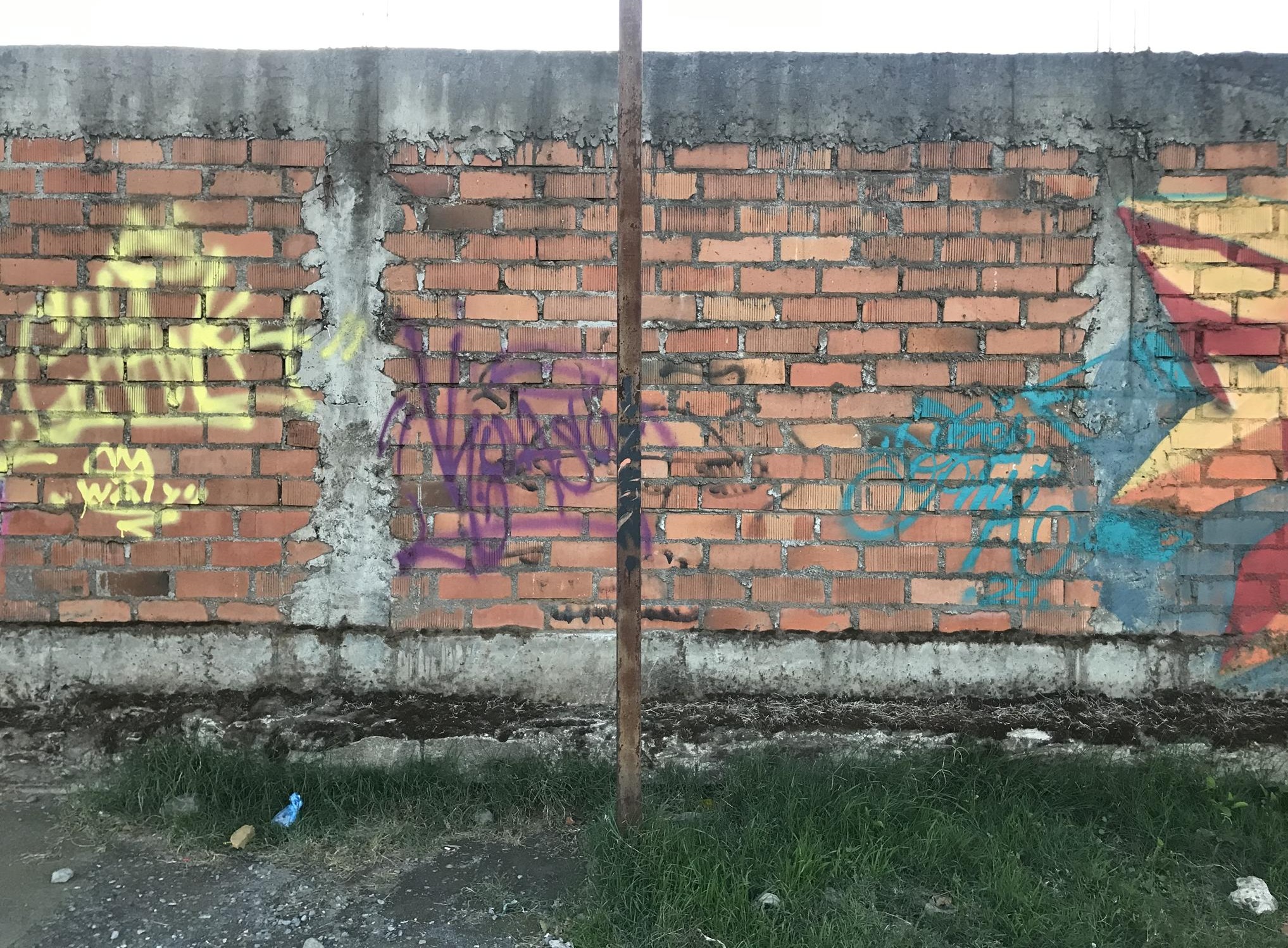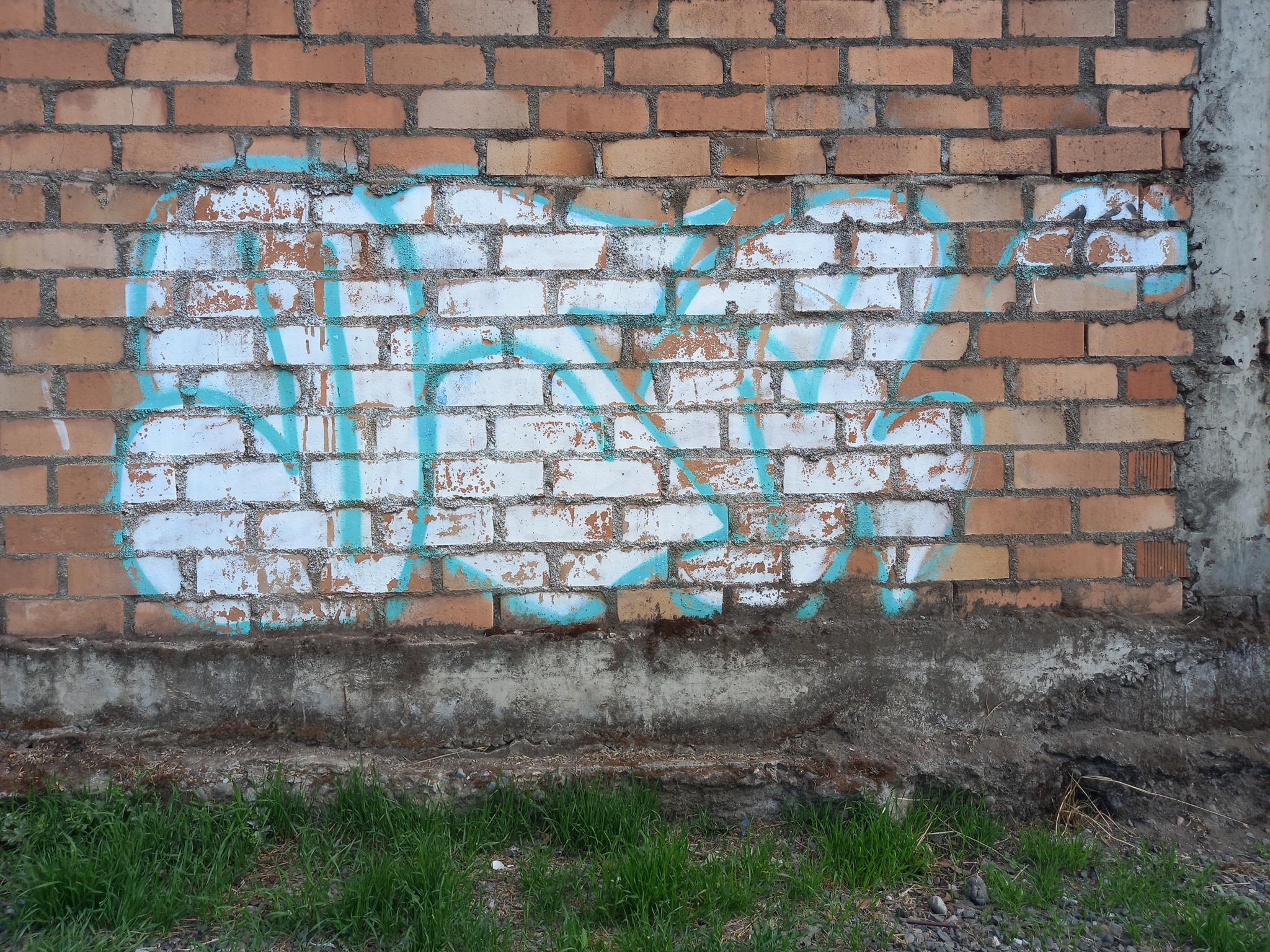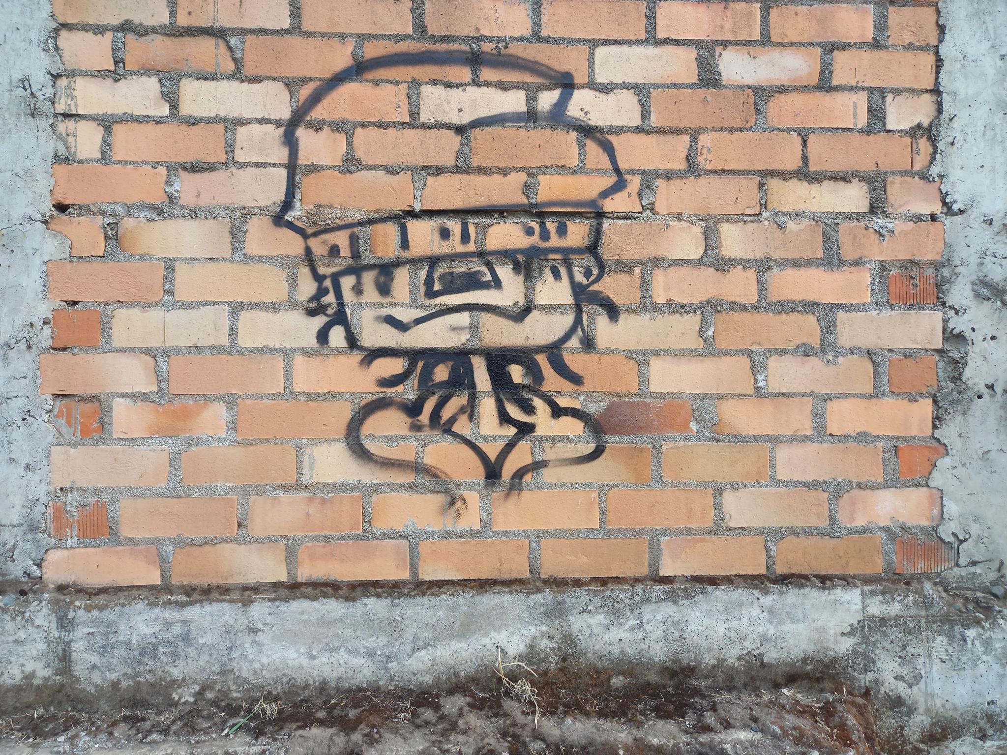 This section of the wall, located where the train used to run, displays graffiti from different periods. The most recent graffiti was painted in early 2026 by KUSH and DIBERZO, who painted a flop with clear lettering, purple borders, and a light blue outline. To the right is KUSH’s unmistakable flop, where he changes colors, creating a rainbow of flops that spreads throughout Angol. Immediately to the right of KUSH’s graffiti, there’s a transparent flop by RUKO, and a little further to the right, GILLO had drawn a character, which was covered later by one of the painted faces with one of a dog and the other a face of a cat. GILLO’s drawing ended up under the cat’s head; I don’t know who the artist of that graffiti is.
