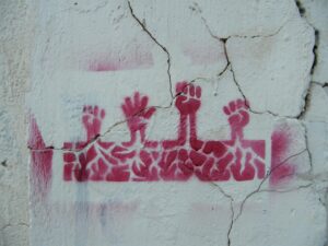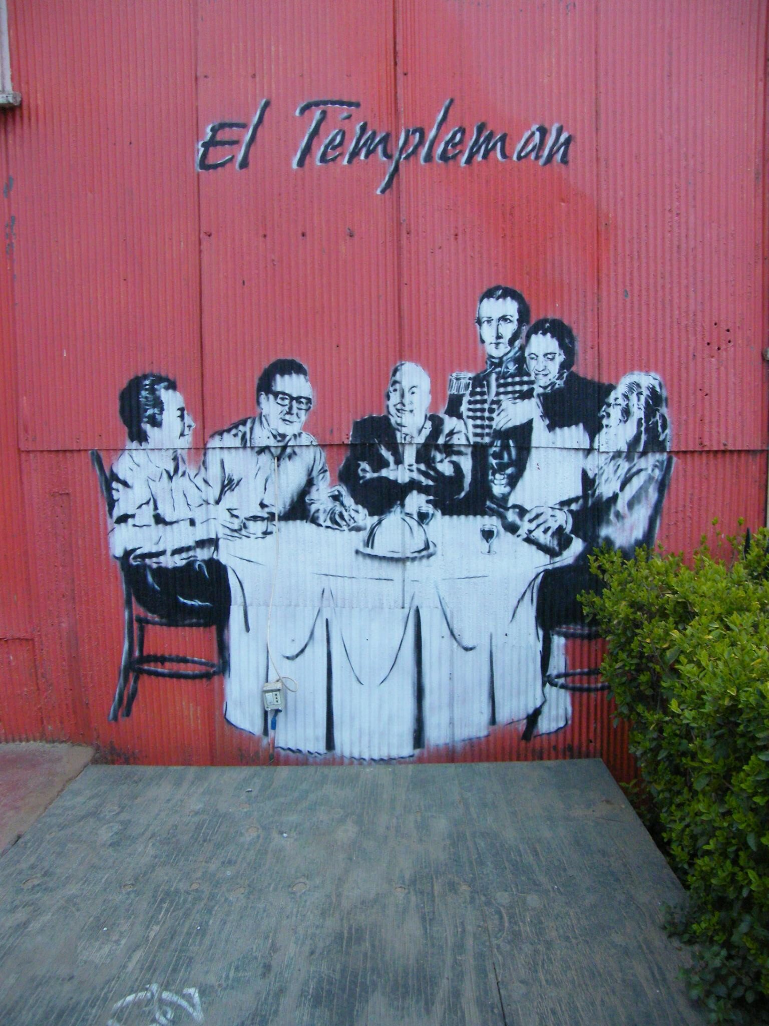 In the 19th century, before the Panama Canal existed, Valparaiso was a vital port for trade between Europe and Asia. It was a cosmopolitan port, where British travelers to Australia and New Zealand used Valparaiso as a starting point for the long final journey to Oceania. As an example of that international atmosphere, Chris Watson, Australia’s third Prime Minister from 1904, was born in Valparaiso in 1867. One of the most emblematic places of Valparaiso’s cosmopolitan and bohemian era was Templeman Street. That’s why the stencil “El Templeman”, featuring Chilean figures such as Gabriela Mistral, Salvador Allende, Pablo Neruda and others, can be found in the „Politics“ category of this presentation of stencils made in Valparaiso during Chile’s pre-bicentennial era, that is, these stencils were created before 18th September 2010.