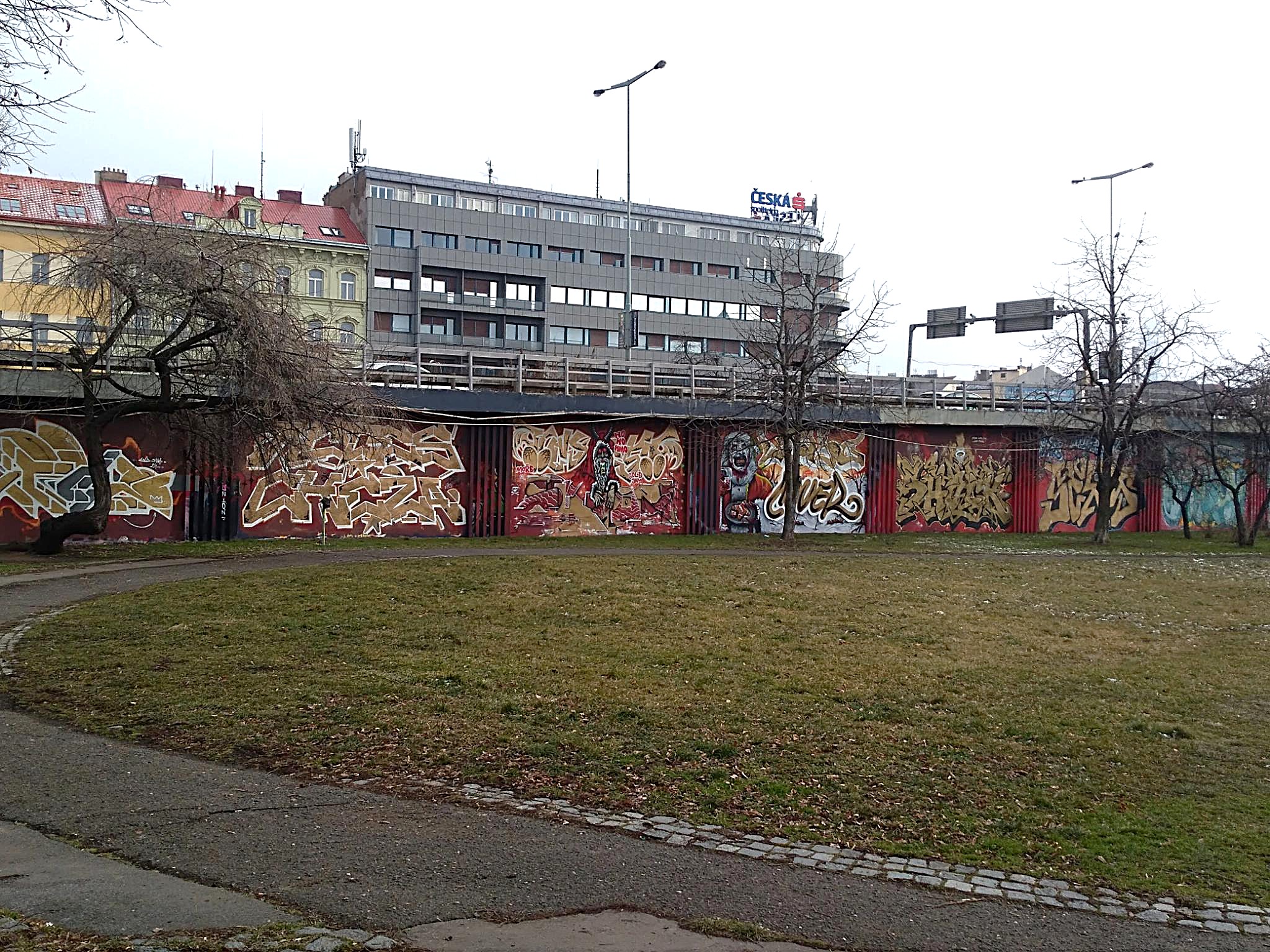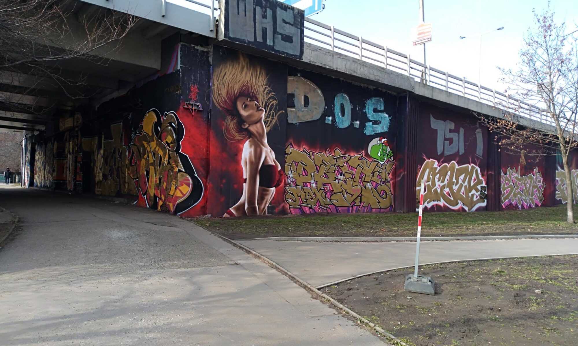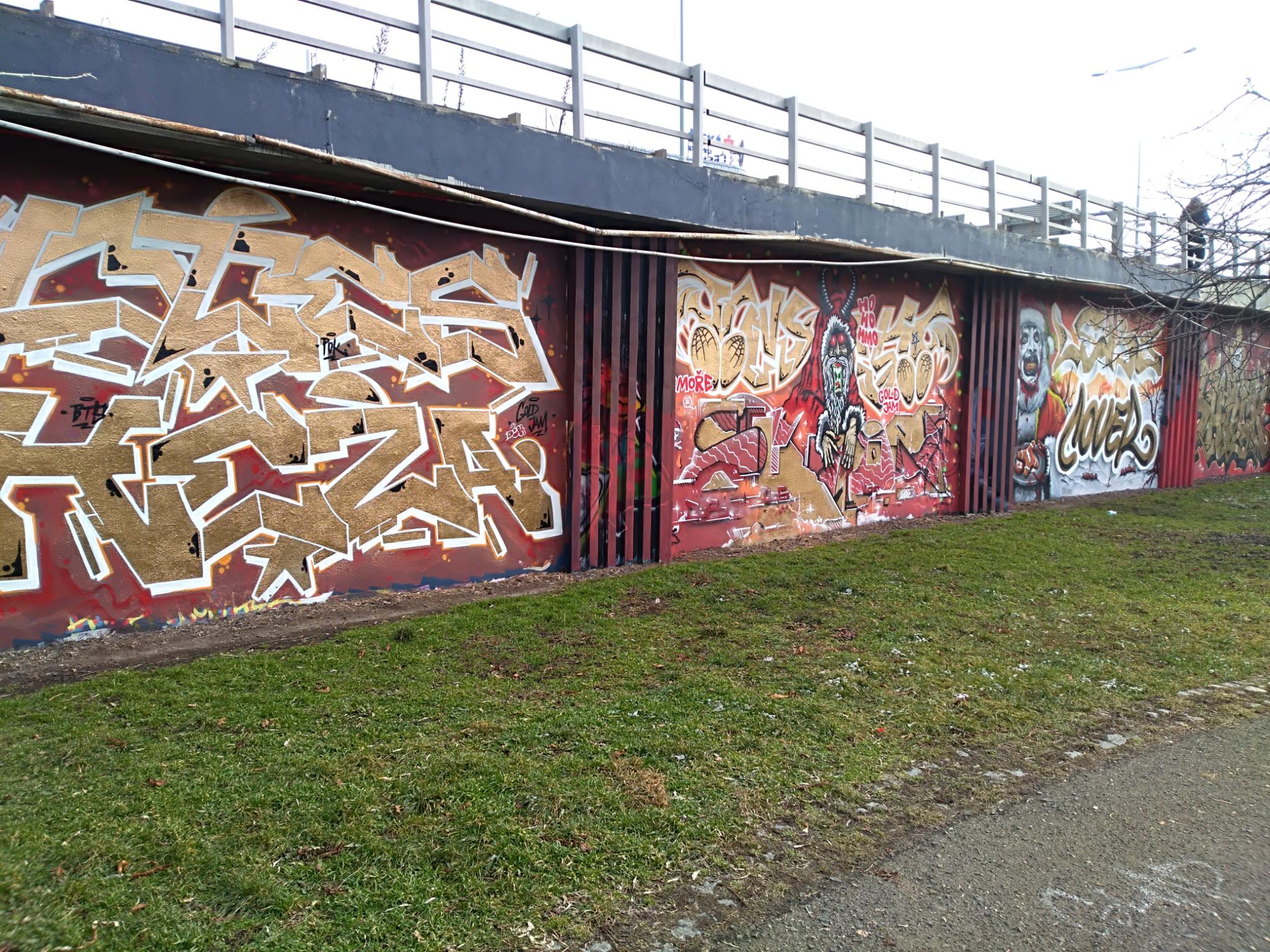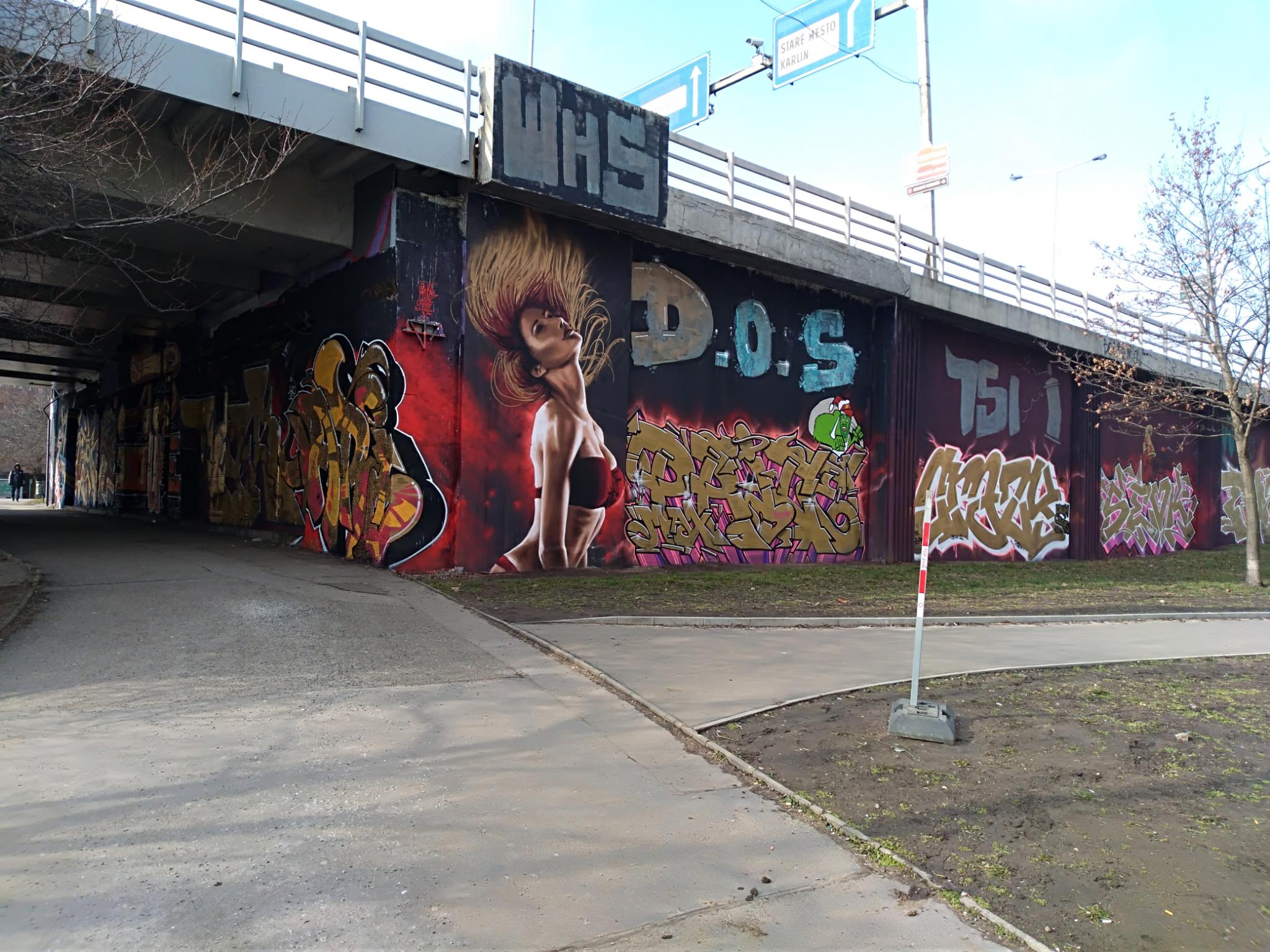 The Těšnov Hall of Fame is located in the Florenc district along the park of the same name and on the bridge to Wilsonova Street. It is a spacious area with several walls and bridge pillars, doing art here is allowed and legal. You can always find people painting, there are spray sessions and graffiti jams. Every year the great UNYFEST takes place around the area with numerous urban artists and a fantastic line-up of various musicians from the hip hop scene. Some of the pieces are also included in the following photo collection, but also many more graffiti besides the event, as the hall is often frequented. Also the fabulous DOS CREW uses this spray space for their anniversaries. Check out as well the pages for the V Cípu Spray Walls and for Streetart and Murals throughout the city.