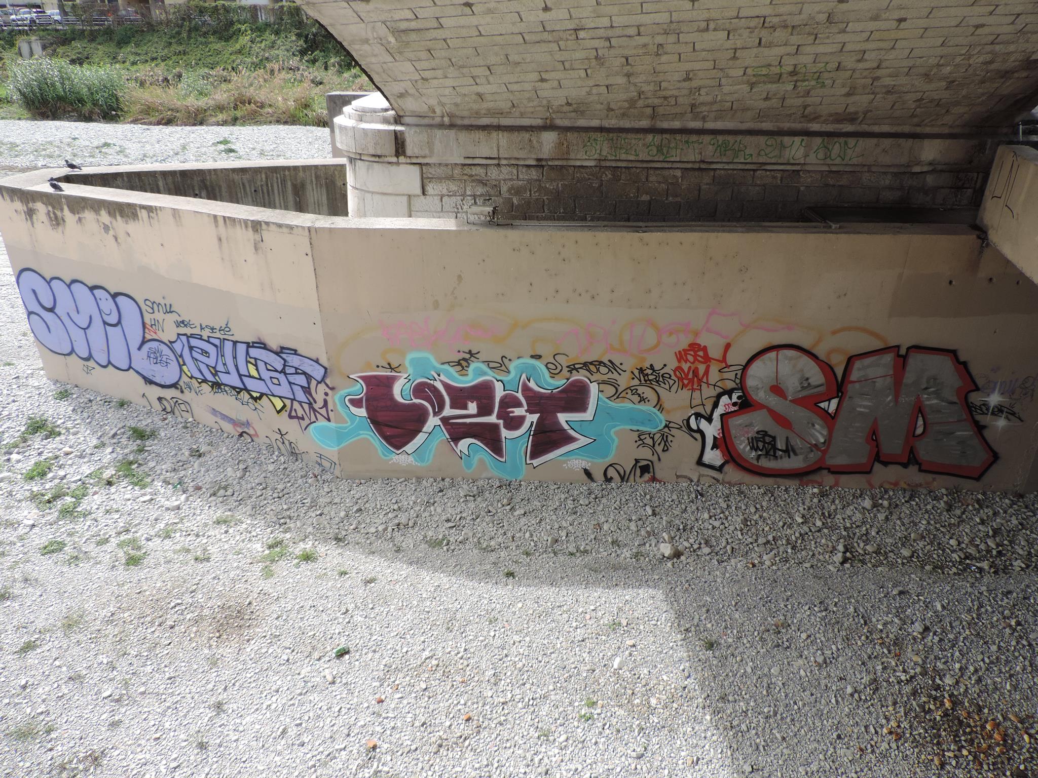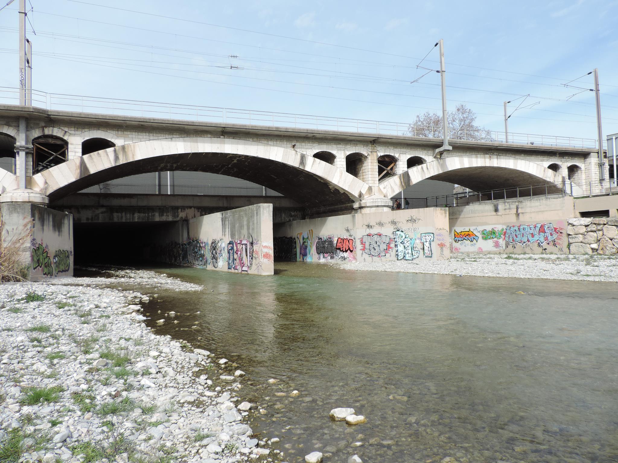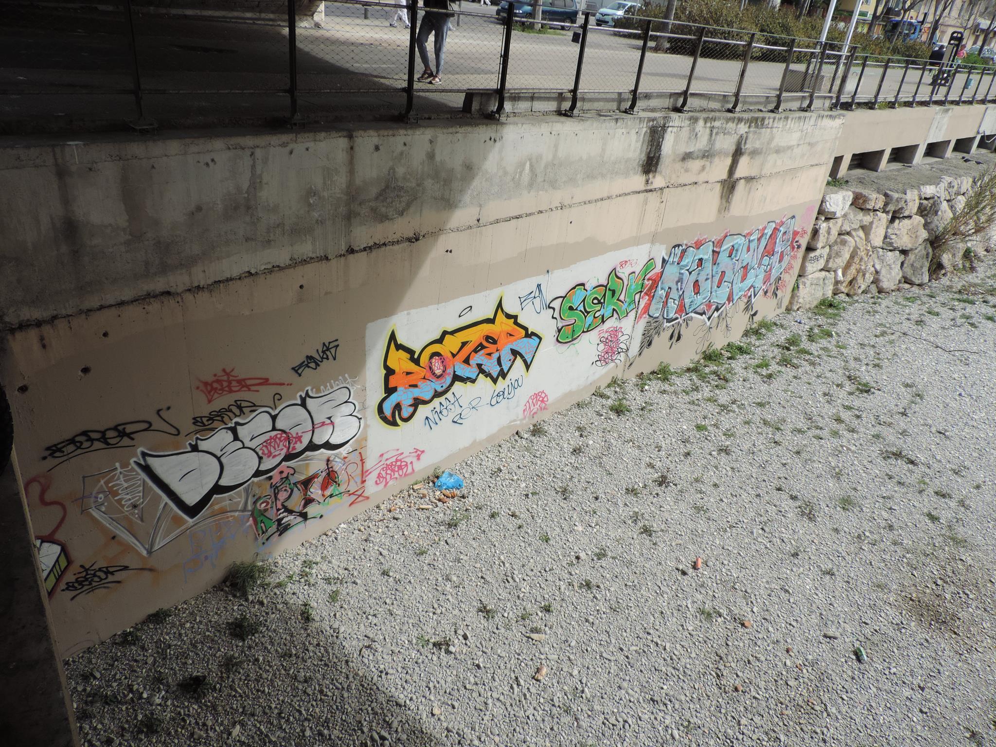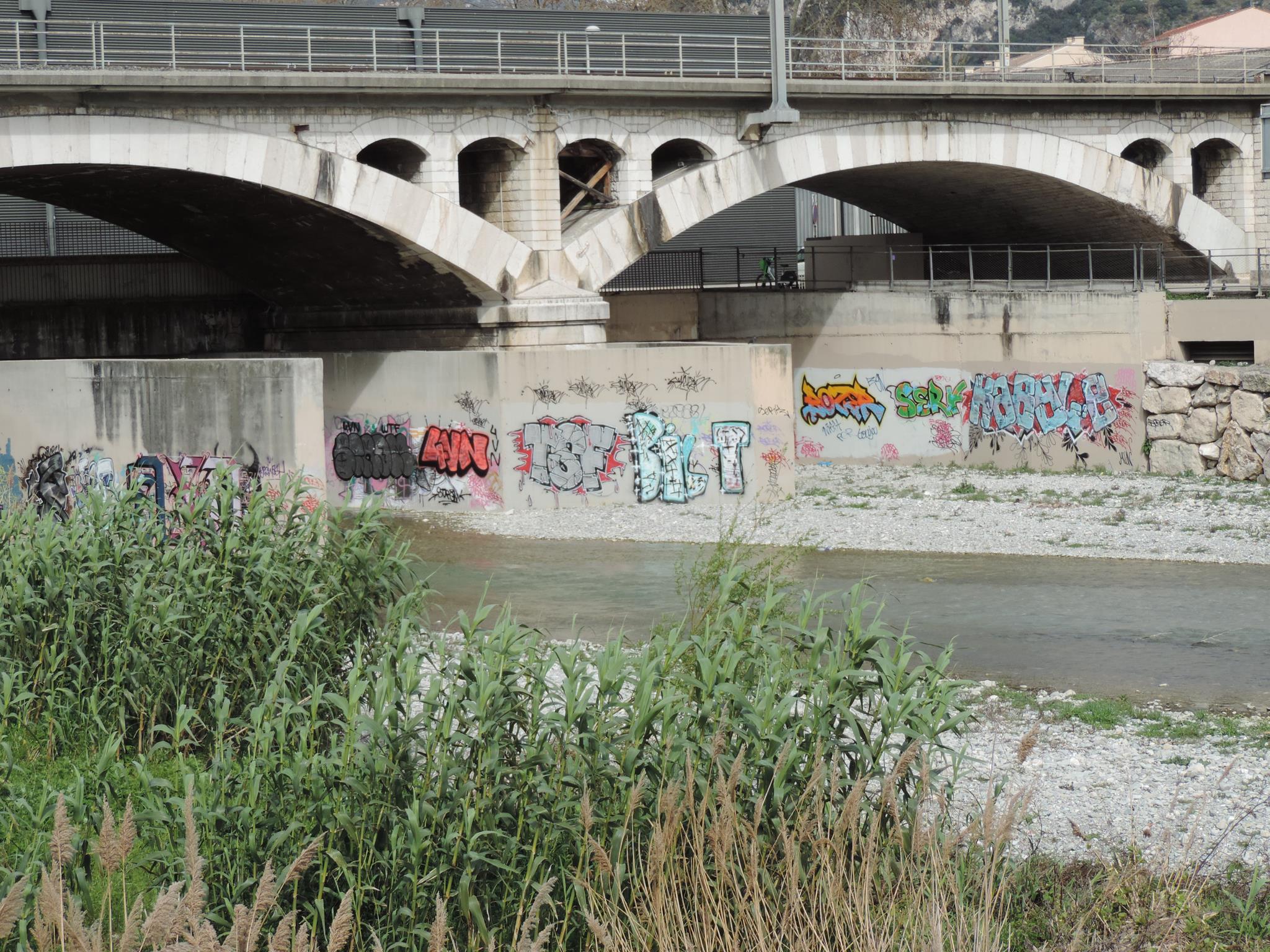 Below the south side bridge over the river Paillon at Place des Abattoirs is a graffiti hot spot, which can be painted at low tide or viewed from the outside at high tide. To the north, the canalized river runs underground through the city and the secondary school Lycée Guillaume Apollinaire is located above it. The graffiti pieces extend through the entire tunnel to the exit on the other side, you can see it if you walk around. The works on the south side of the tunnel exit are also visible from walkways along the canal, and there are openings in between through which you can also get a little closer. If the river is carrying water, then you can only explore more graffiti in the tunnel with rubber boots, but there is probably a lot more underneath. If you have any more photos of this place, send them to info@vagabundler.com and we will add them to this page.